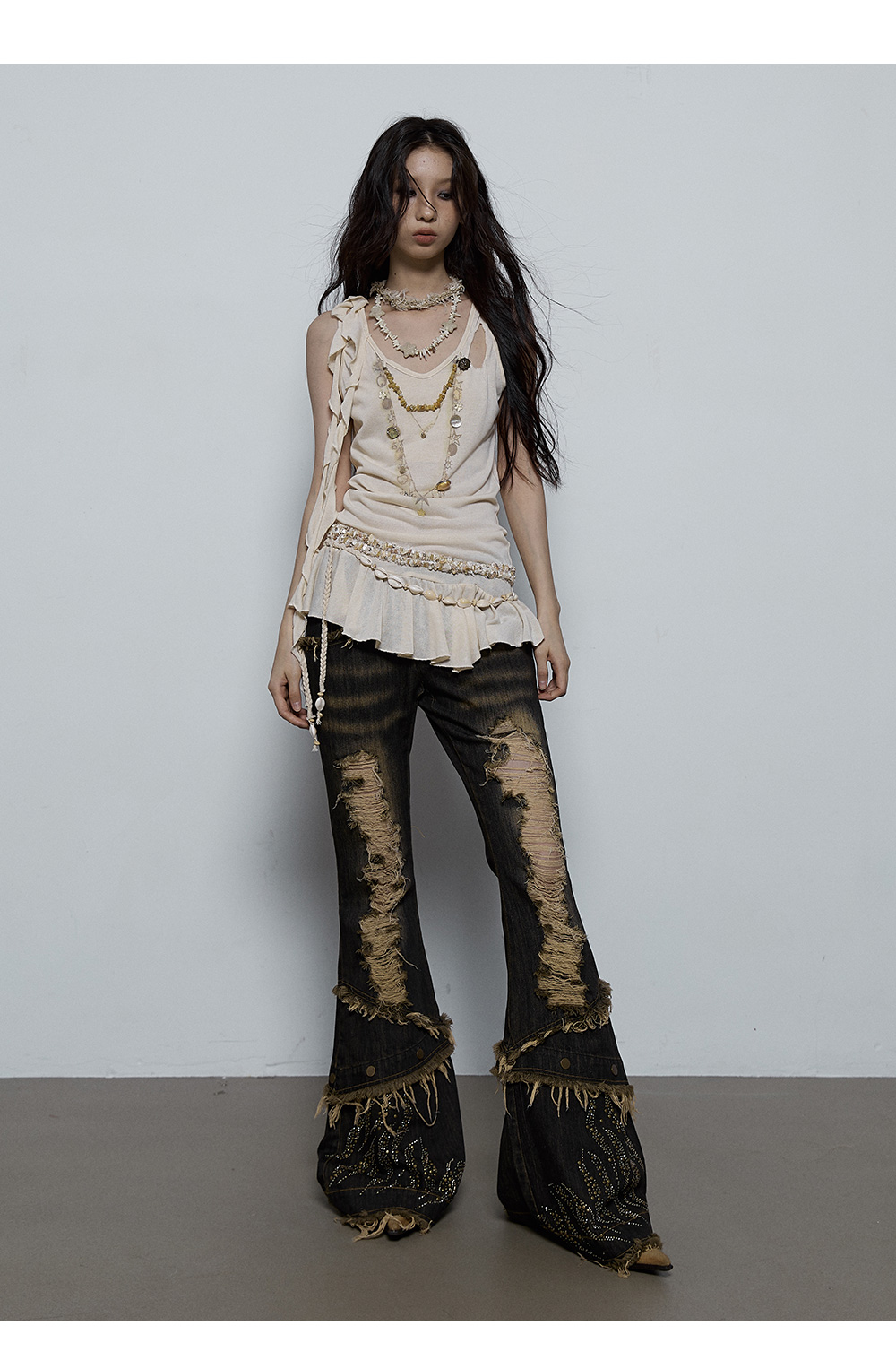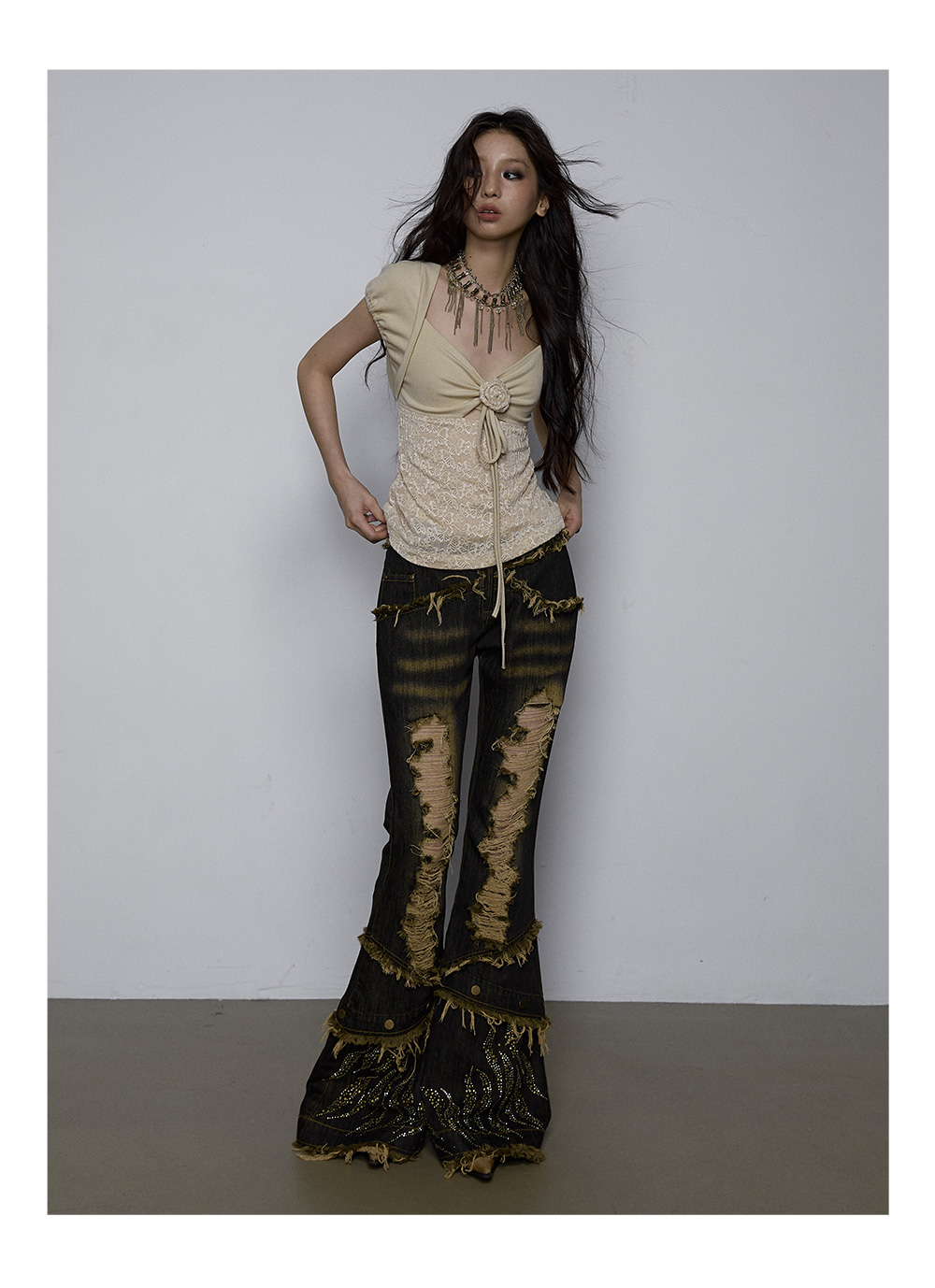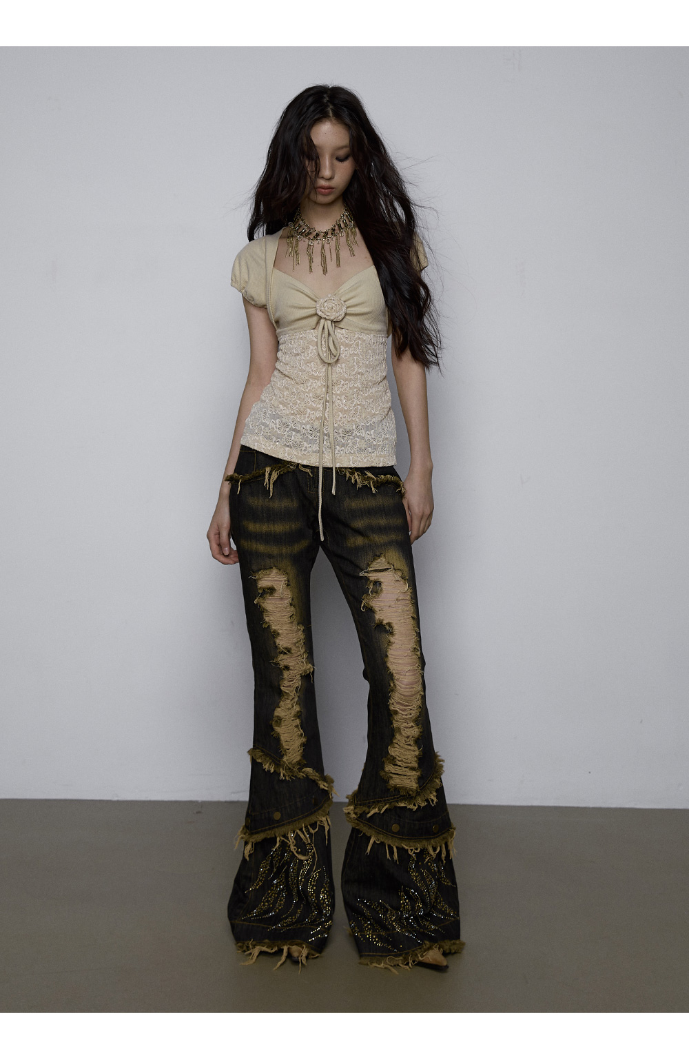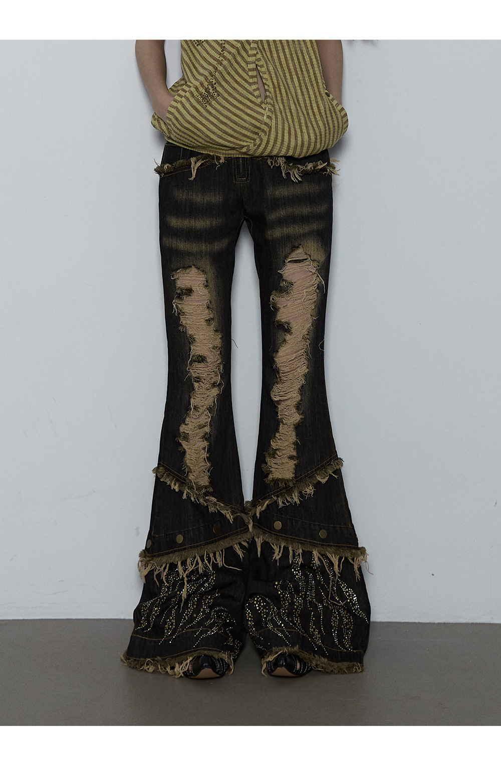Ripped Raw Edge Cropped Flared Jeans | Retro Hot Girl Two-Wear Design