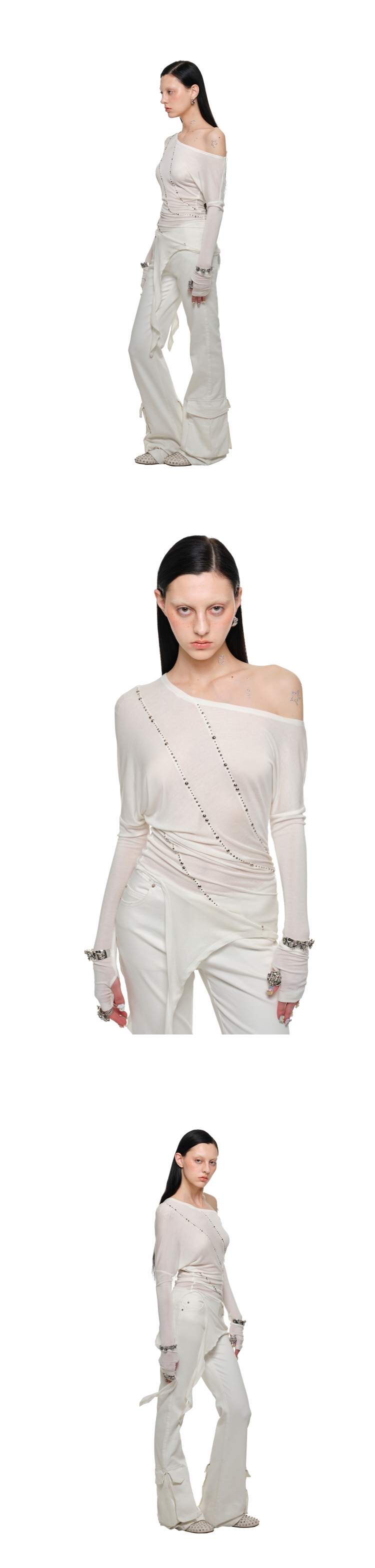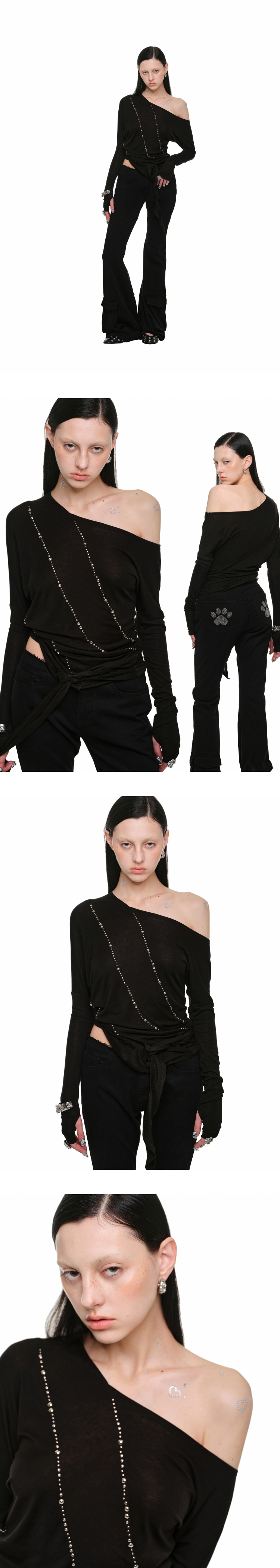 Rivet Slant-Shoulder Knit Top – Diamond Detail Irregular Style