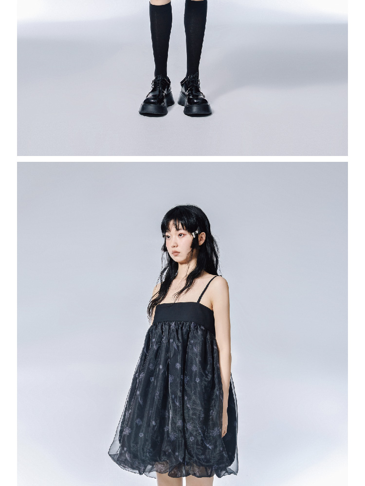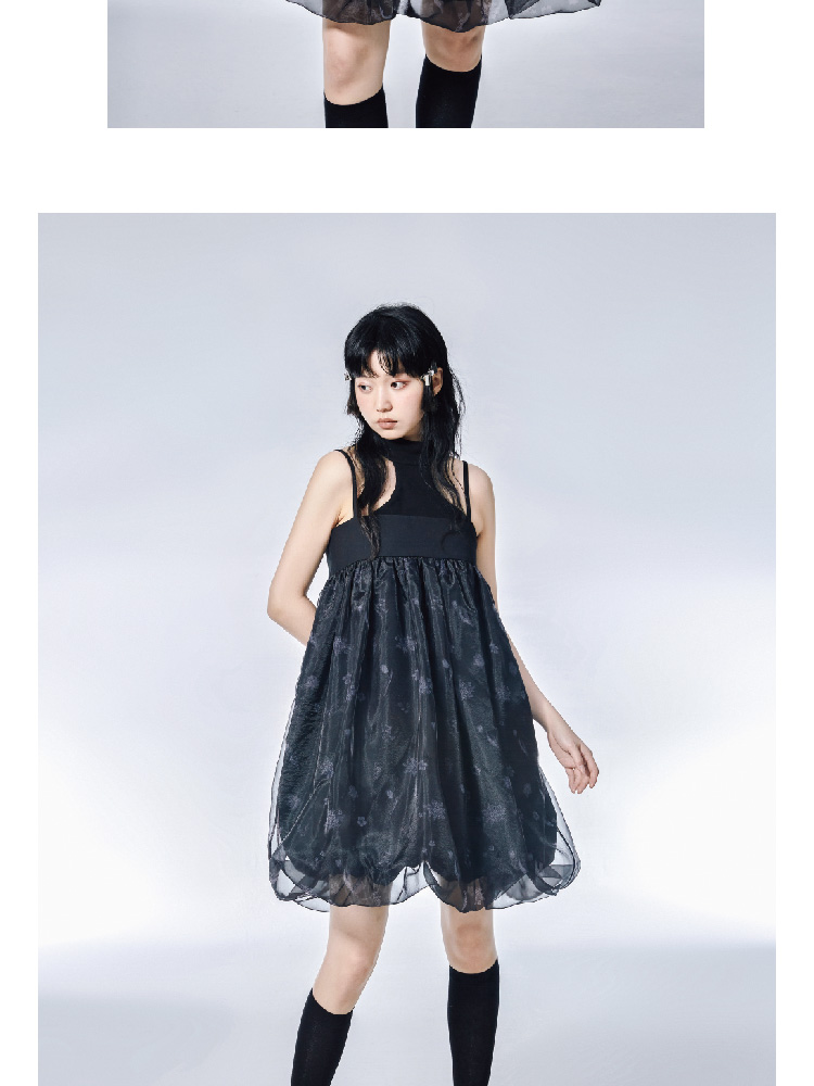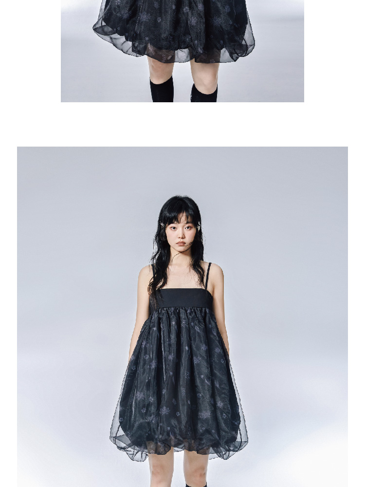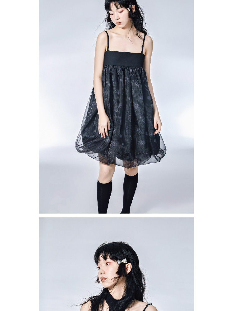 Pink Flower Print Organza Flower Bract Sling Dress