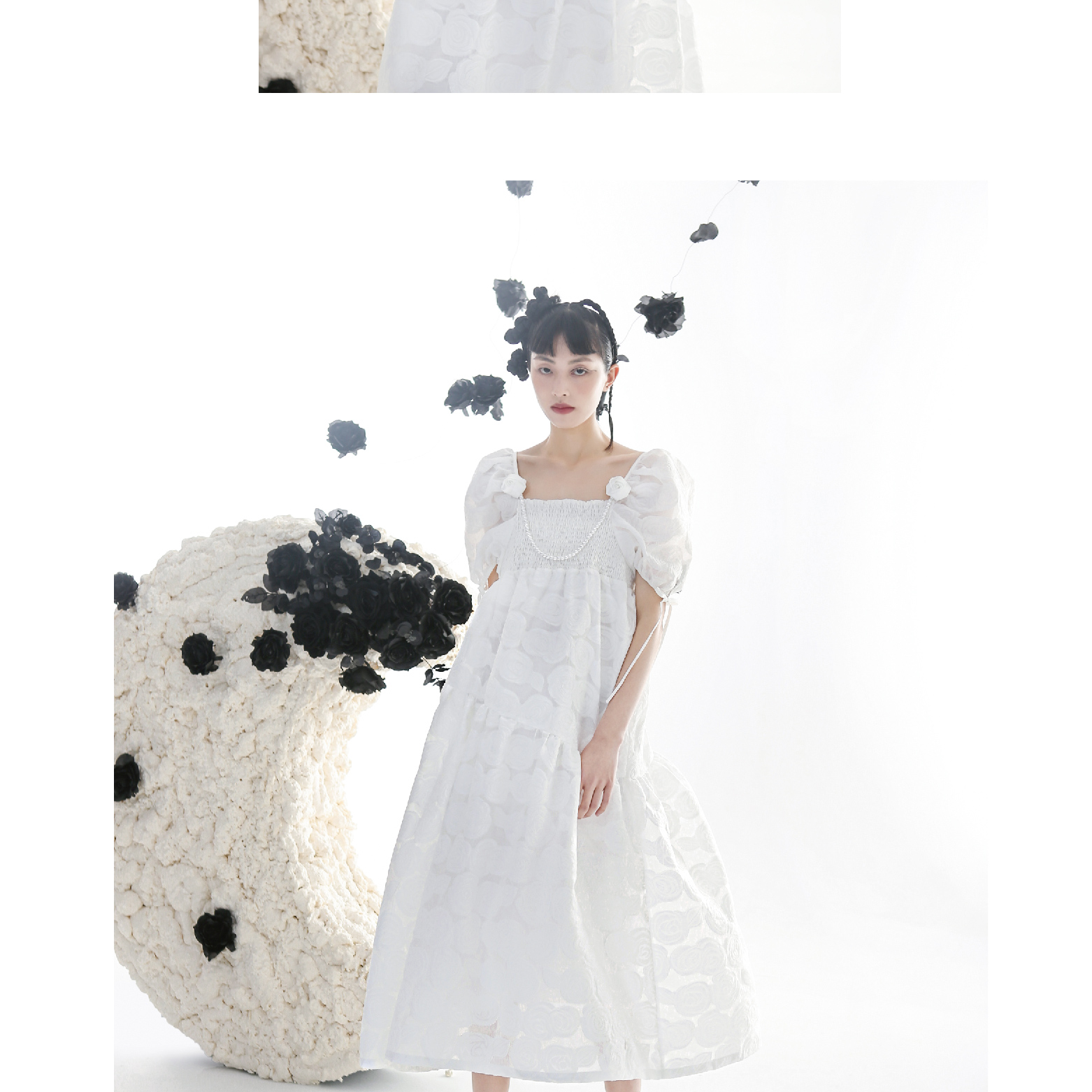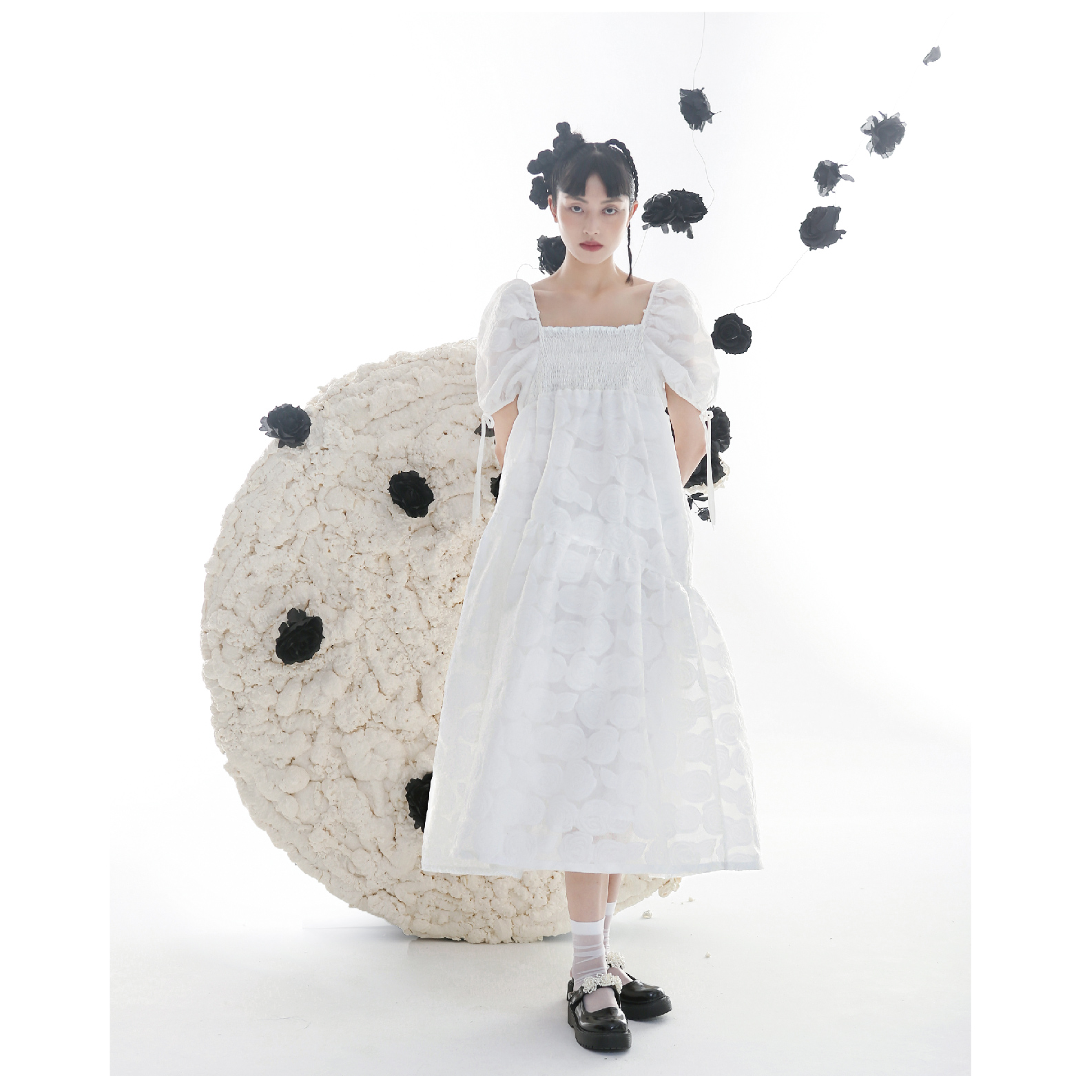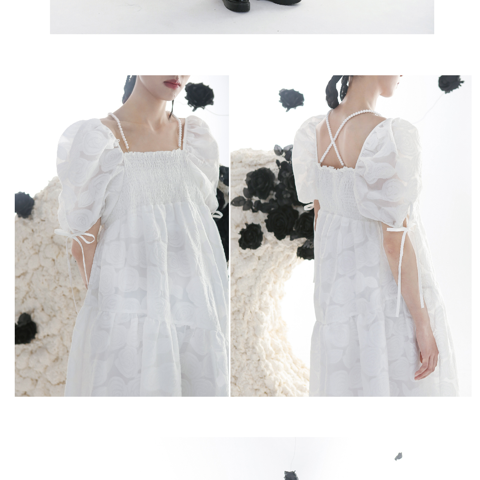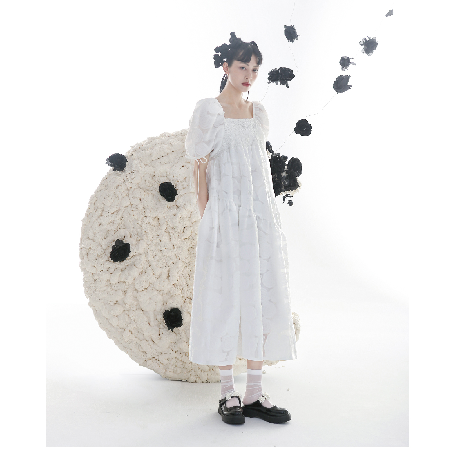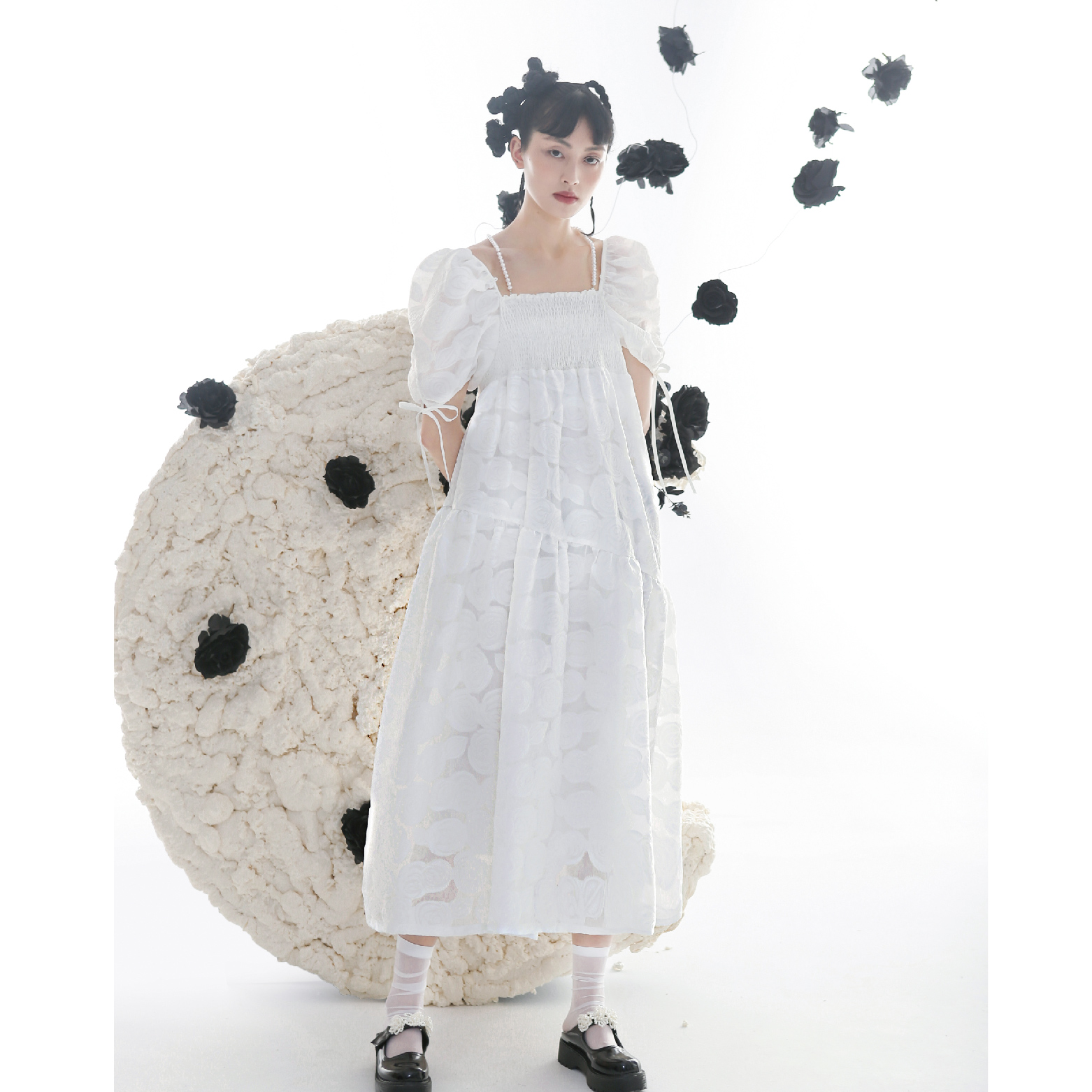 Romantic Rose Jacquard Bubble Sleeves Square Neck Dress