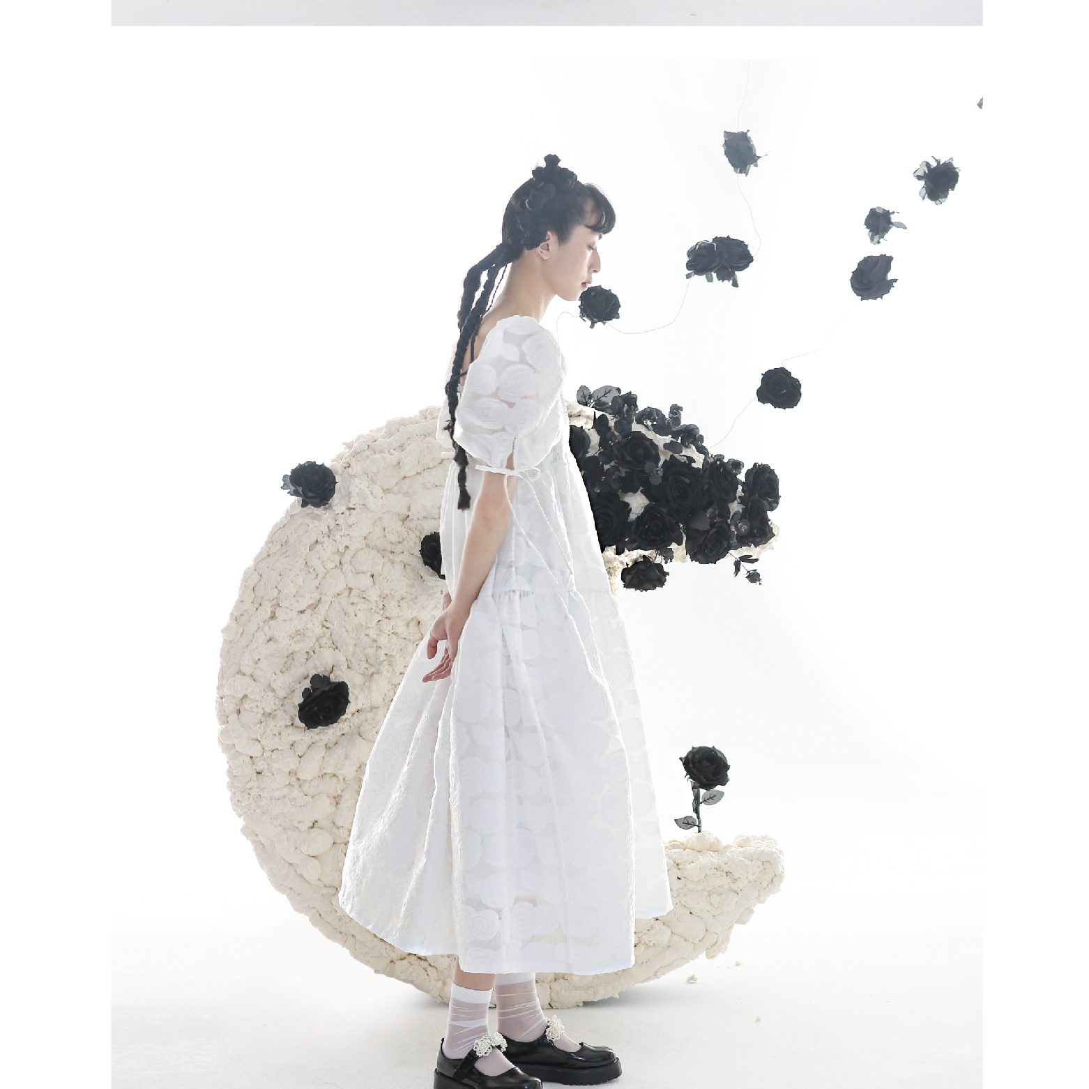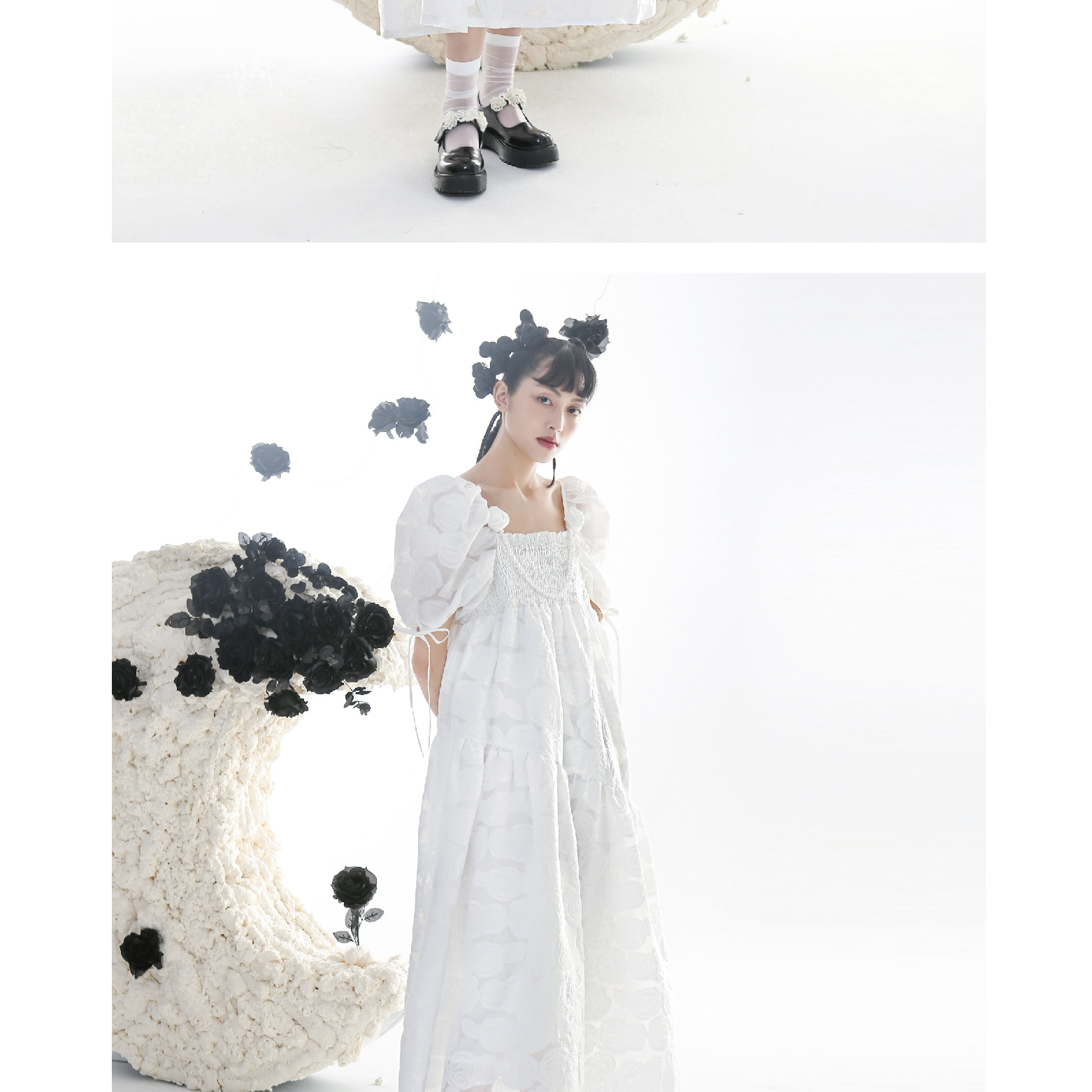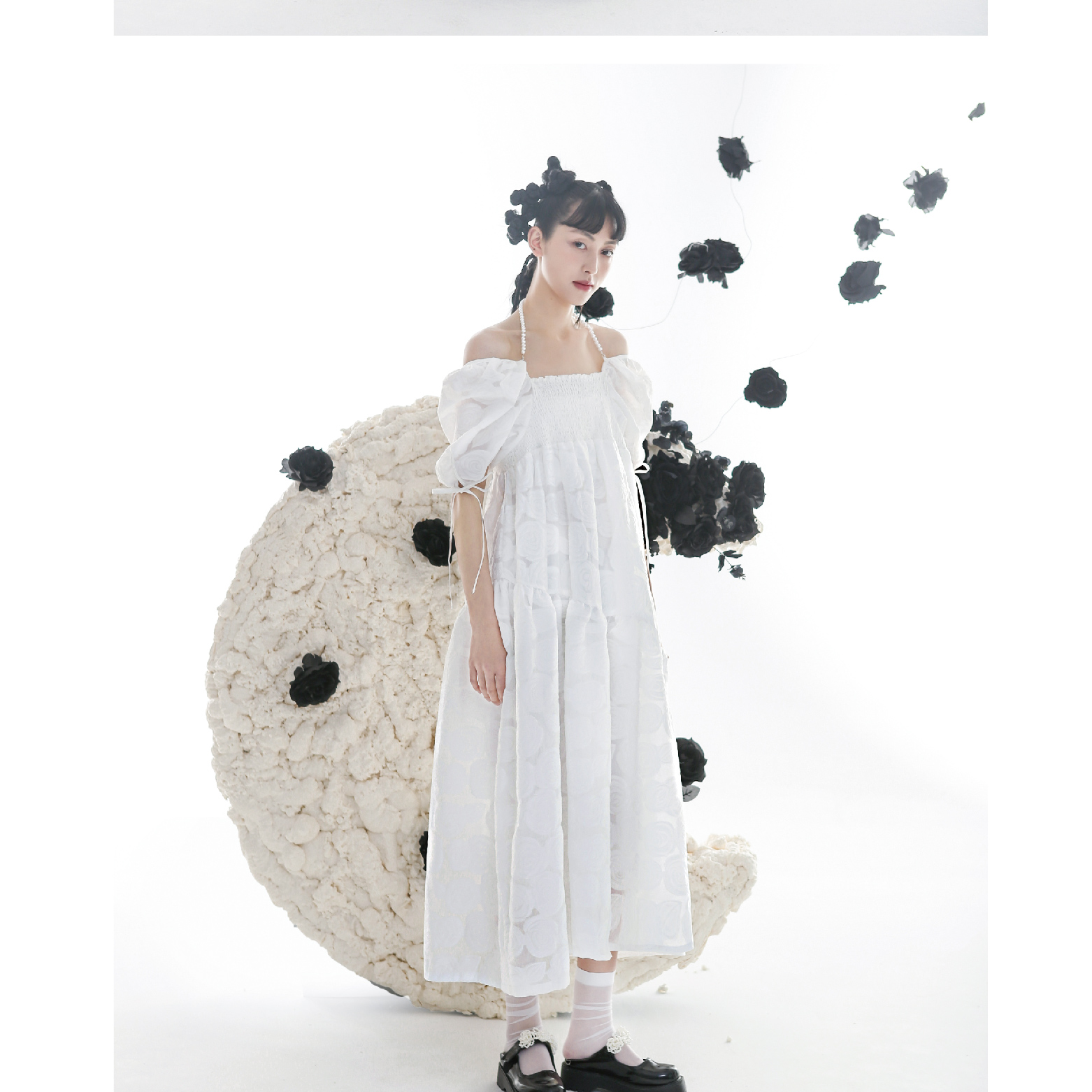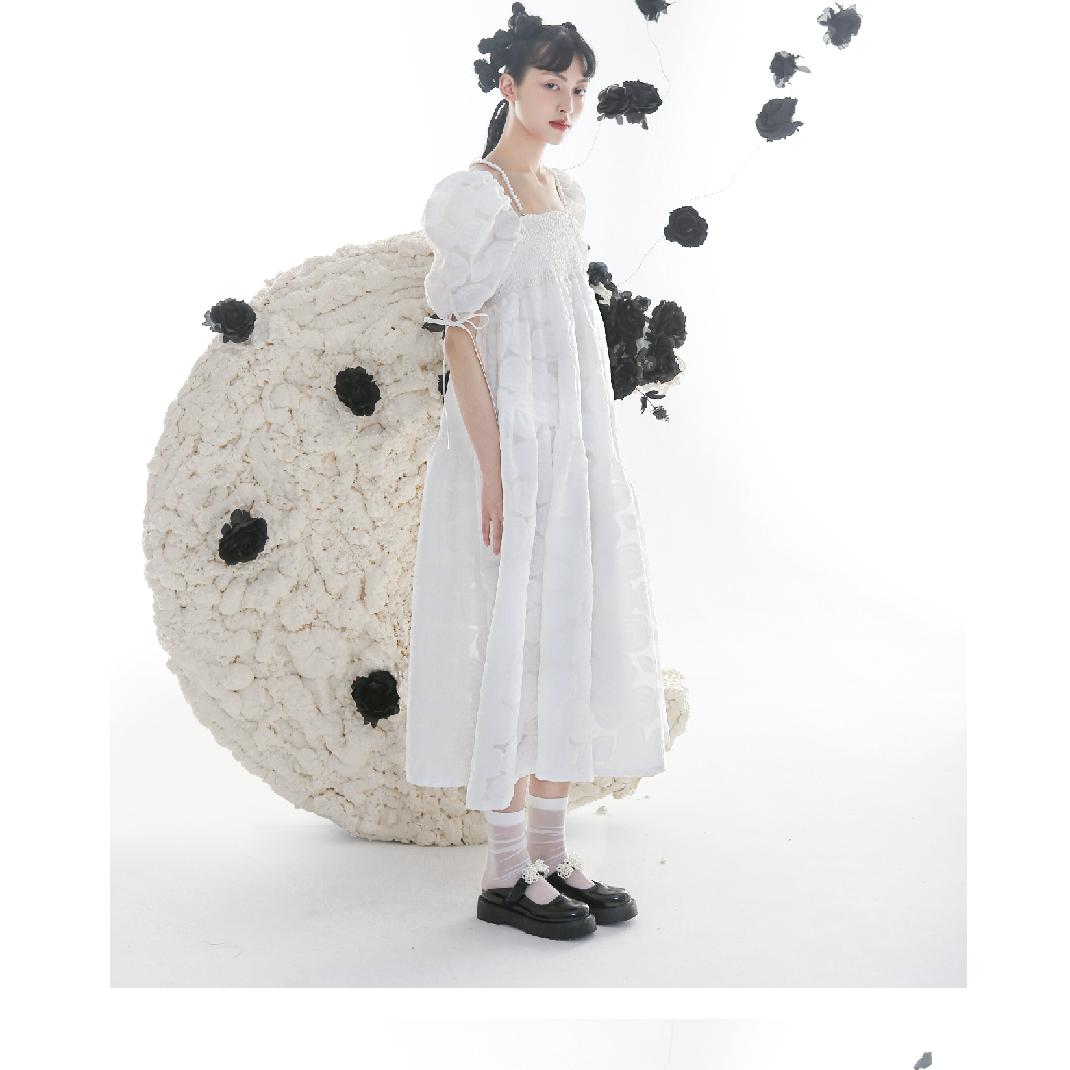 Romantic Rose Jacquard Bubble Sleeves Square Neck Dress