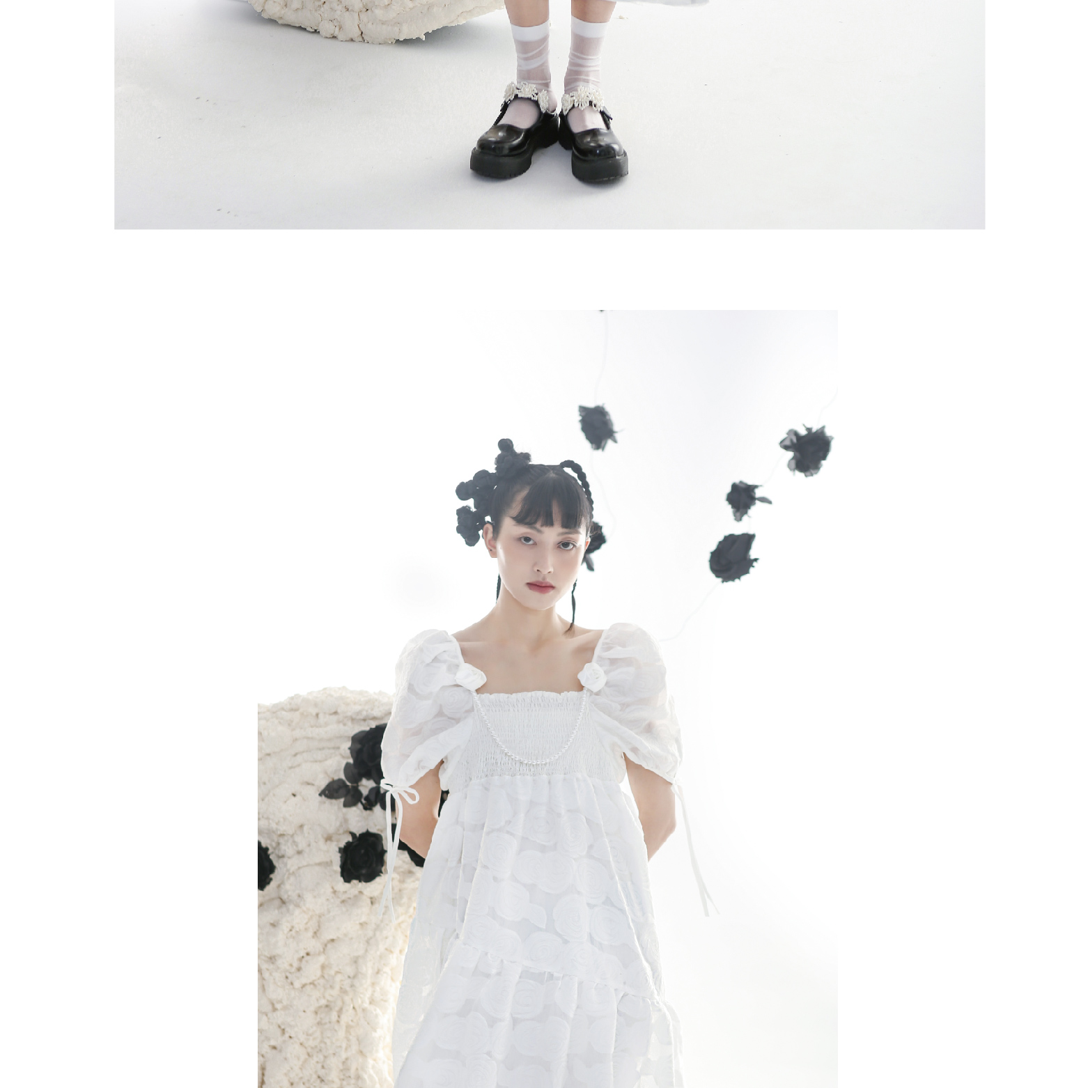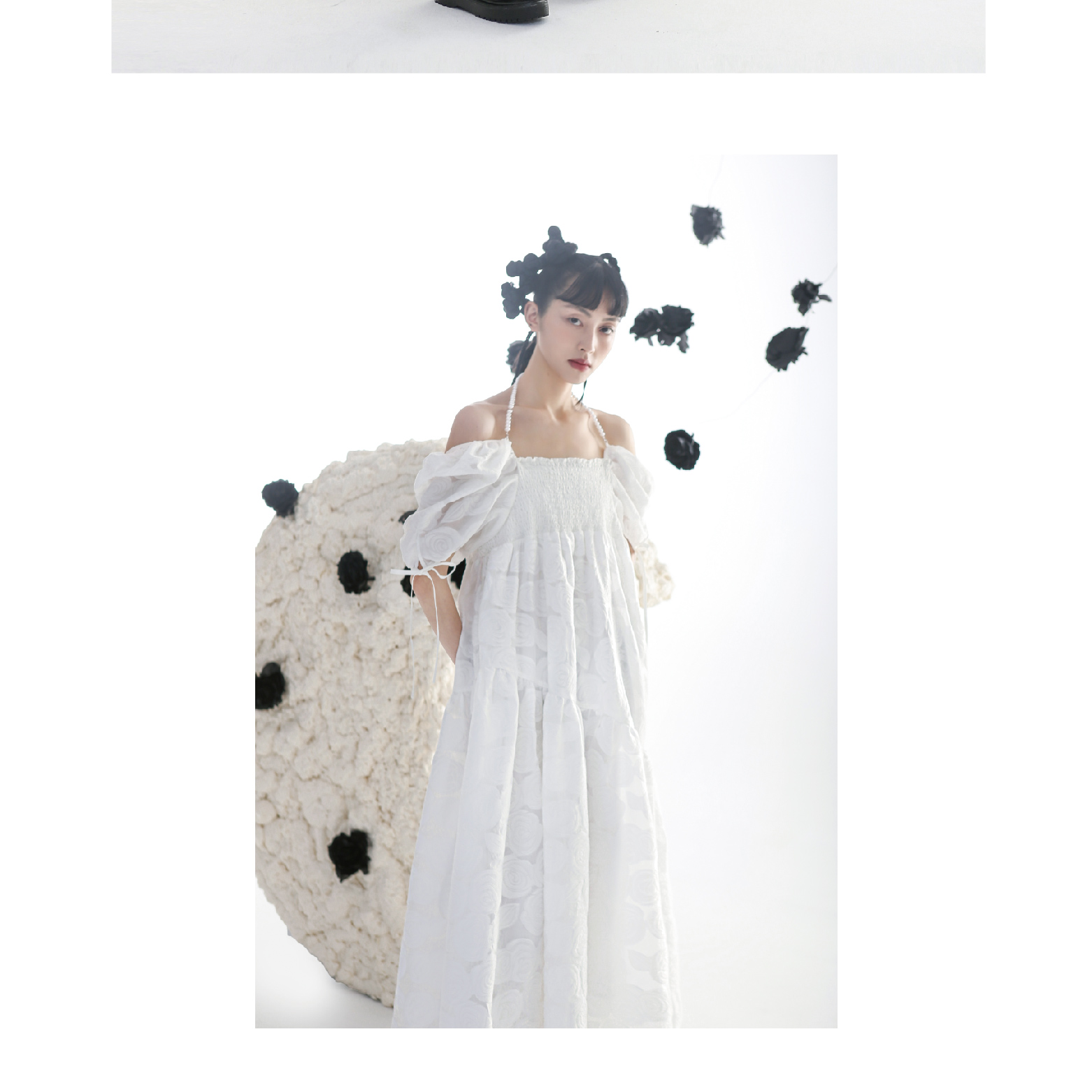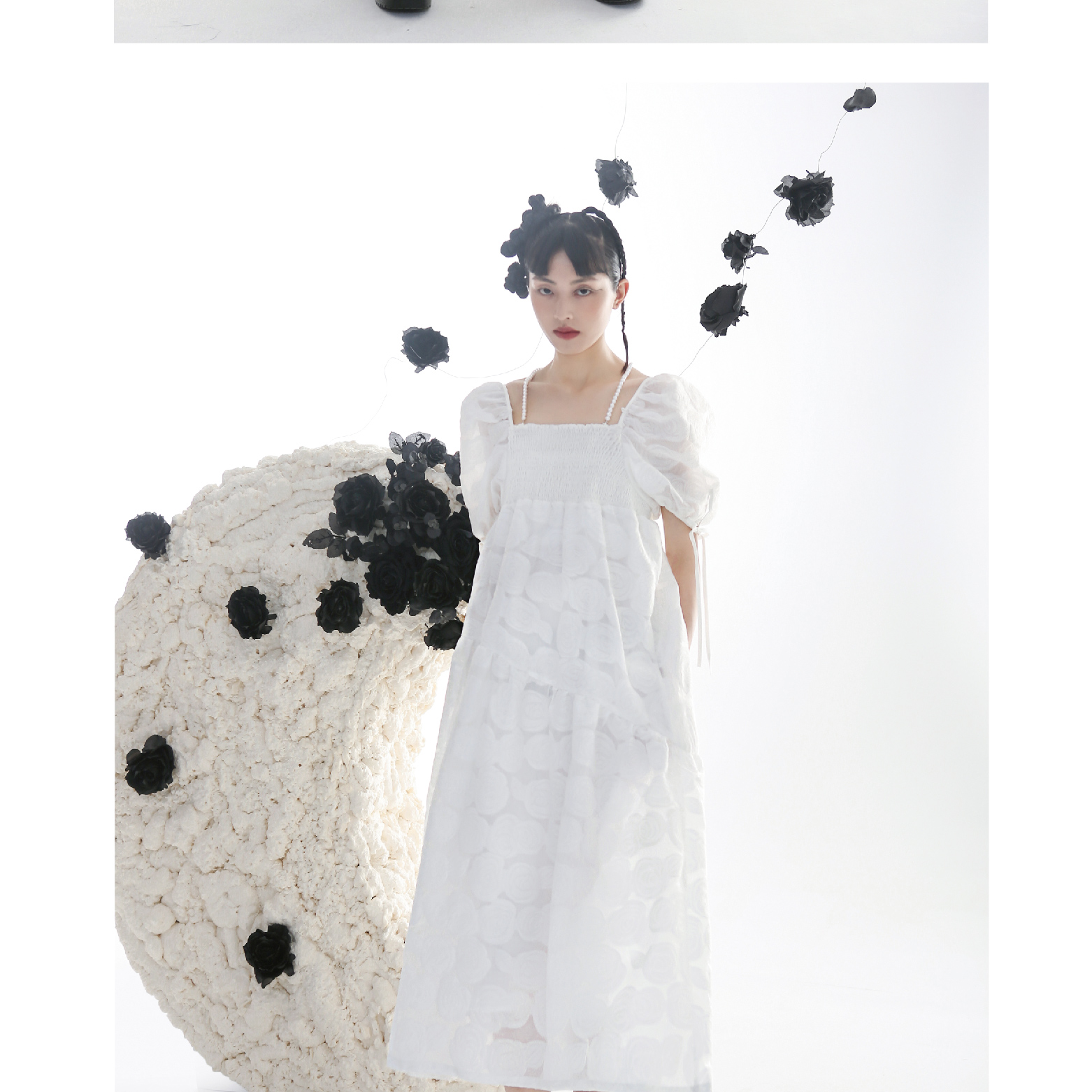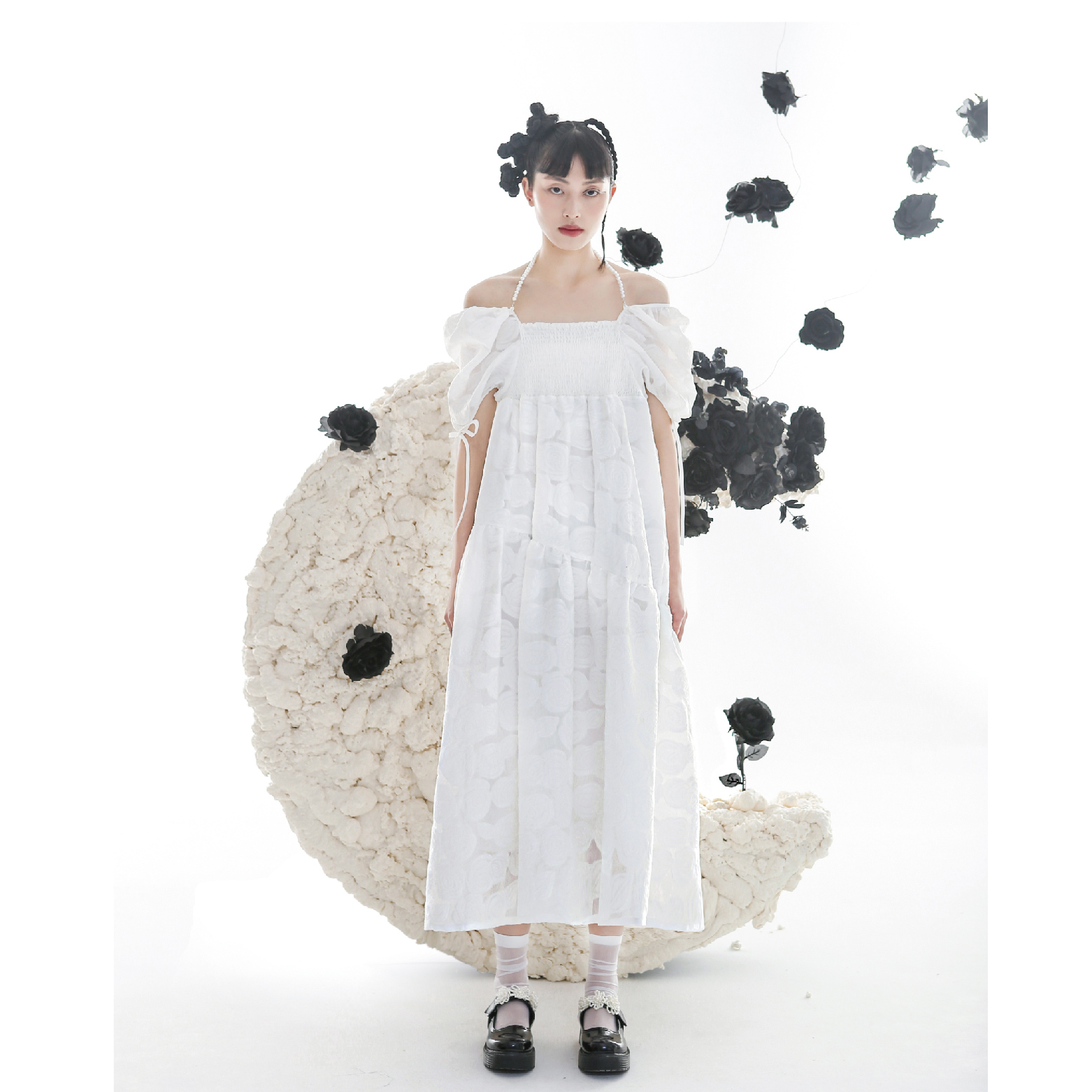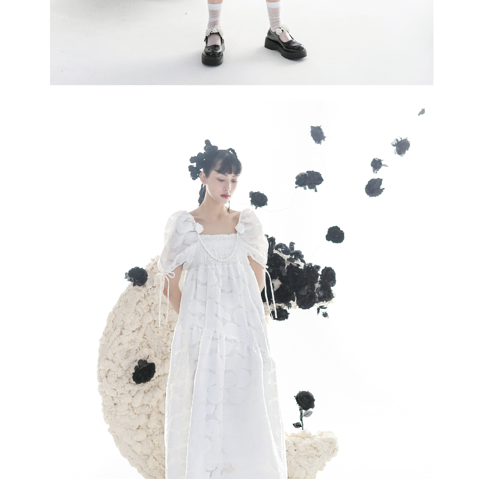 Romantic Rose Jacquard Bubble Sleeves Square Neck Dress