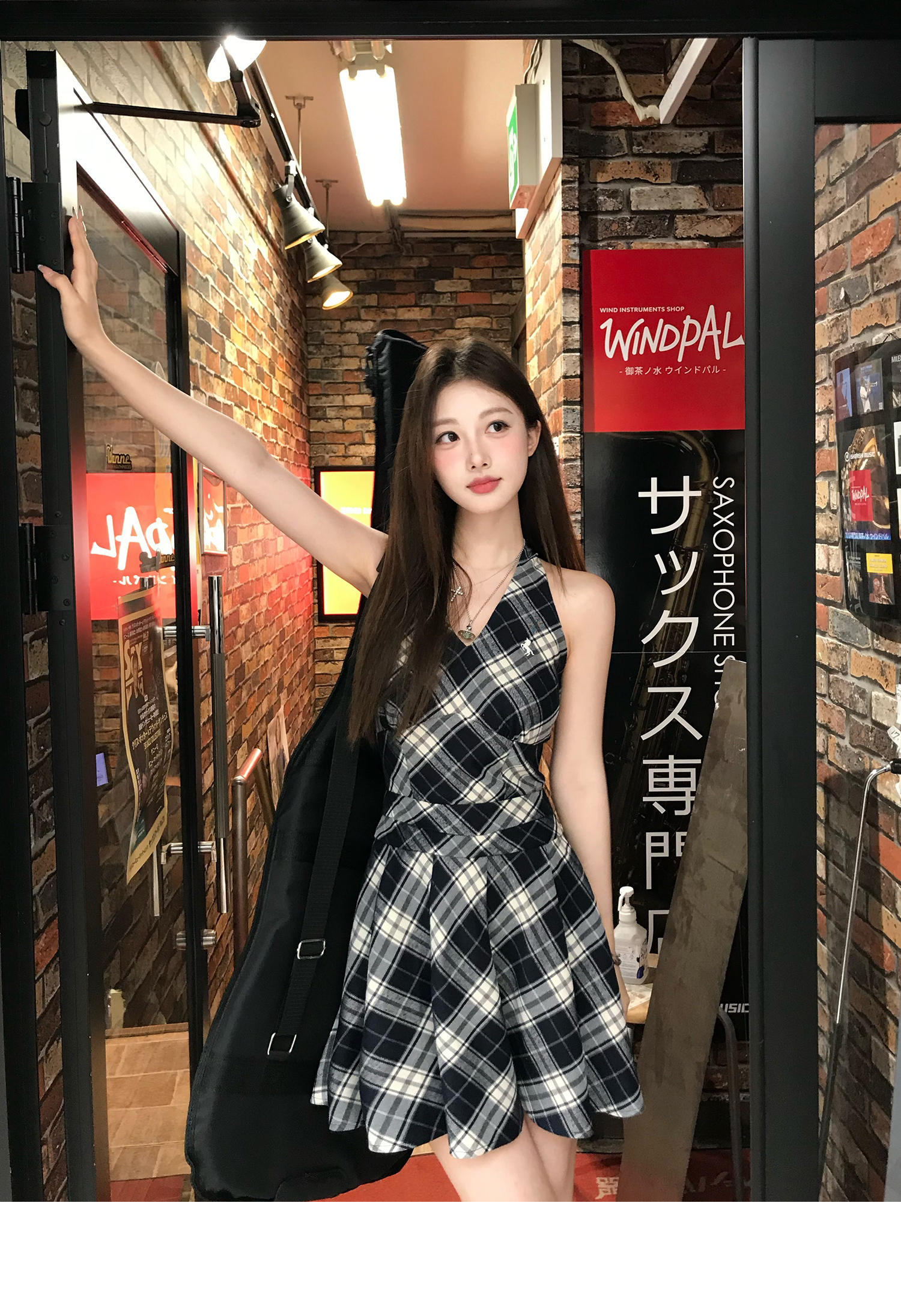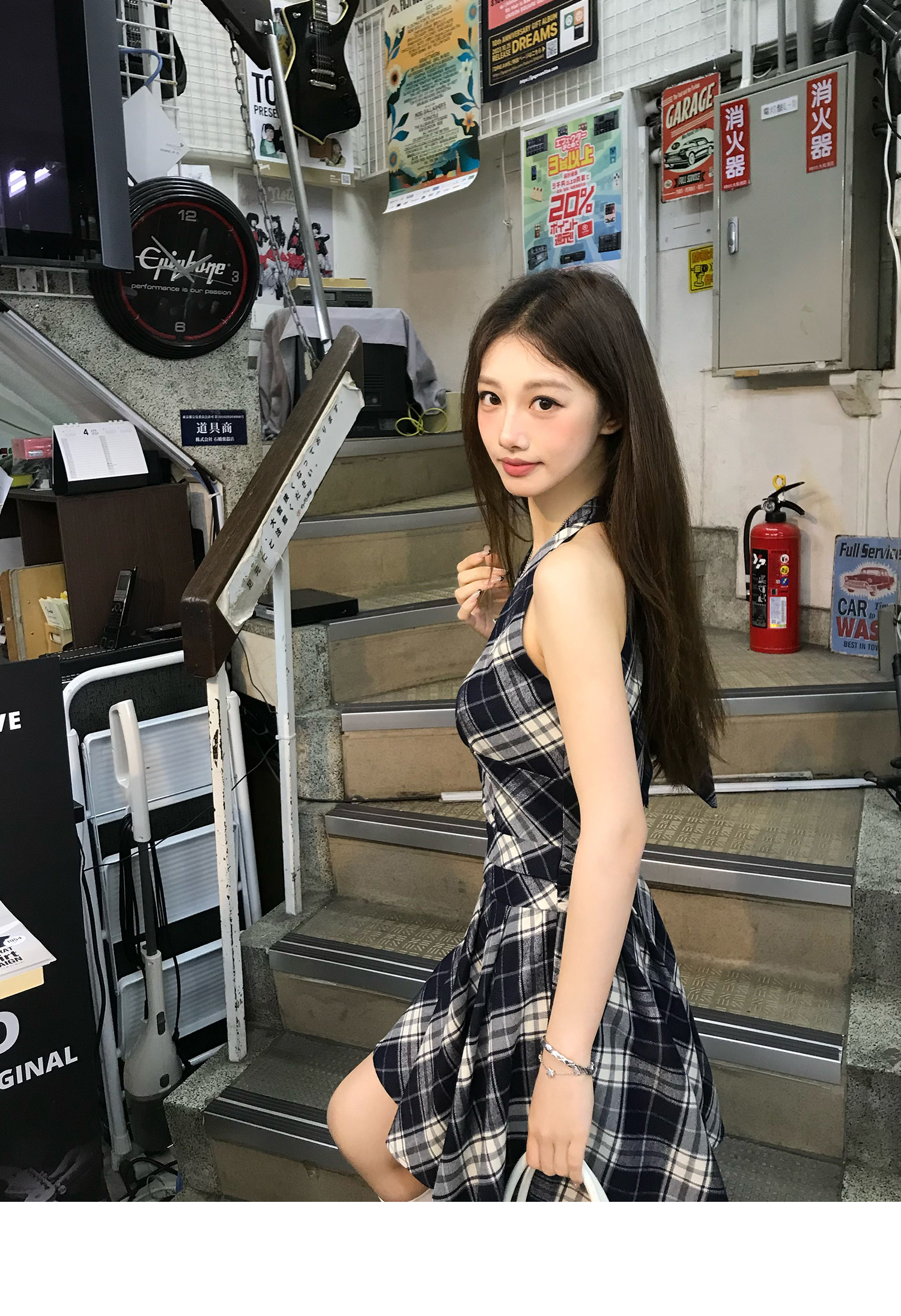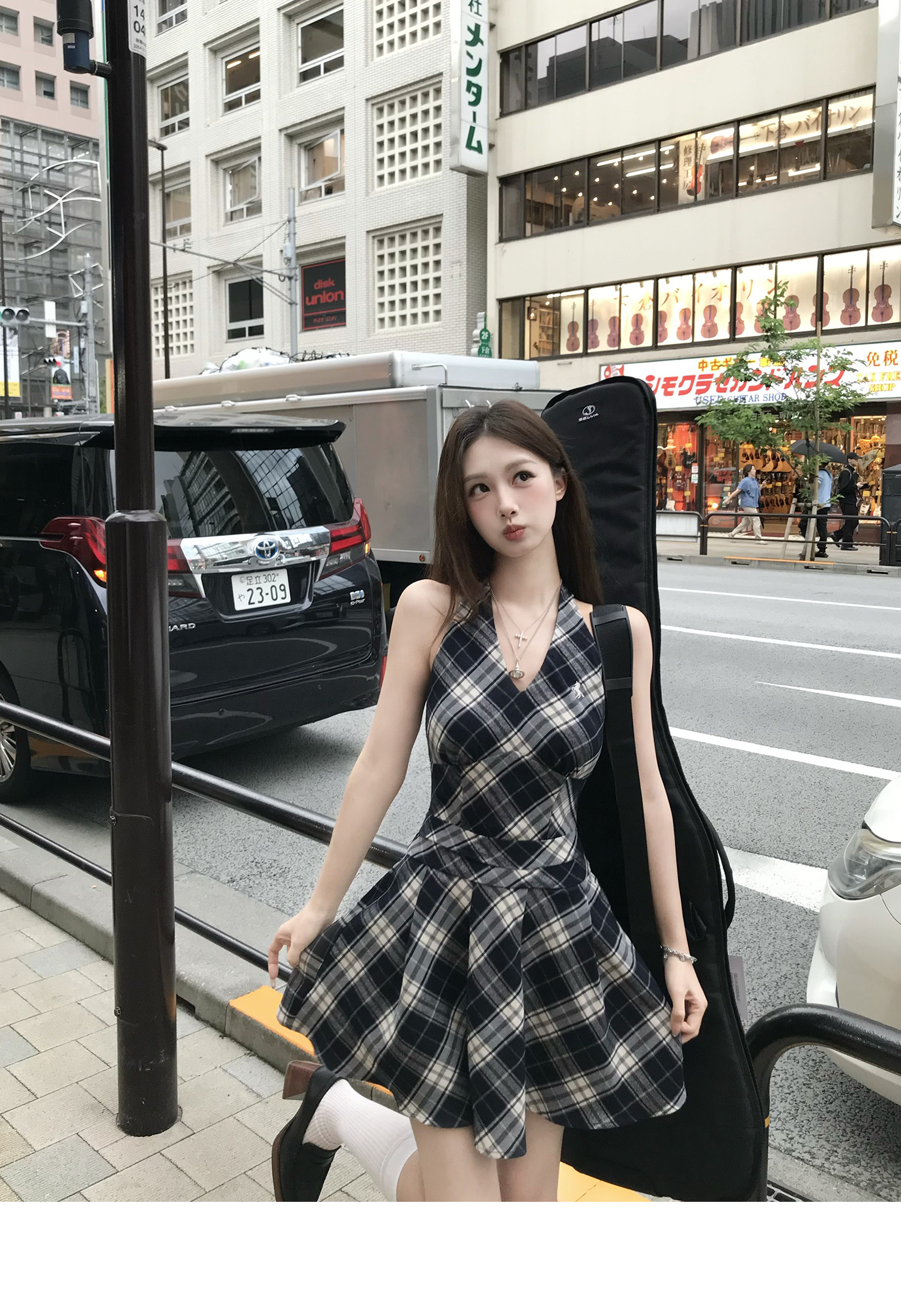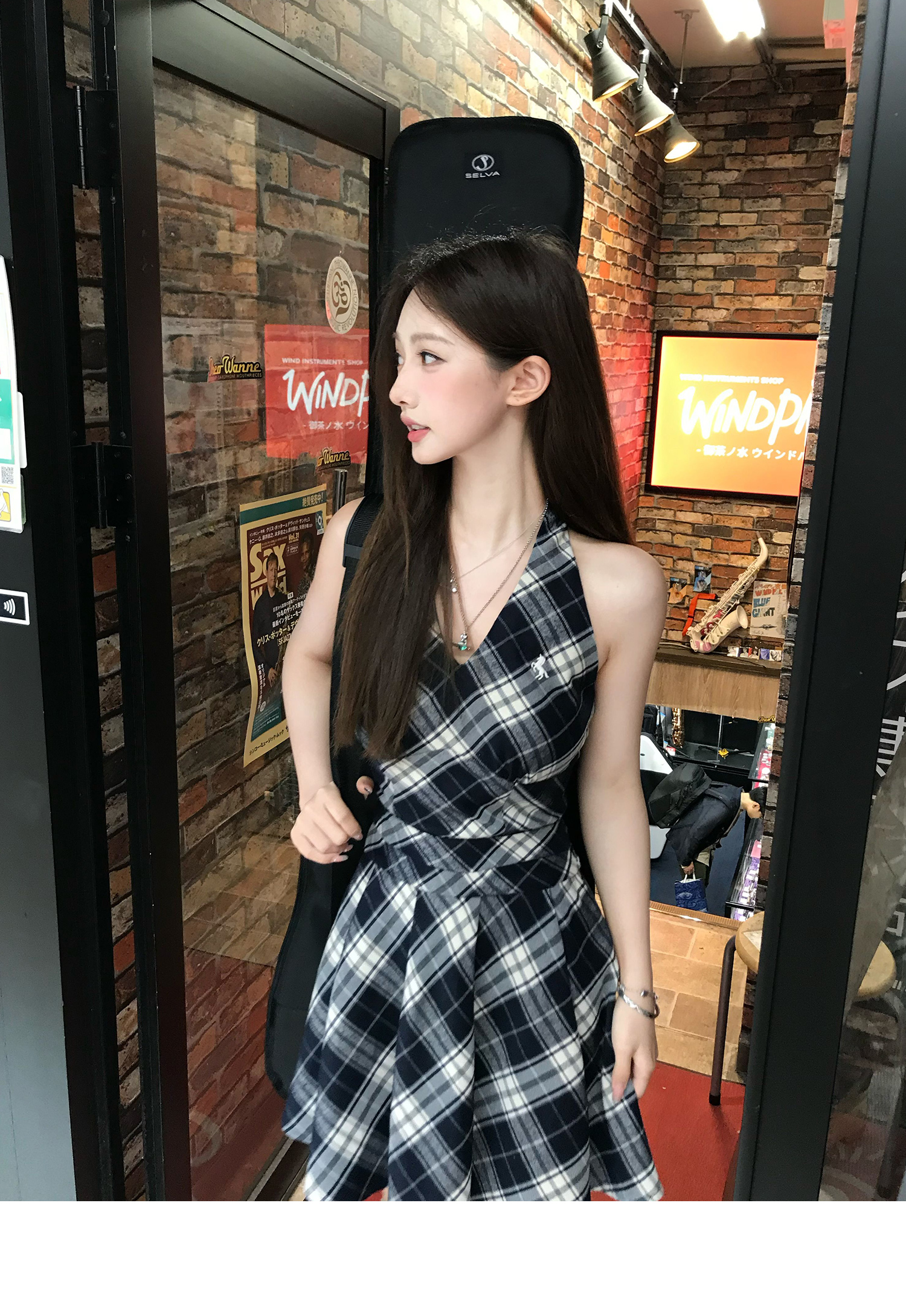 Showa Girls Checkered Dress - V-Neck Halterneck Strap Skirt for Summer