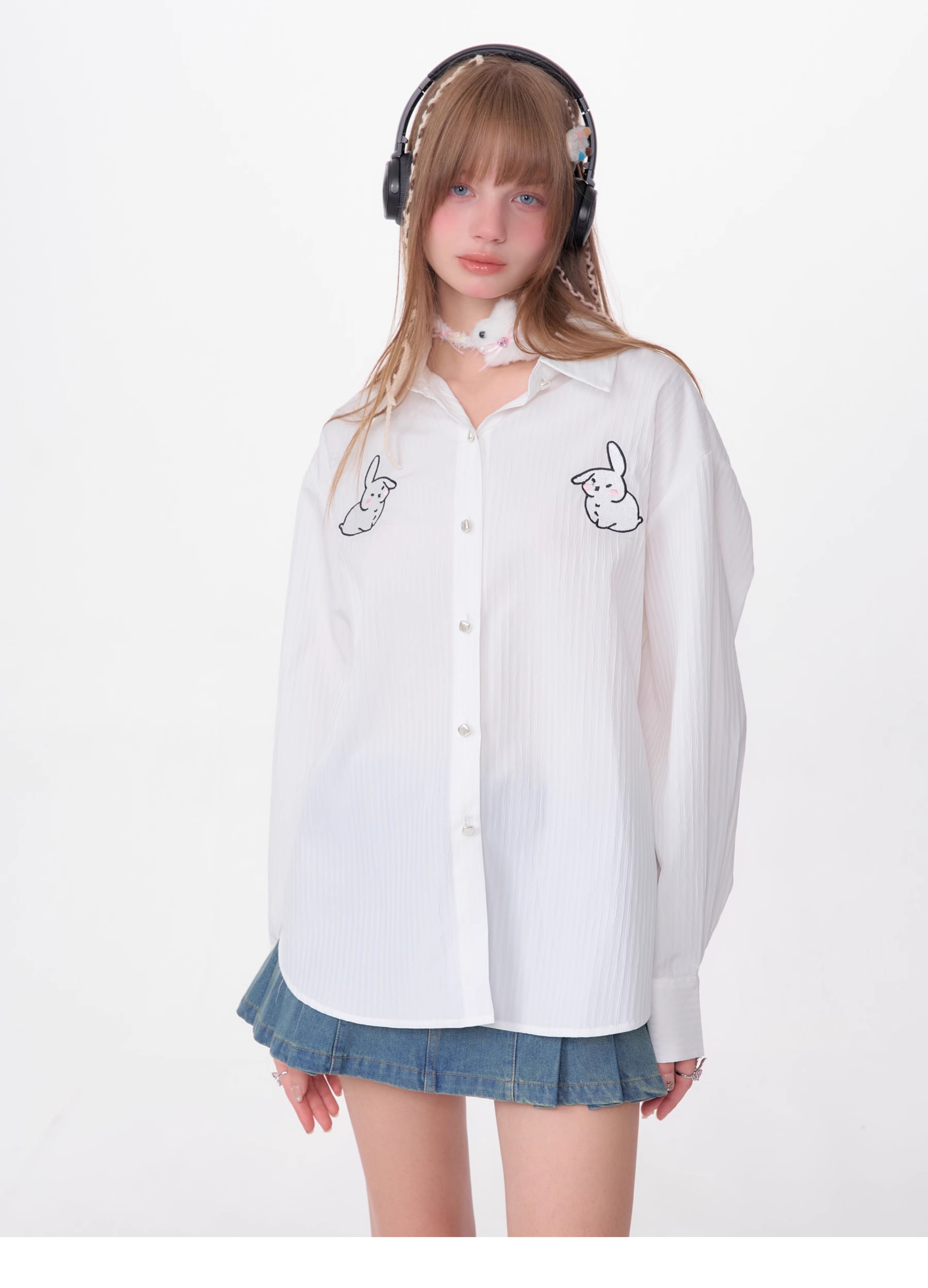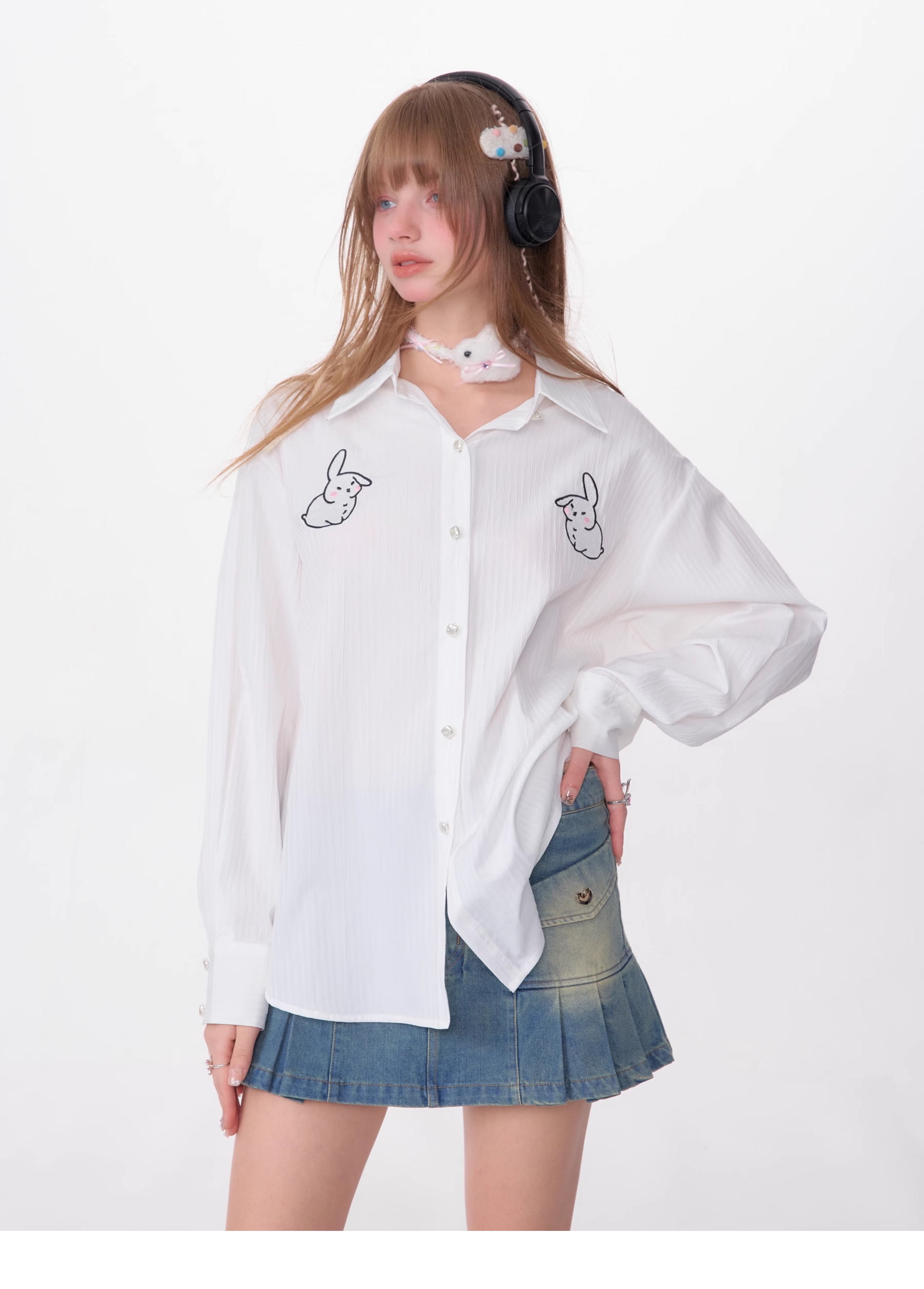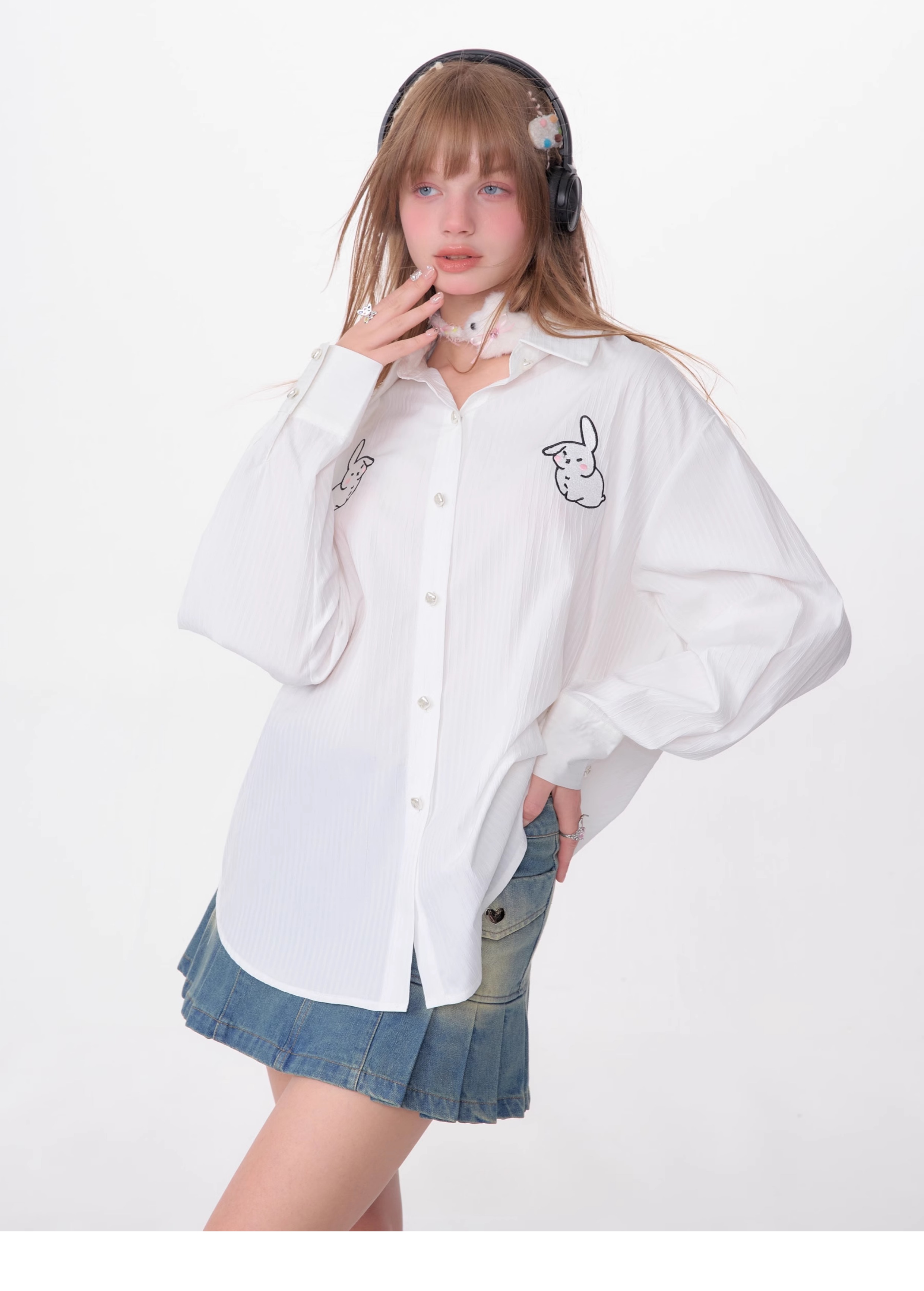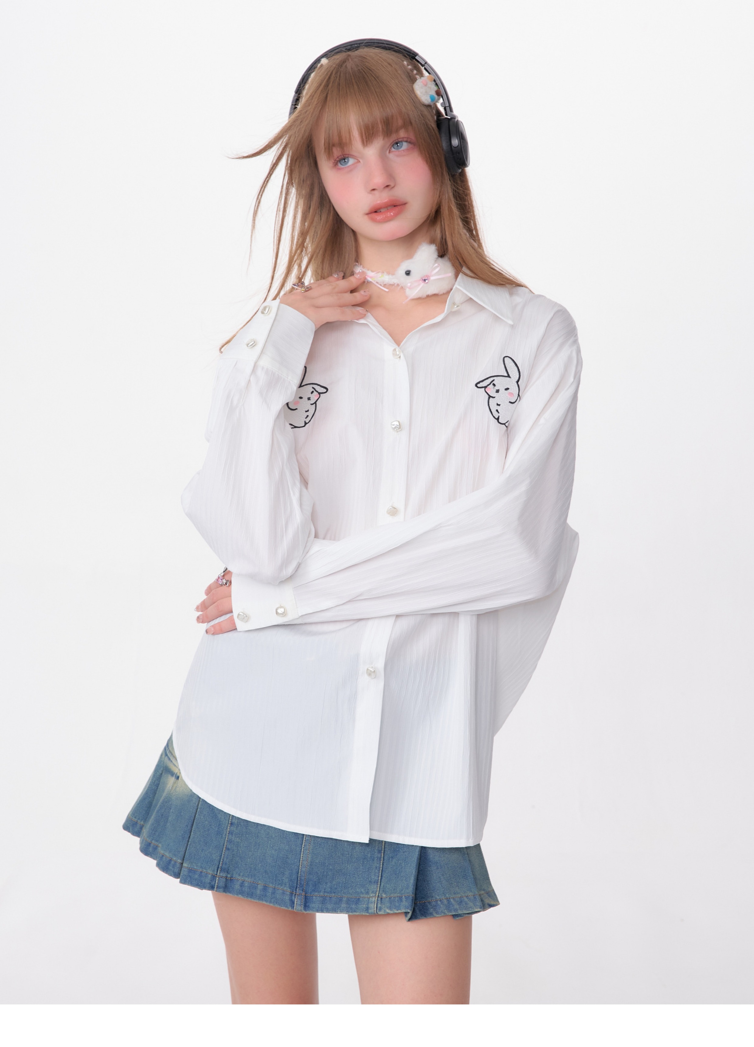 Rabbit Embroidered Loose White Shirt | Medium-Length Retro Design for Spring/Summer