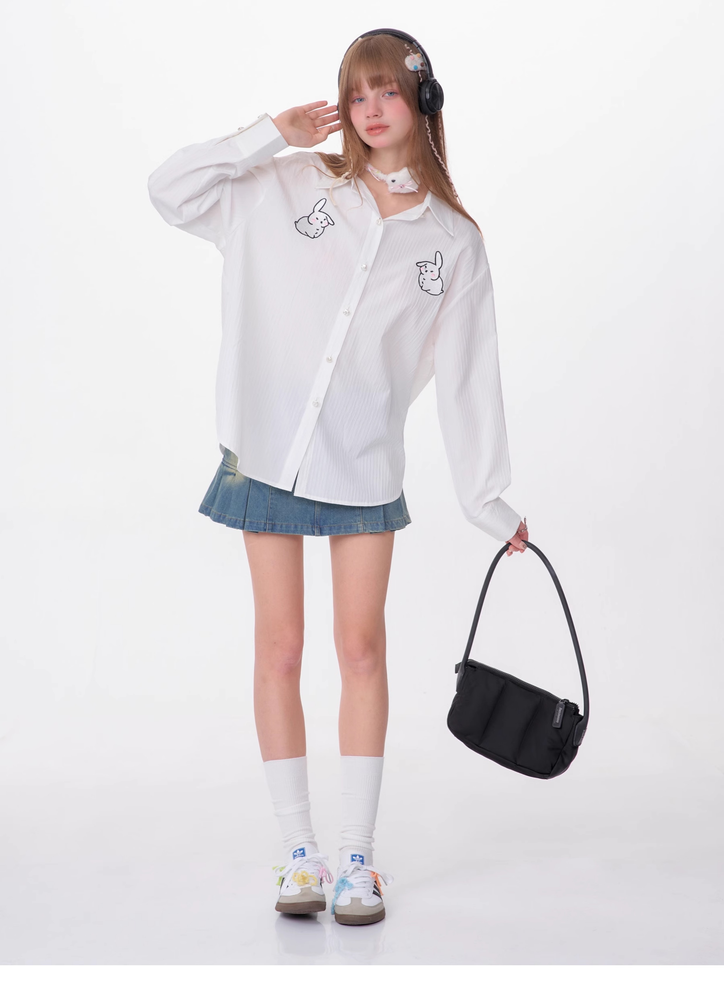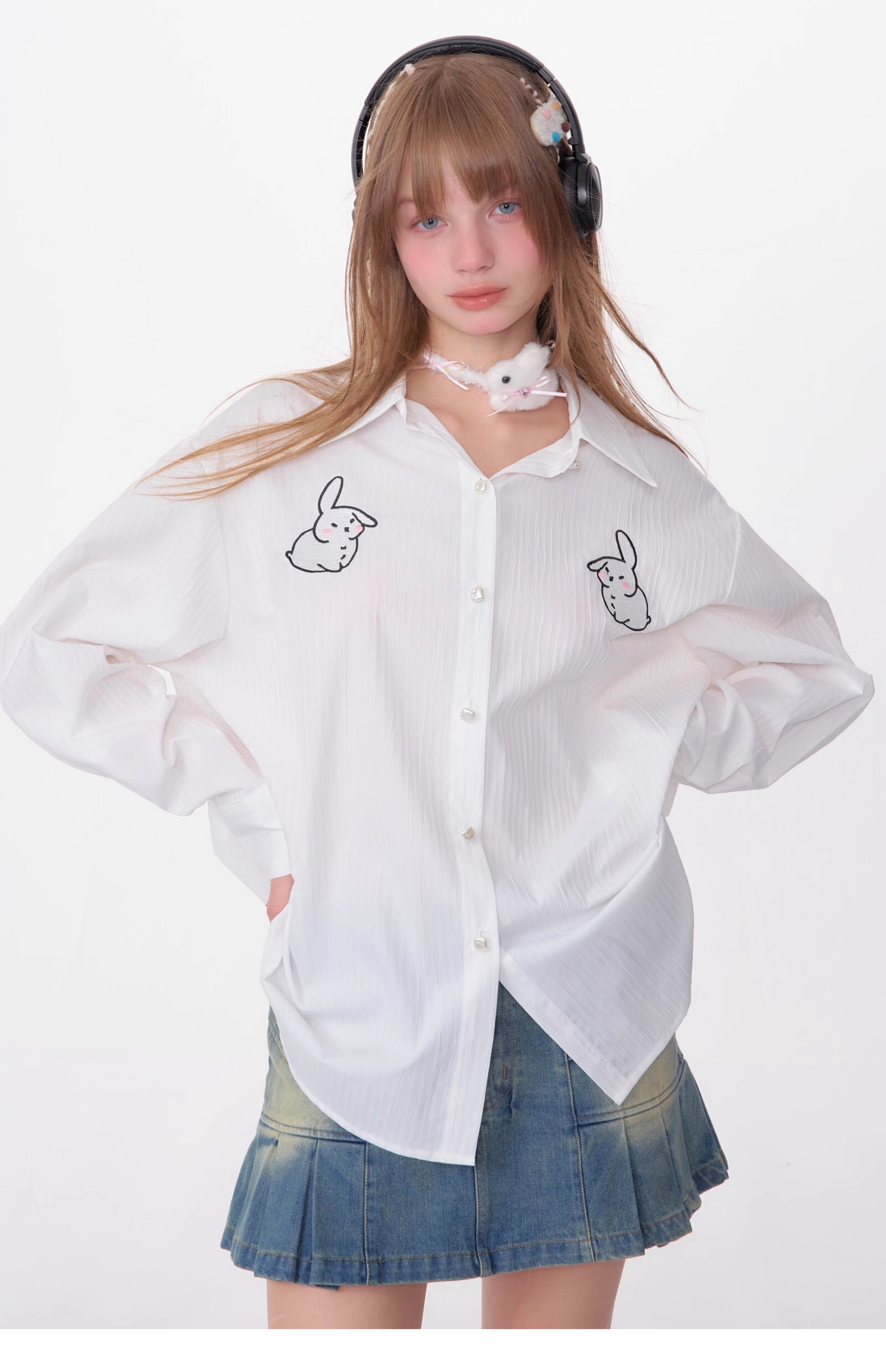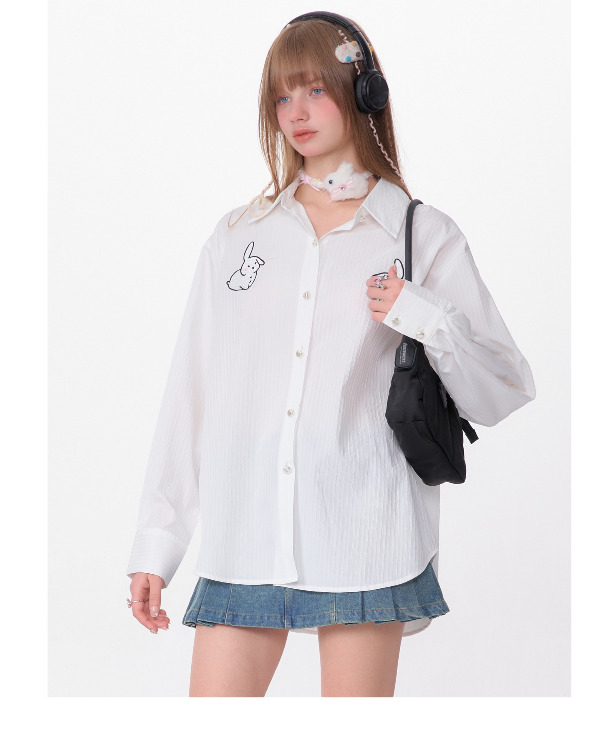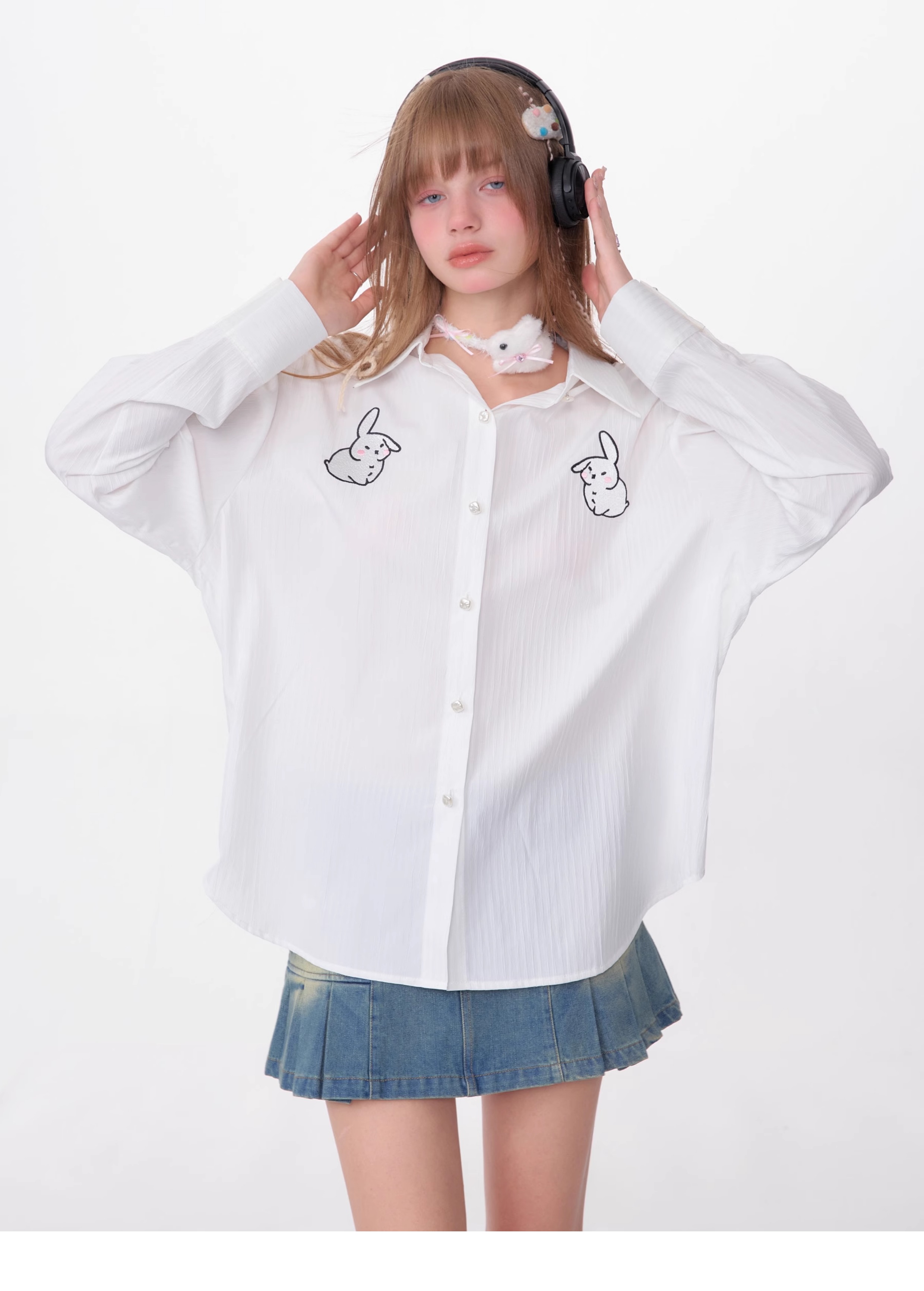 Rabbit Embroidered Loose White Shirt | Medium-Length Retro Design for Spring/Summer