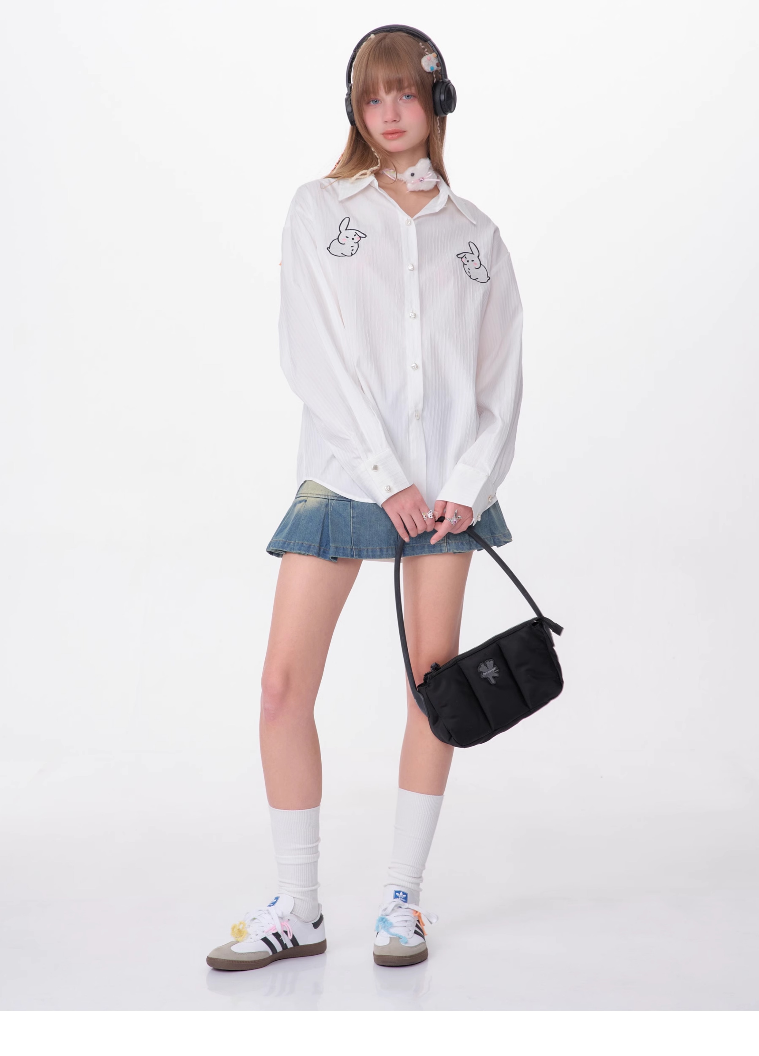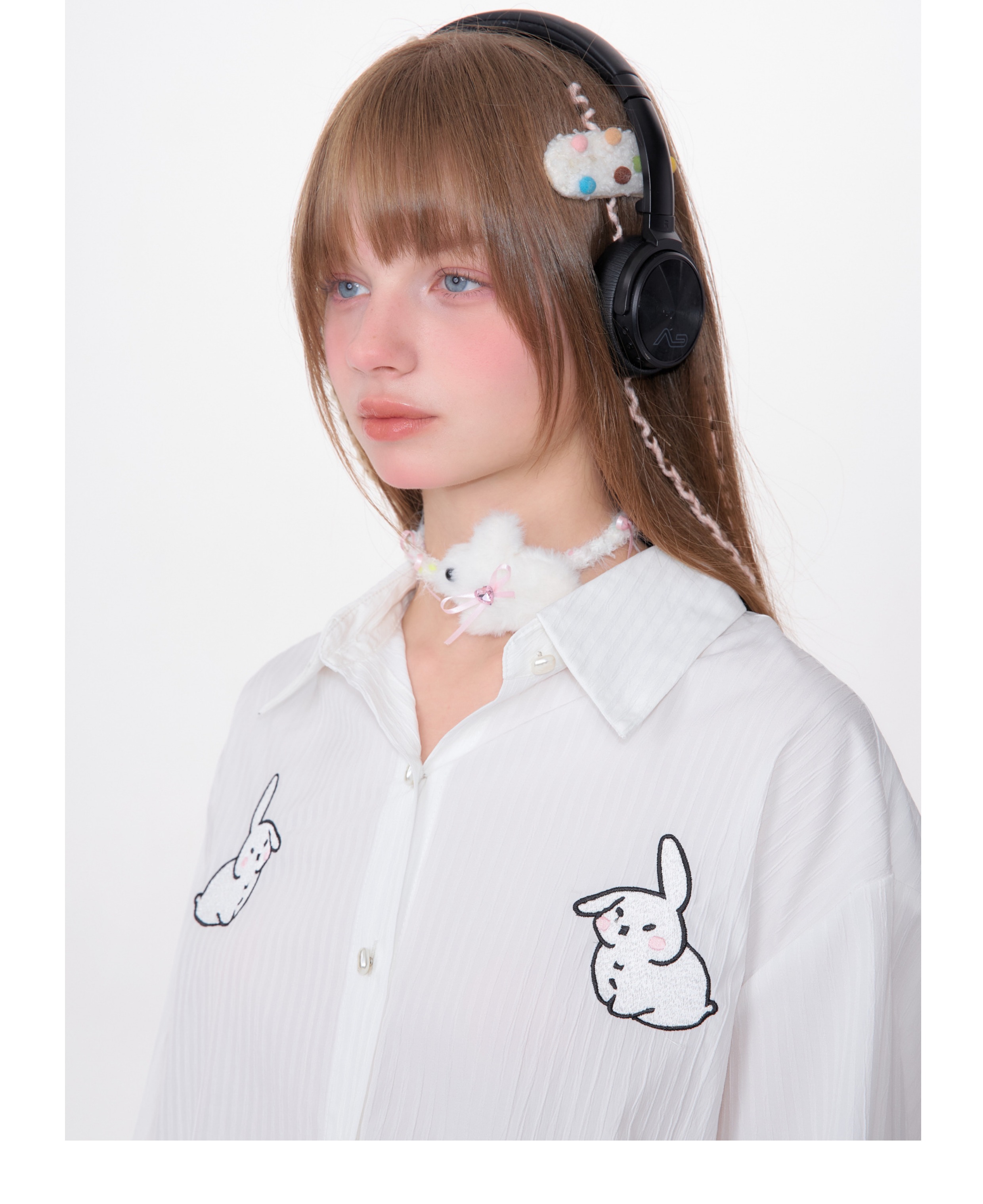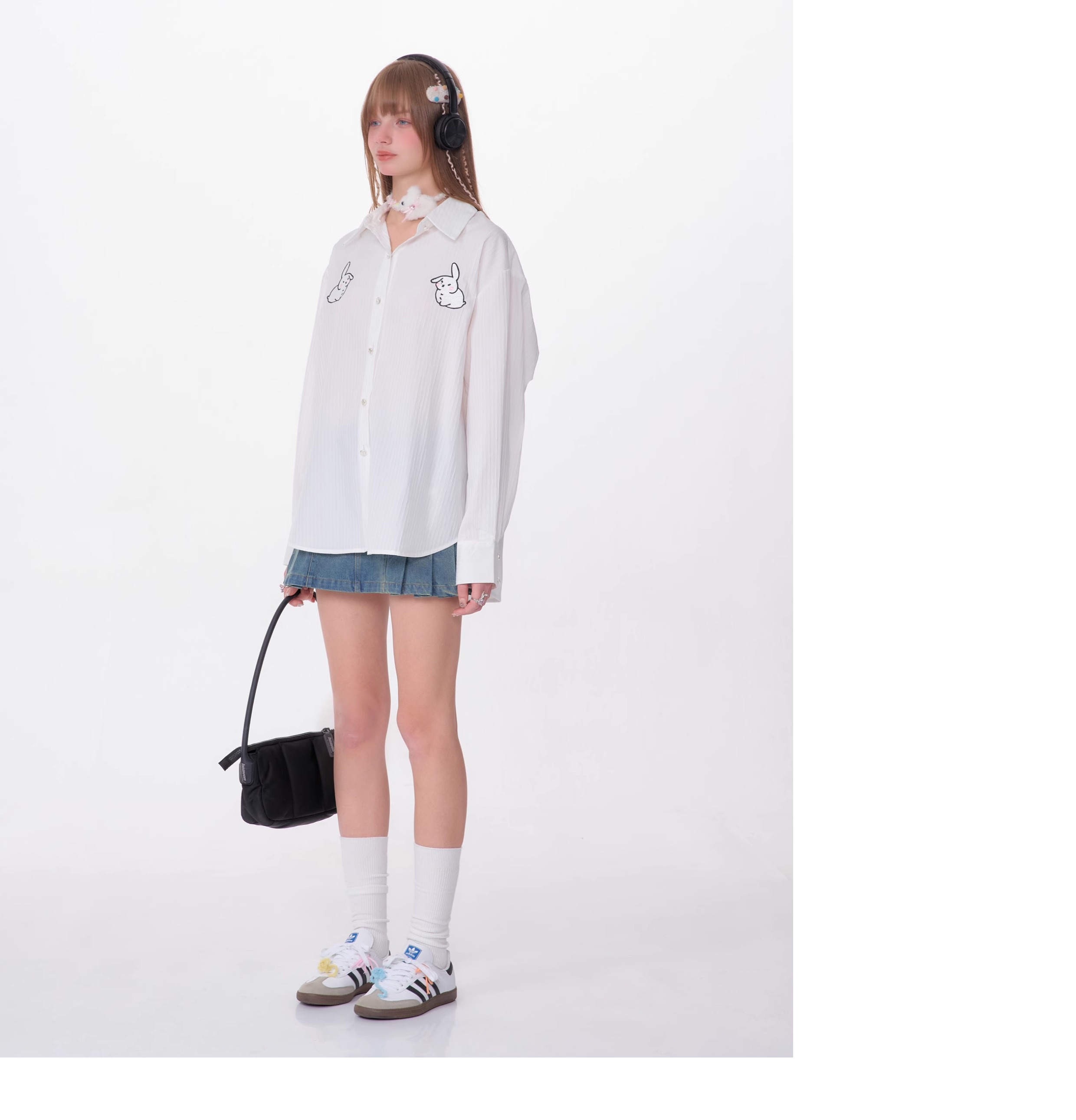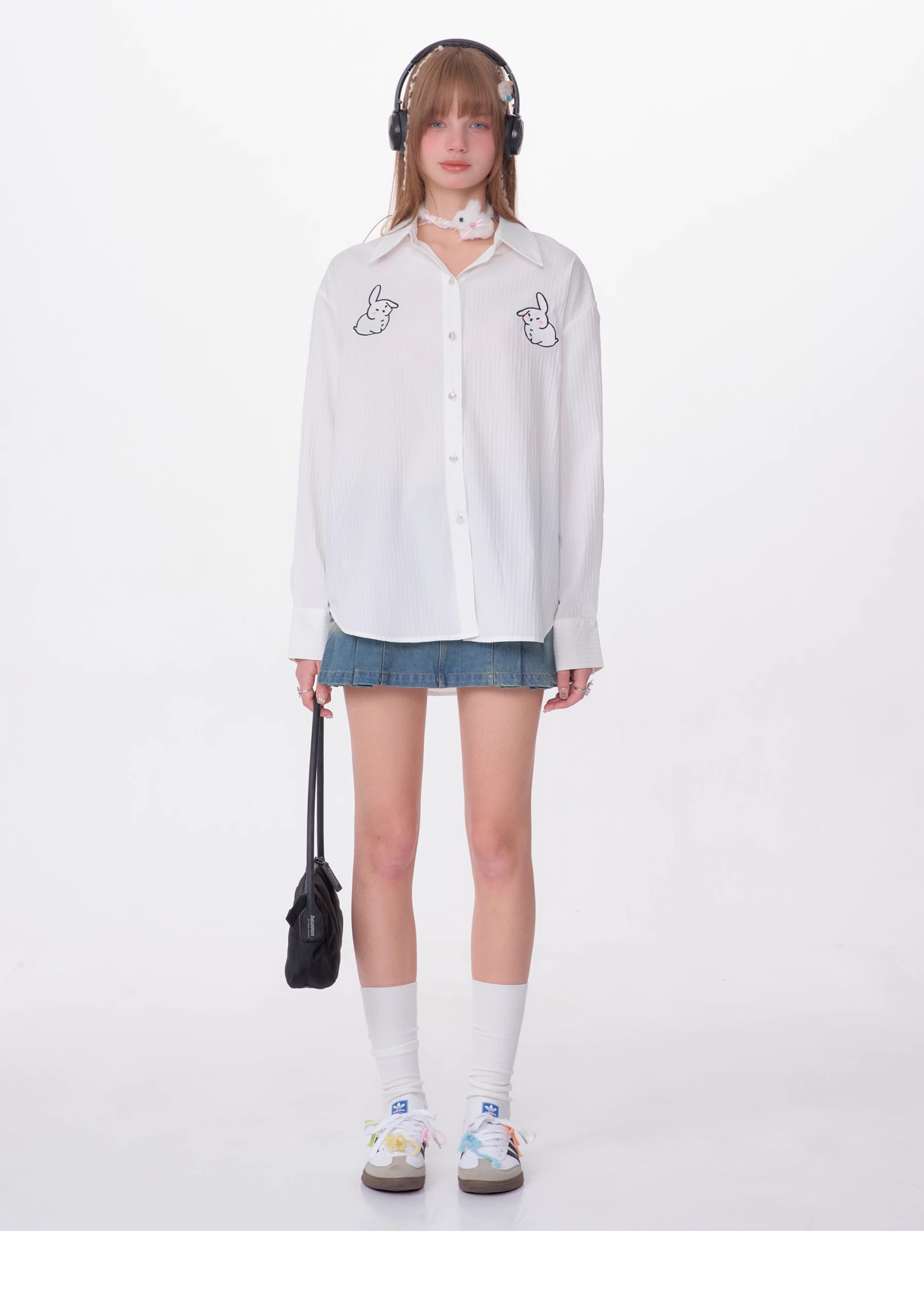 Rabbit Embroidered Loose White Shirt | Medium-Length Retro Design for Spring/Summer