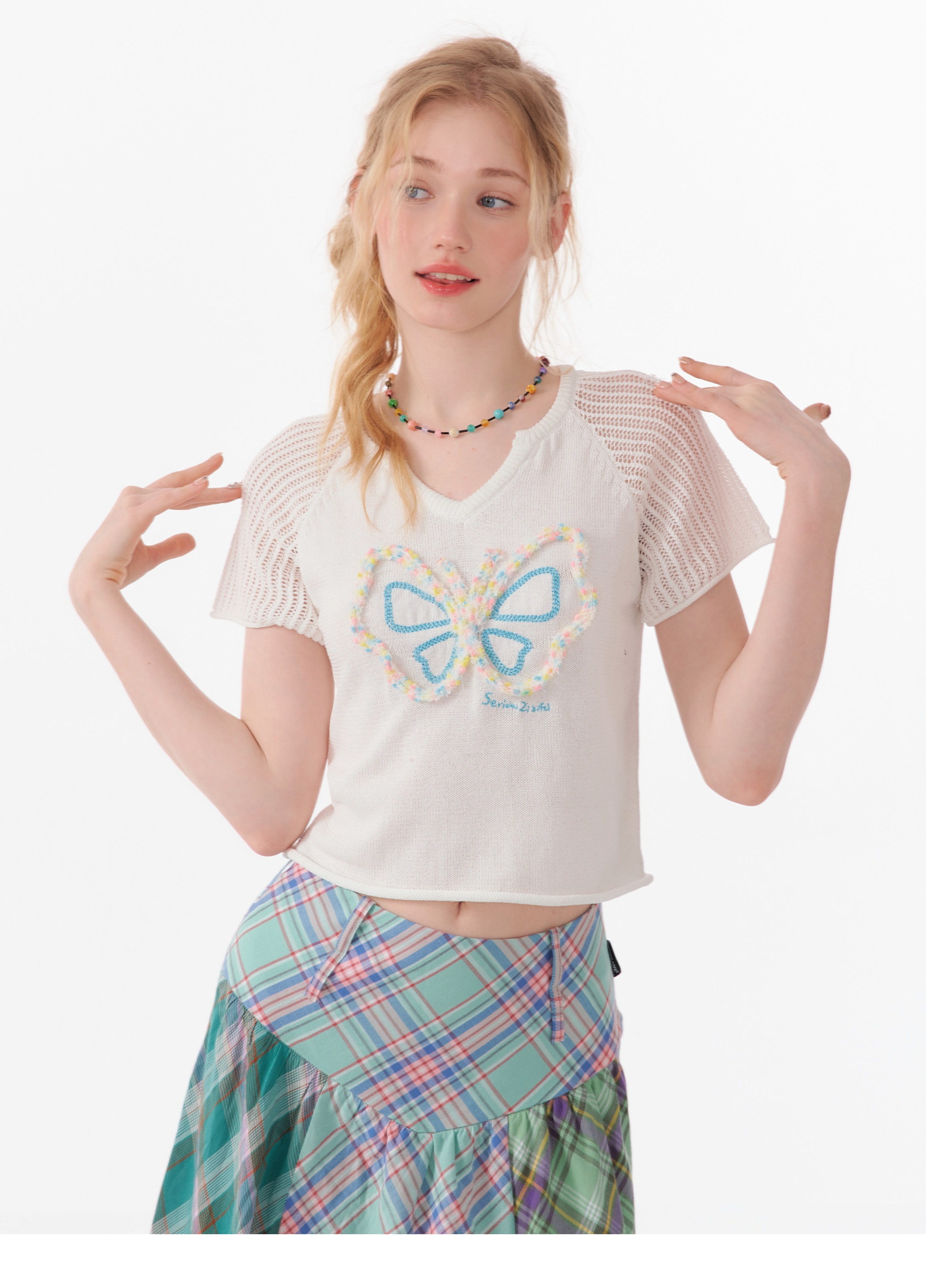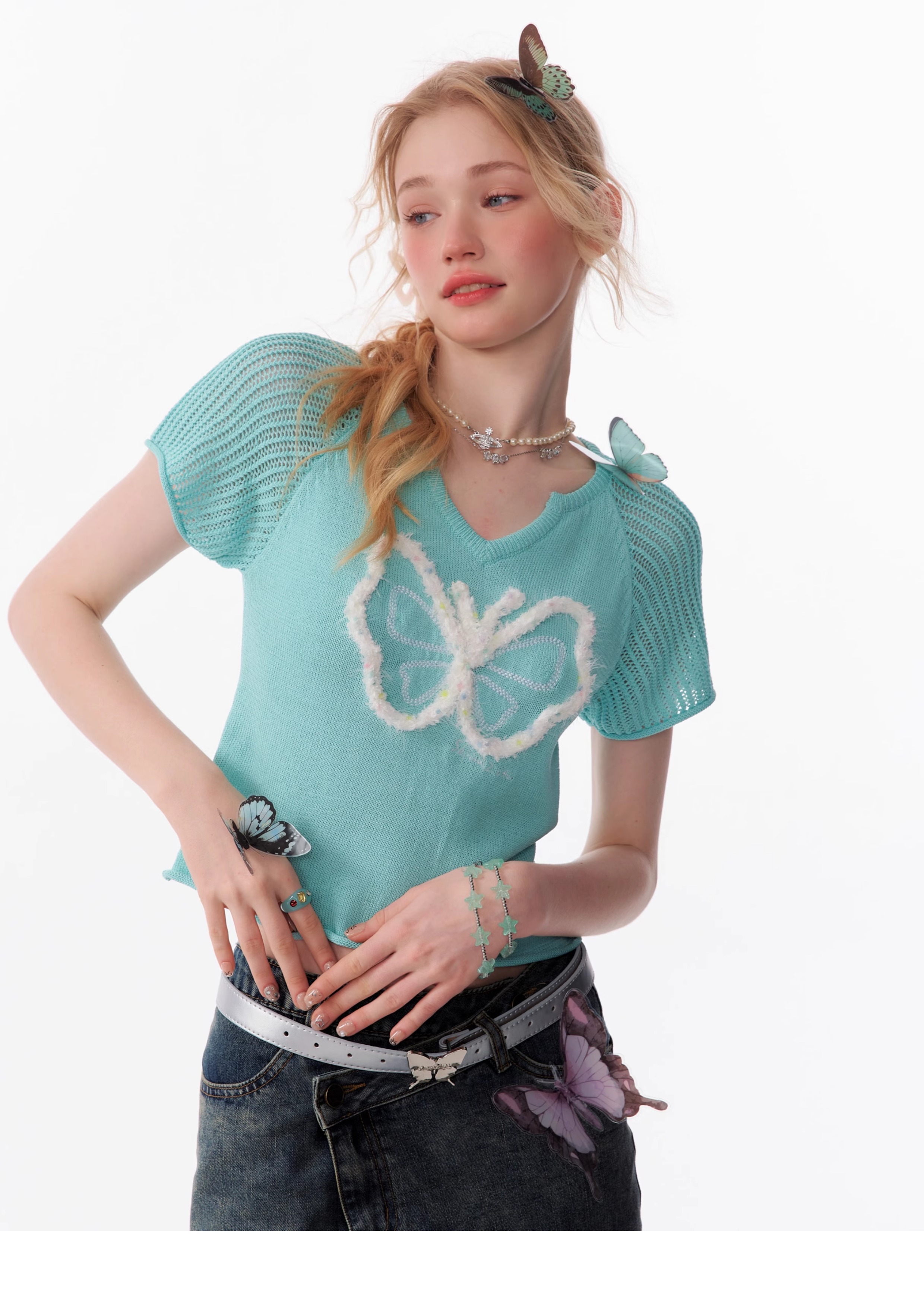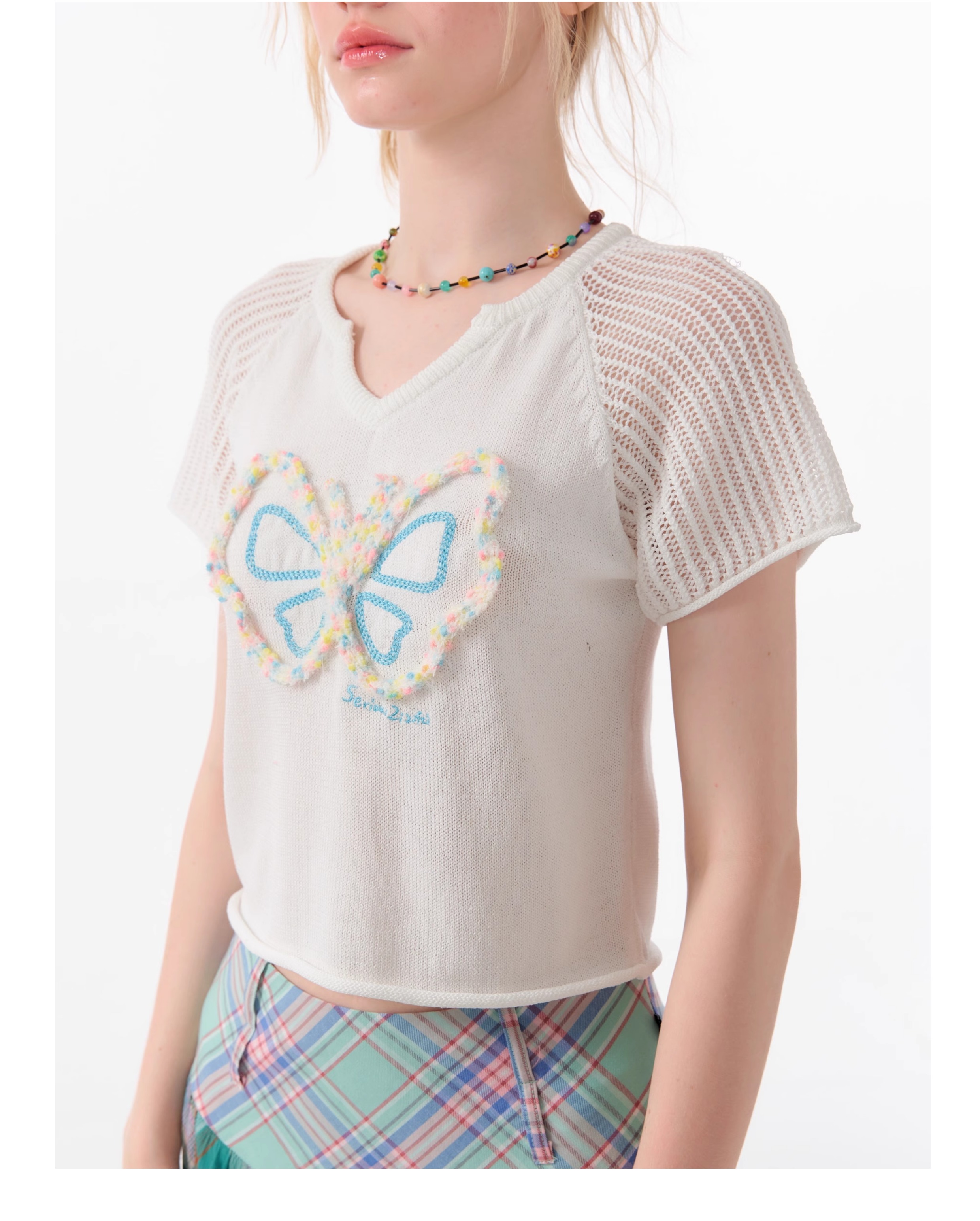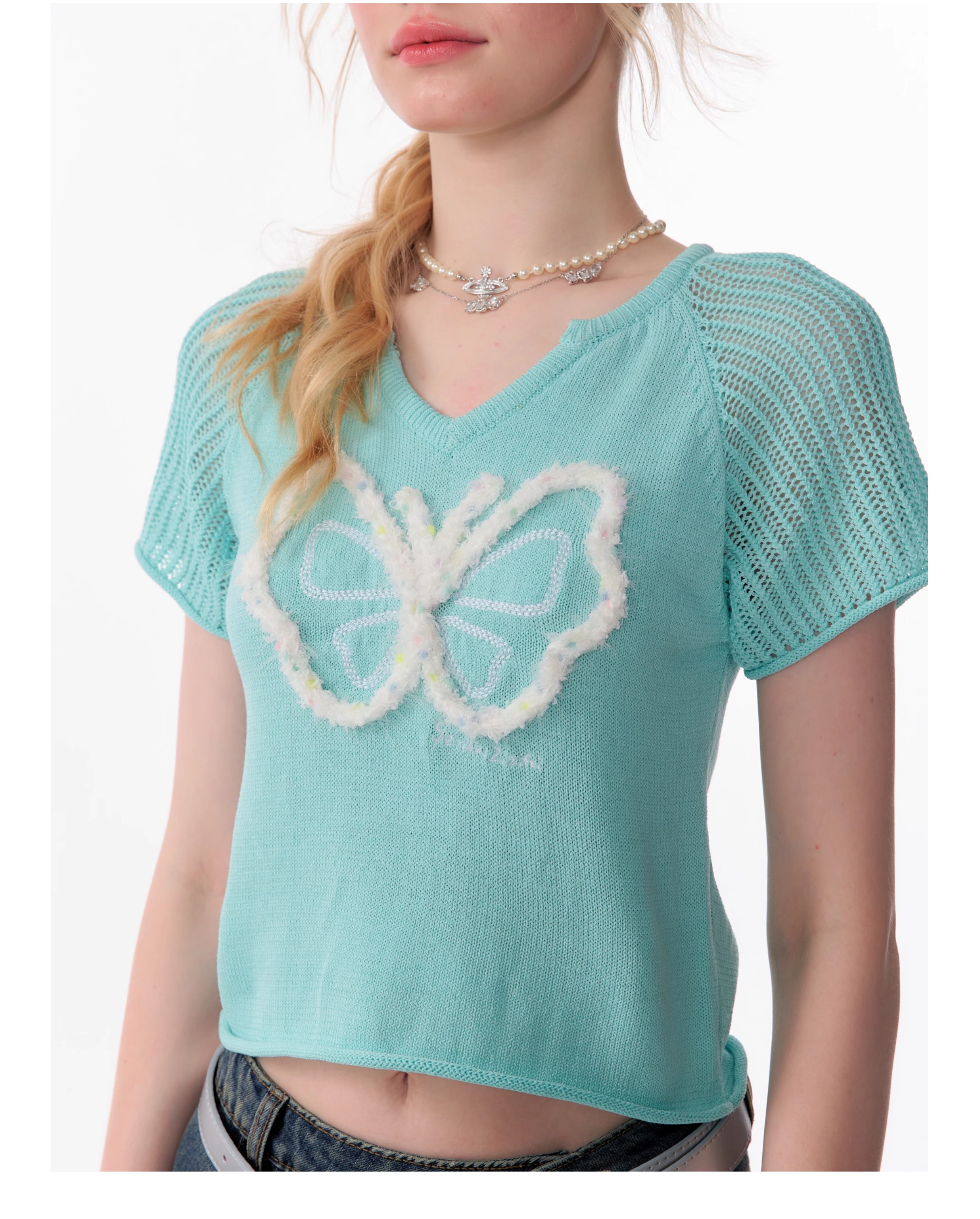 Butterfly V-neck Raglan Sleeve T-shirt | Hollow Knit Retro Design for Summer