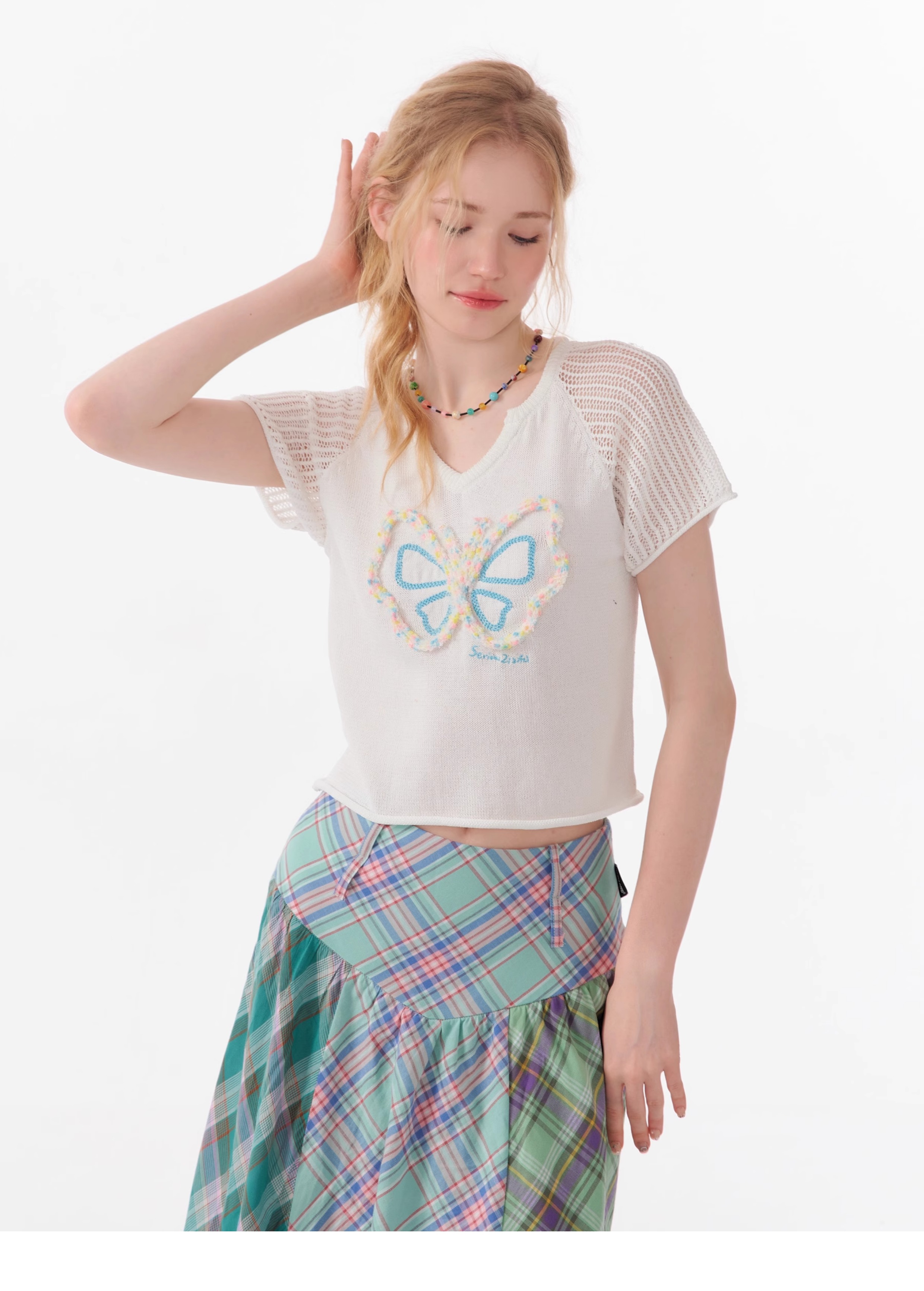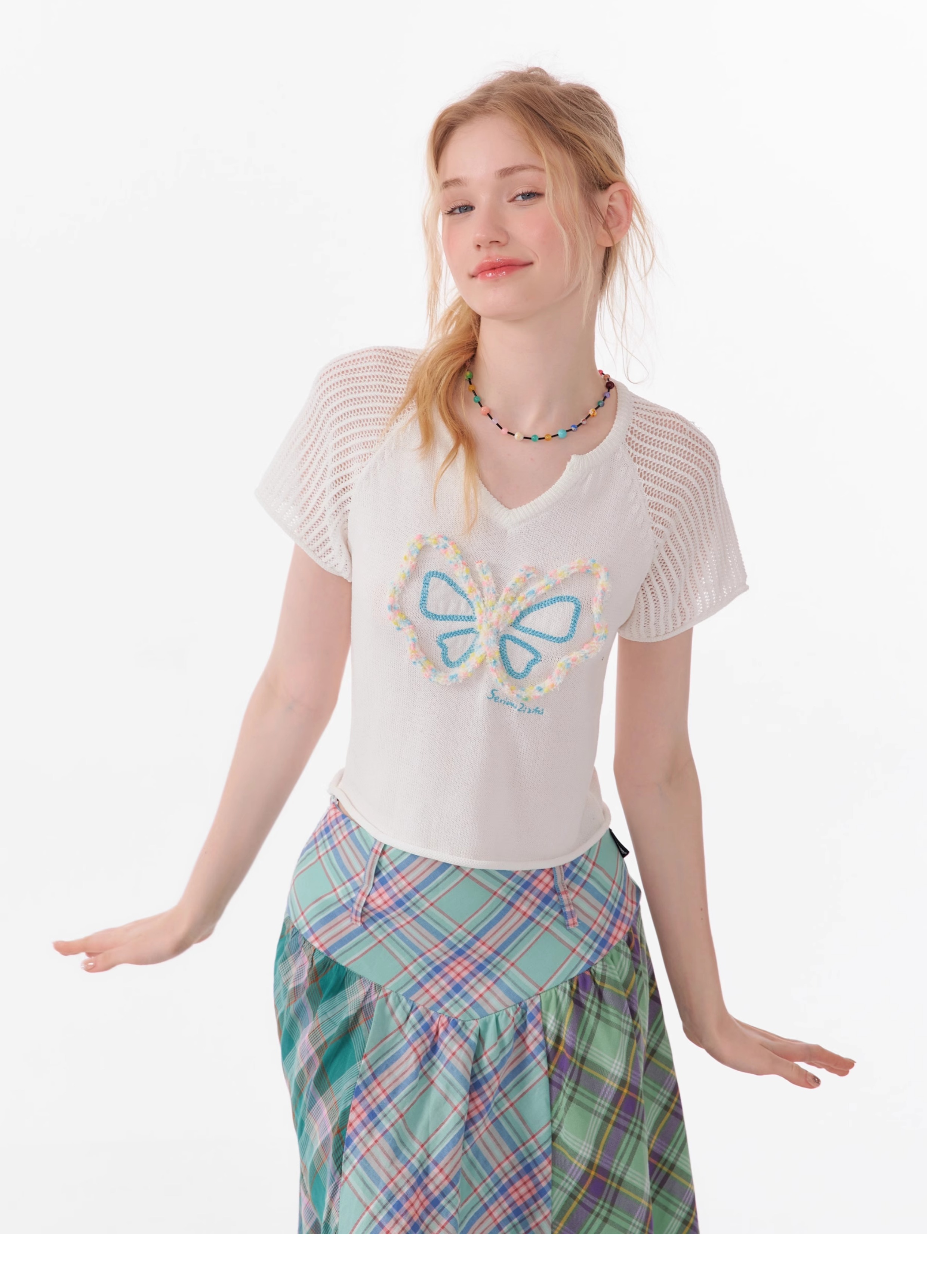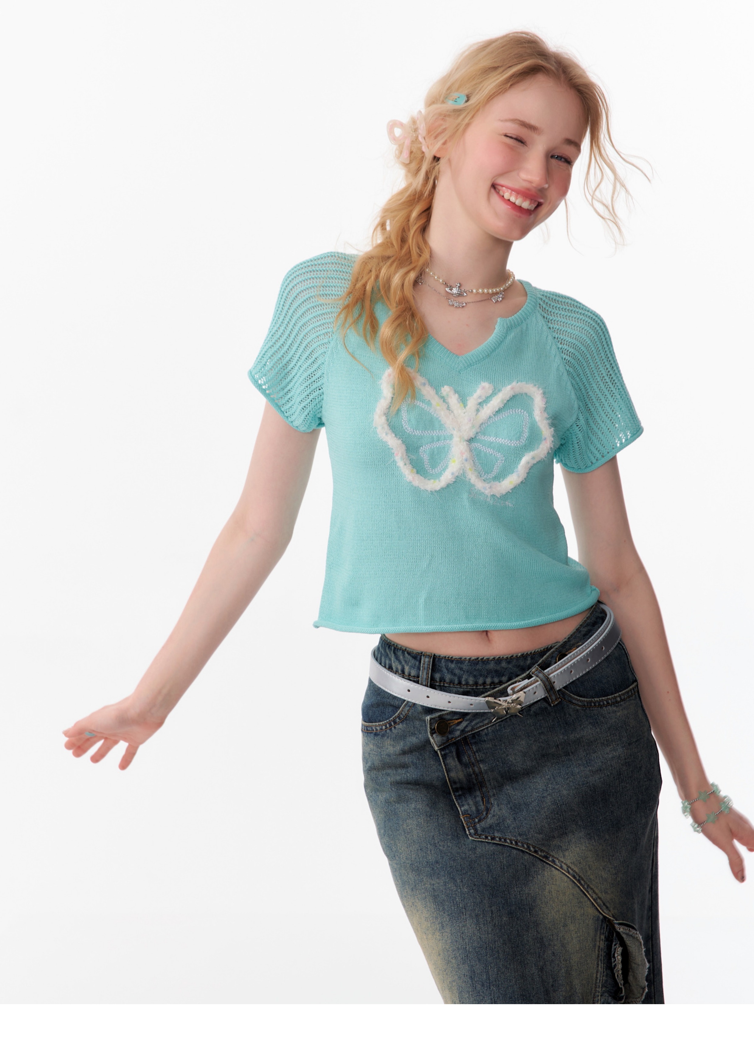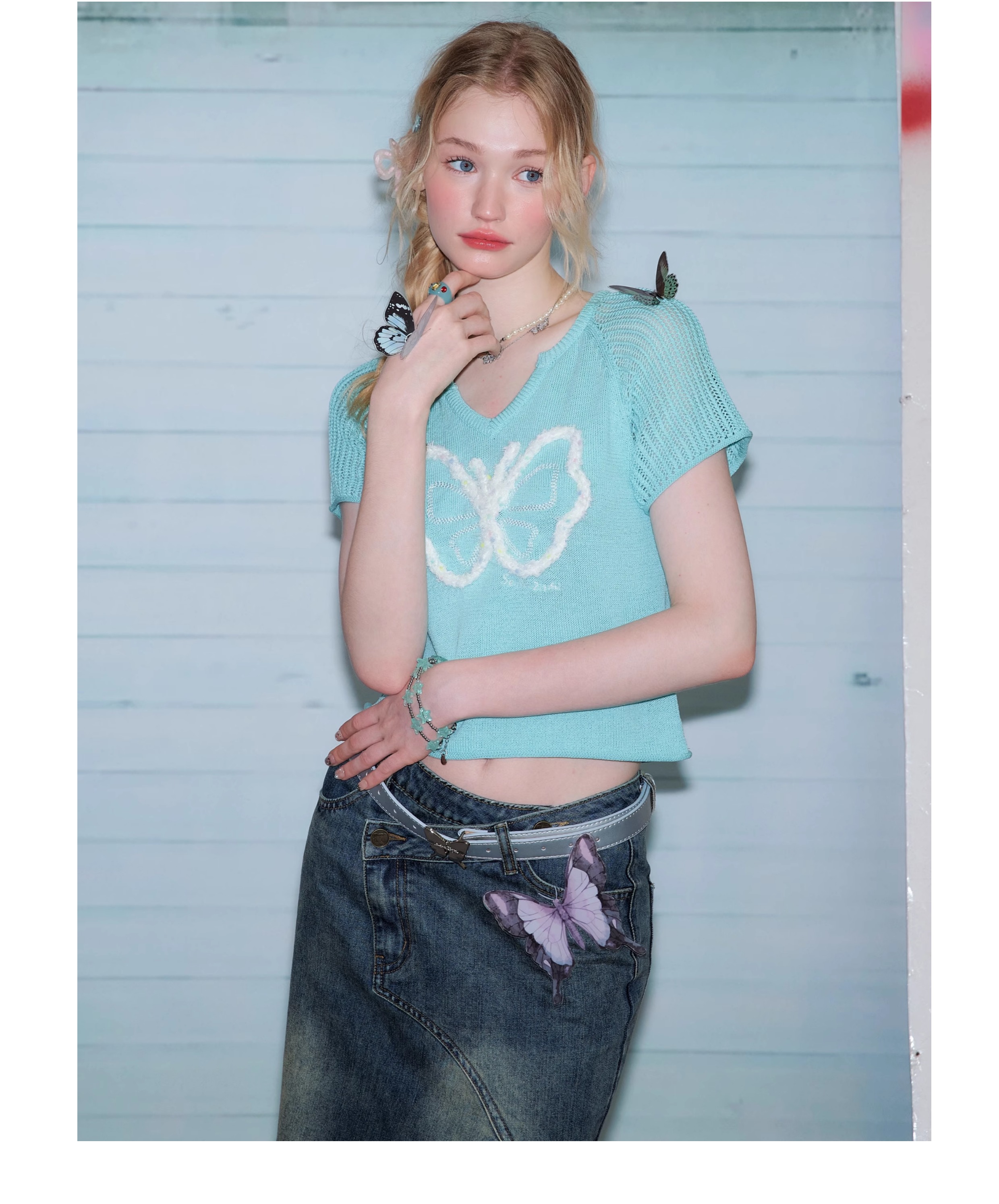 Butterfly V-neck Raglan Sleeve T-shirt | Hollow Knit Retro Design for Summer