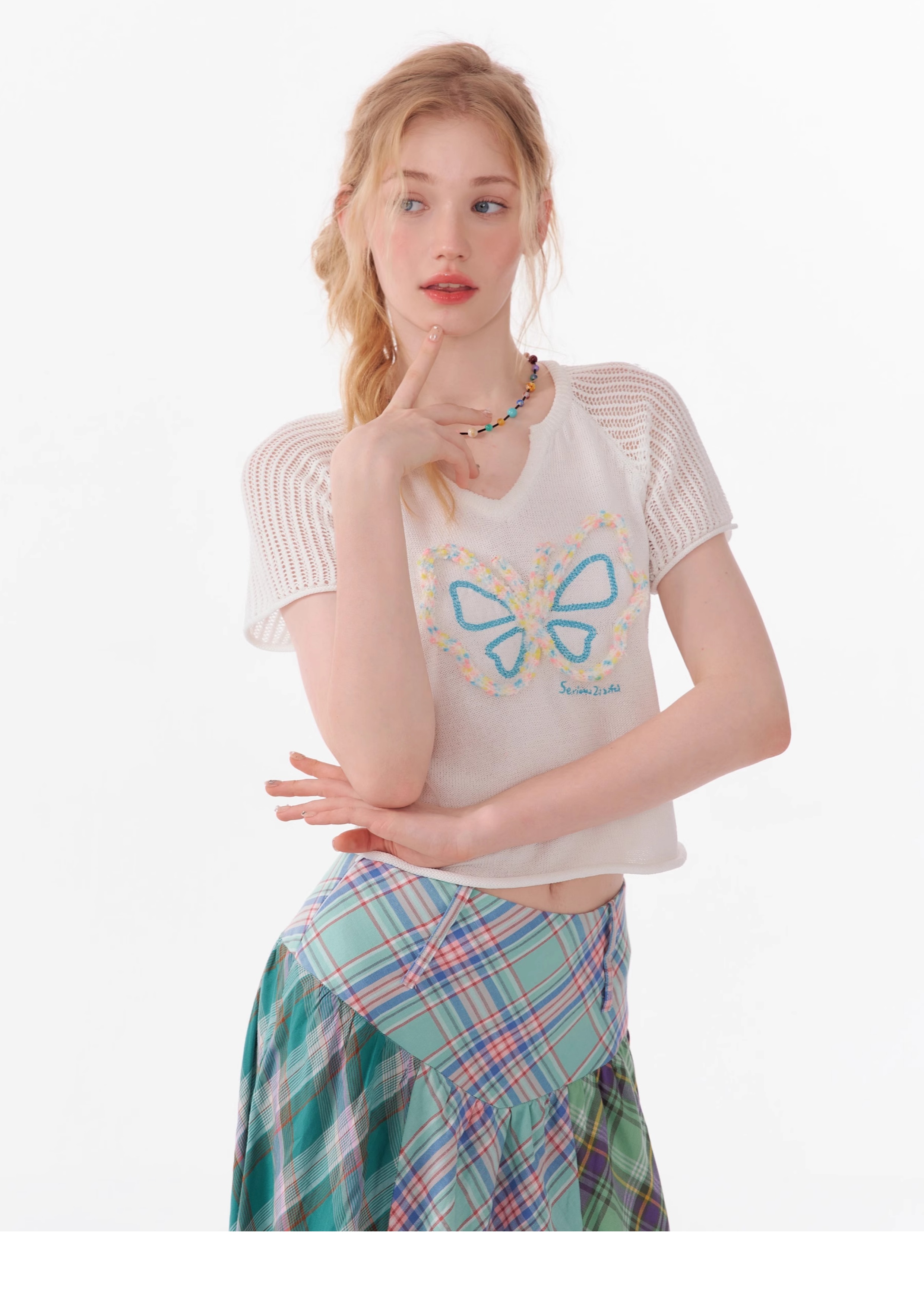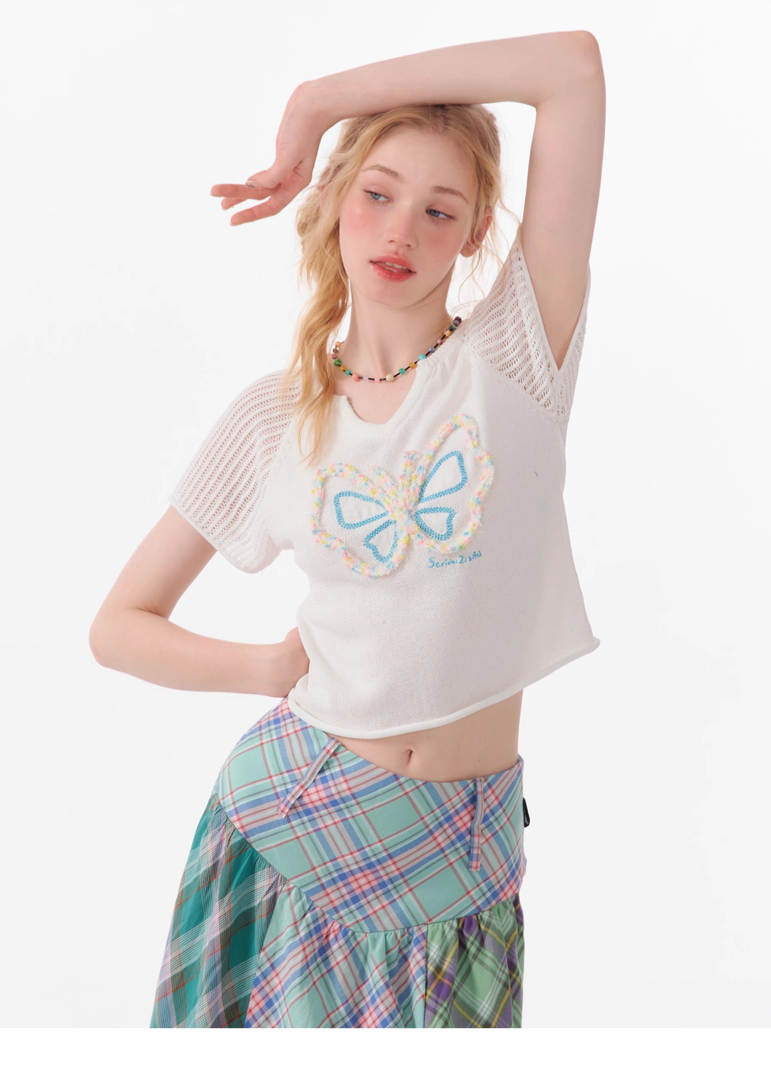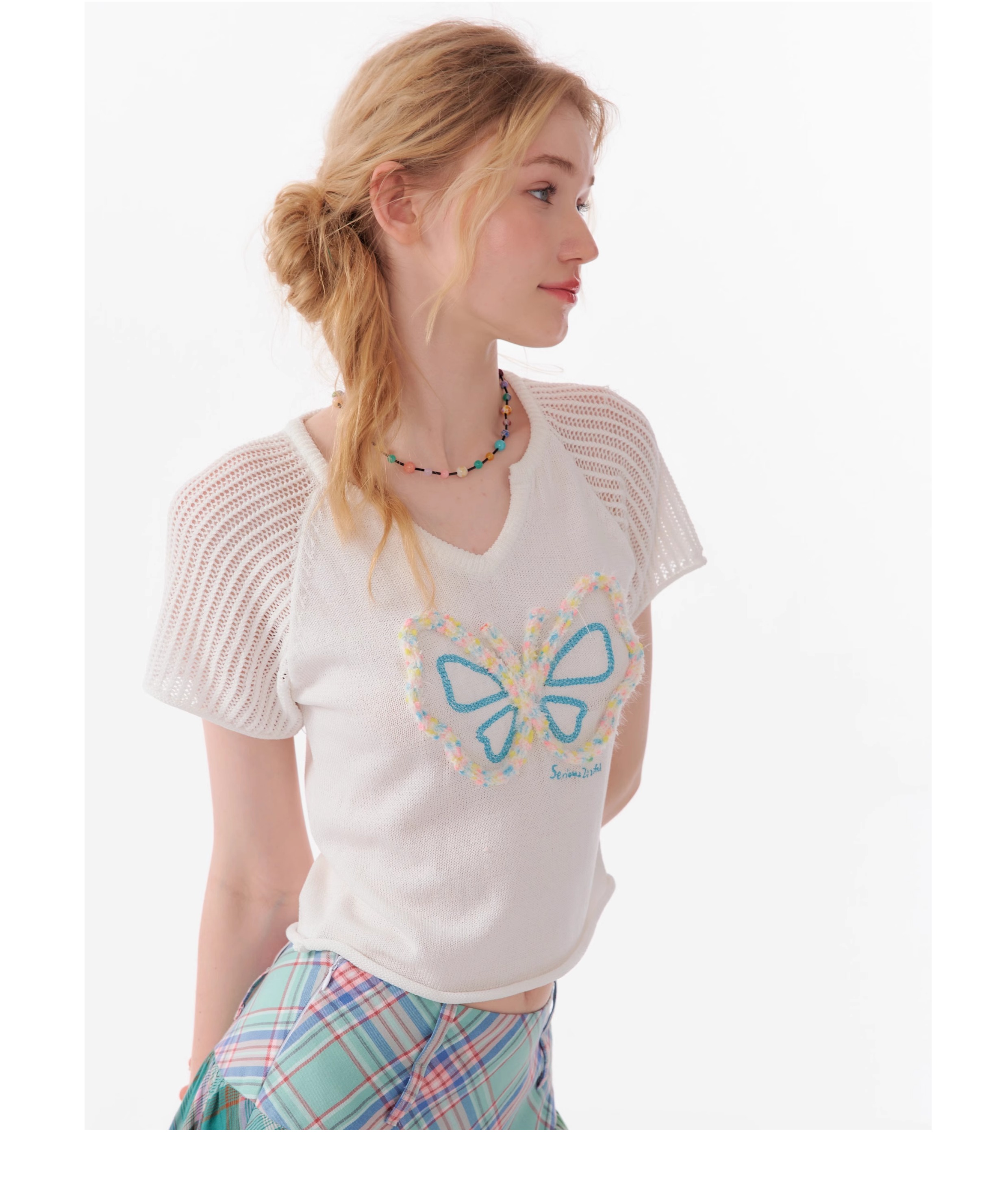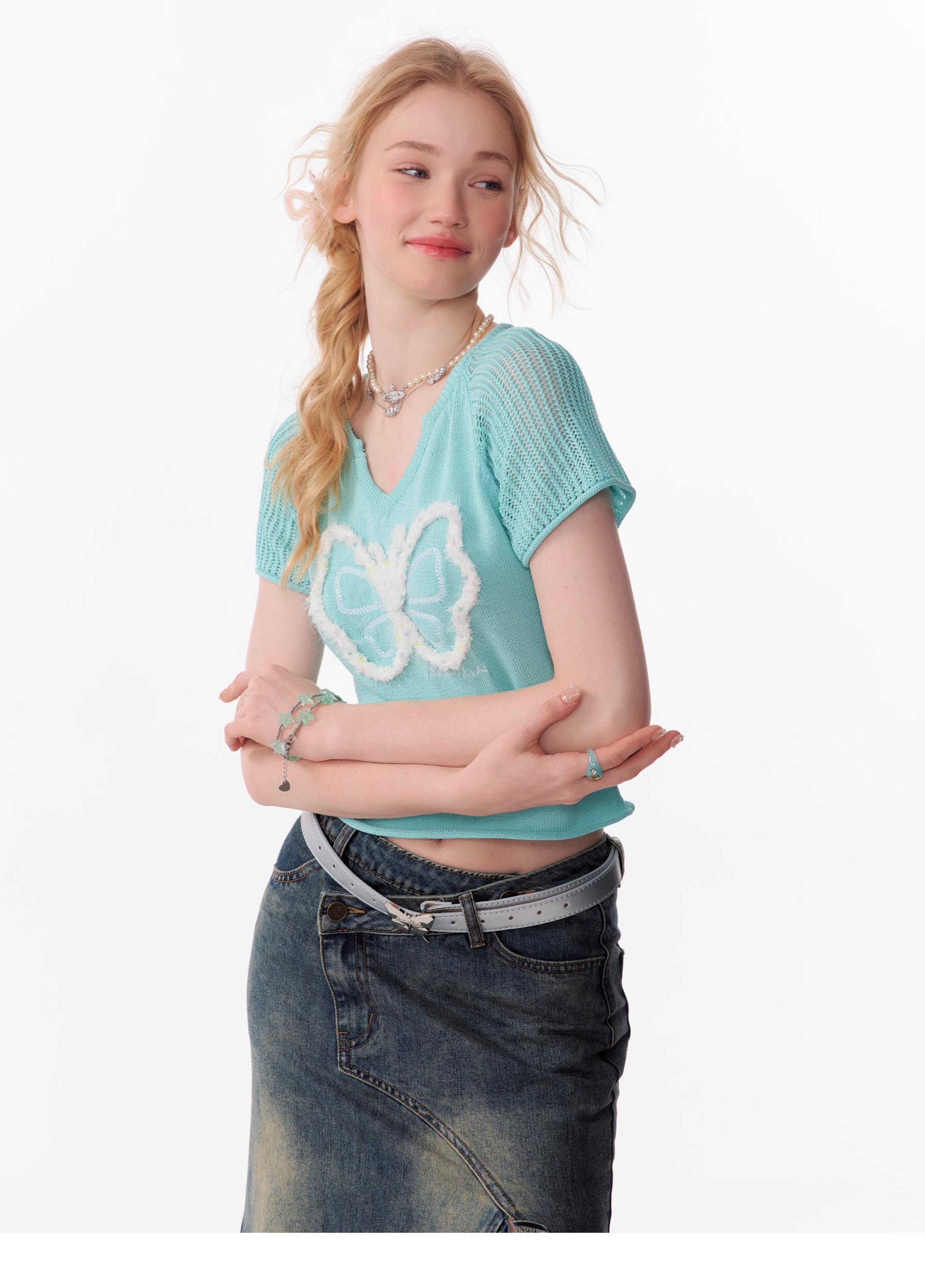 Butterfly V-neck Raglan Sleeve T-shirt | Hollow Knit Retro Design for Summer