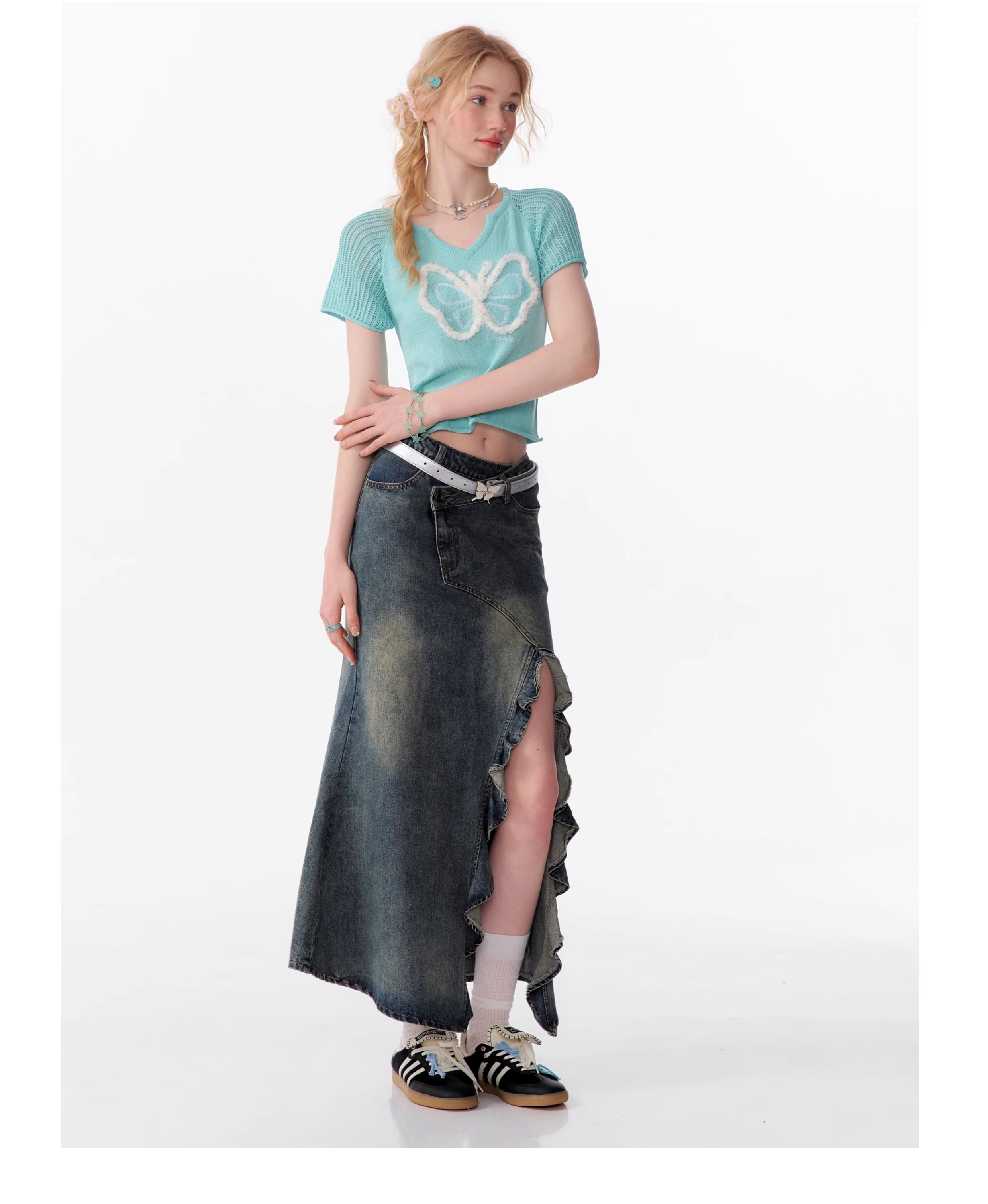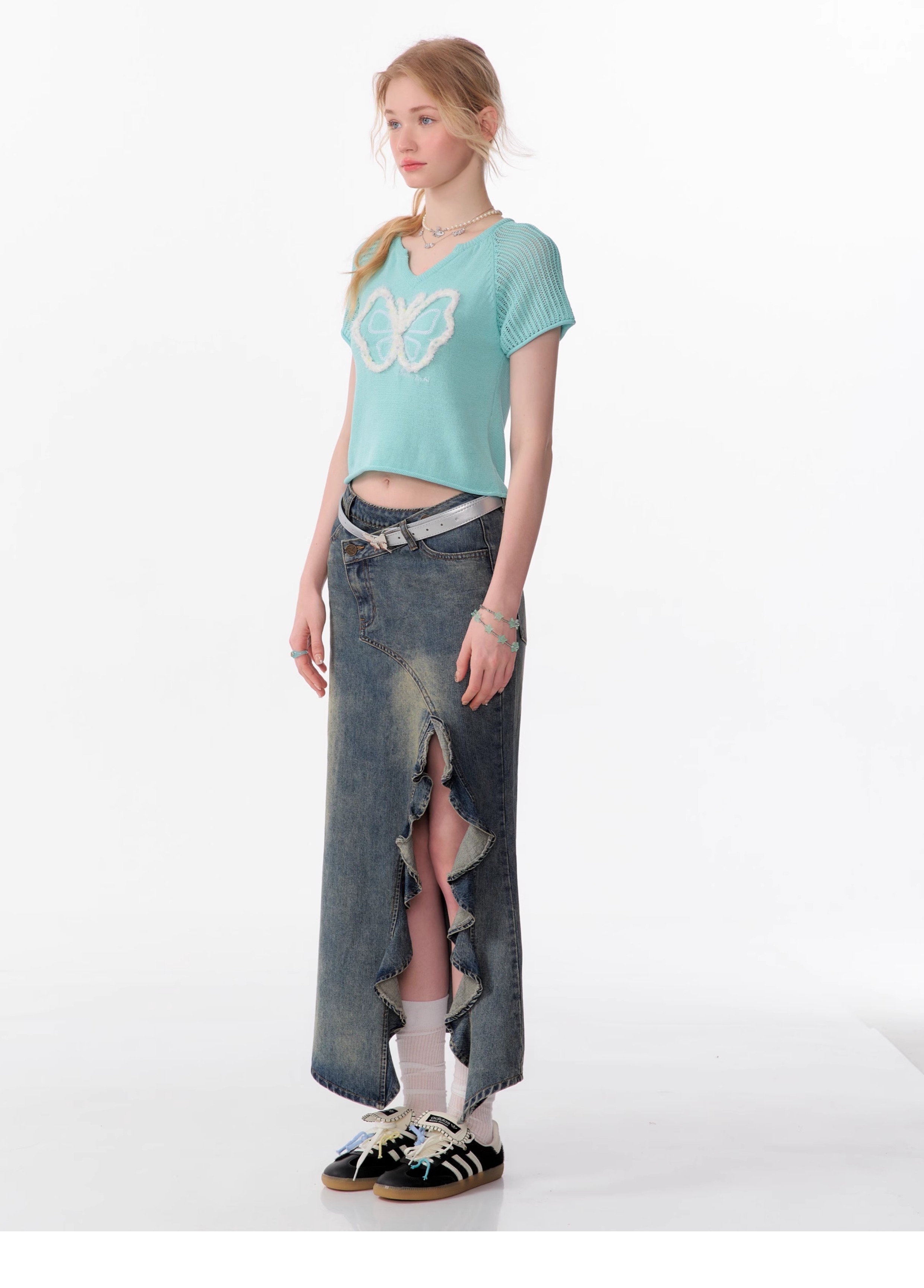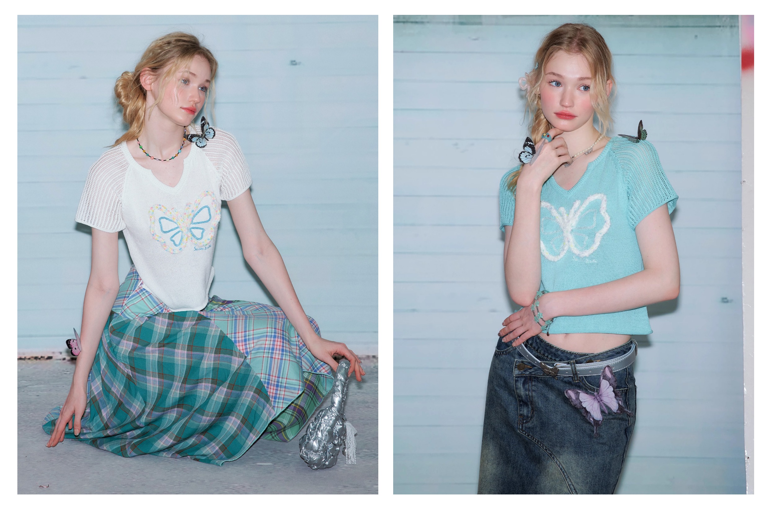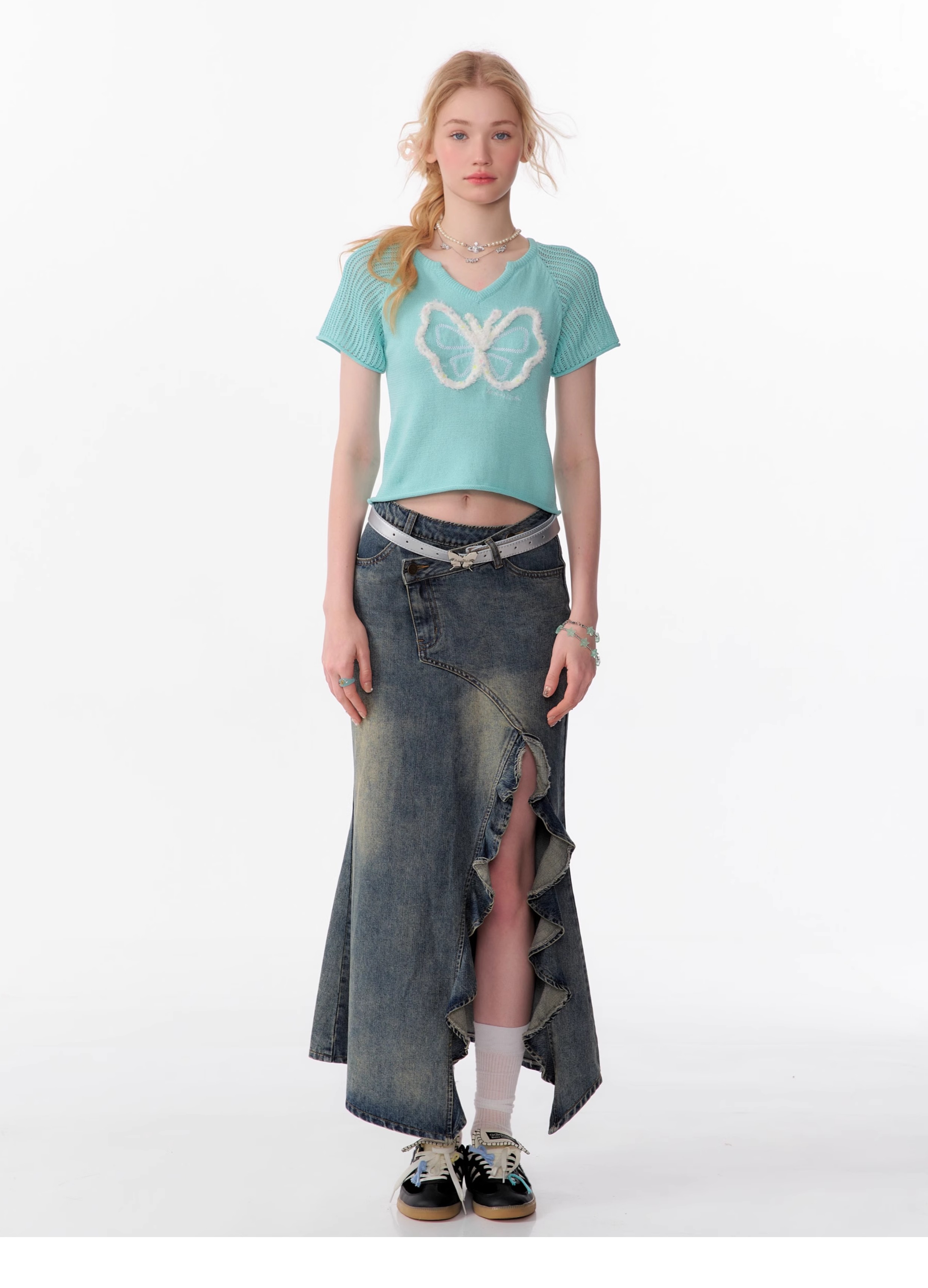 Butterfly V-neck Raglan Sleeve T-shirt | Hollow Knit Retro Design for Summer