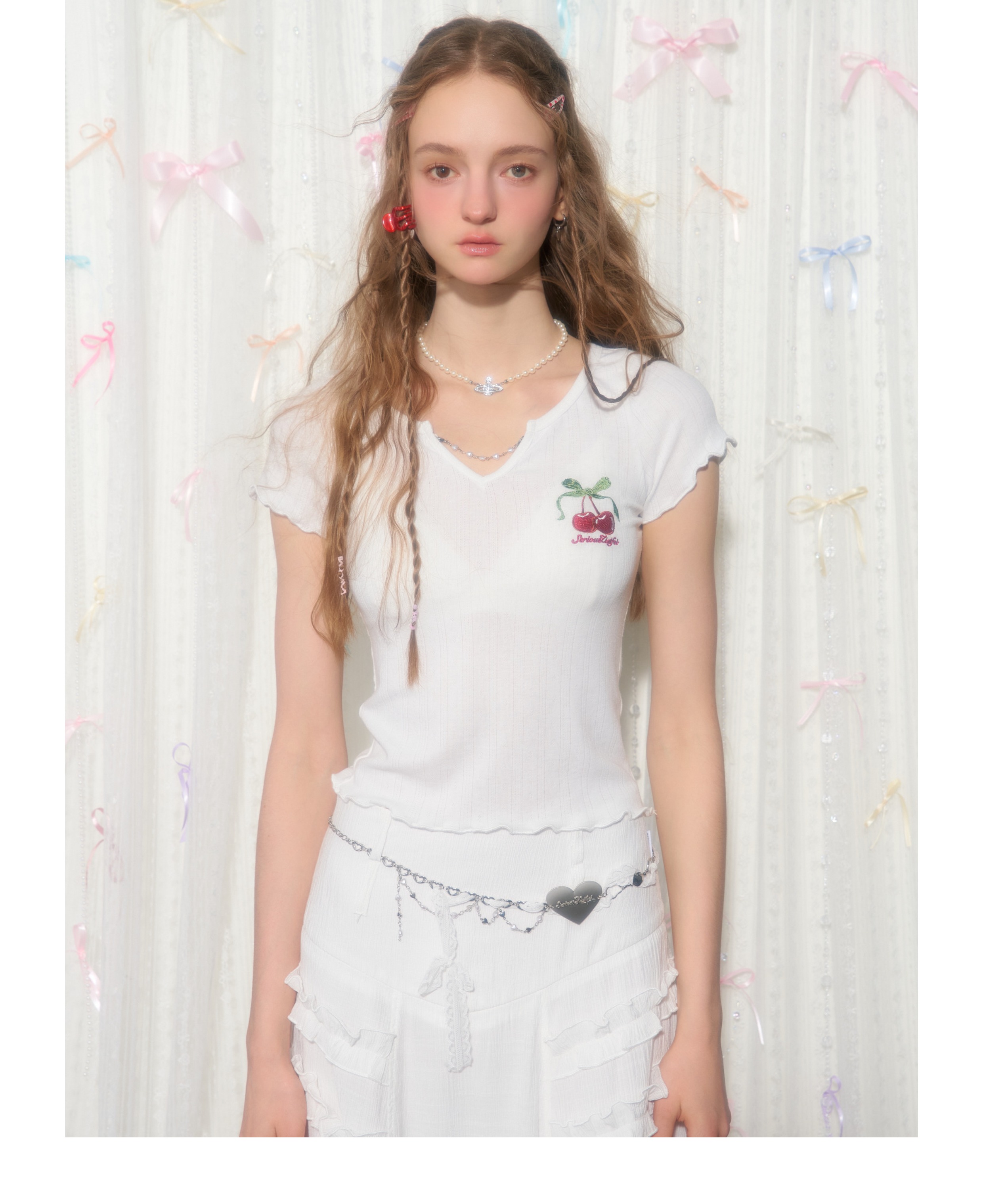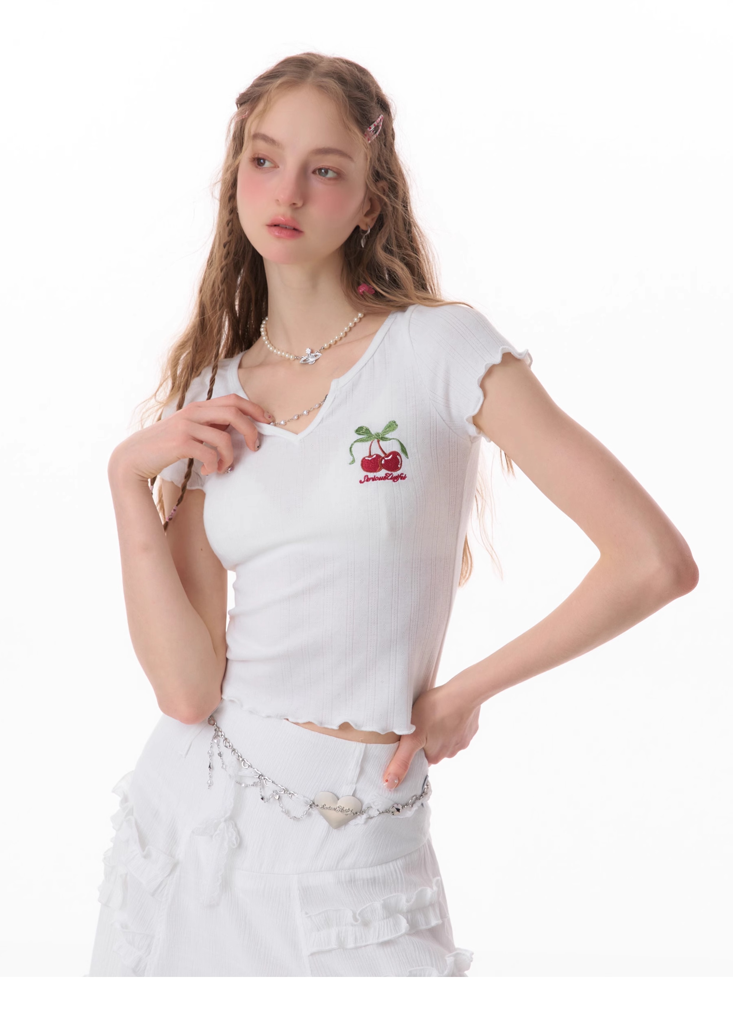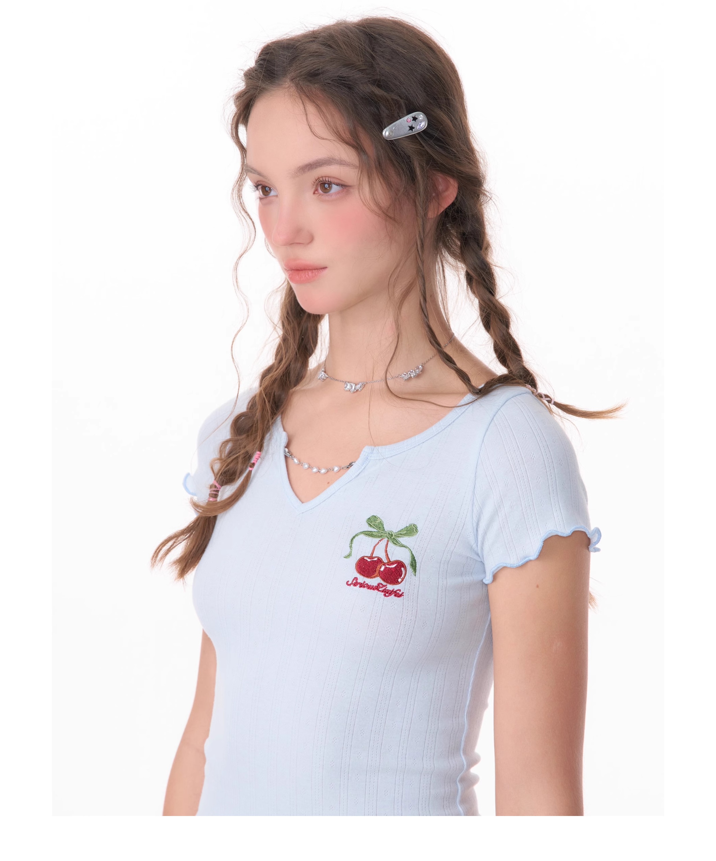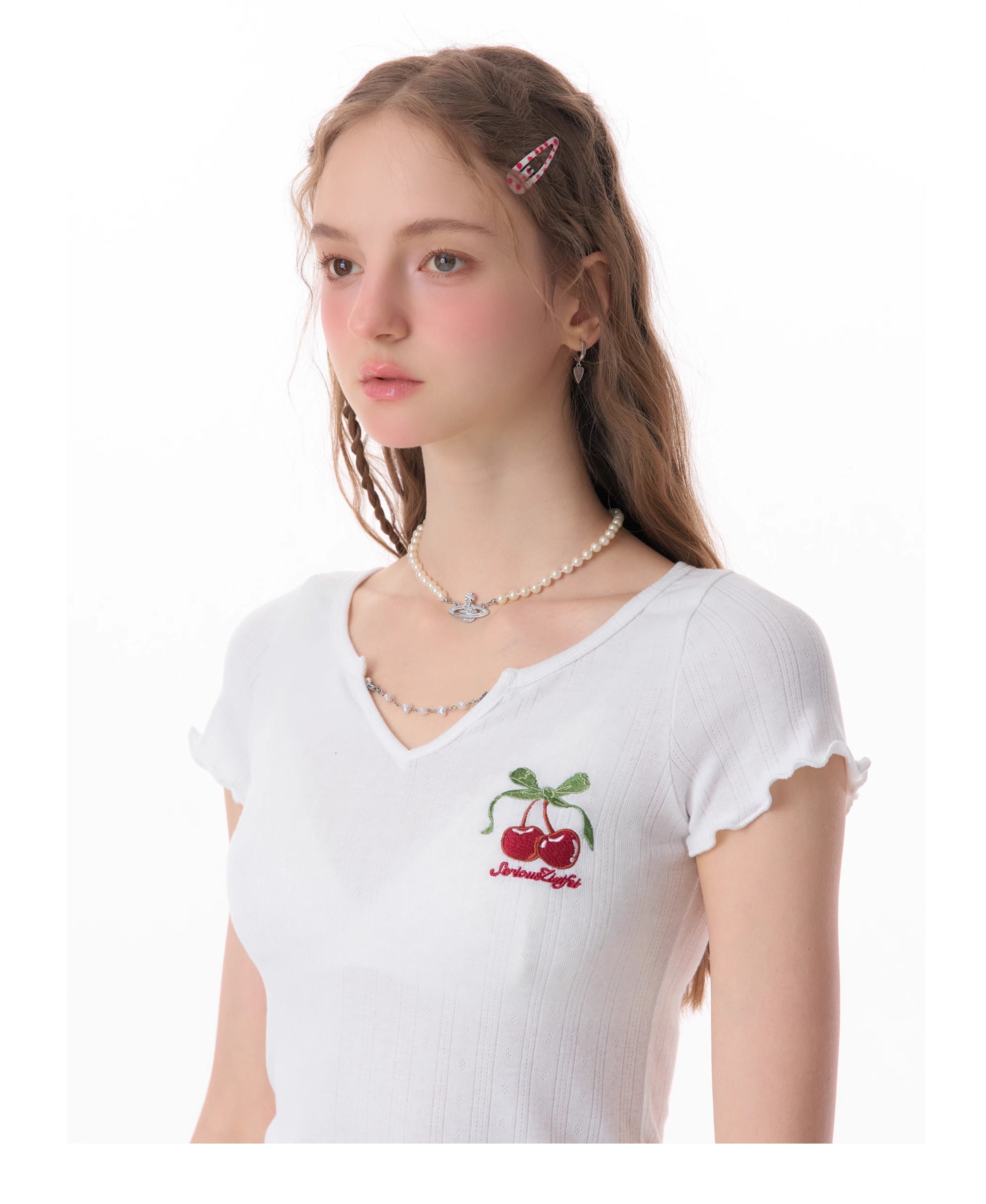 Cherry Embroidered Chain T-shirt | Mushroom Puff Sleeve V-neck Design for Summer