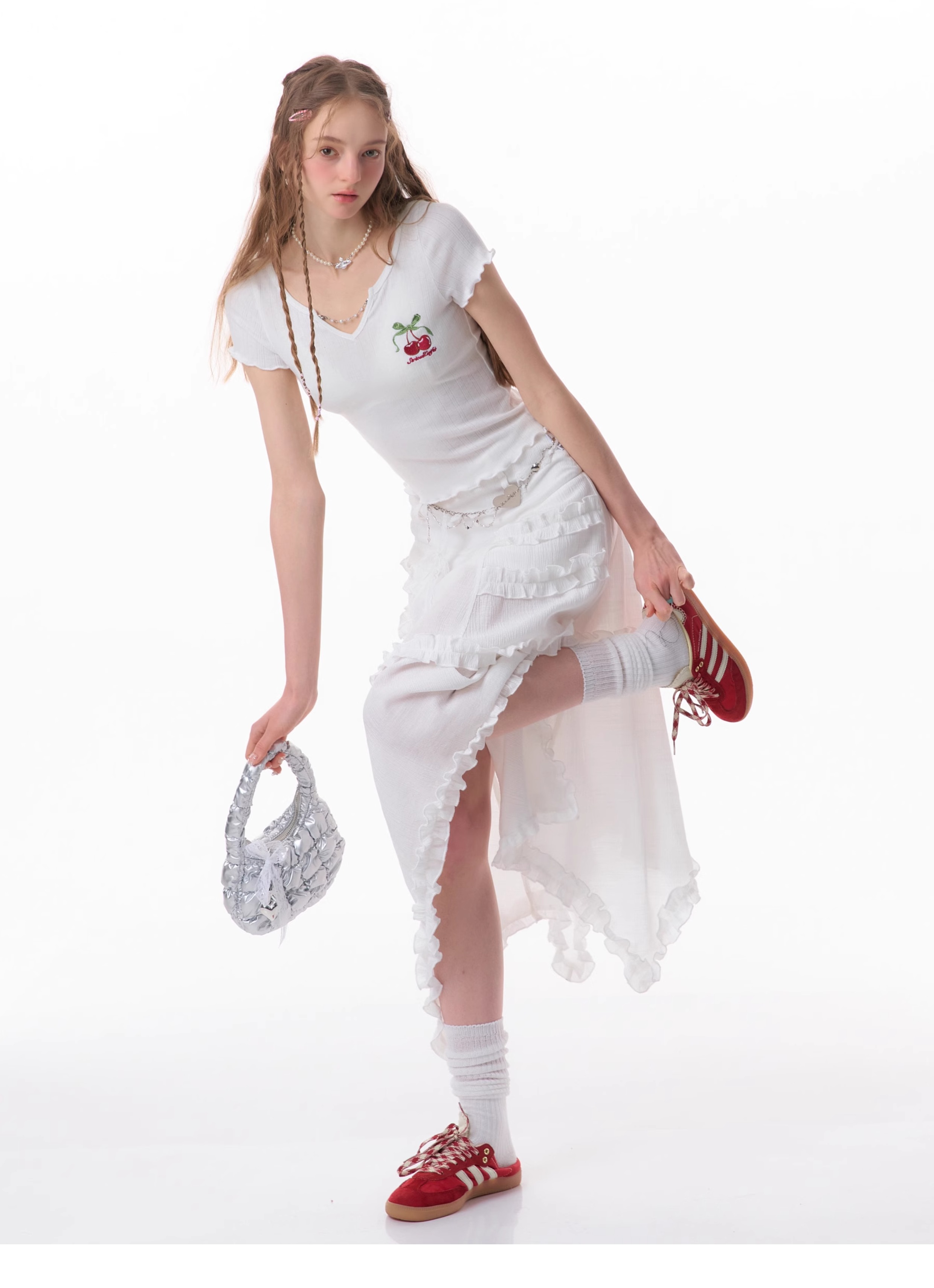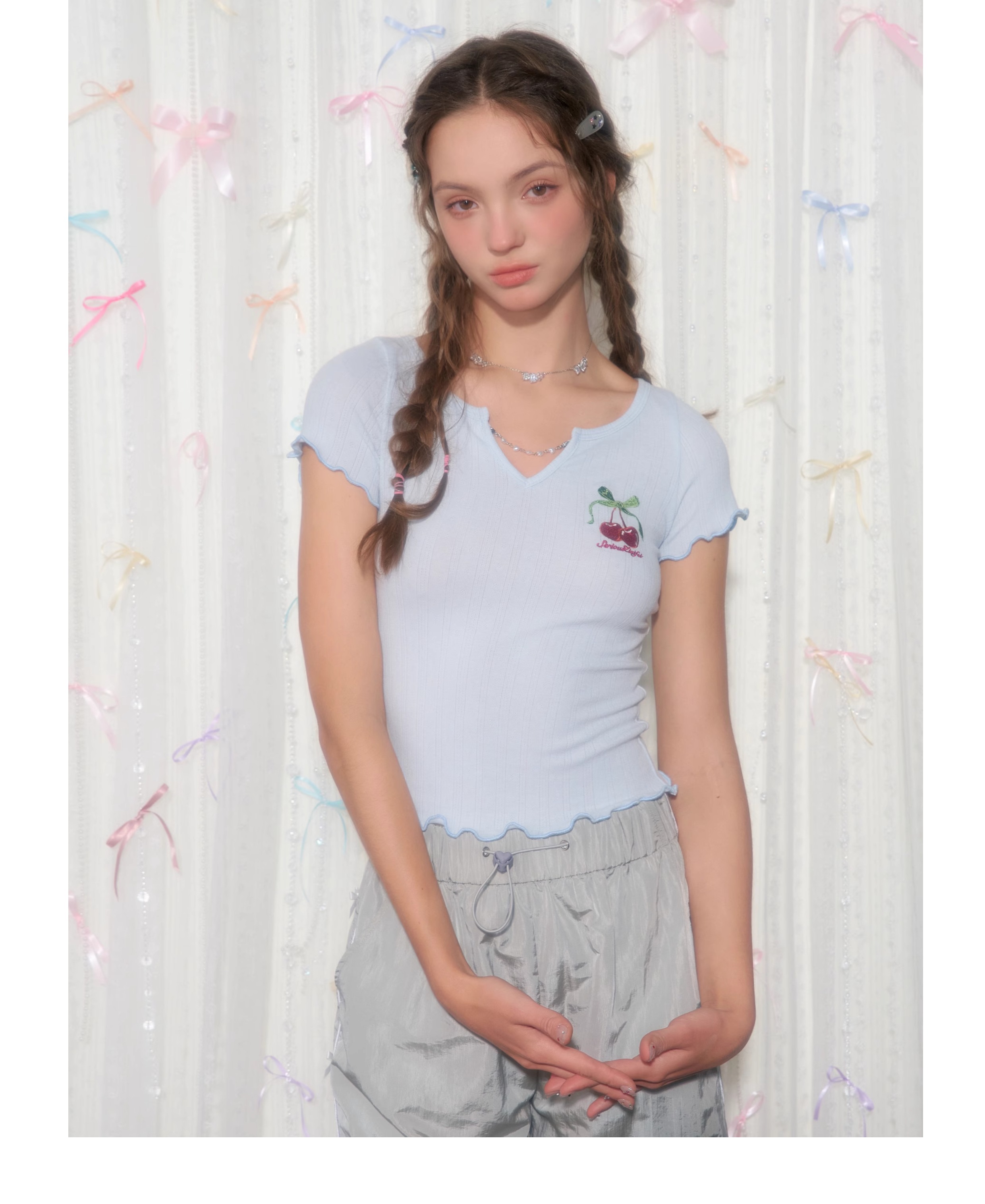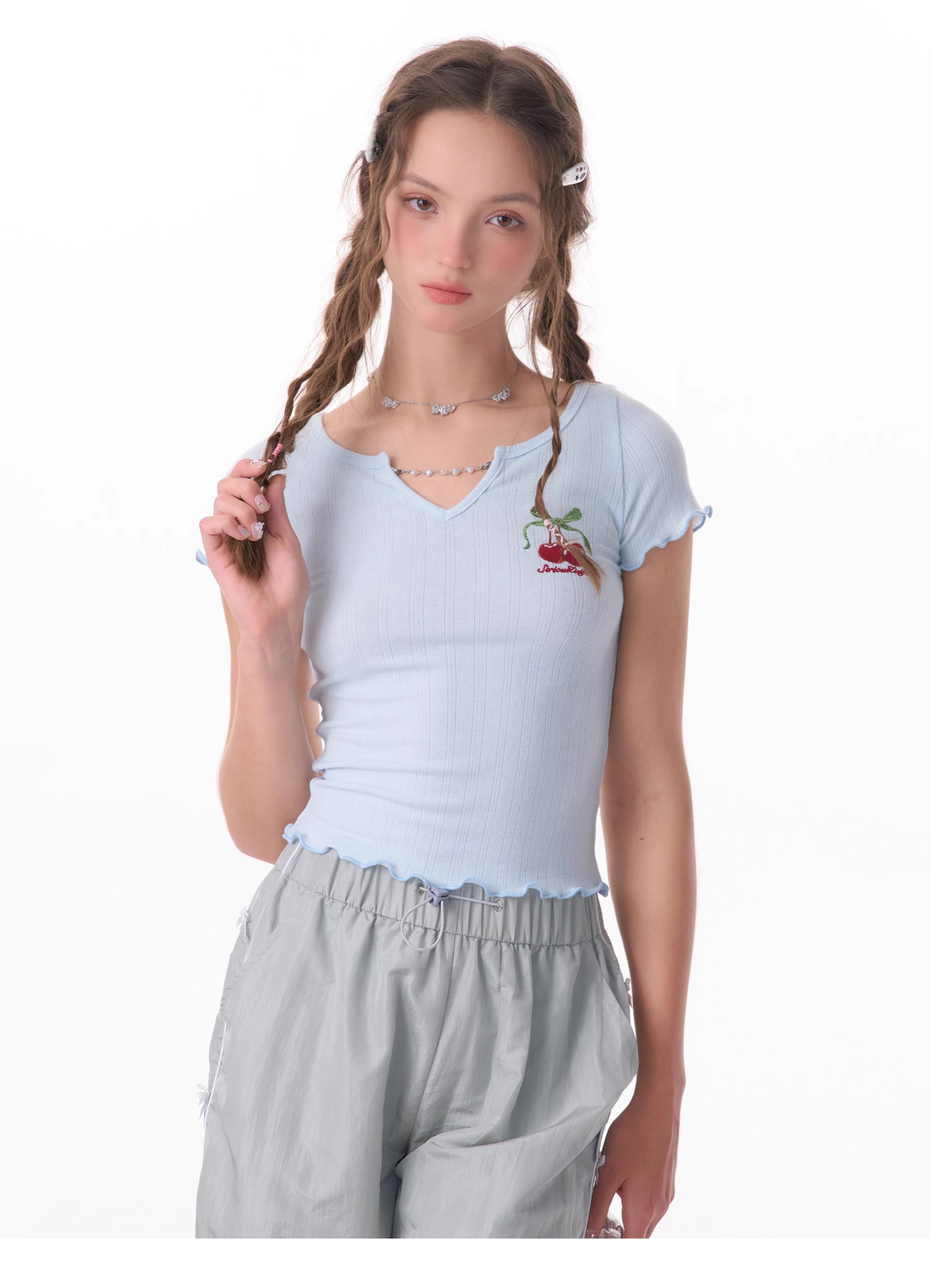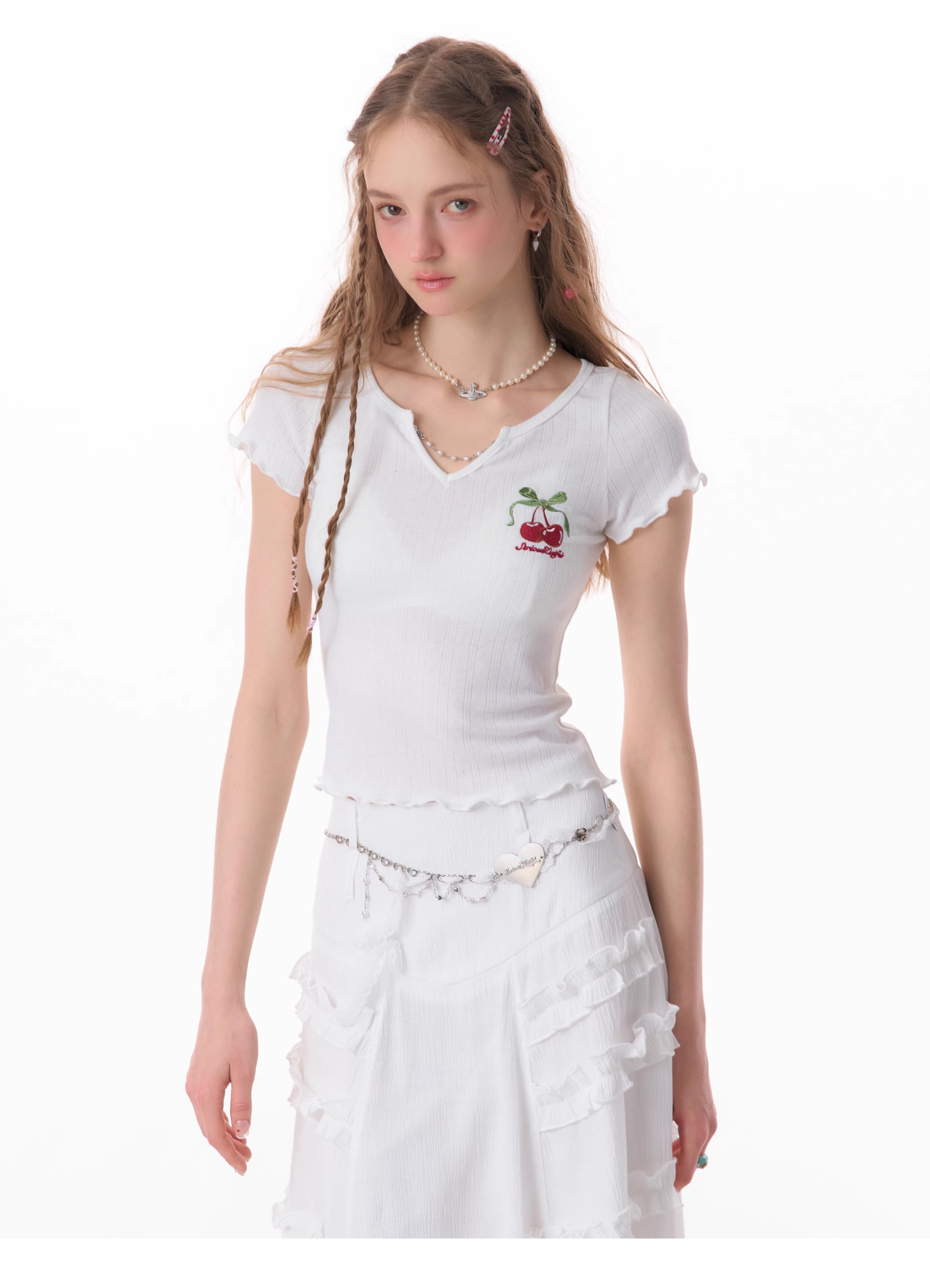 Cherry Embroidered Chain T-shirt | Mushroom Puff Sleeve V-neck Design for Summer