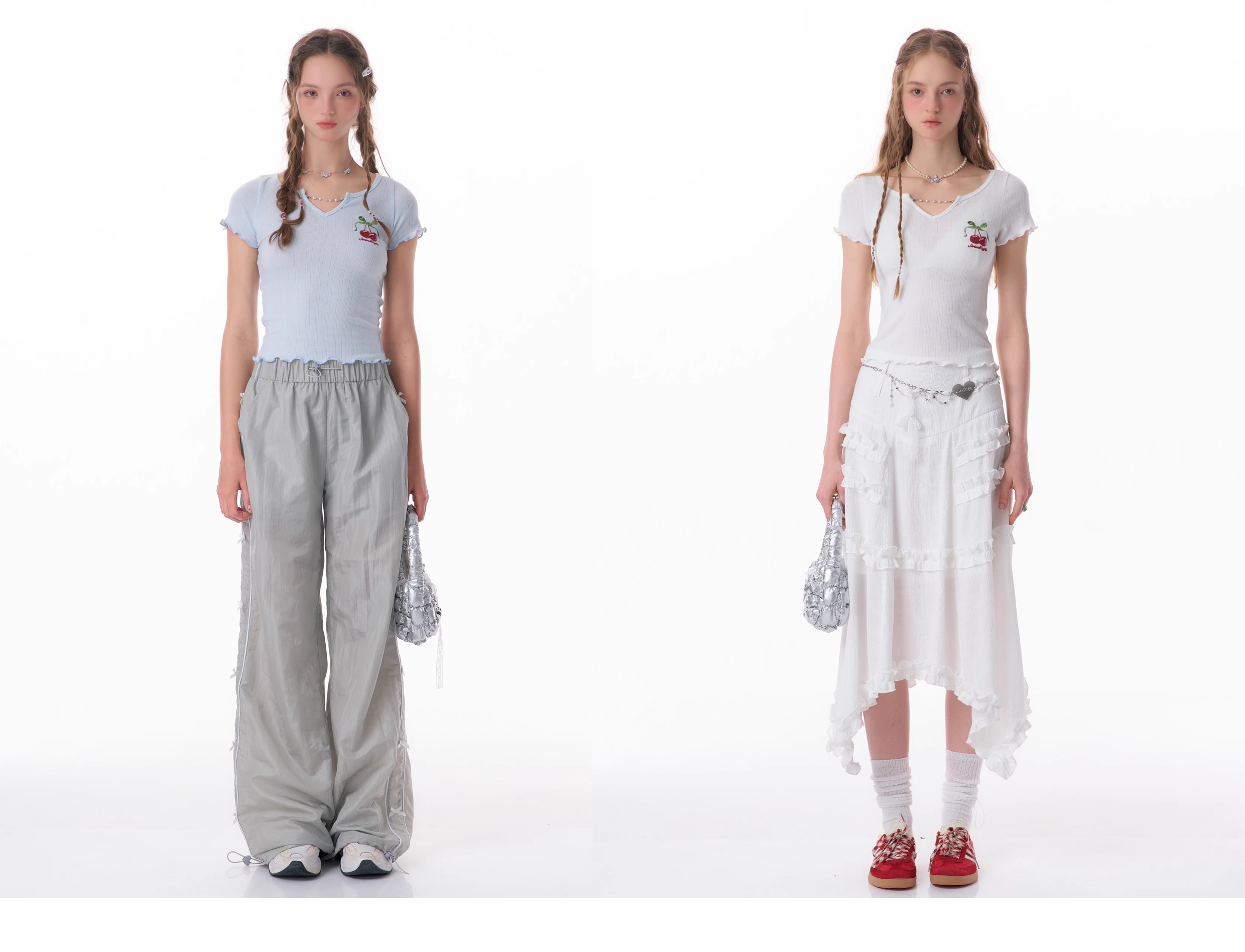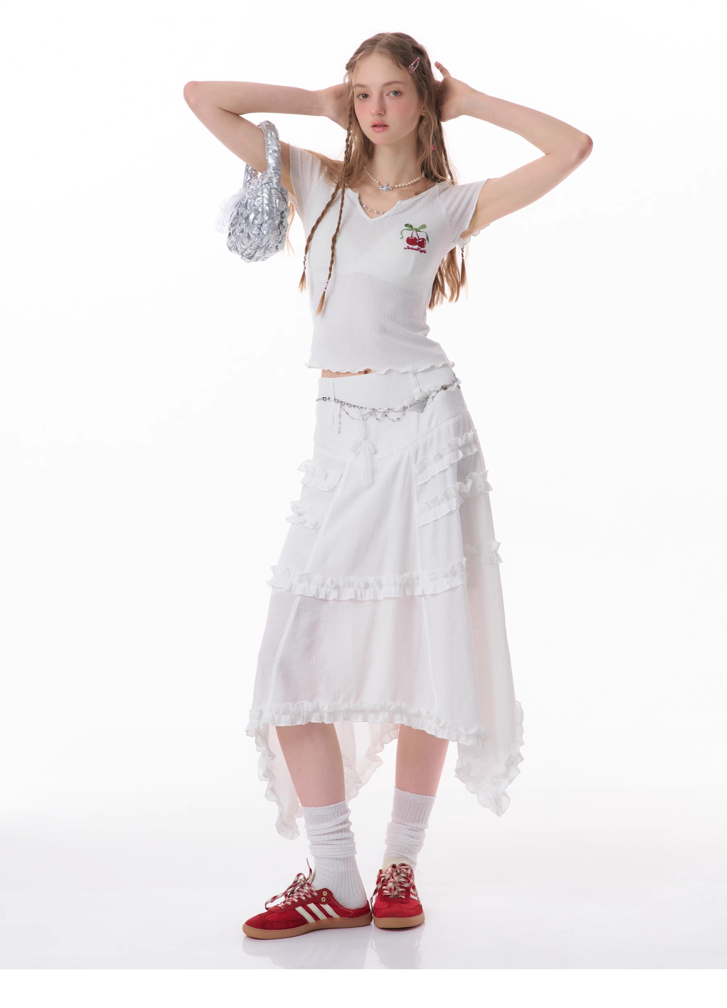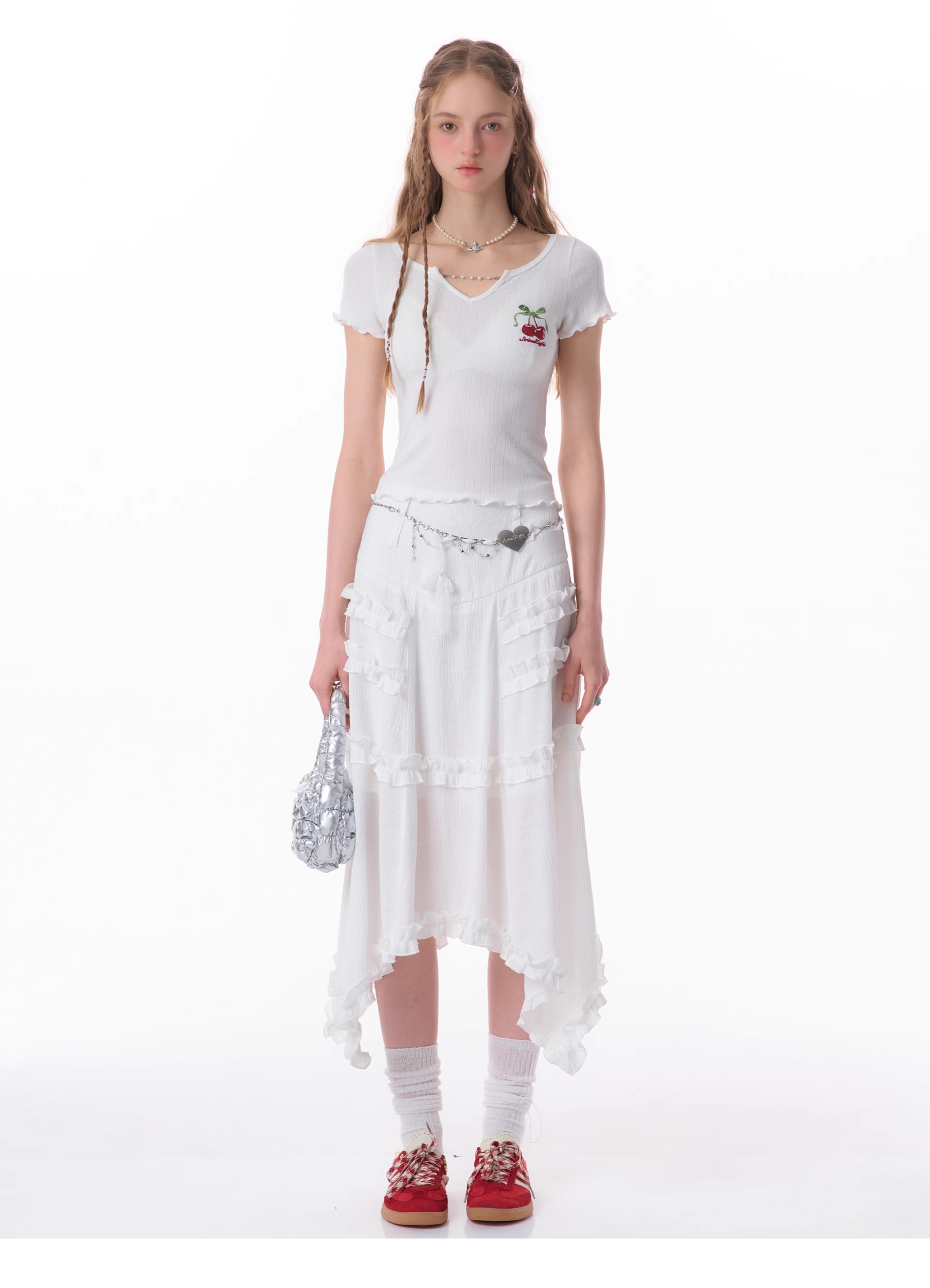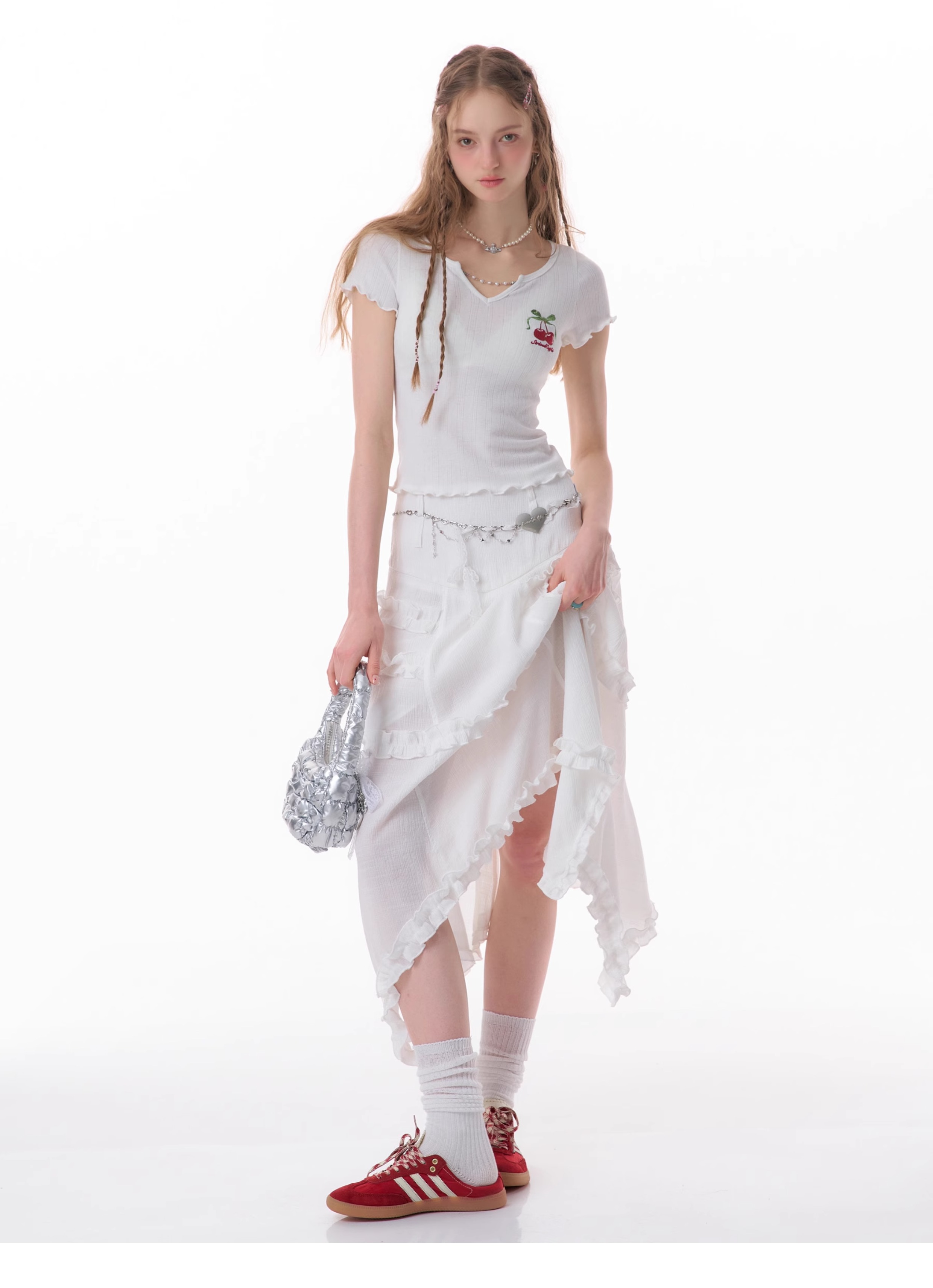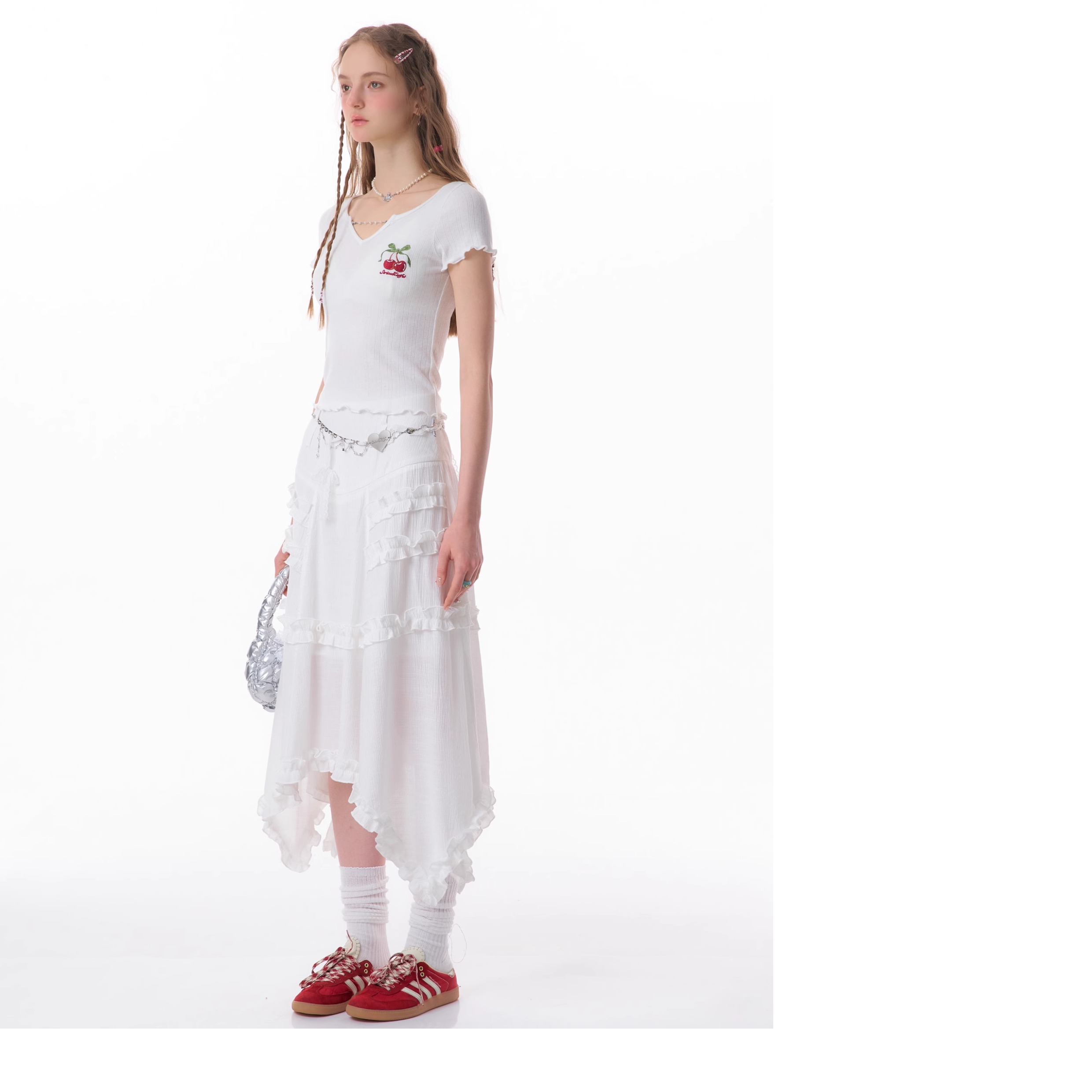 Cherry Embroidered Chain T-shirt | Mushroom Puff Sleeve V-neck Design for Summer