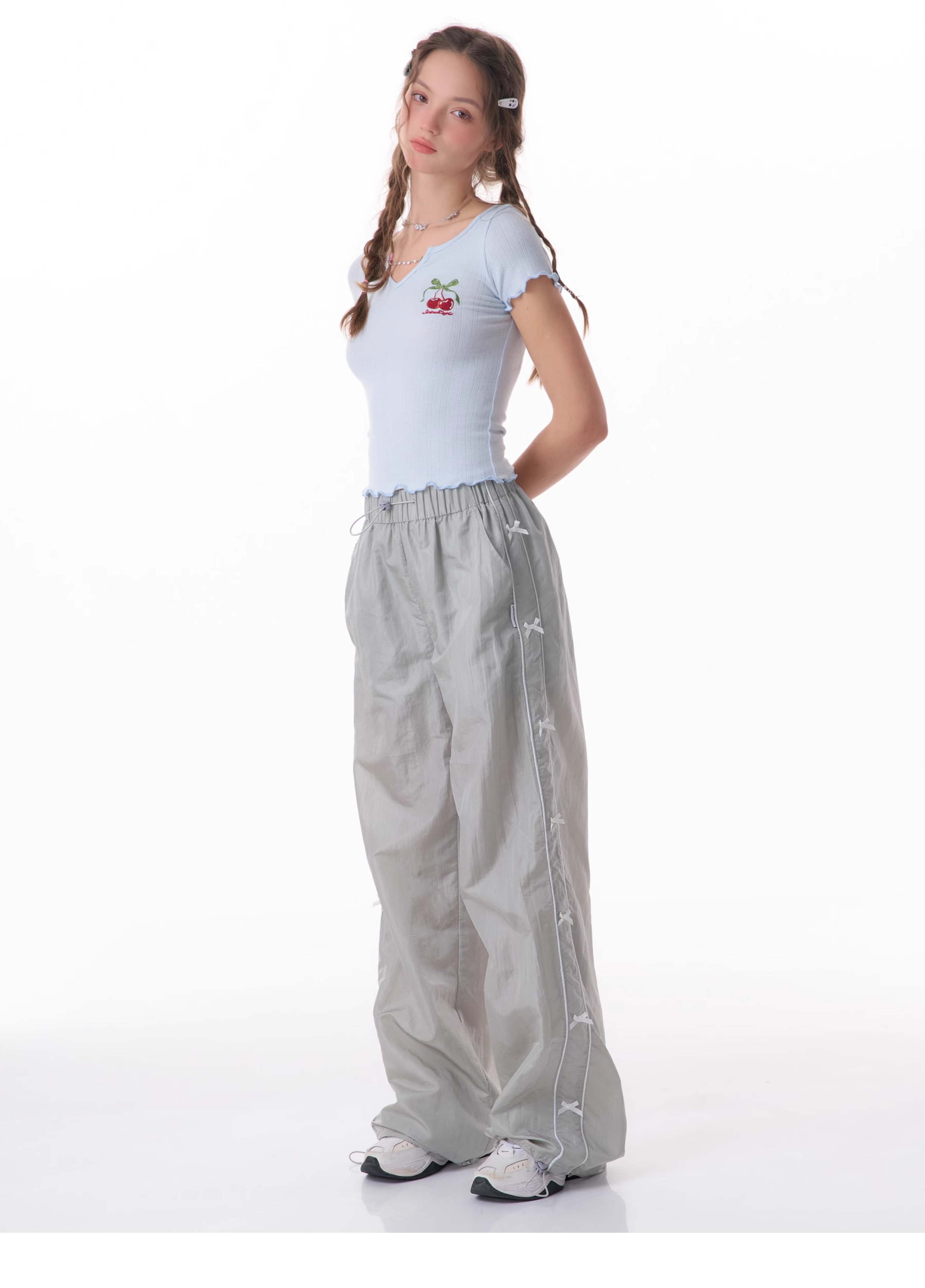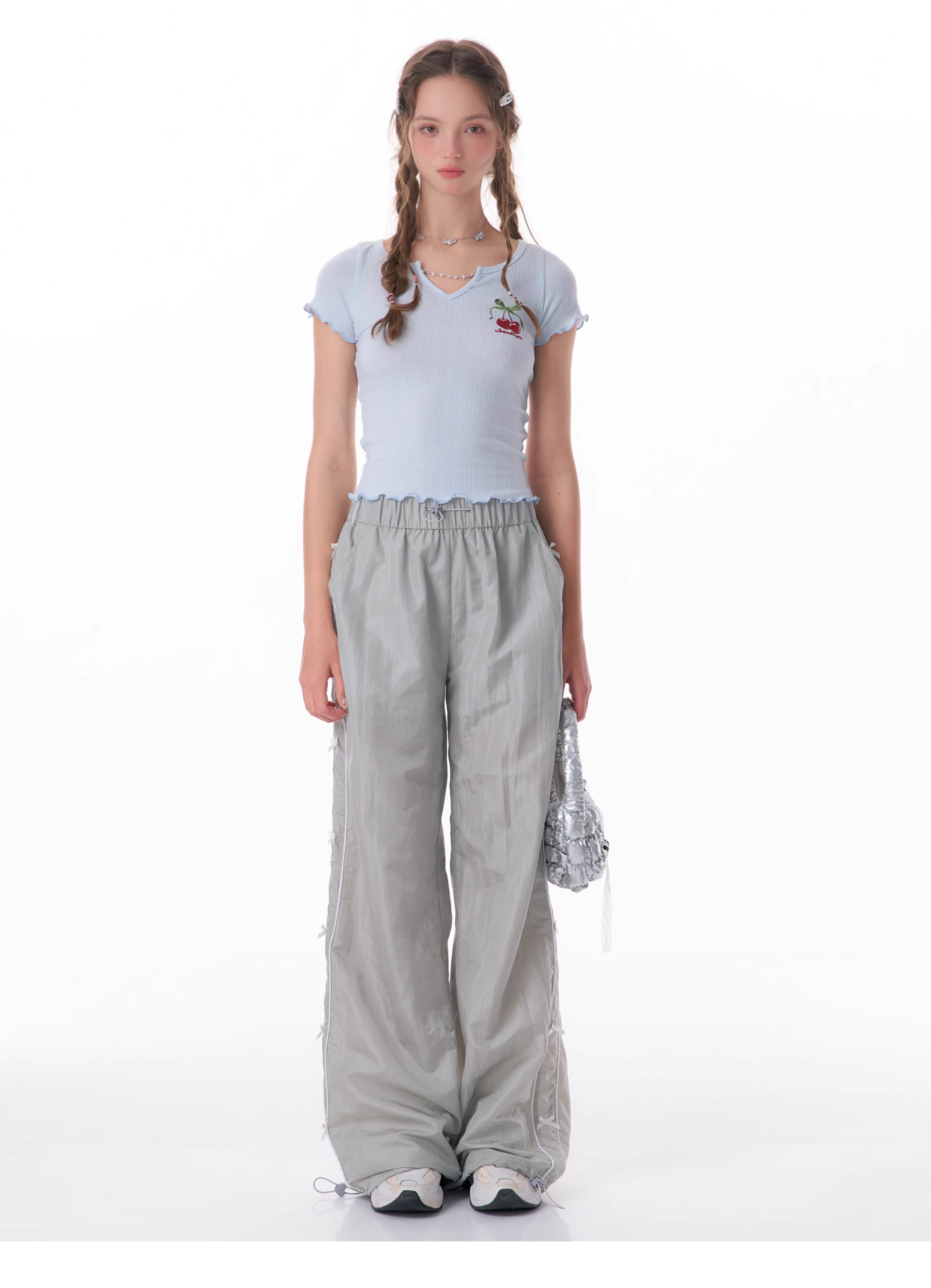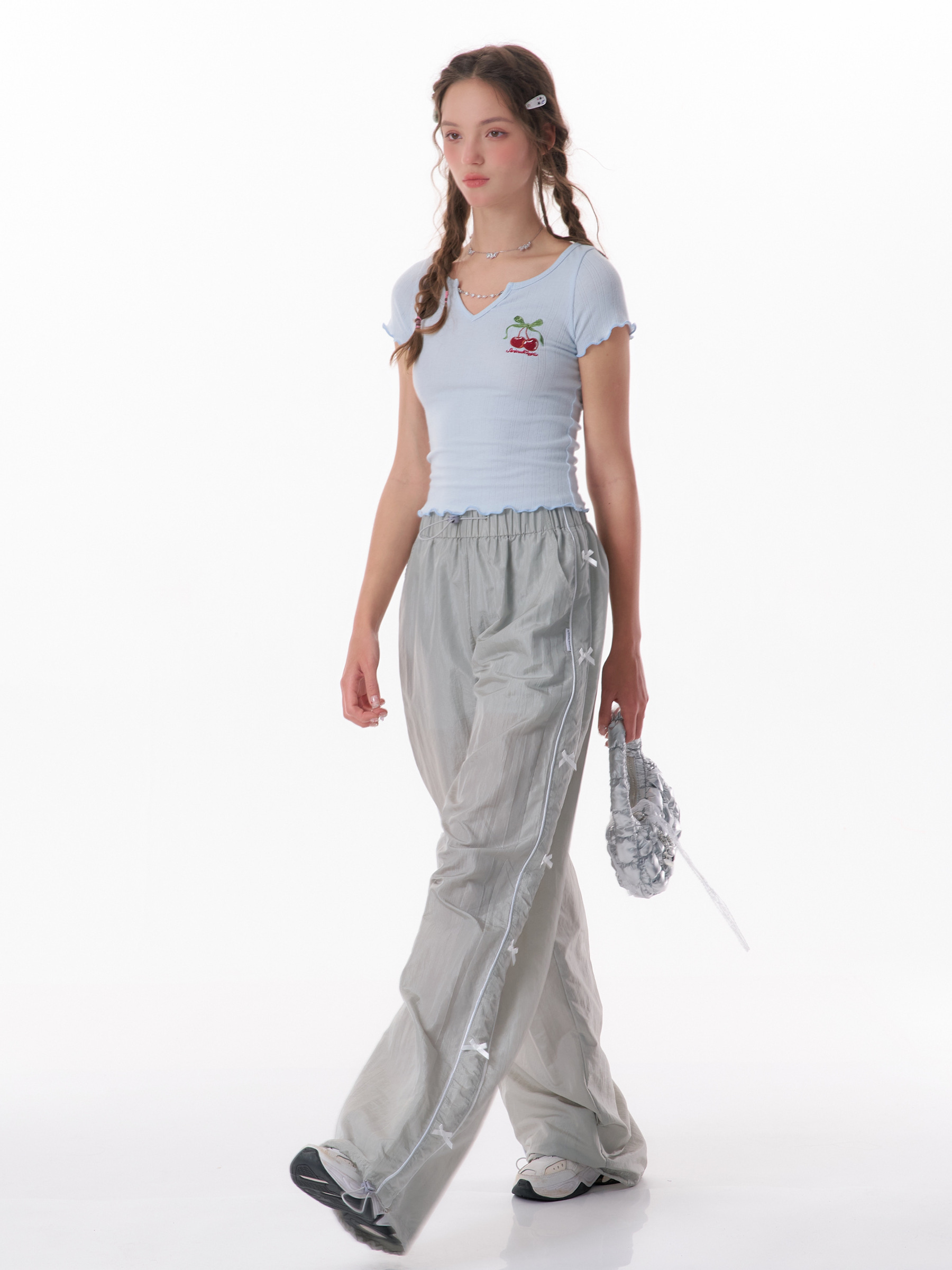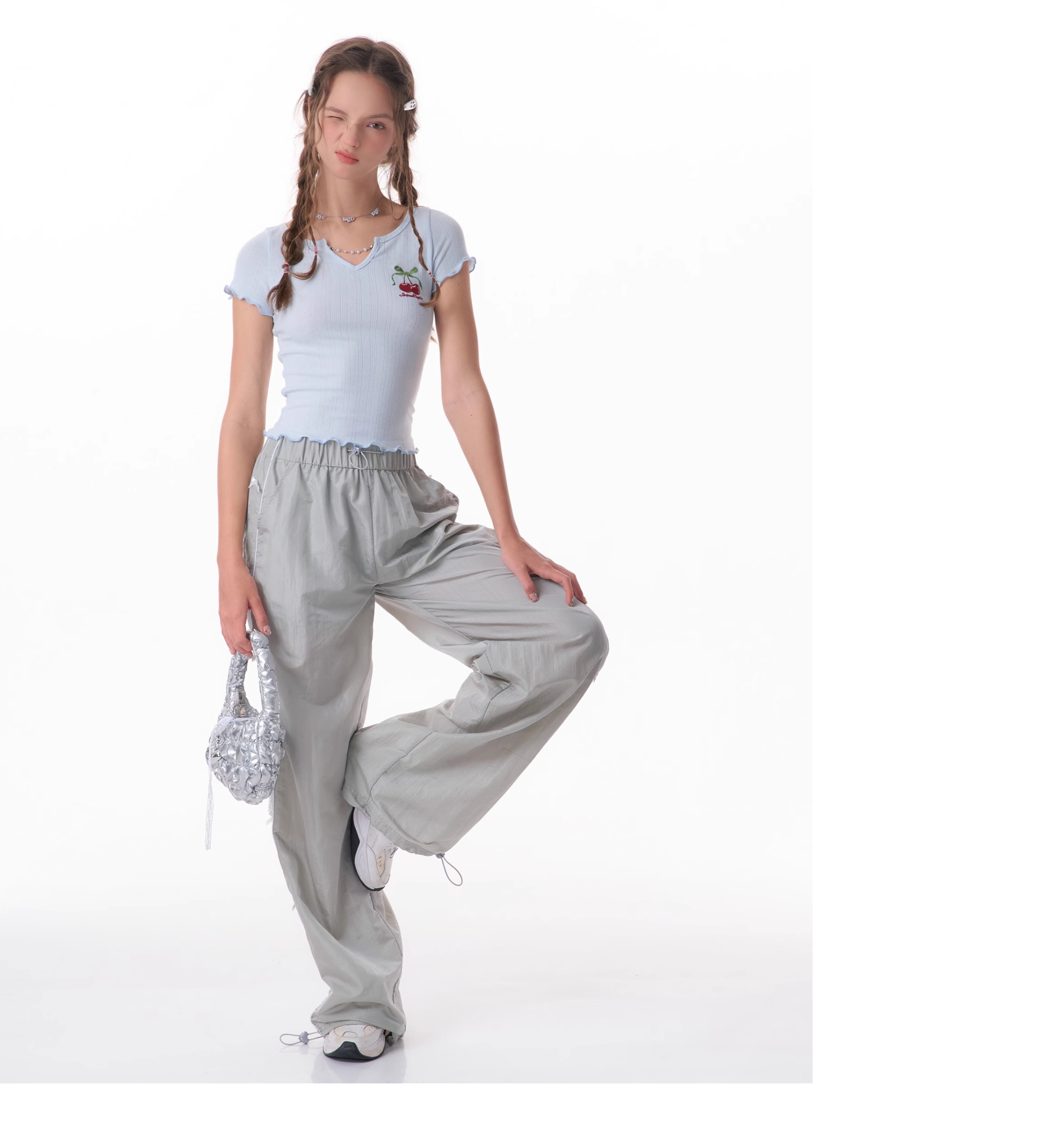 Cherry Embroidered Chain T-shirt | Mushroom Puff Sleeve V-neck Design for Summer