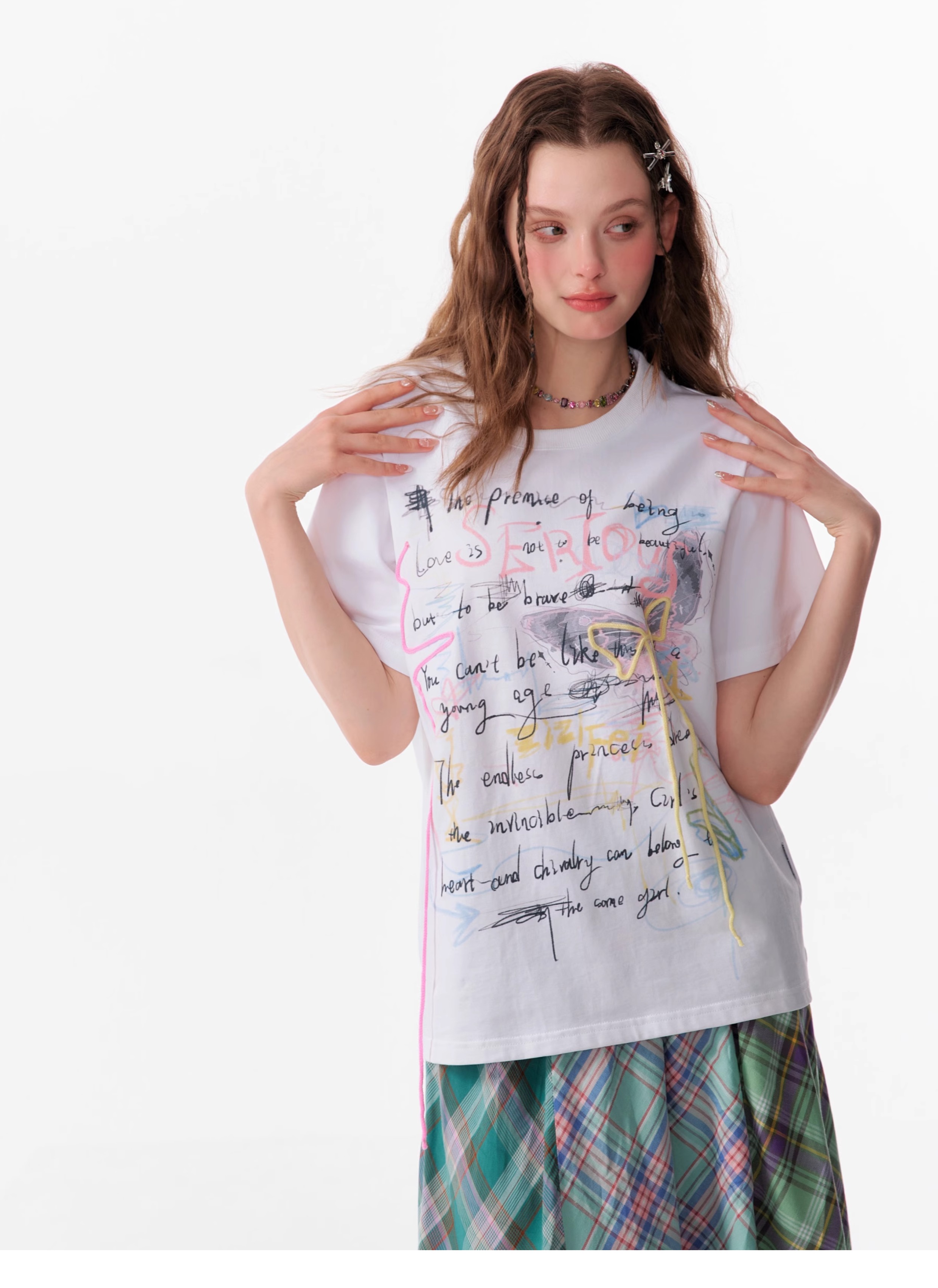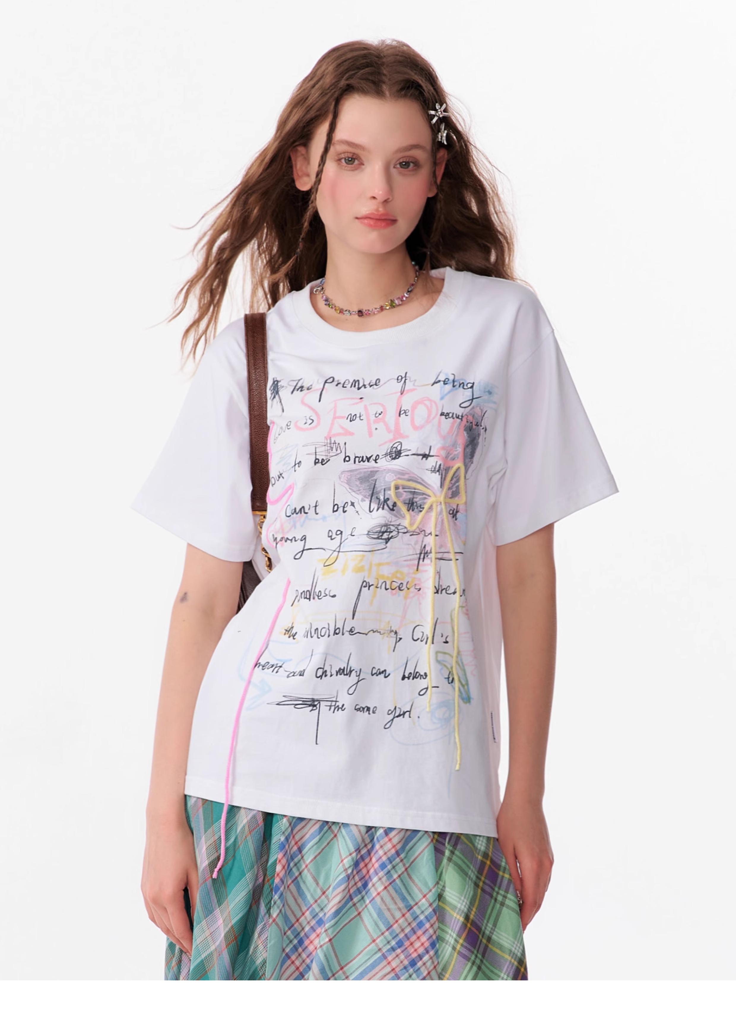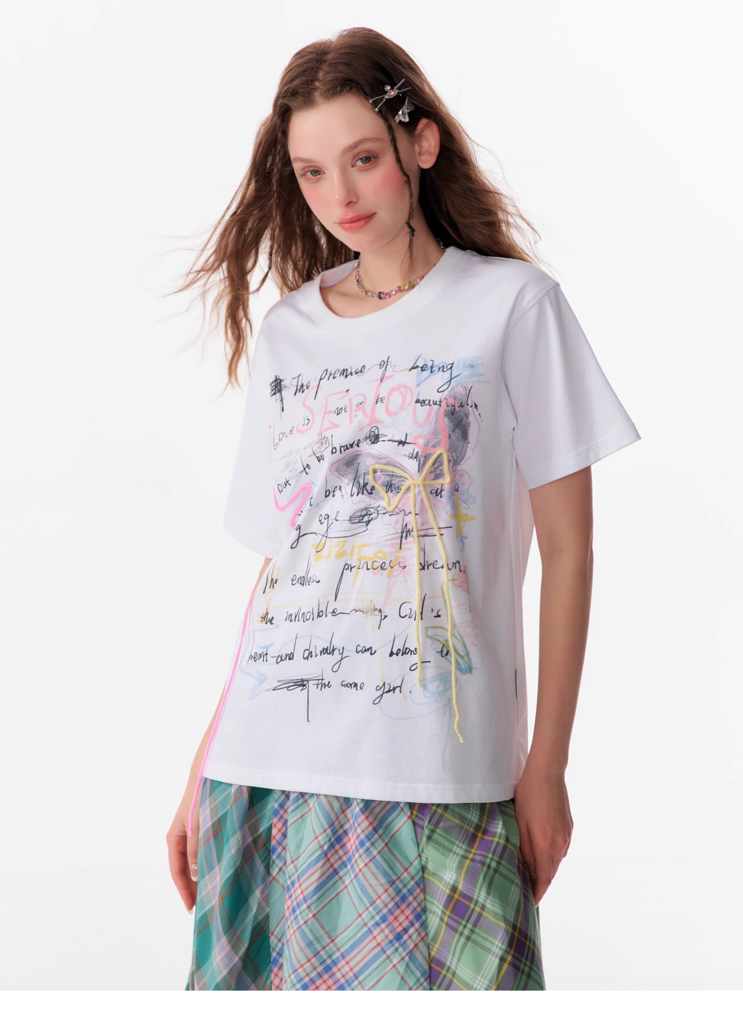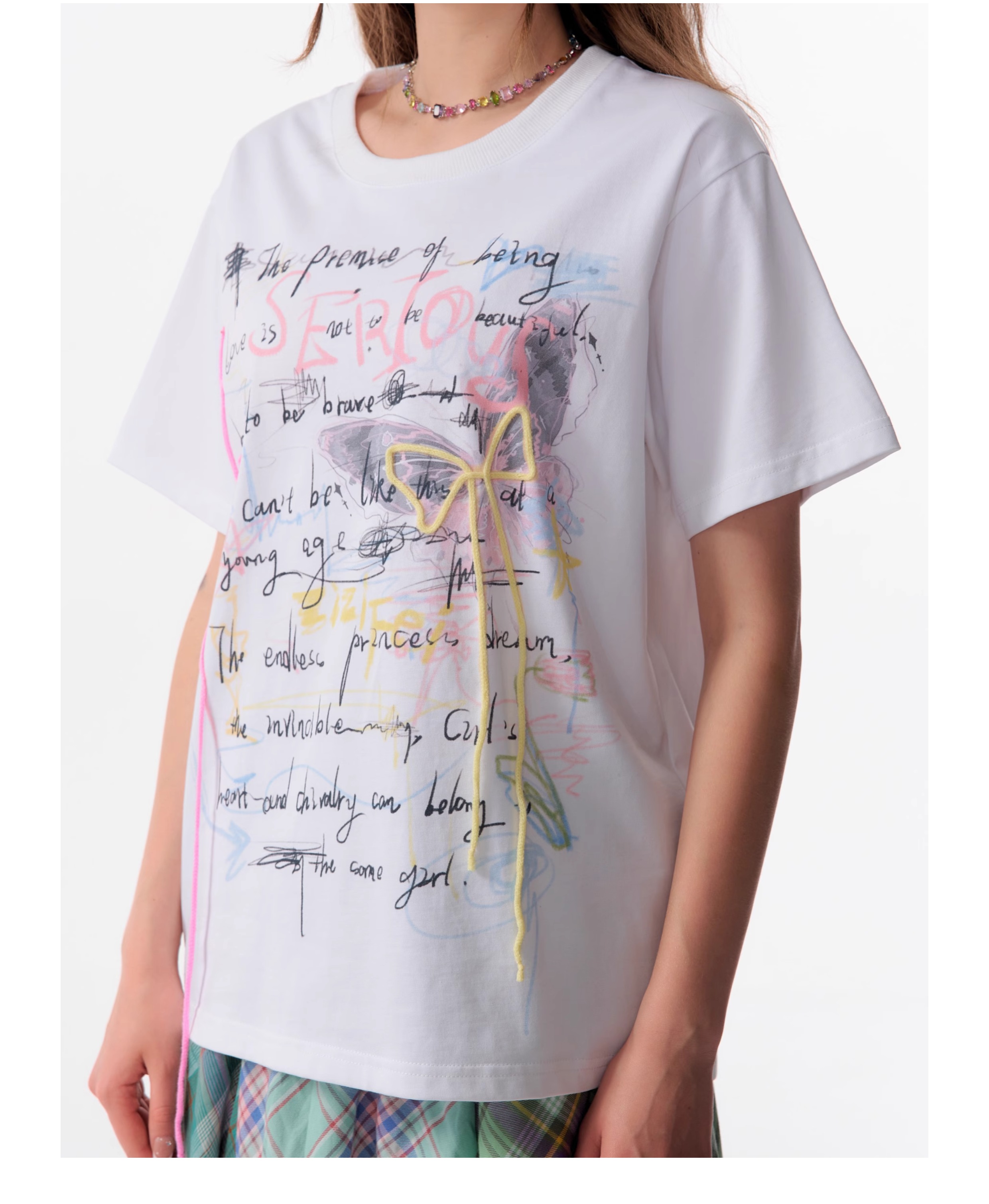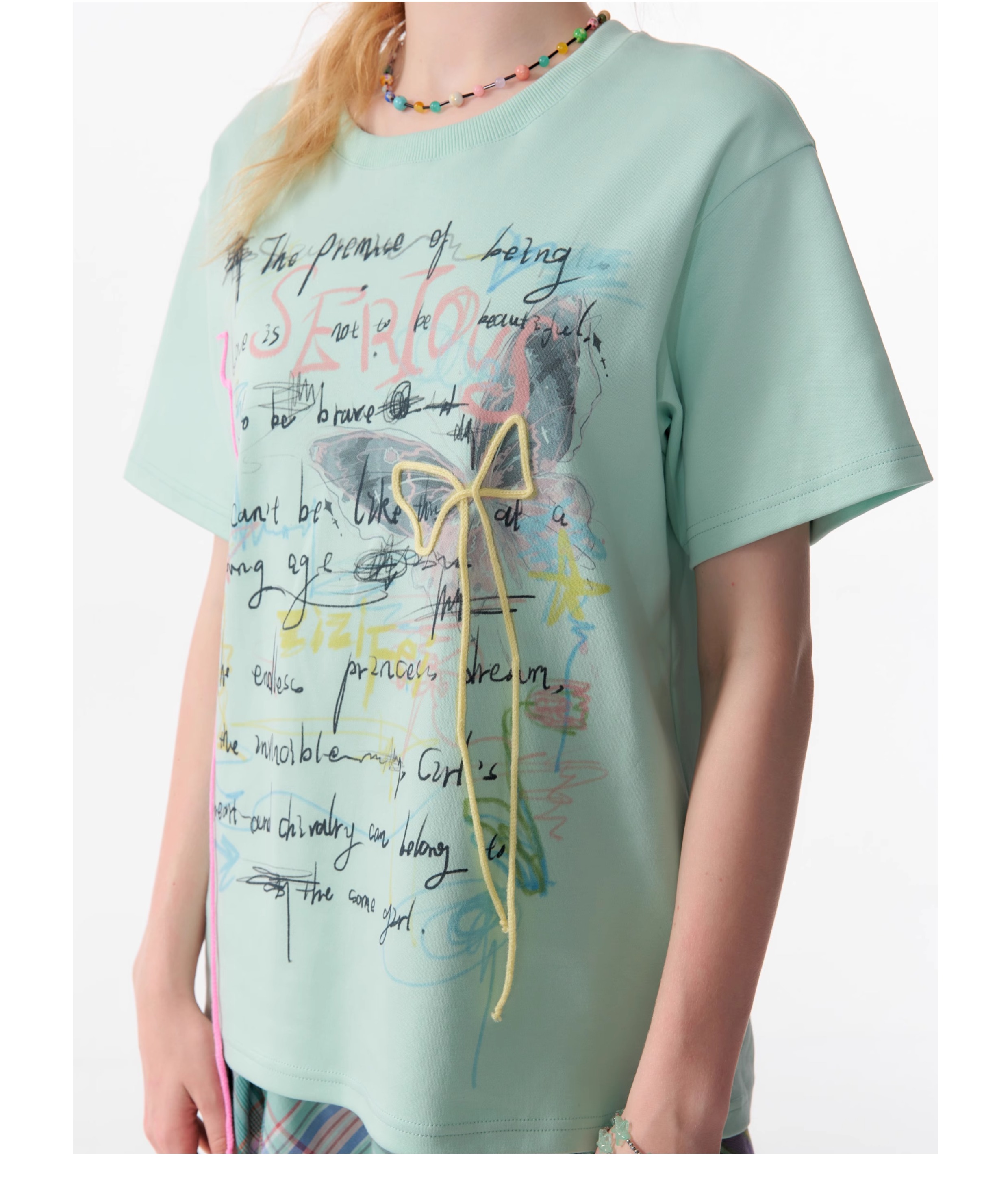 Graffiti Printed Bow T-shirt | Retro English Print Design for Summer