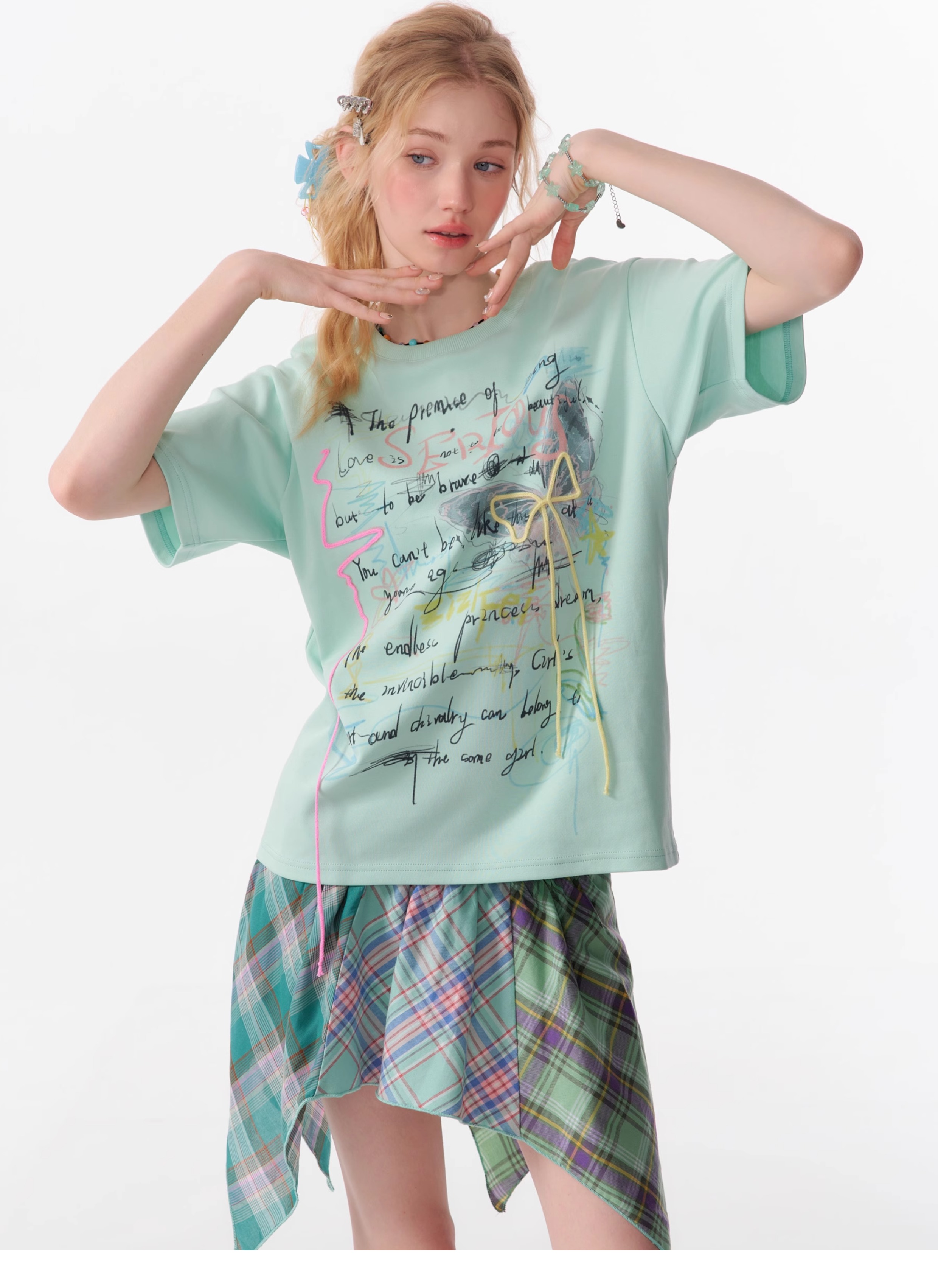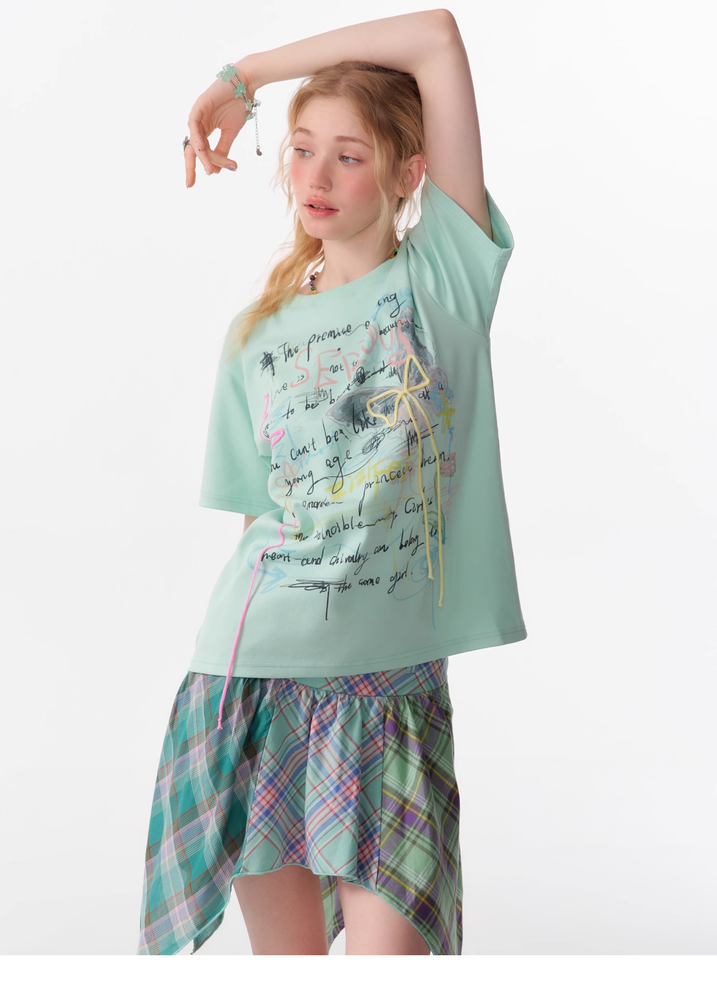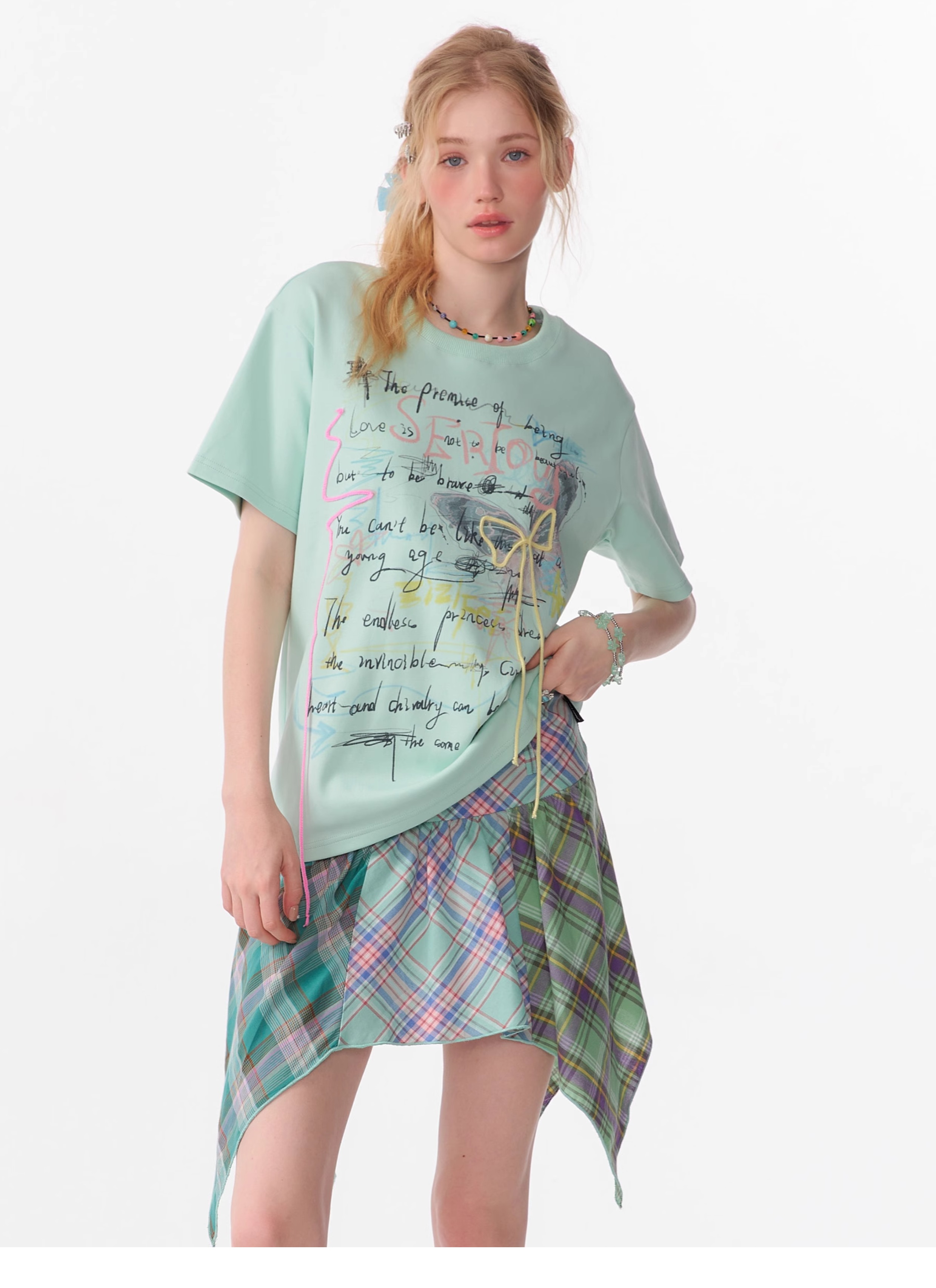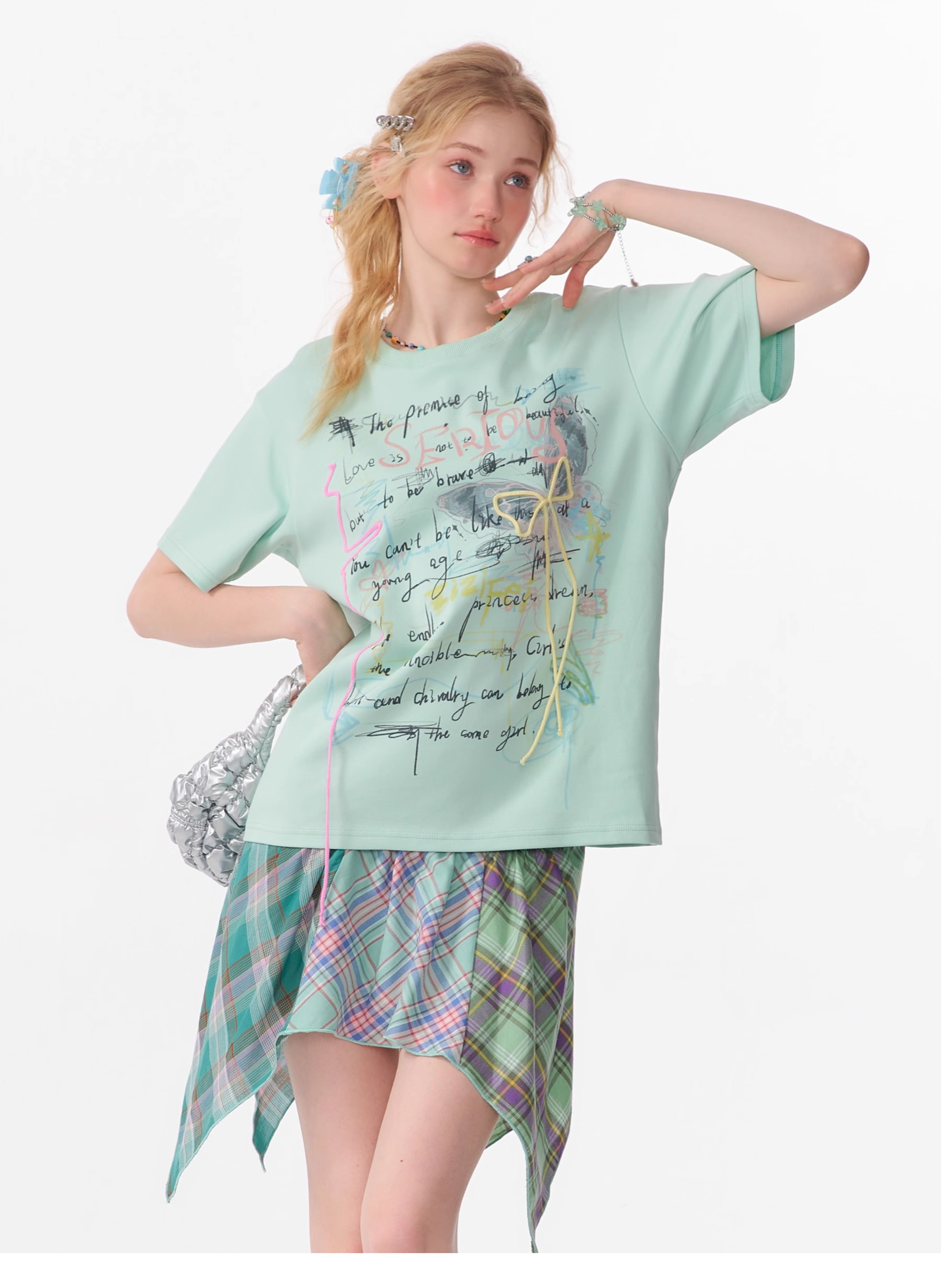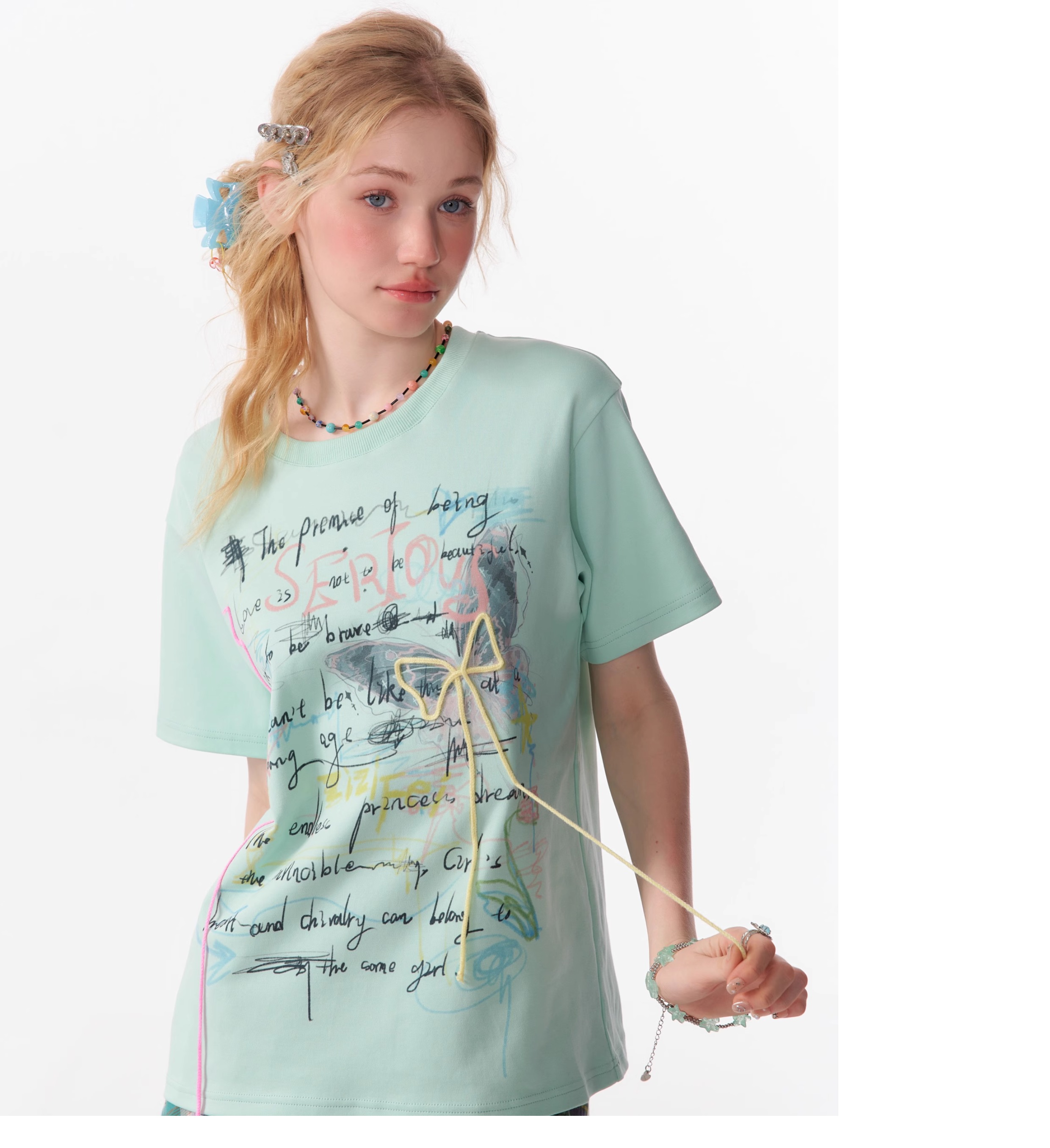 Graffiti Printed Bow T-shirt | Retro English Print Design for Summer