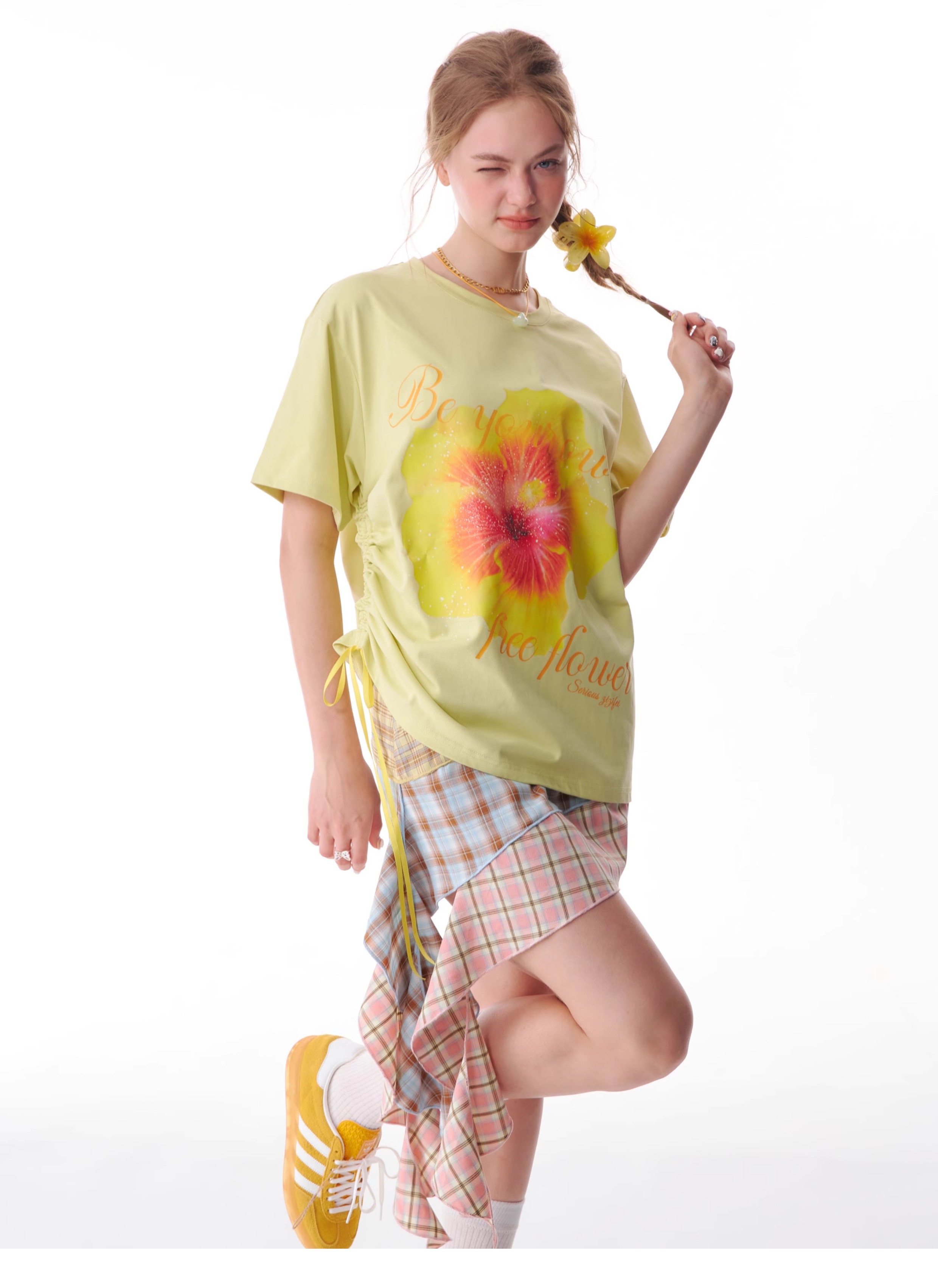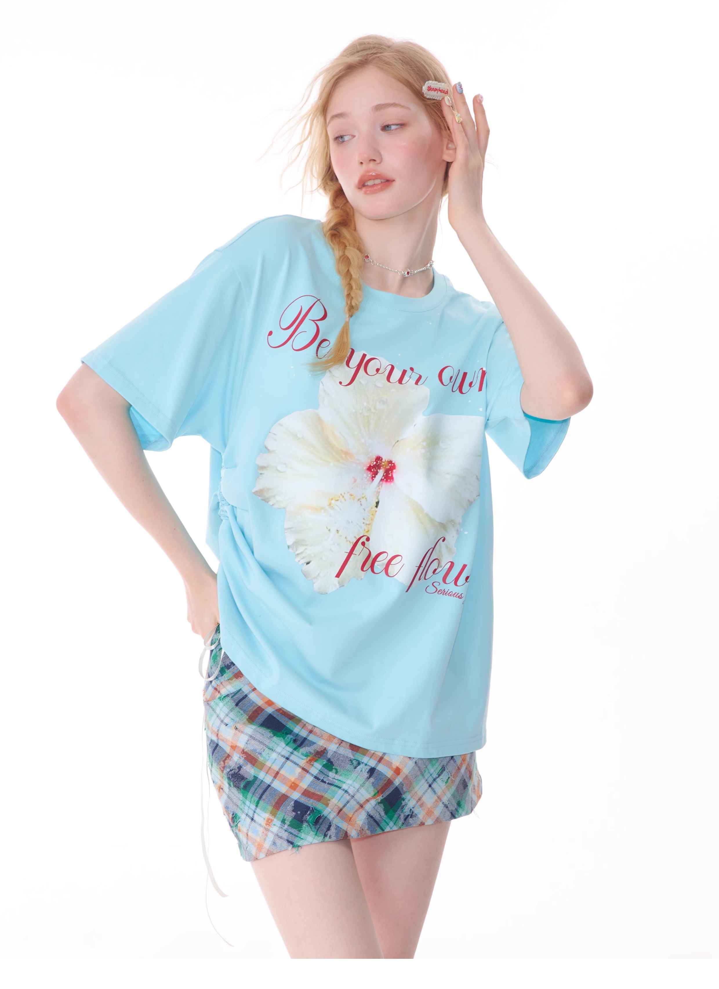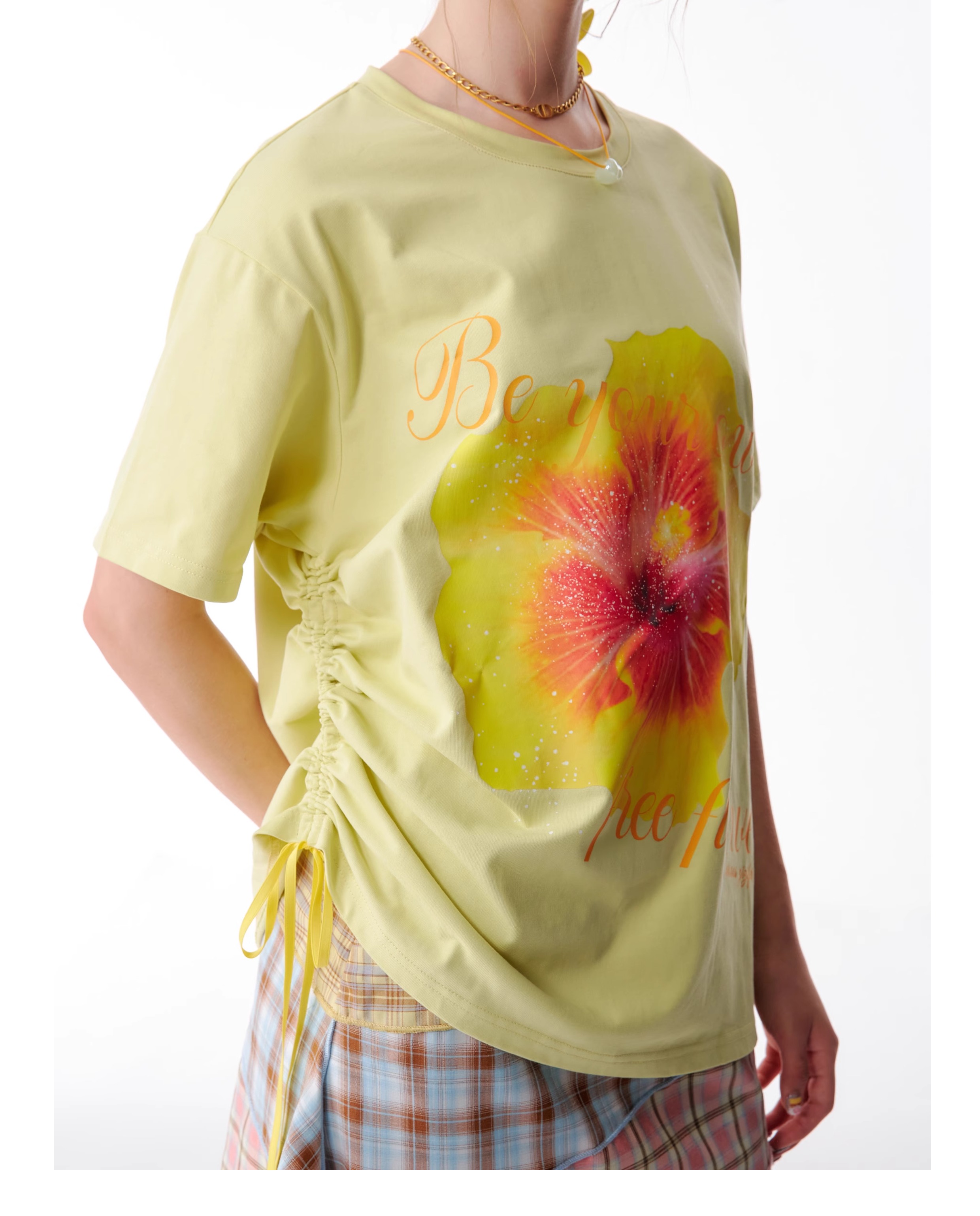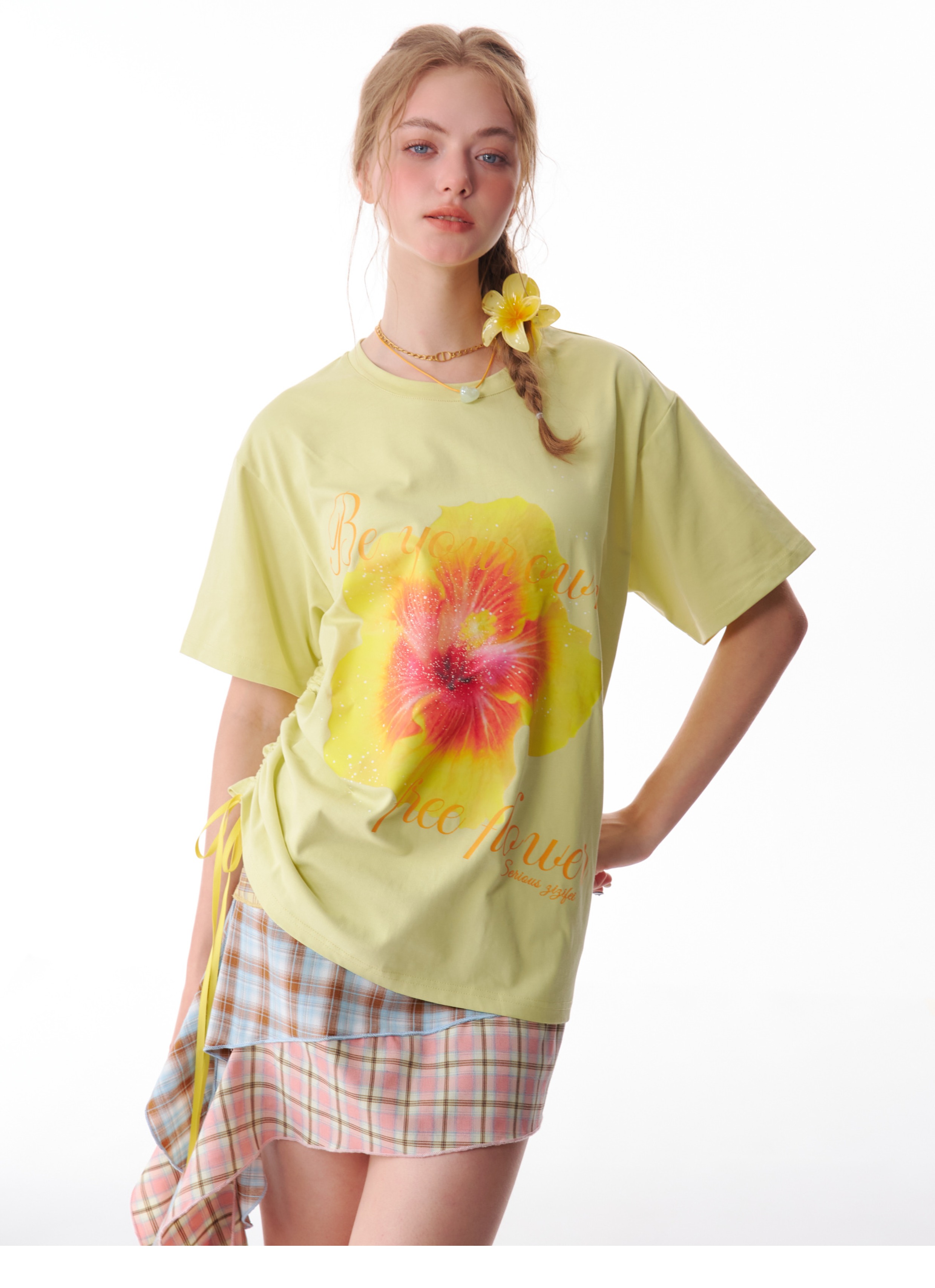 Flower Printed Drawstring T-shirt | Loose Round Neck Retro Design for Summer