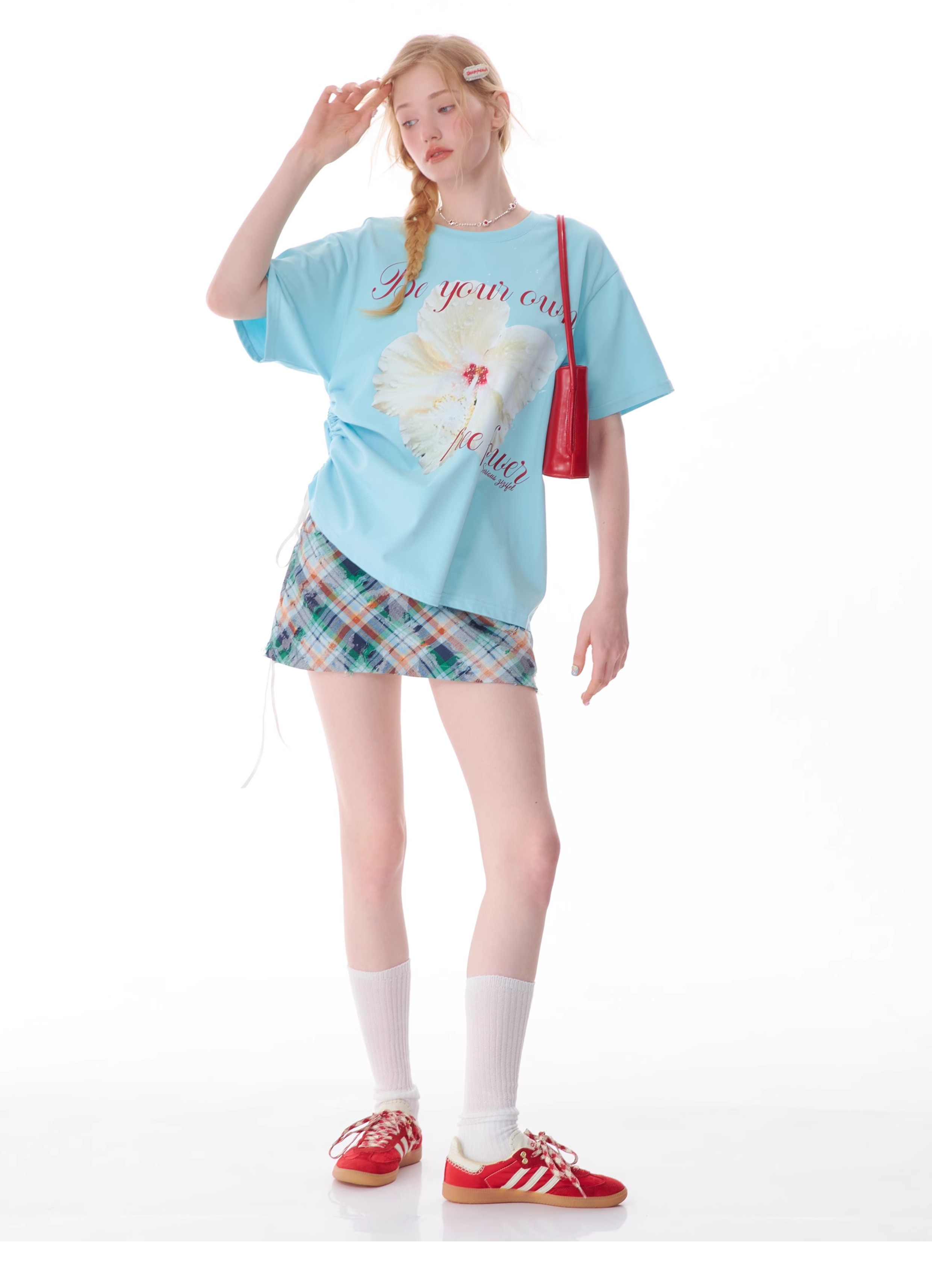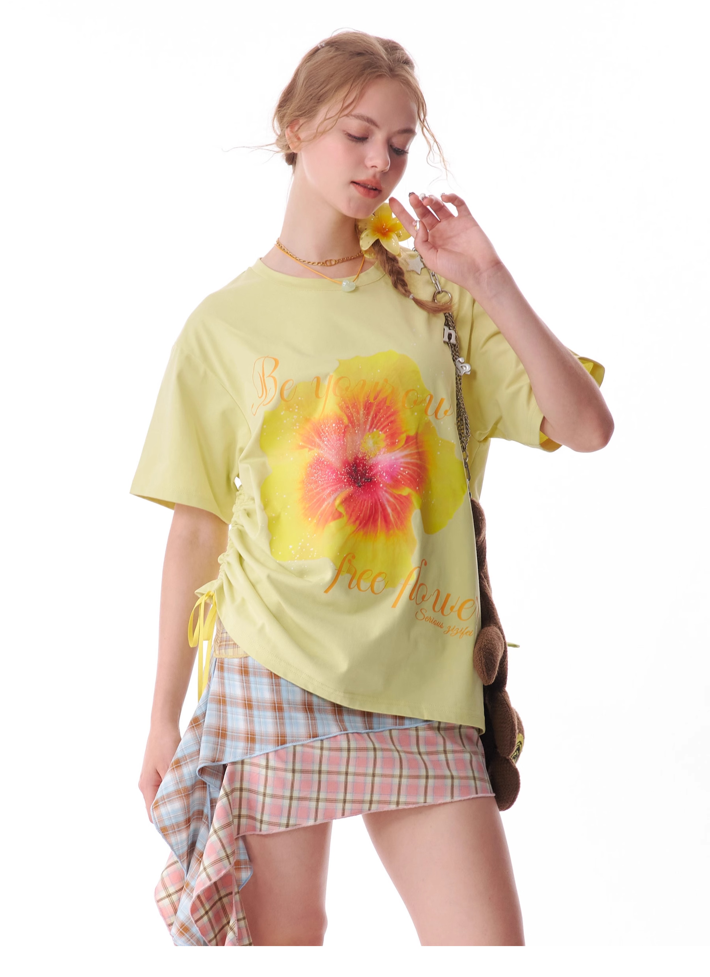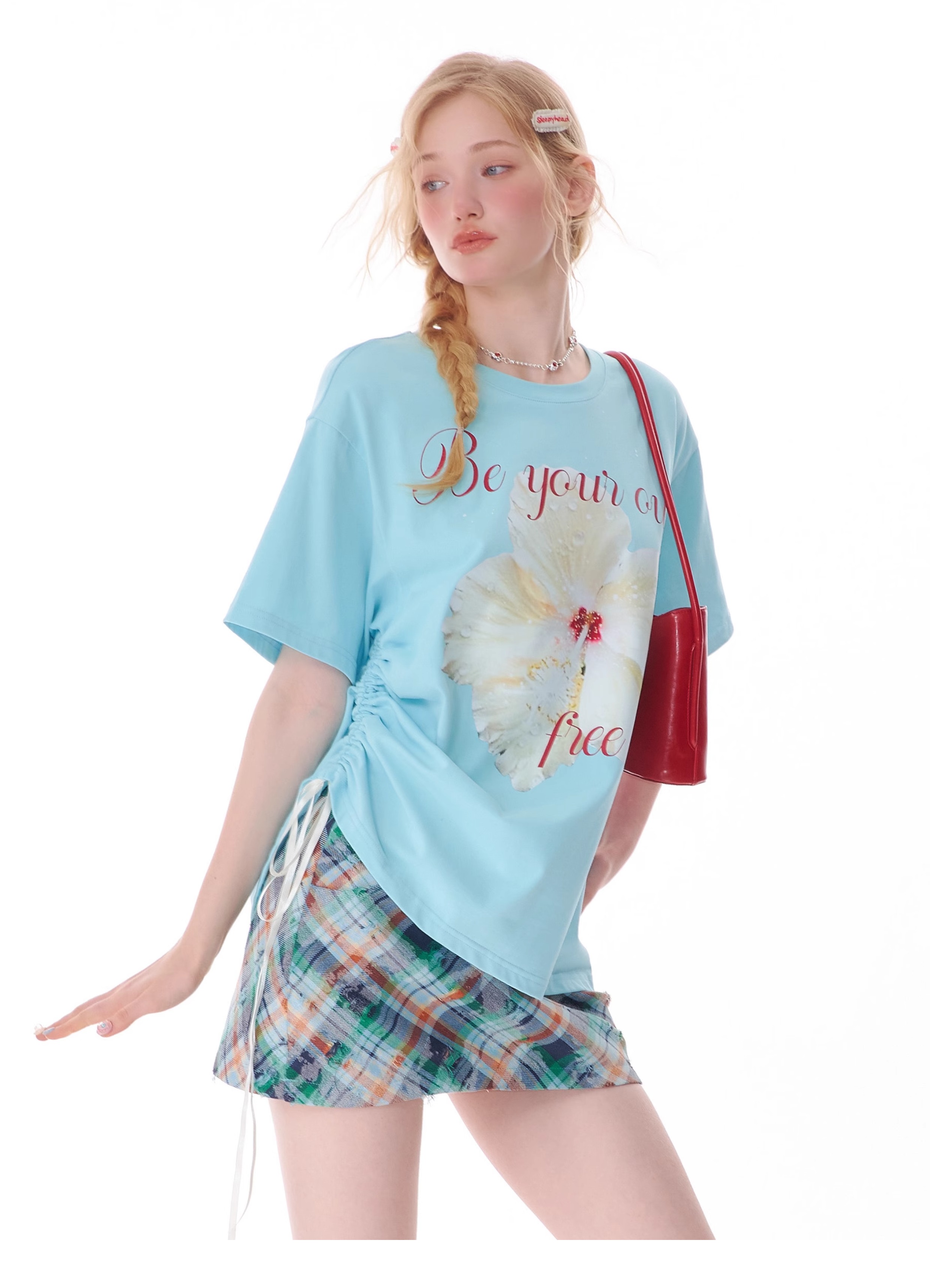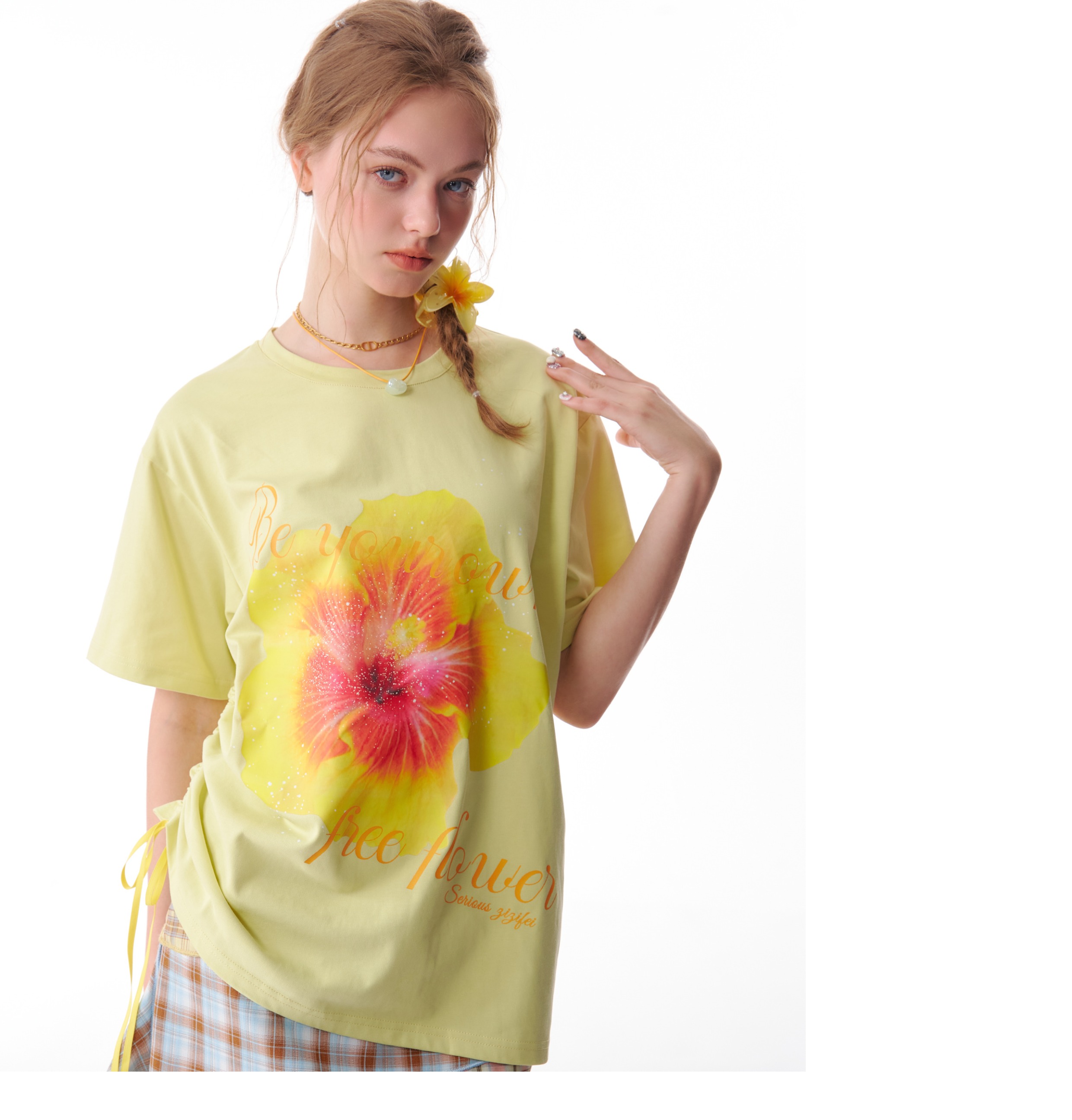 Flower Printed Drawstring T-shirt | Loose Round Neck Retro Design for Summer