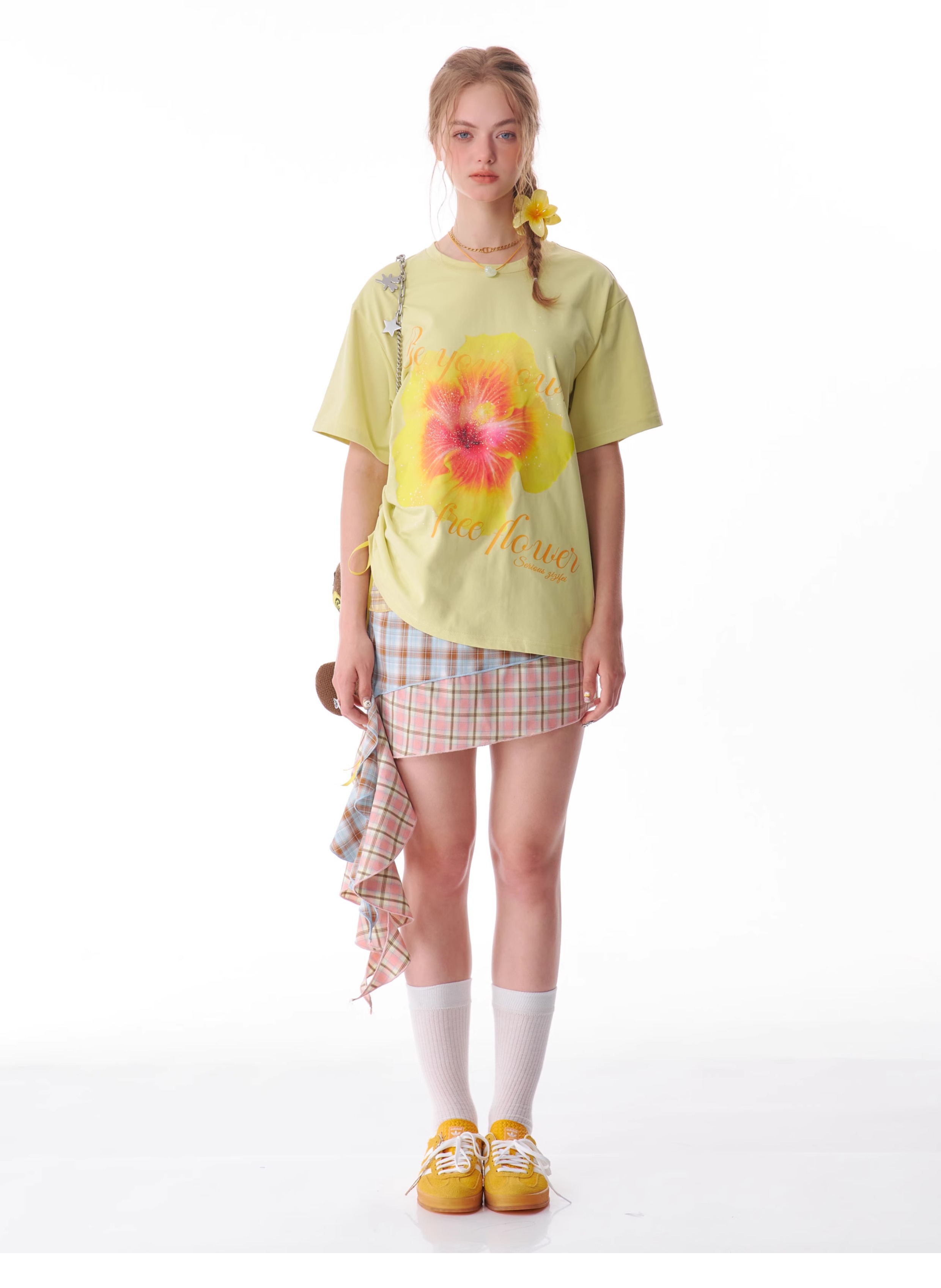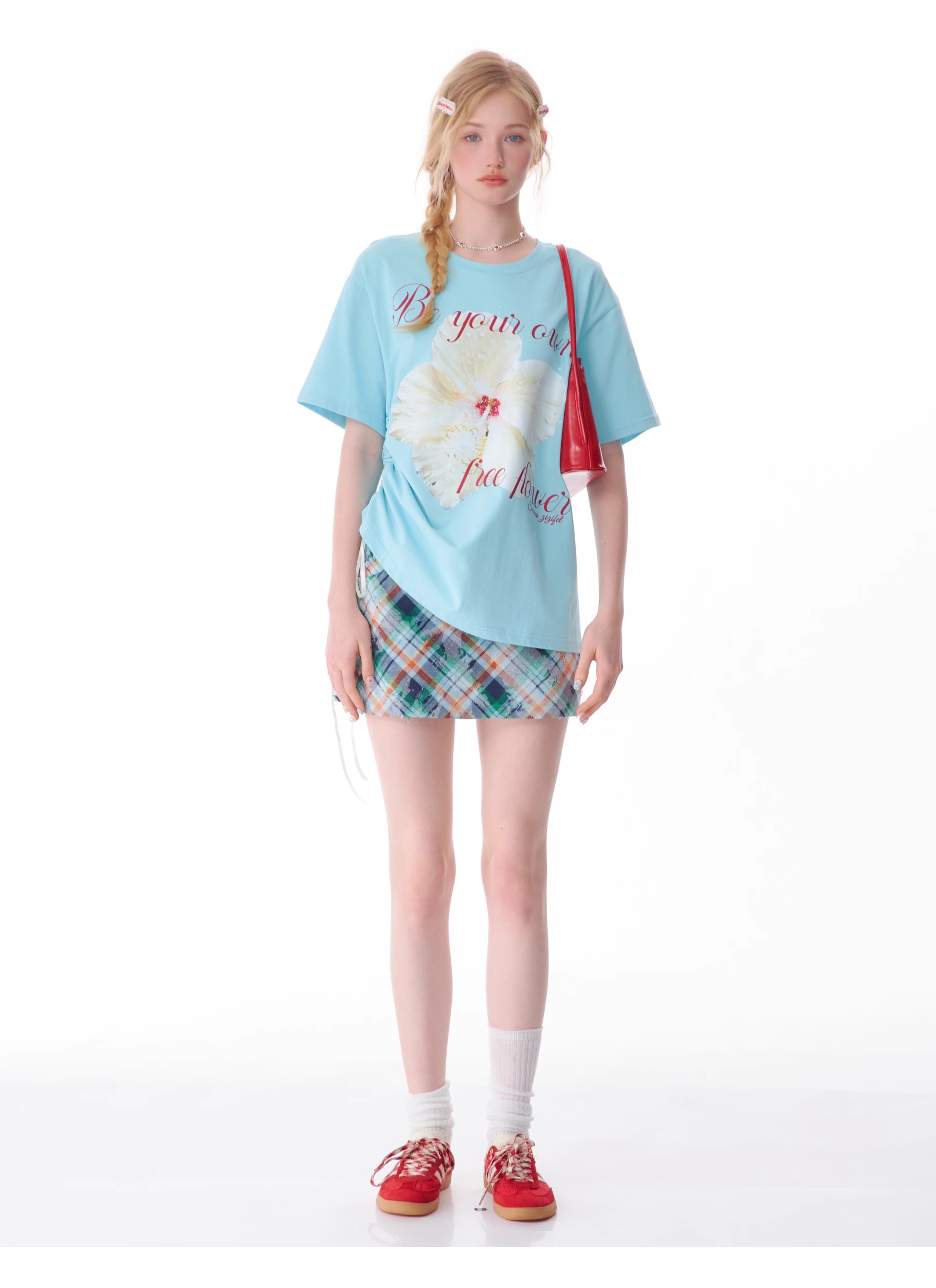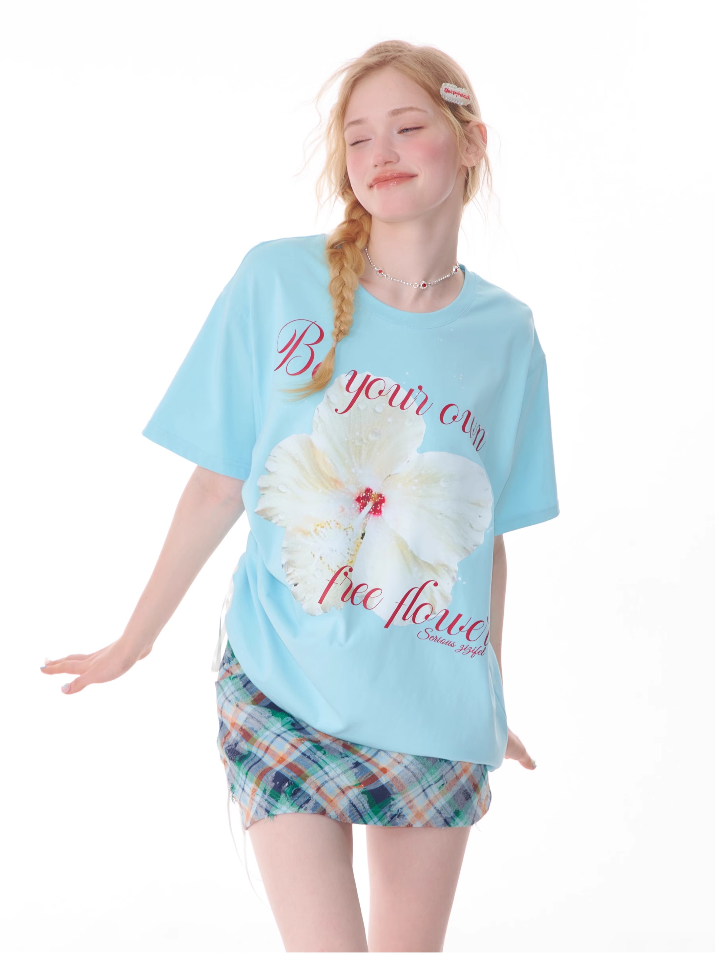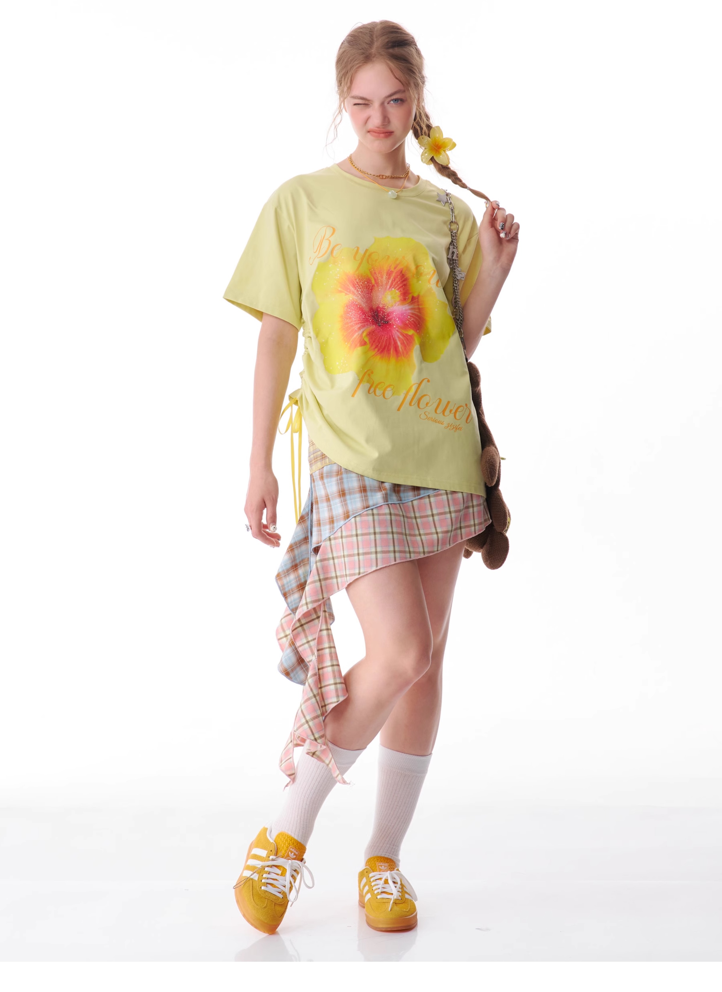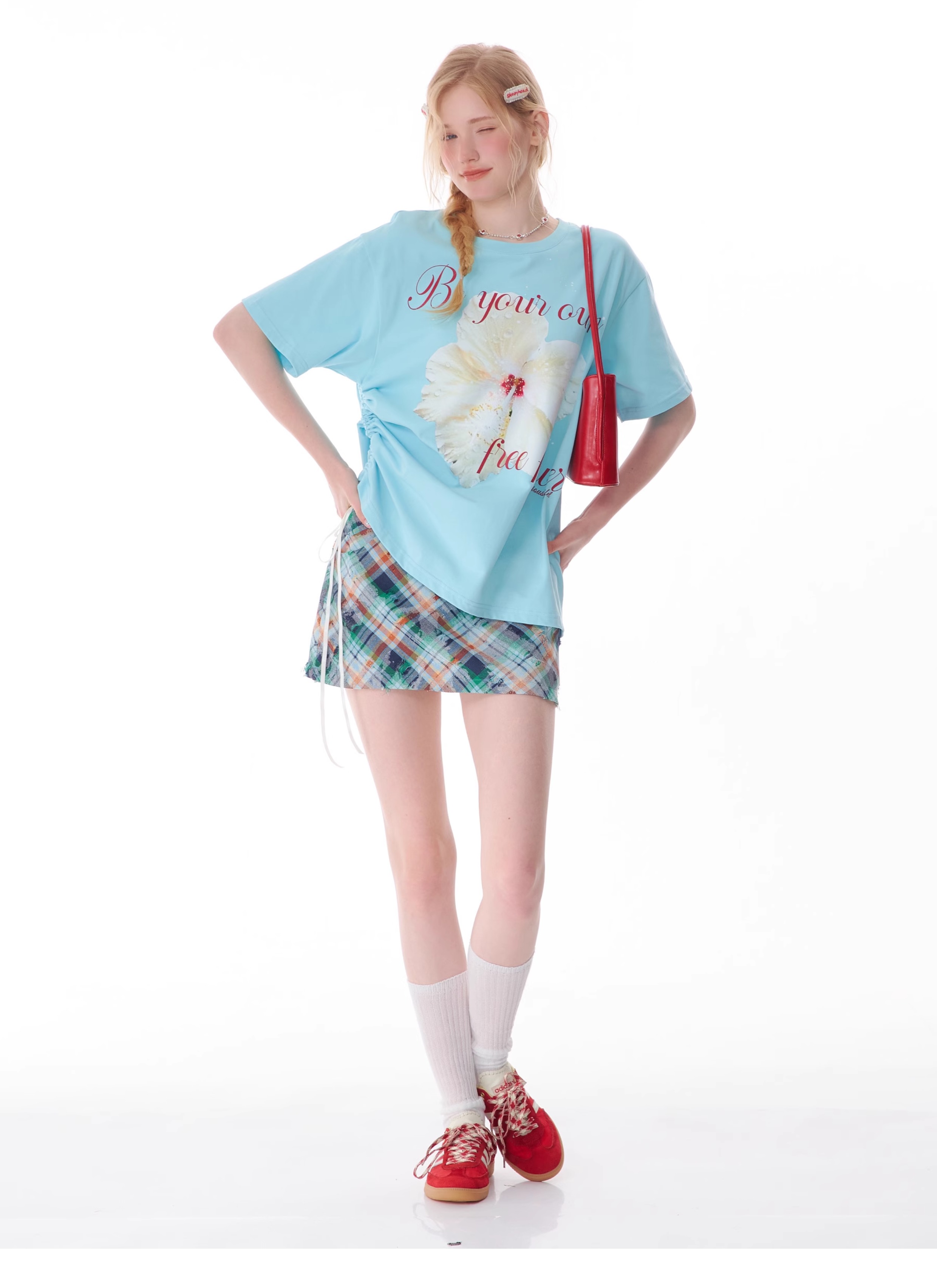 Flower Printed Drawstring T-shirt | Loose Round Neck Retro Design for Summer