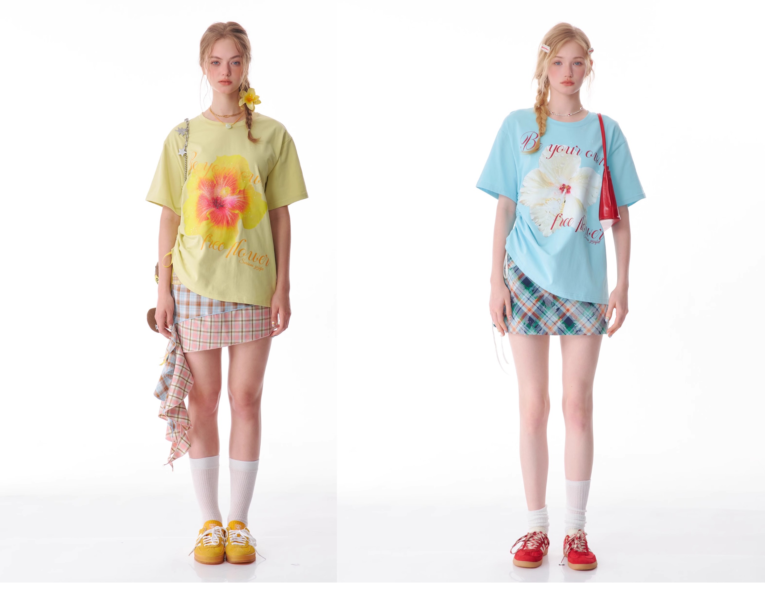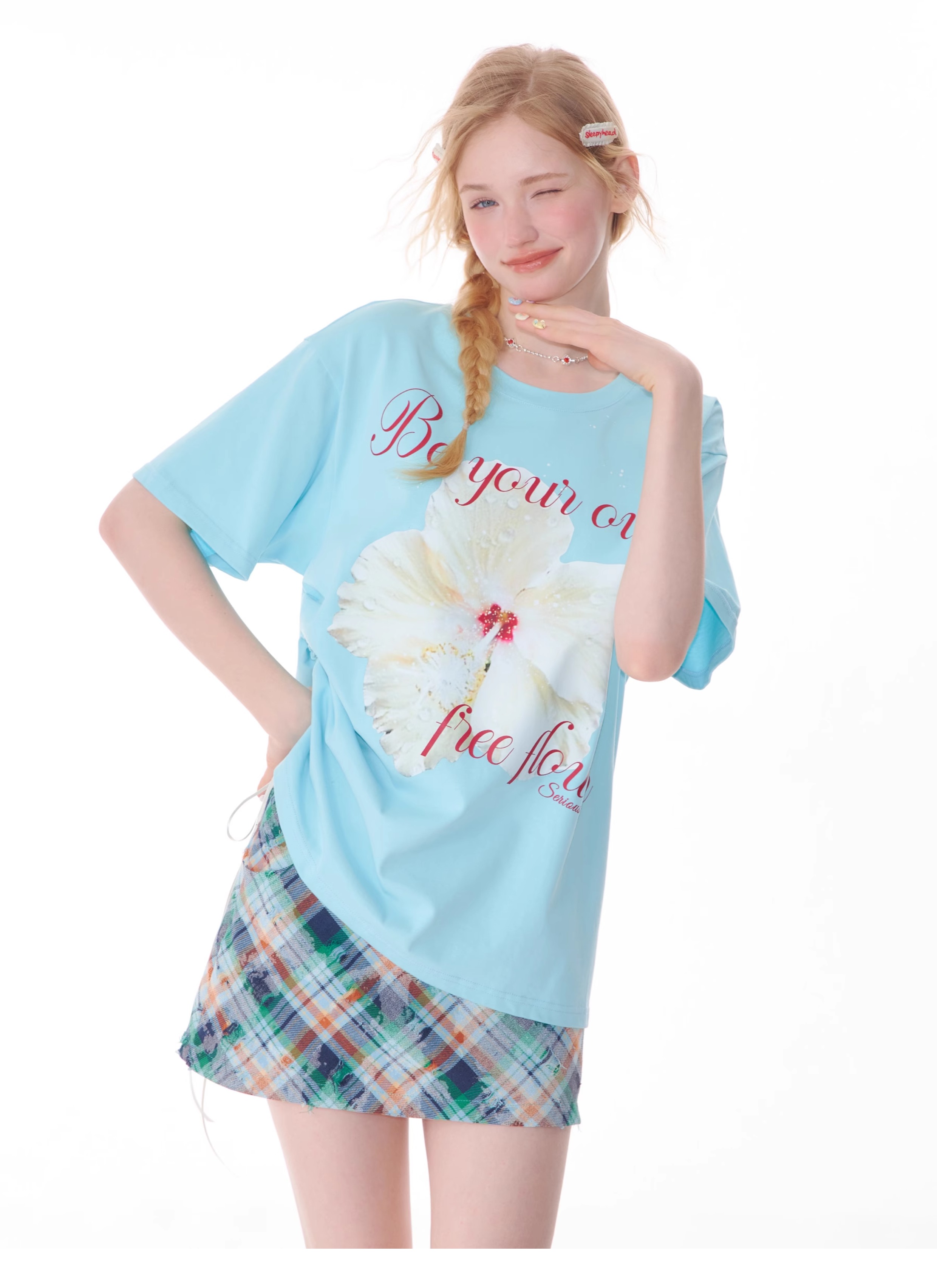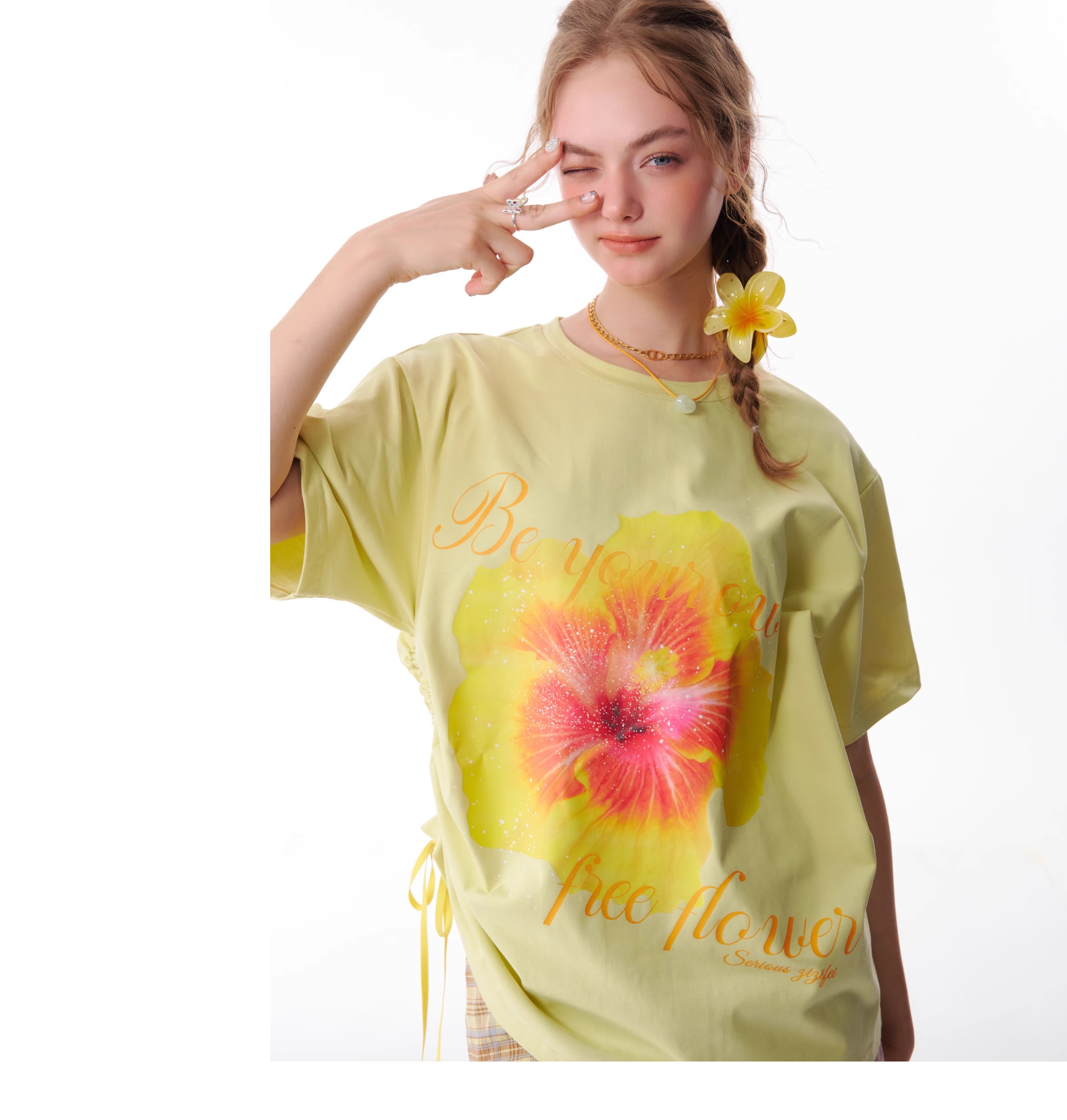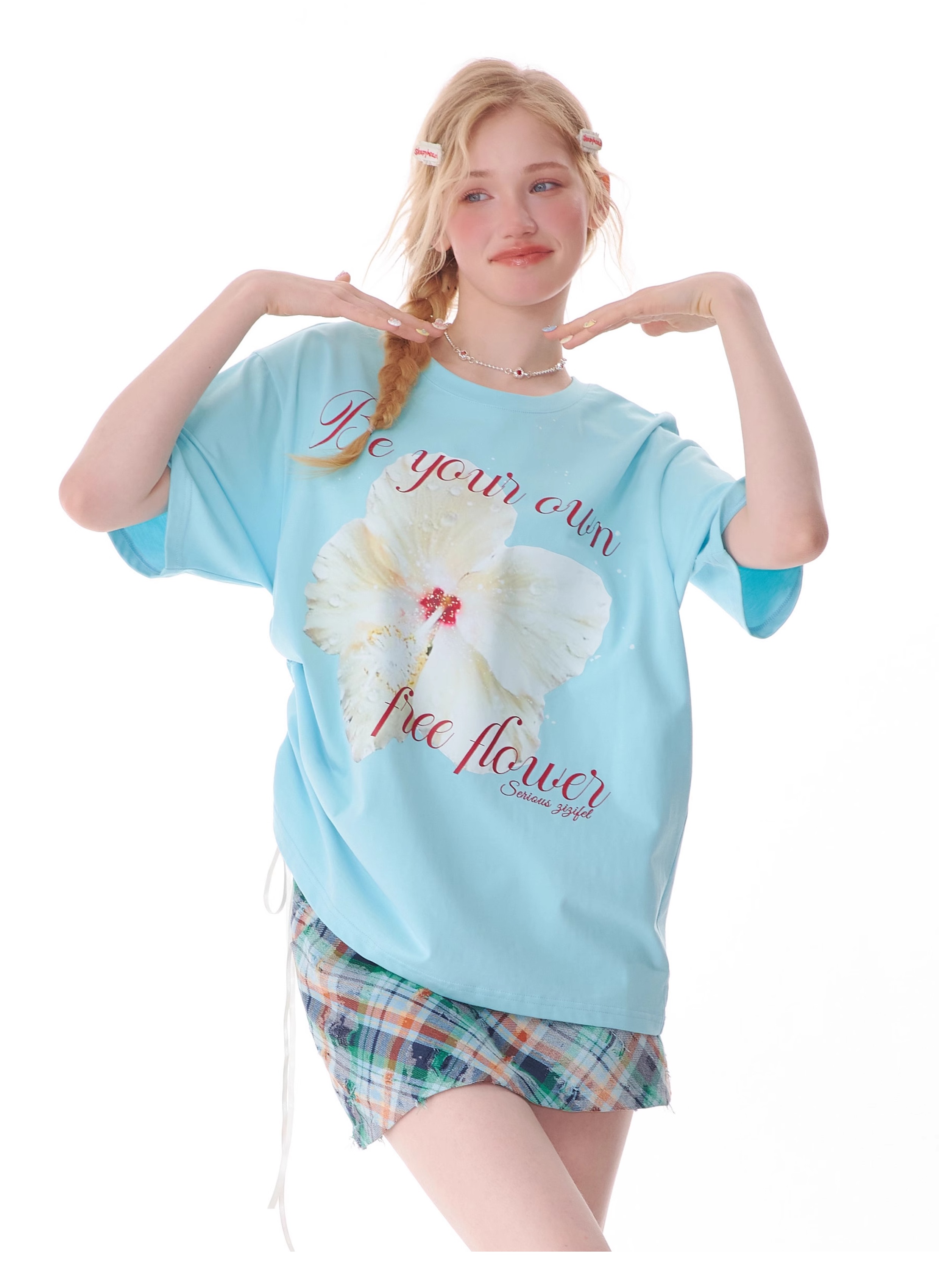 Flower Printed Drawstring T-shirt | Loose Round Neck Retro Design for Summer