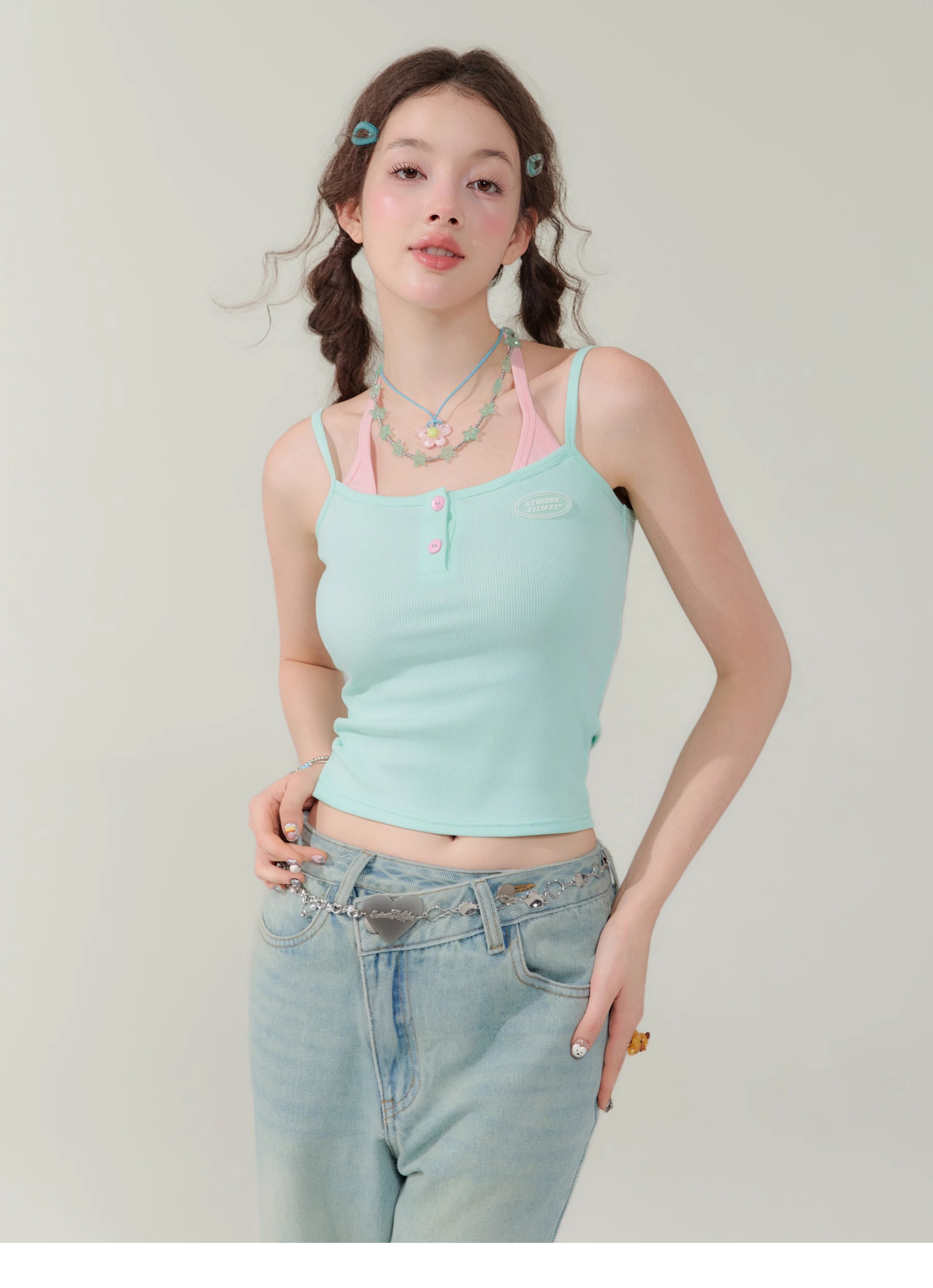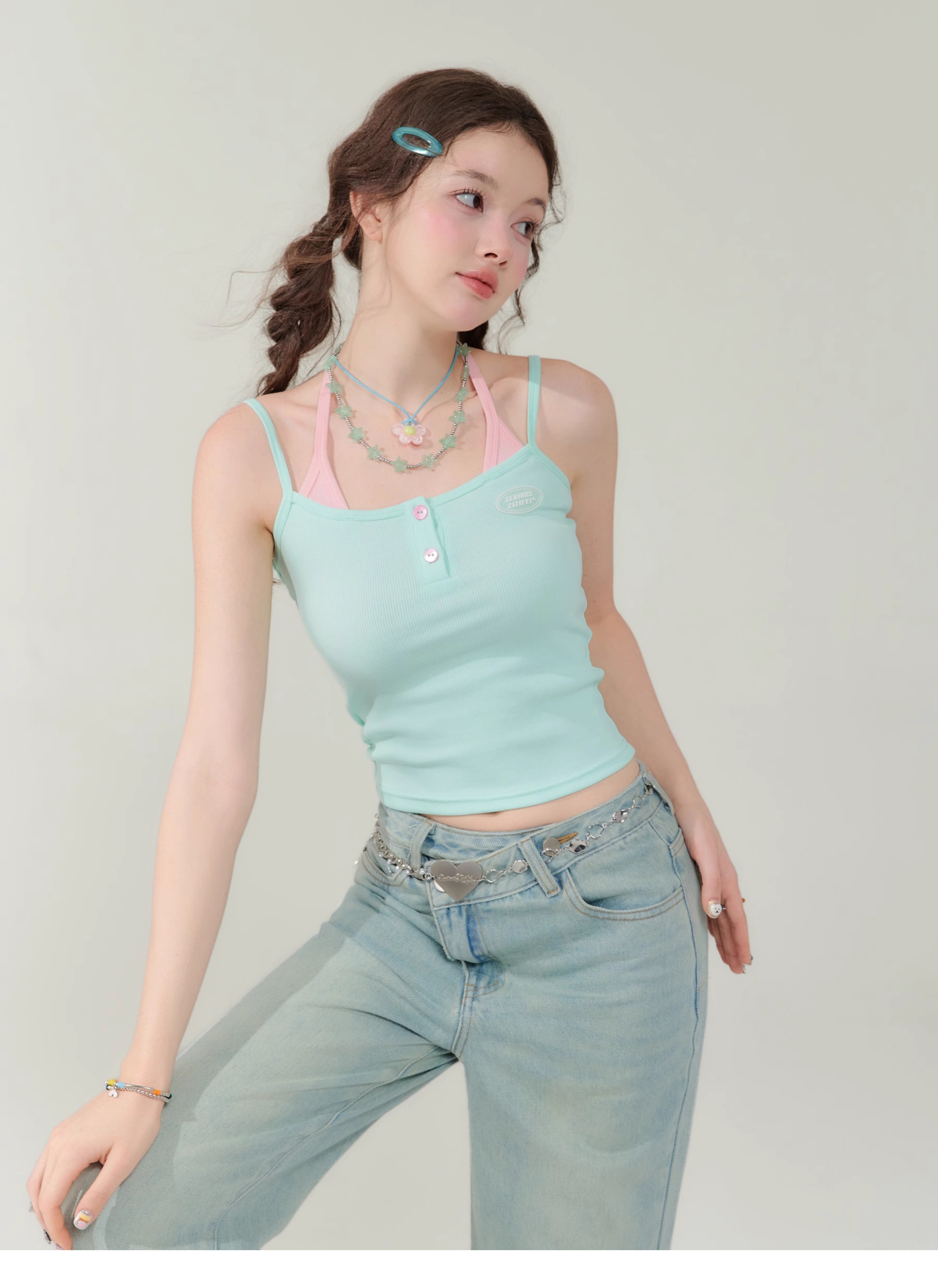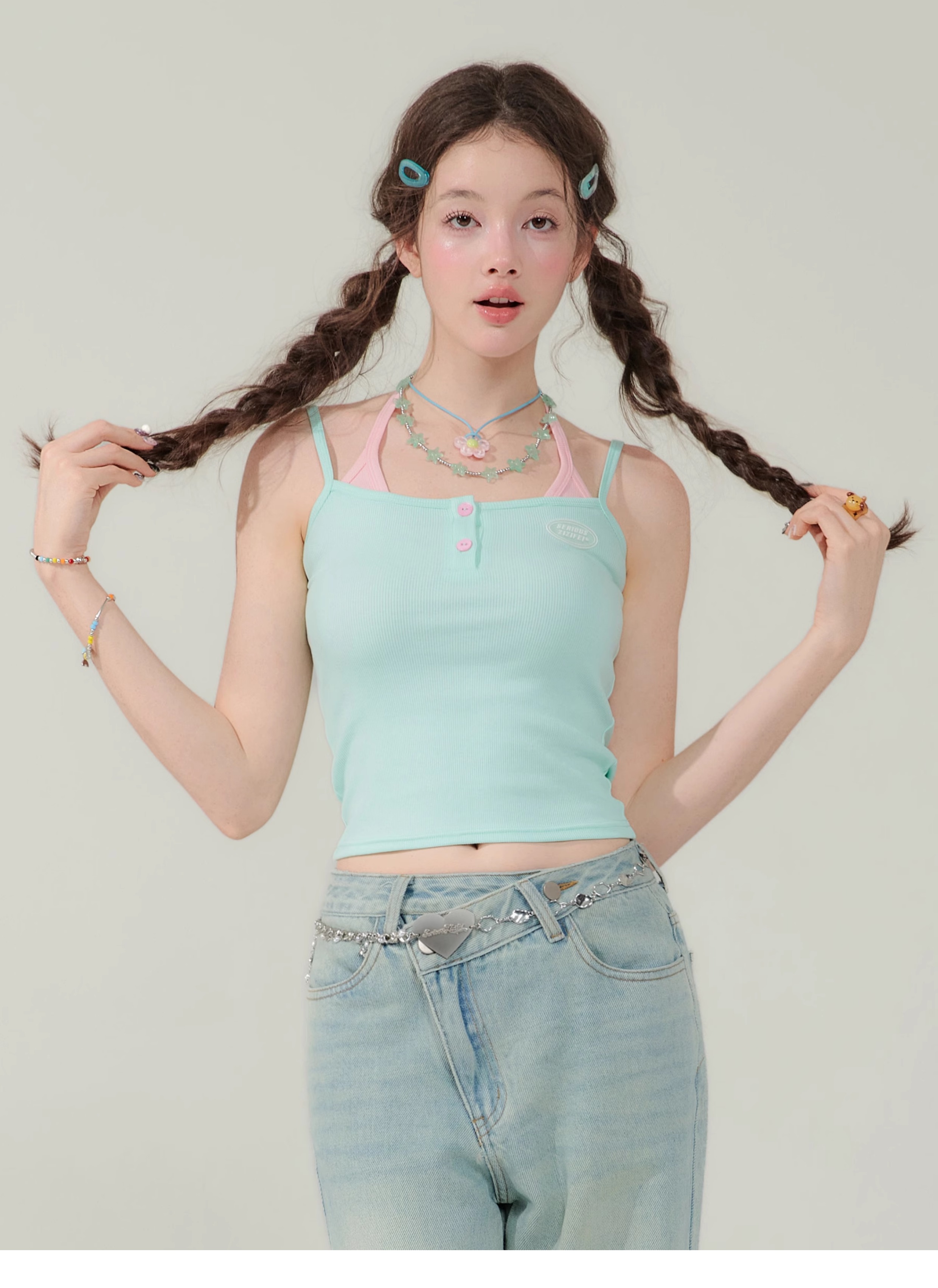 Spicy Girl Fake Two-Piece Top | Contrast Color Strap Sleeveless Retro Design