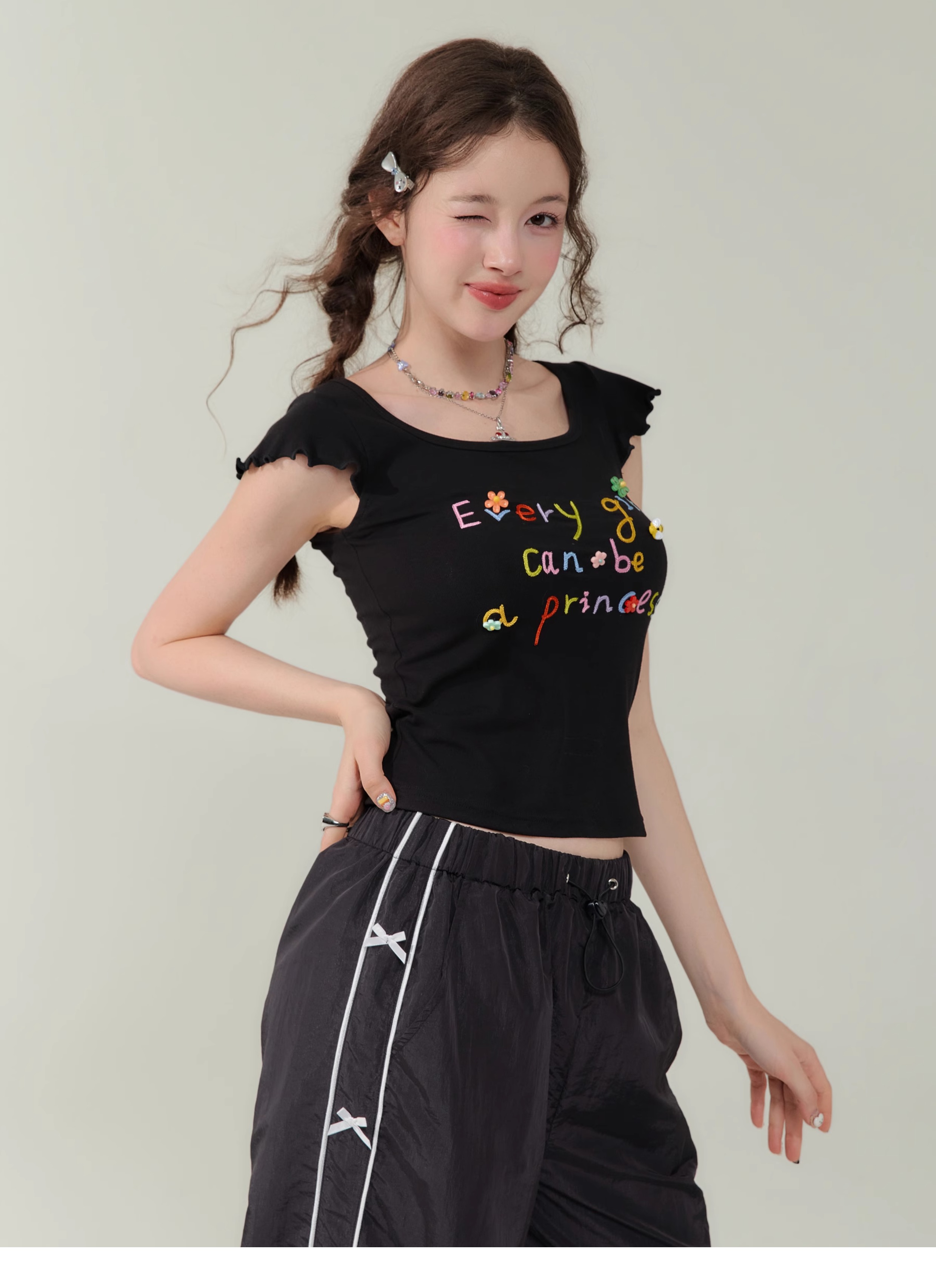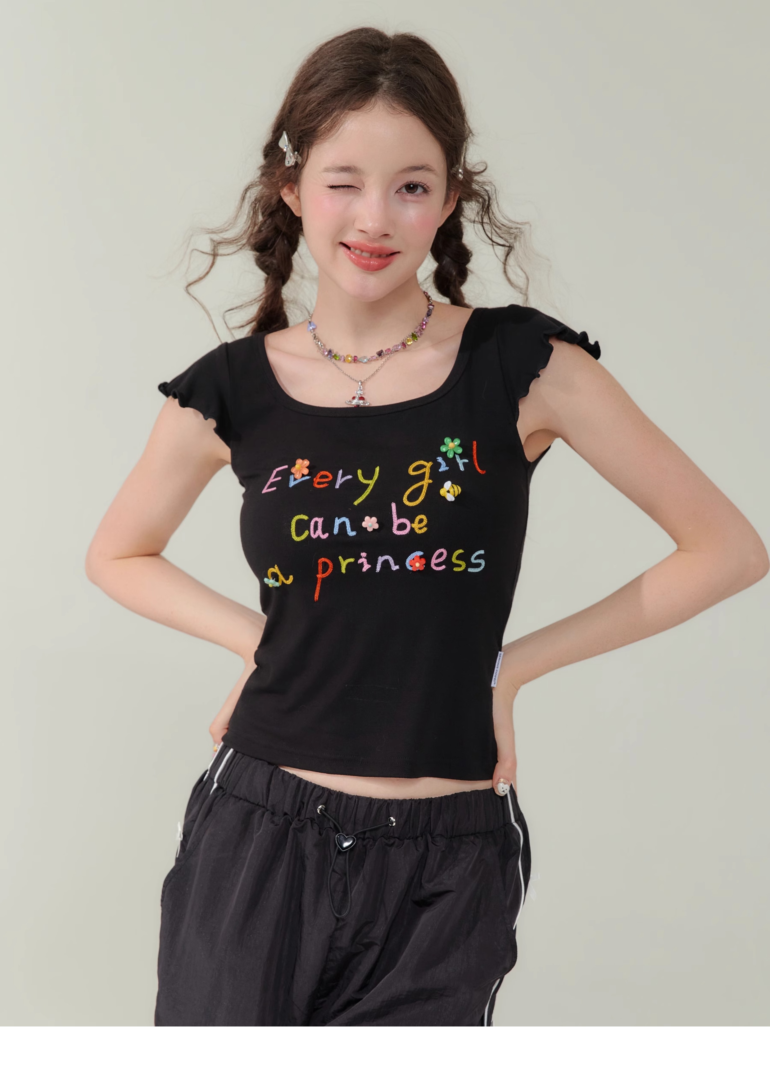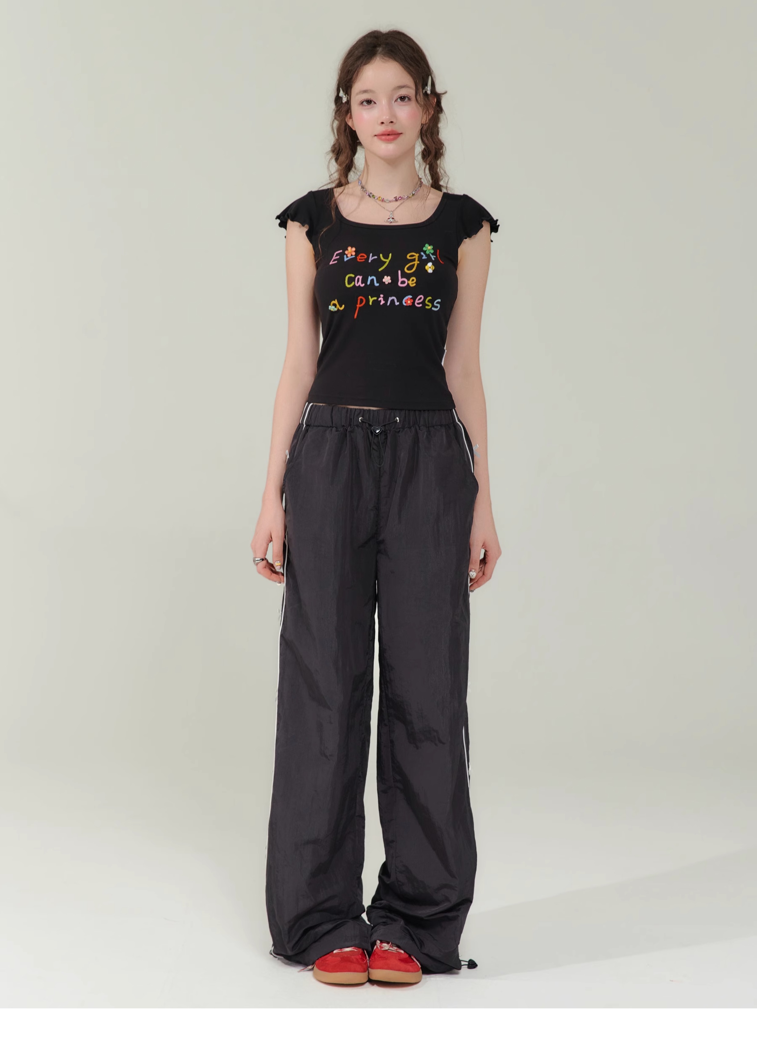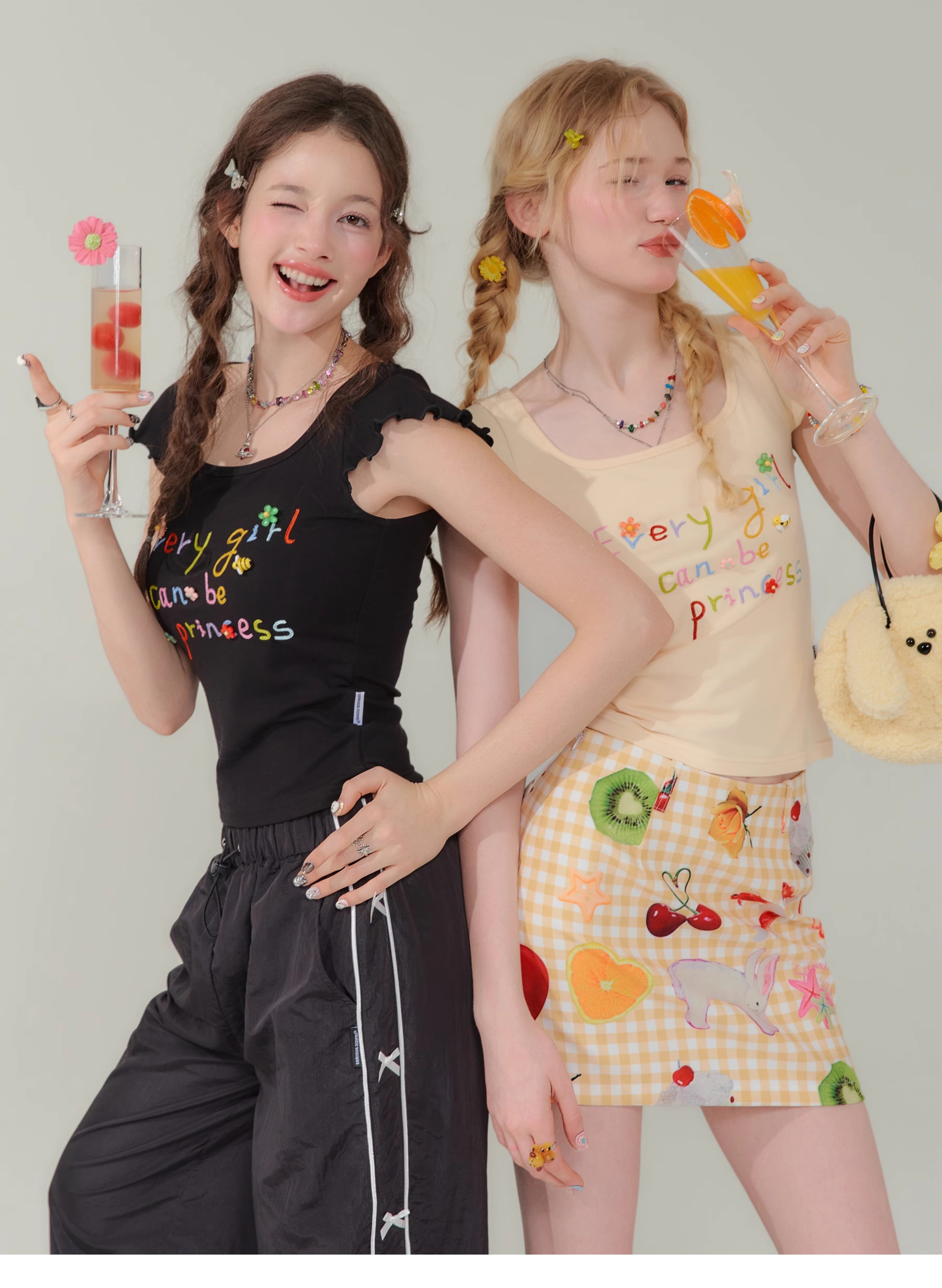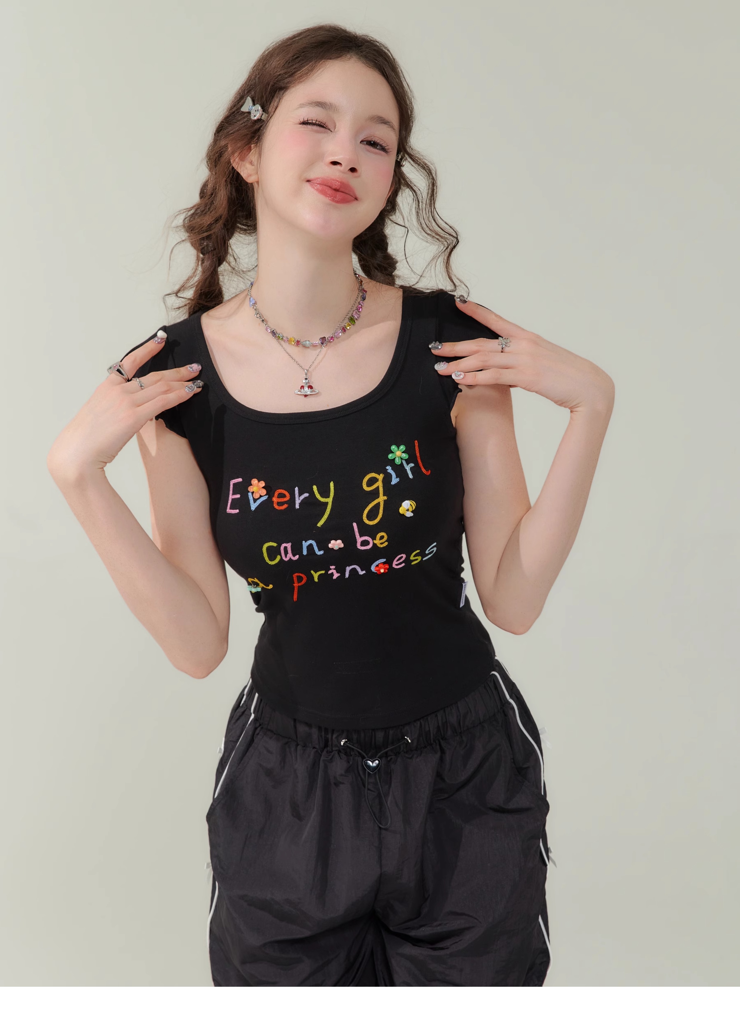 Square Neck Slim Fit Embroidered Tank Top | Retro Flying Sleeve Design