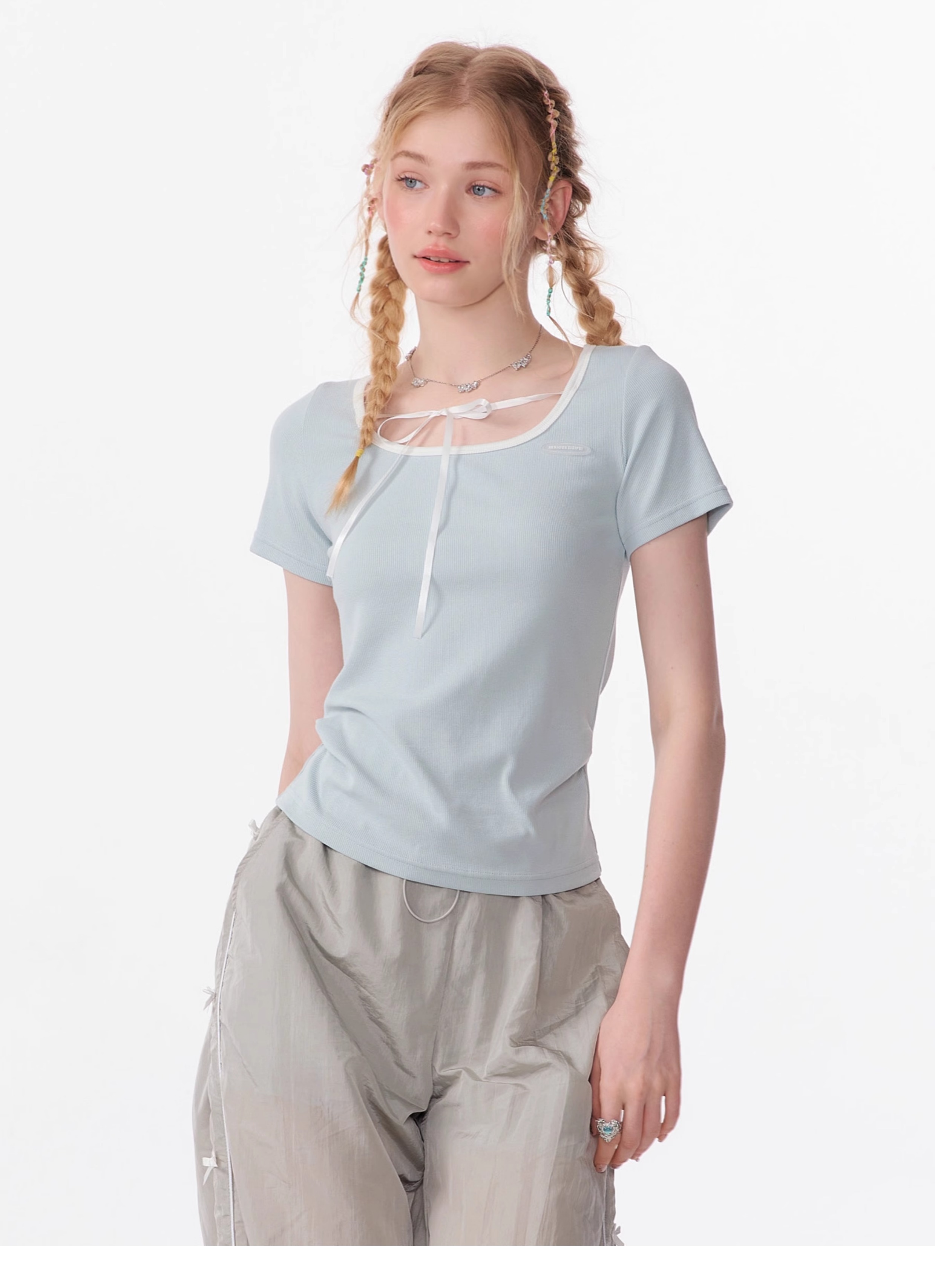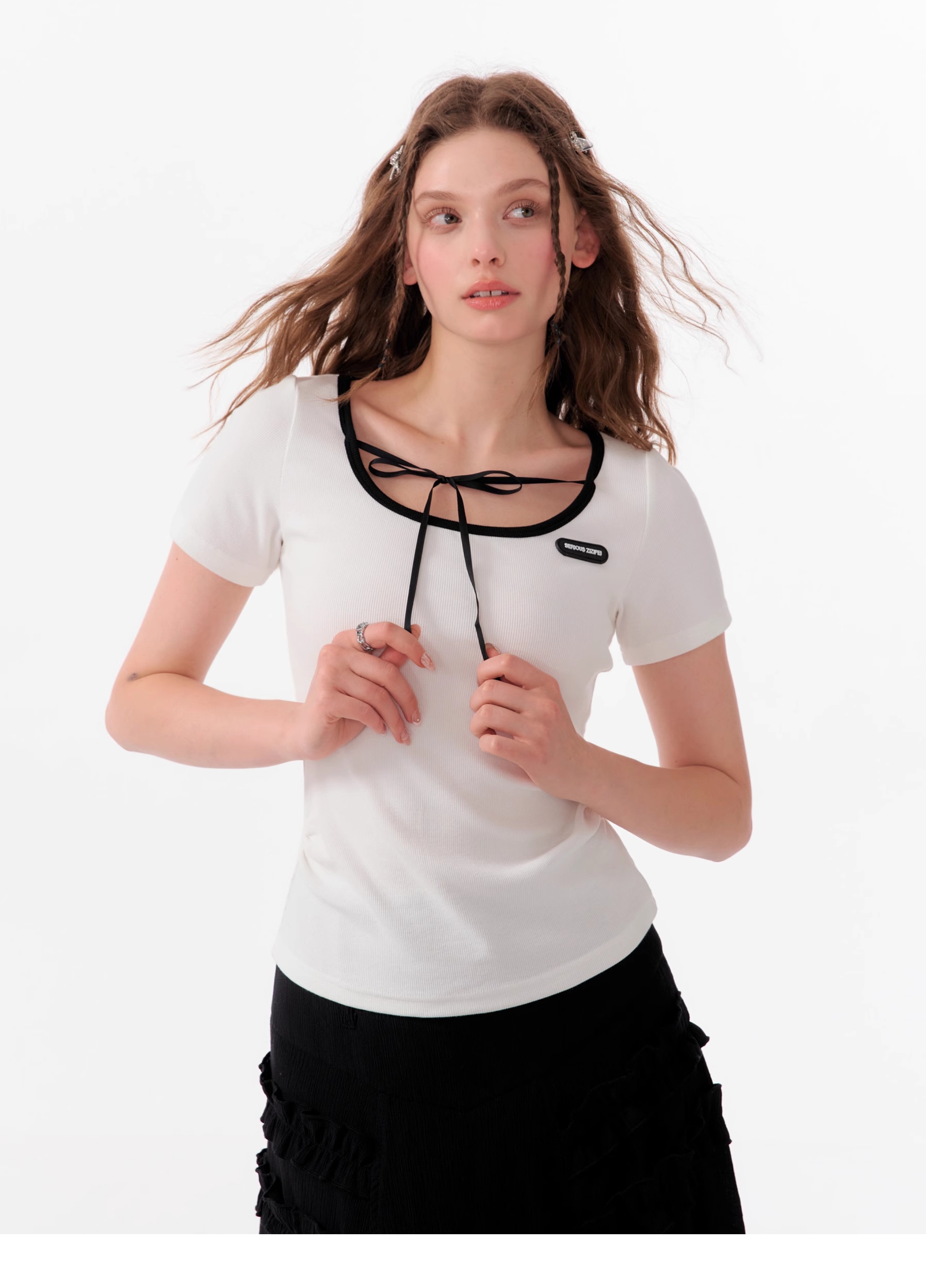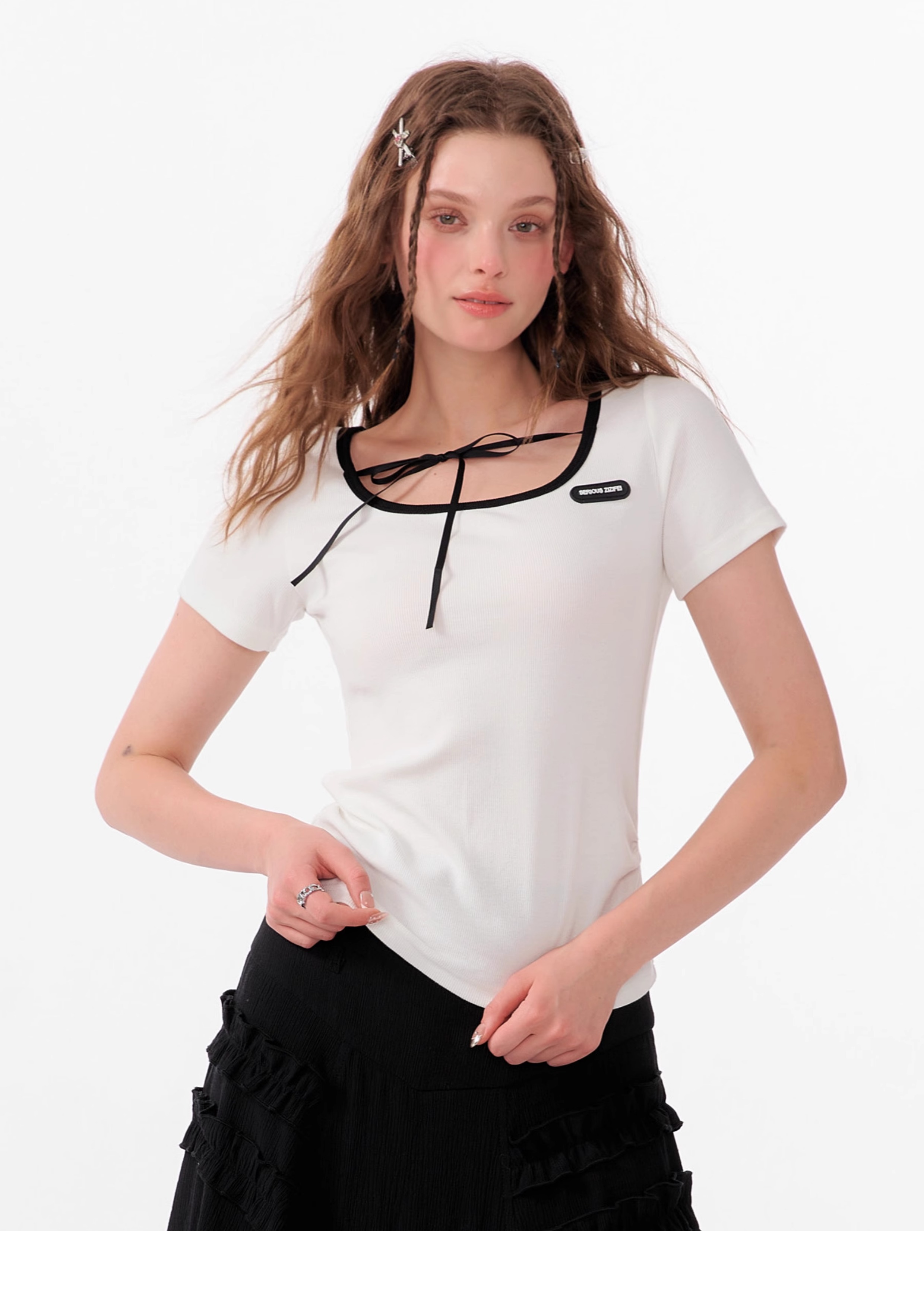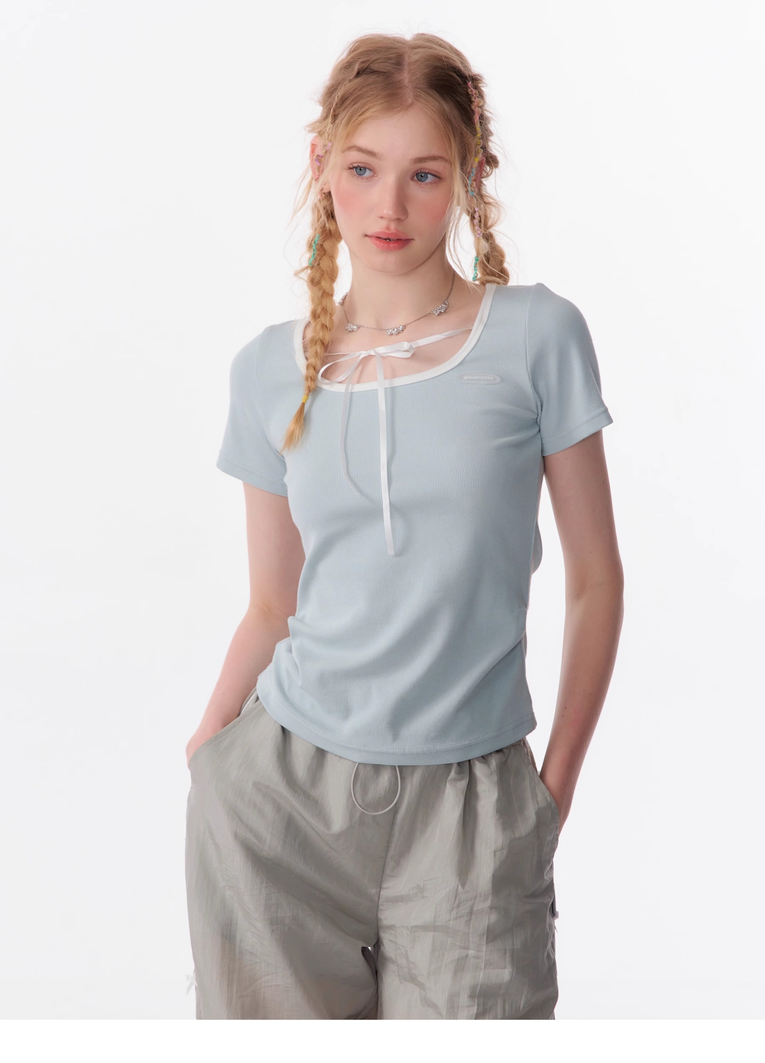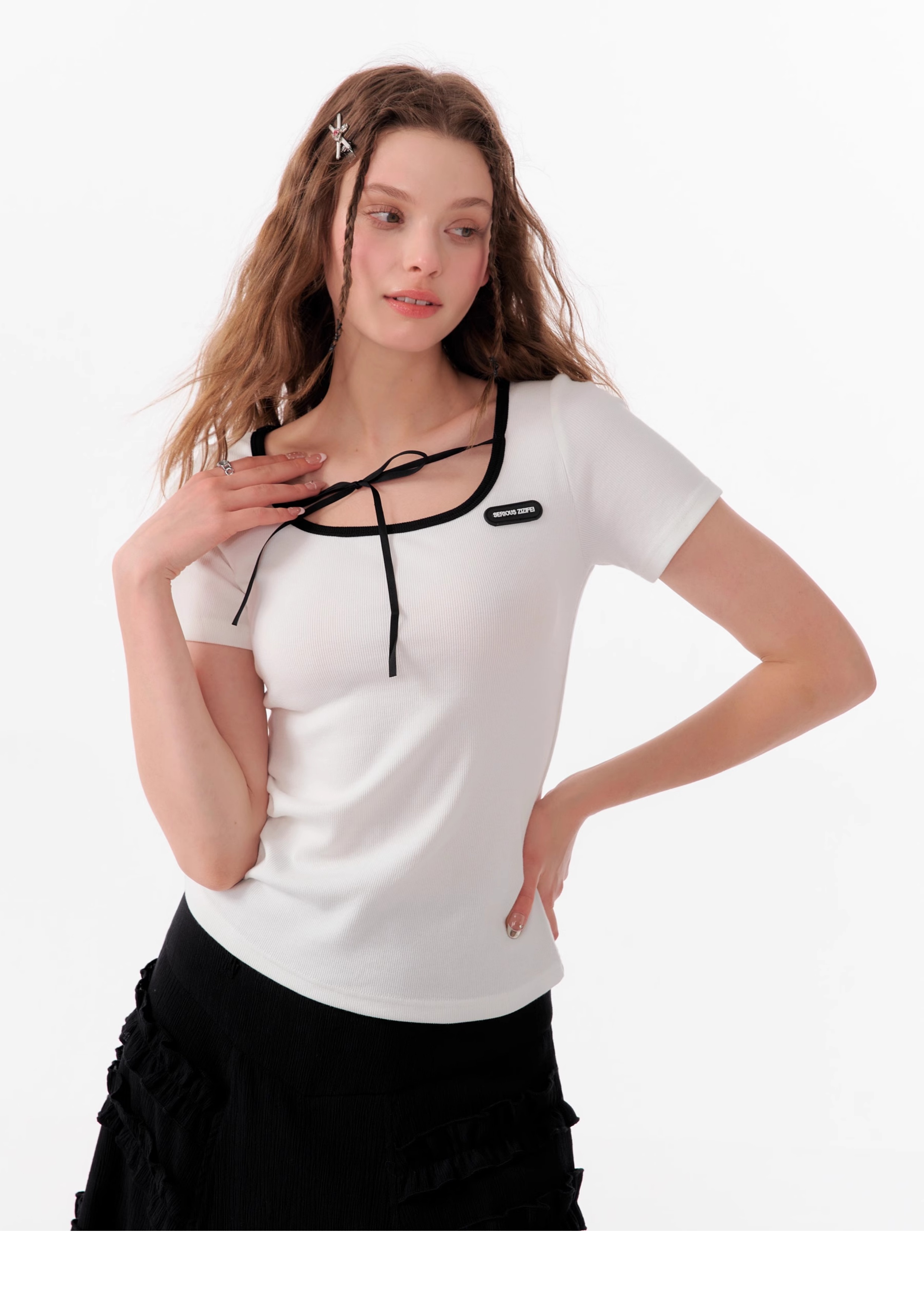 Bow U-neck Slim Fit T-shirt | Contrast Square Neck Design for Summer