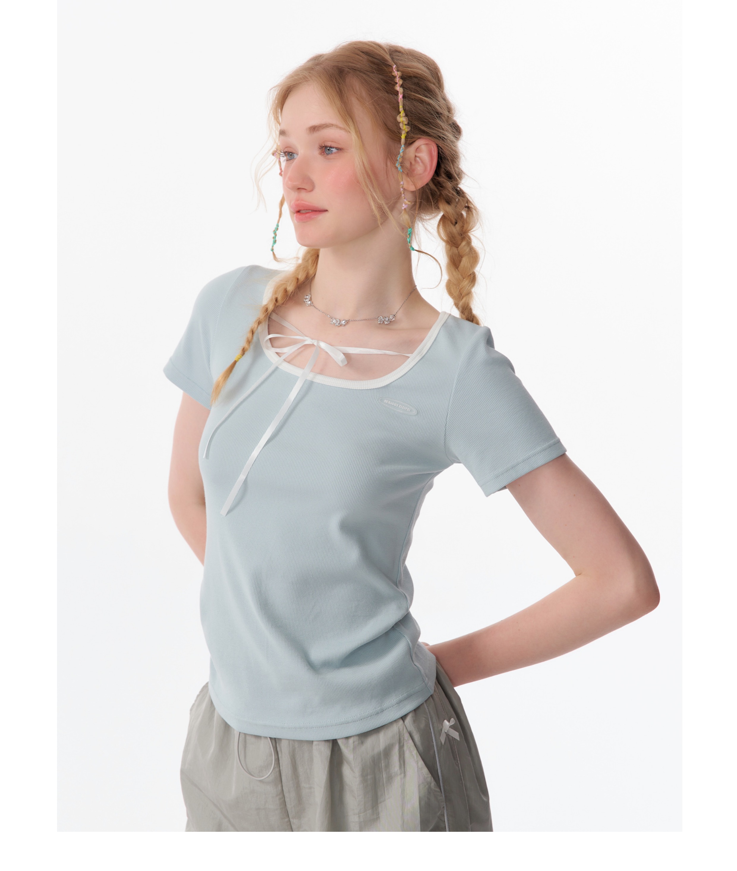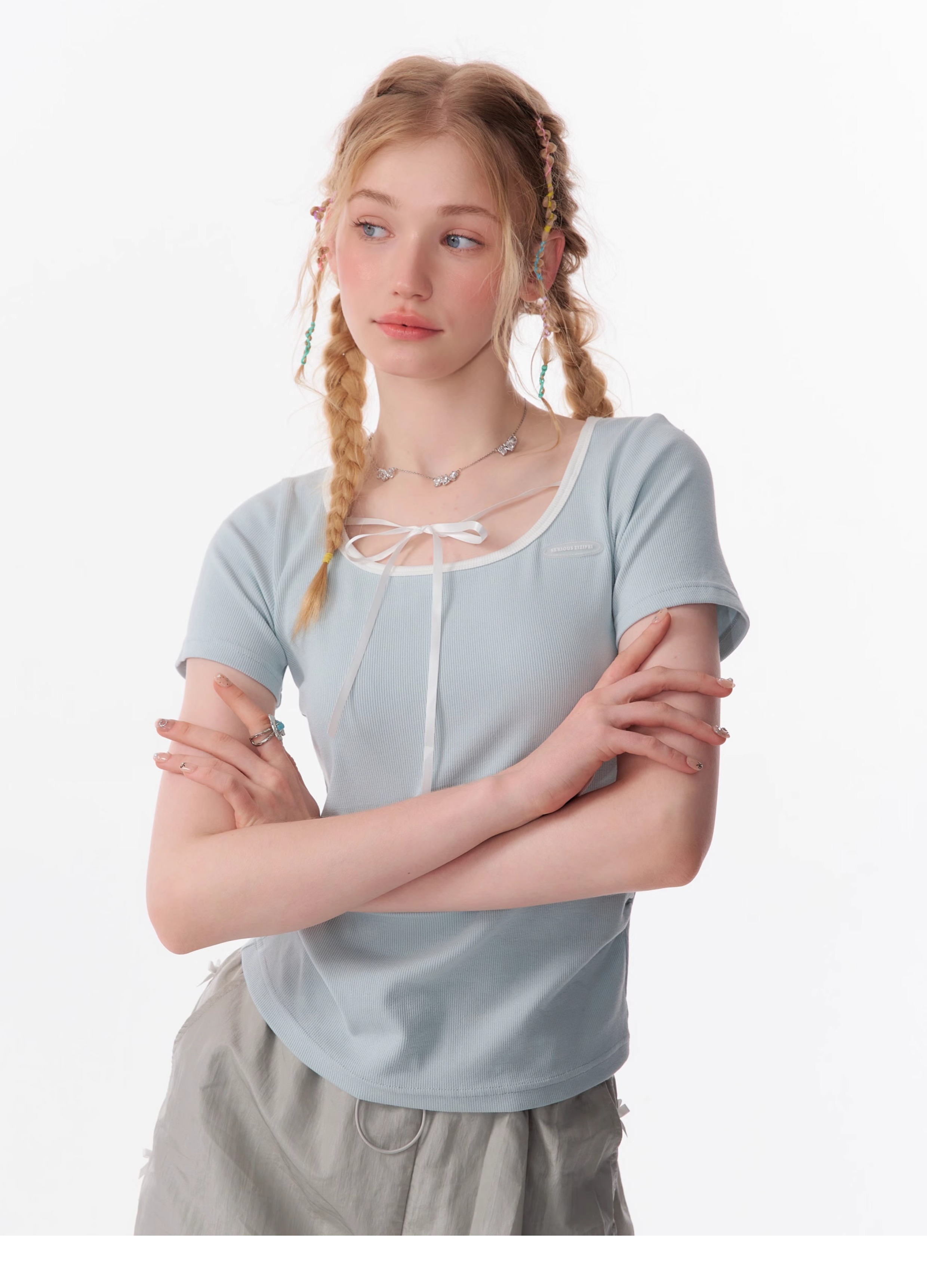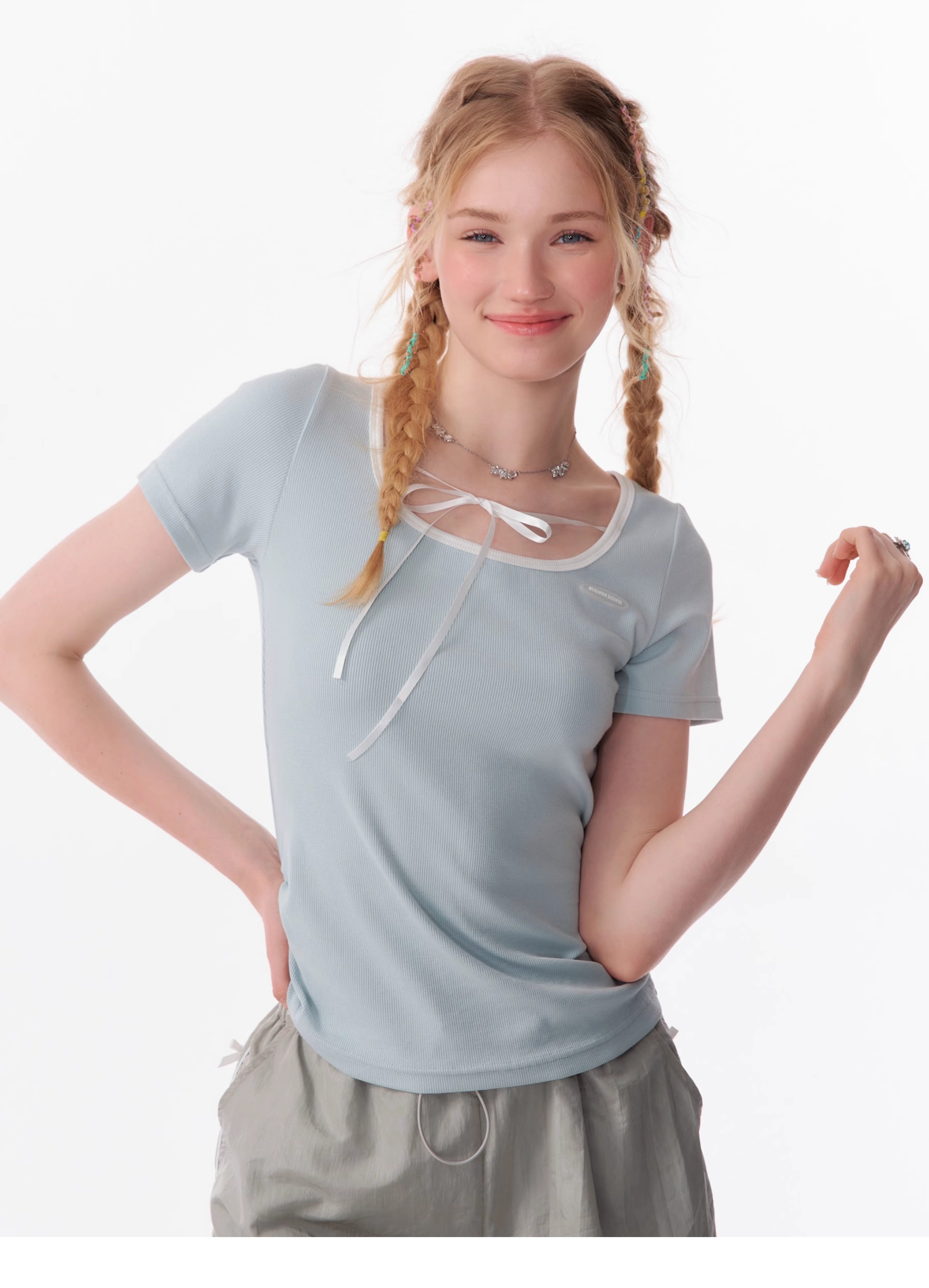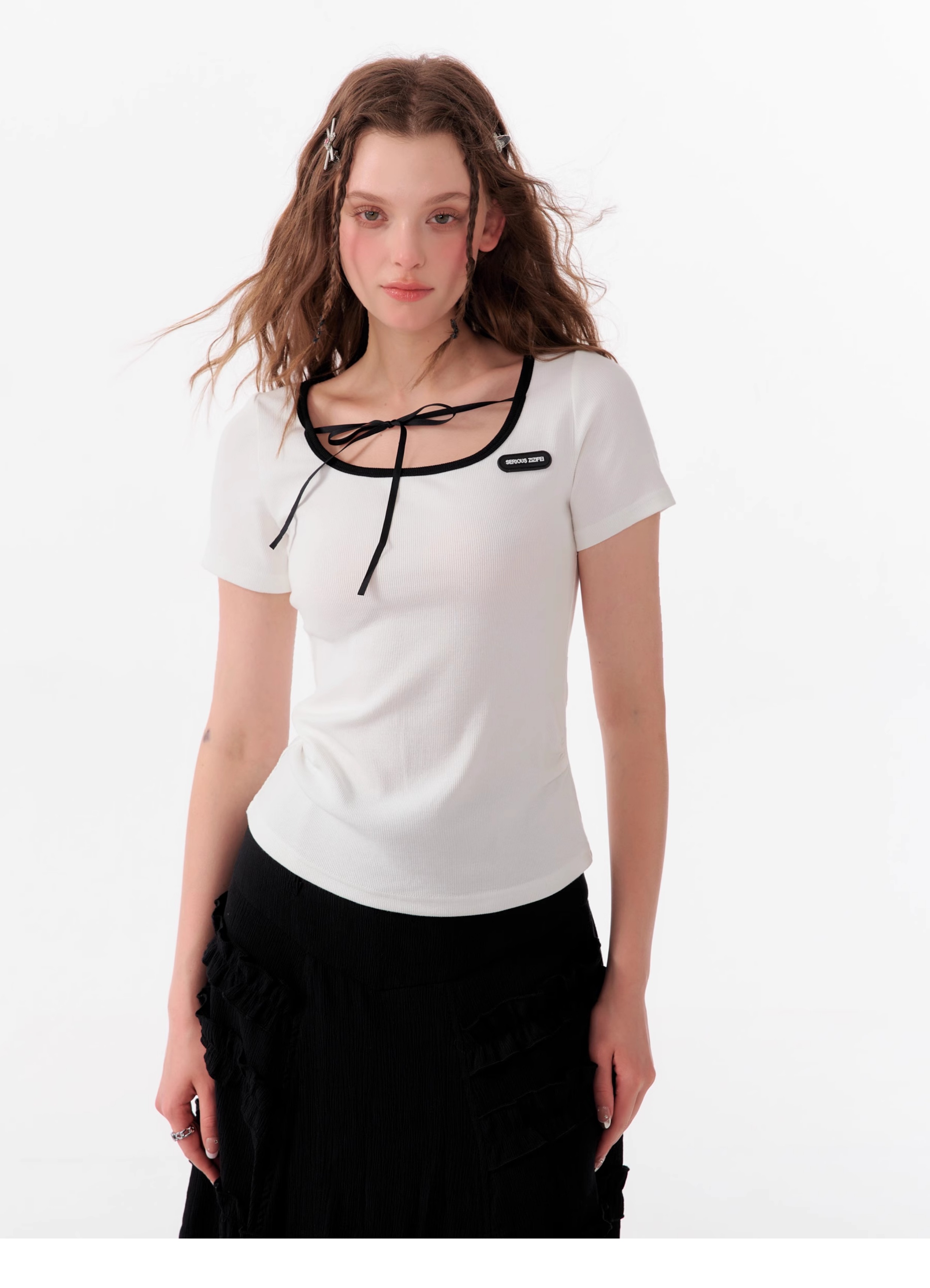 Bow U-neck Slim Fit T-shirt | Contrast Square Neck Design for Summer