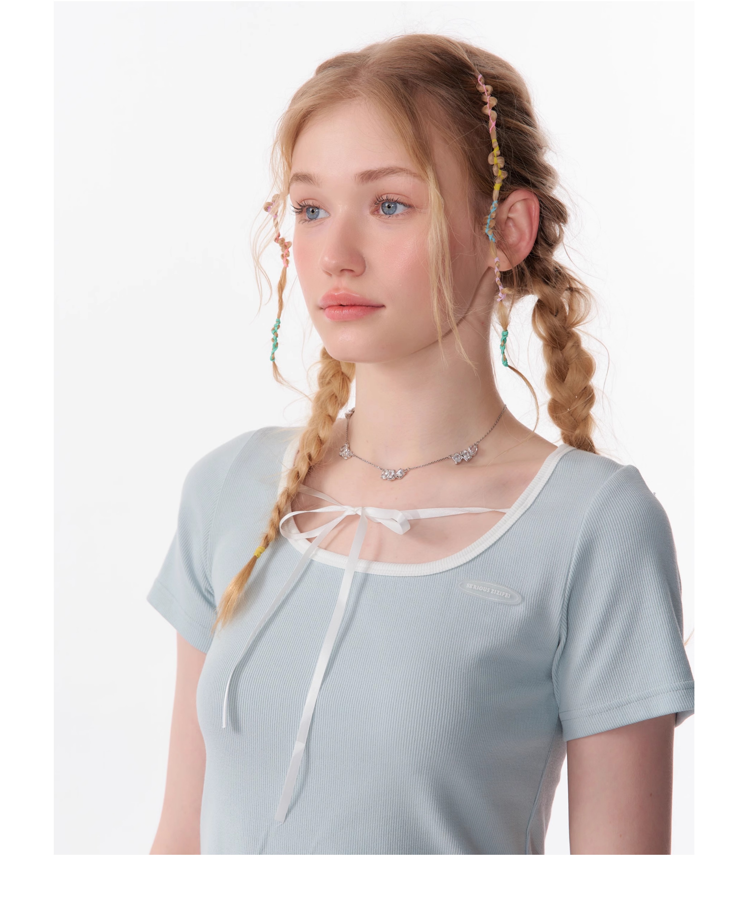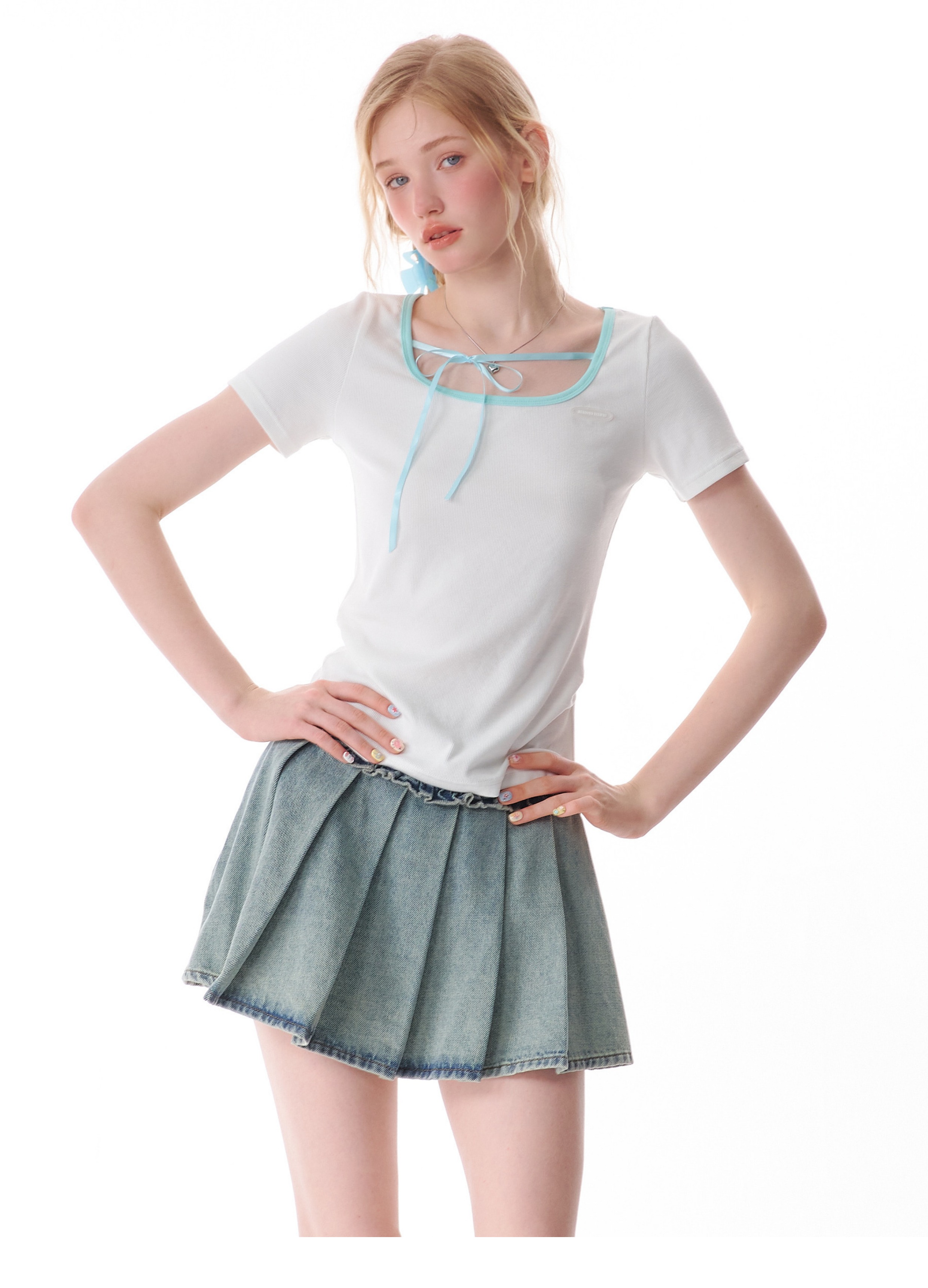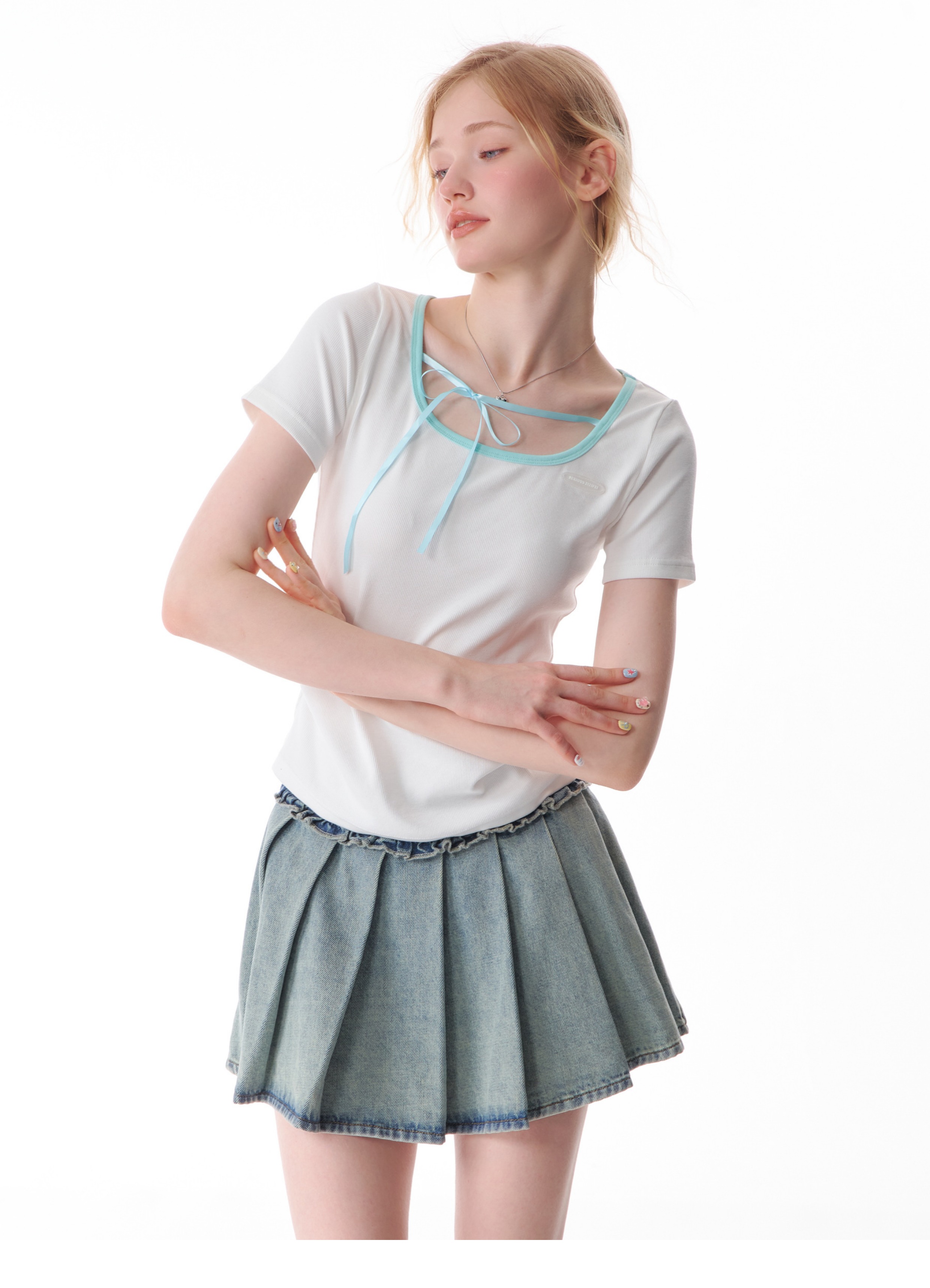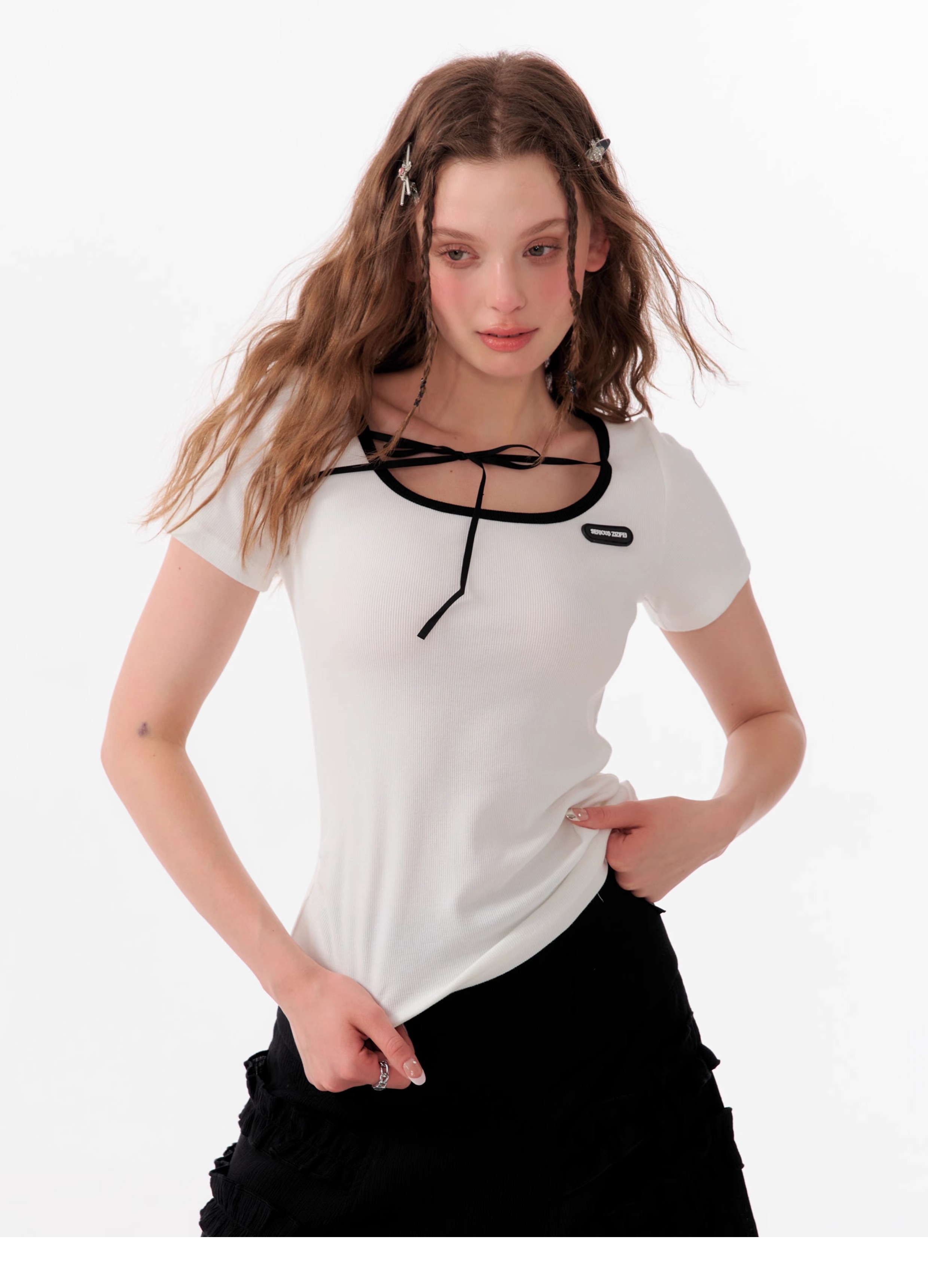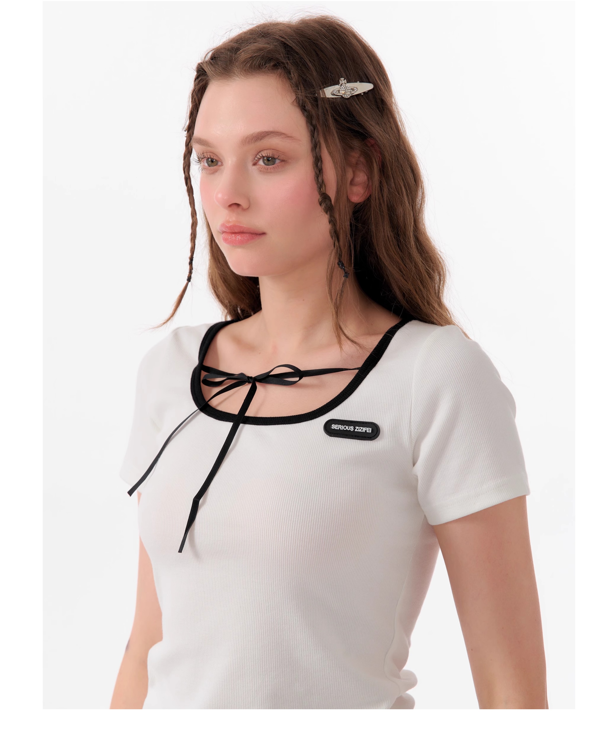 Bow U-neck Slim Fit T-shirt | Contrast Square Neck Design for Summer