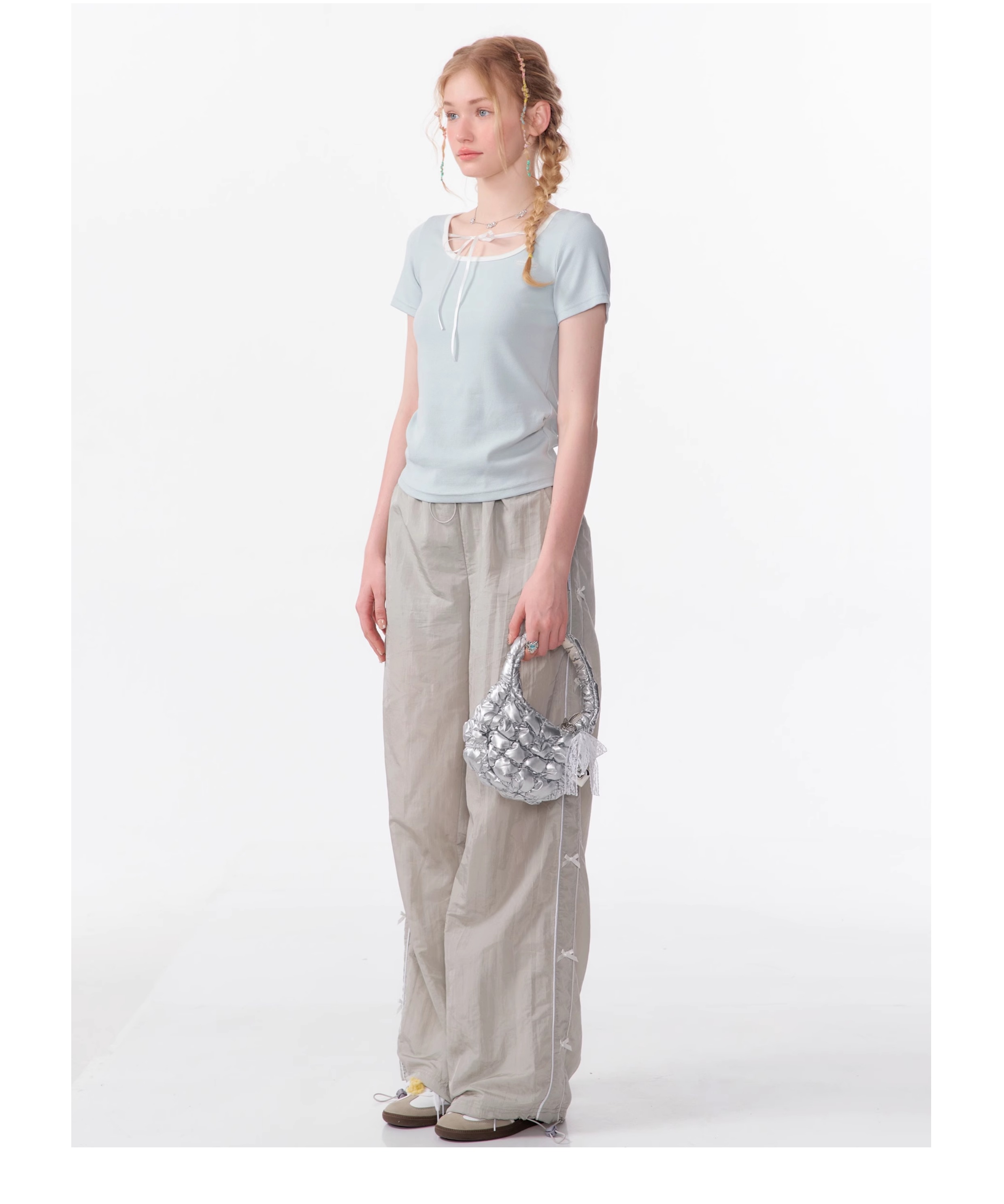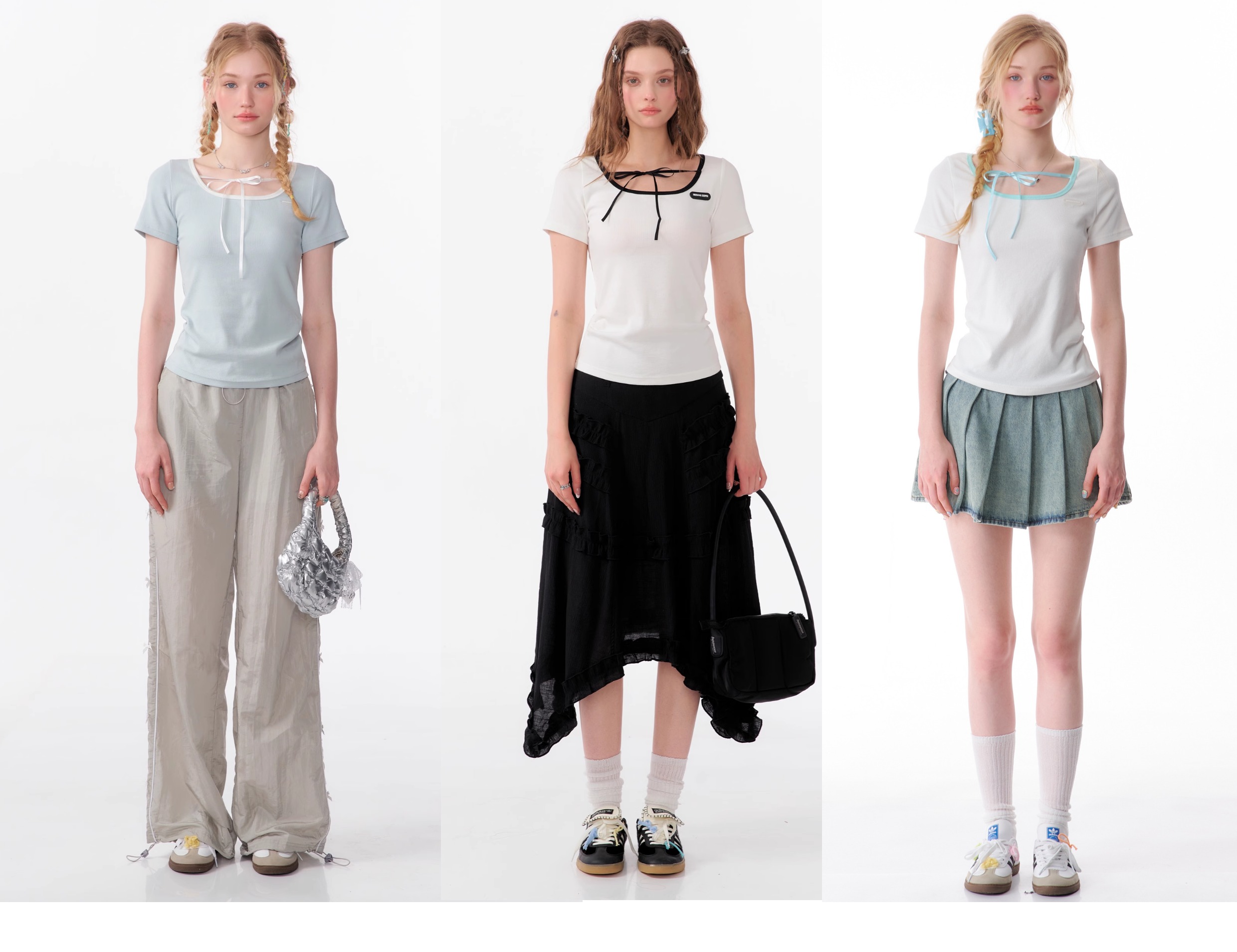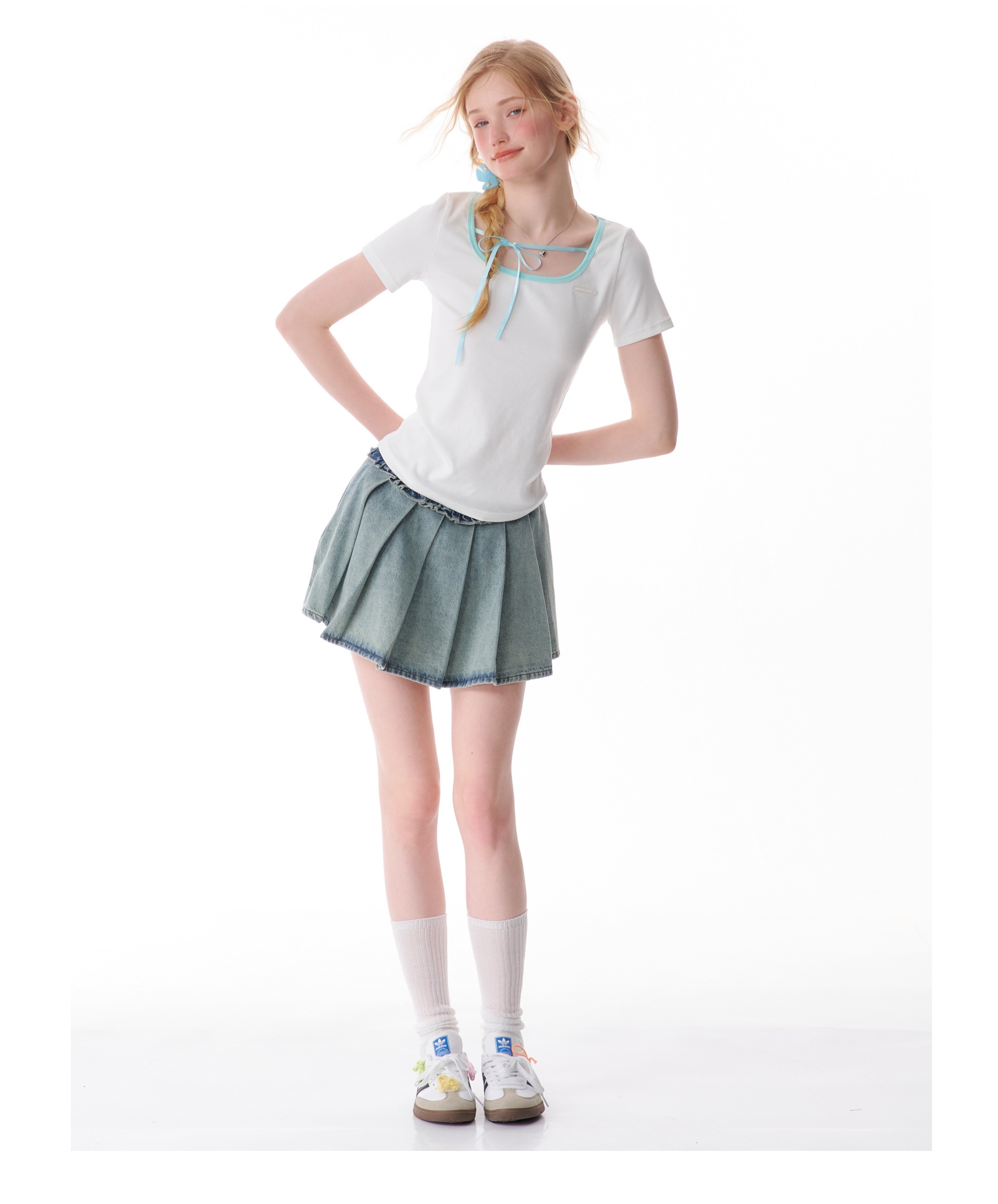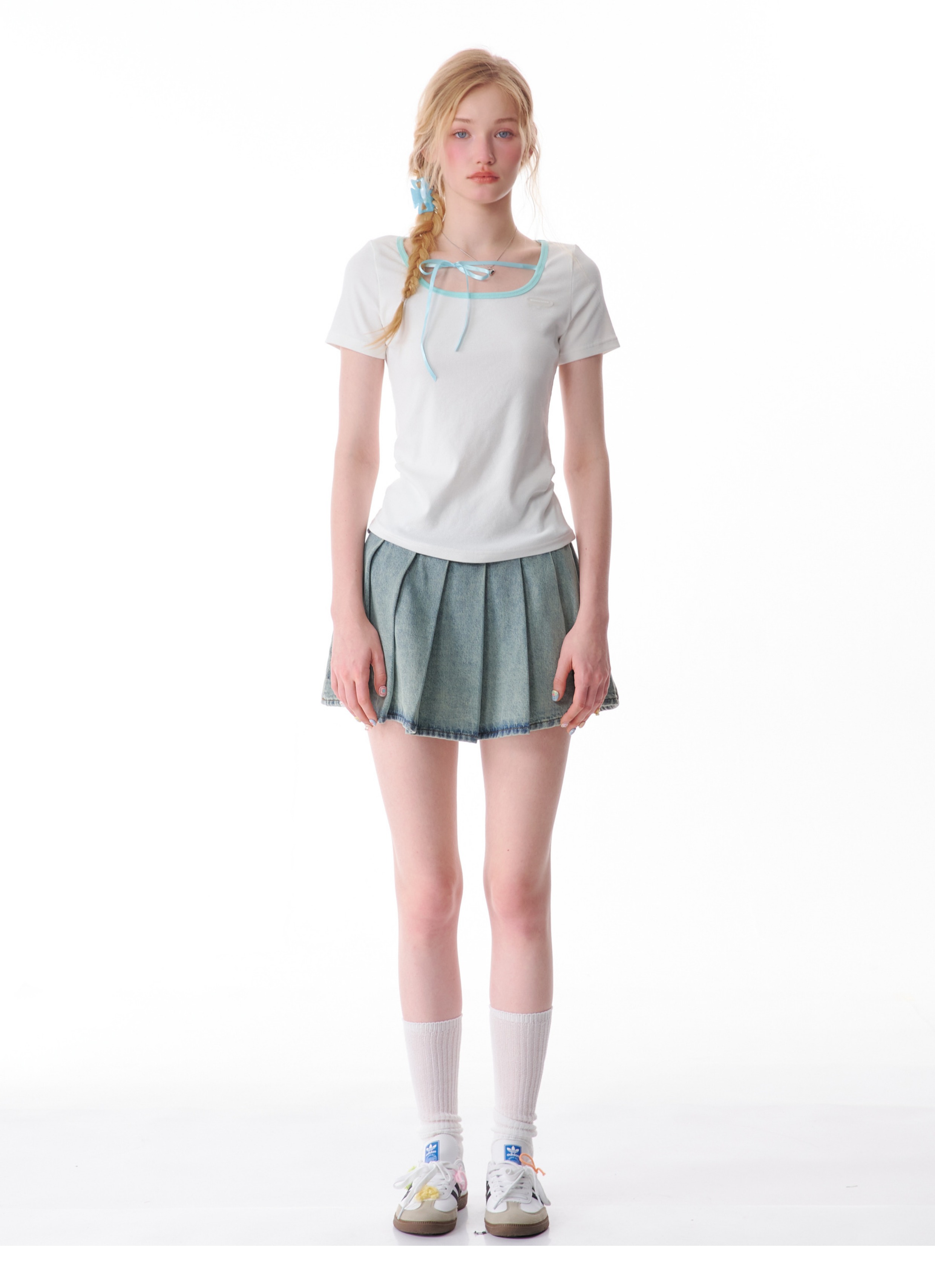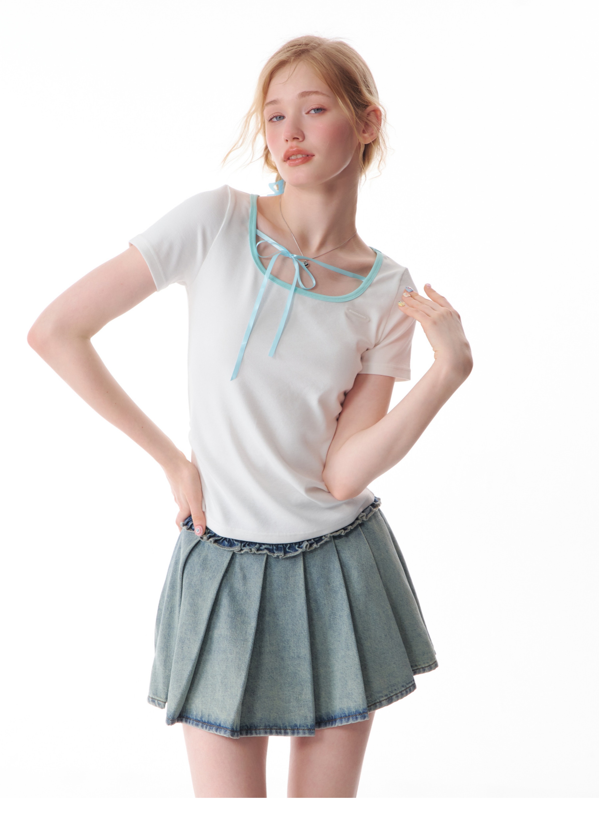 Bow U-neck Slim Fit T-shirt | Contrast Square Neck Design for Summer