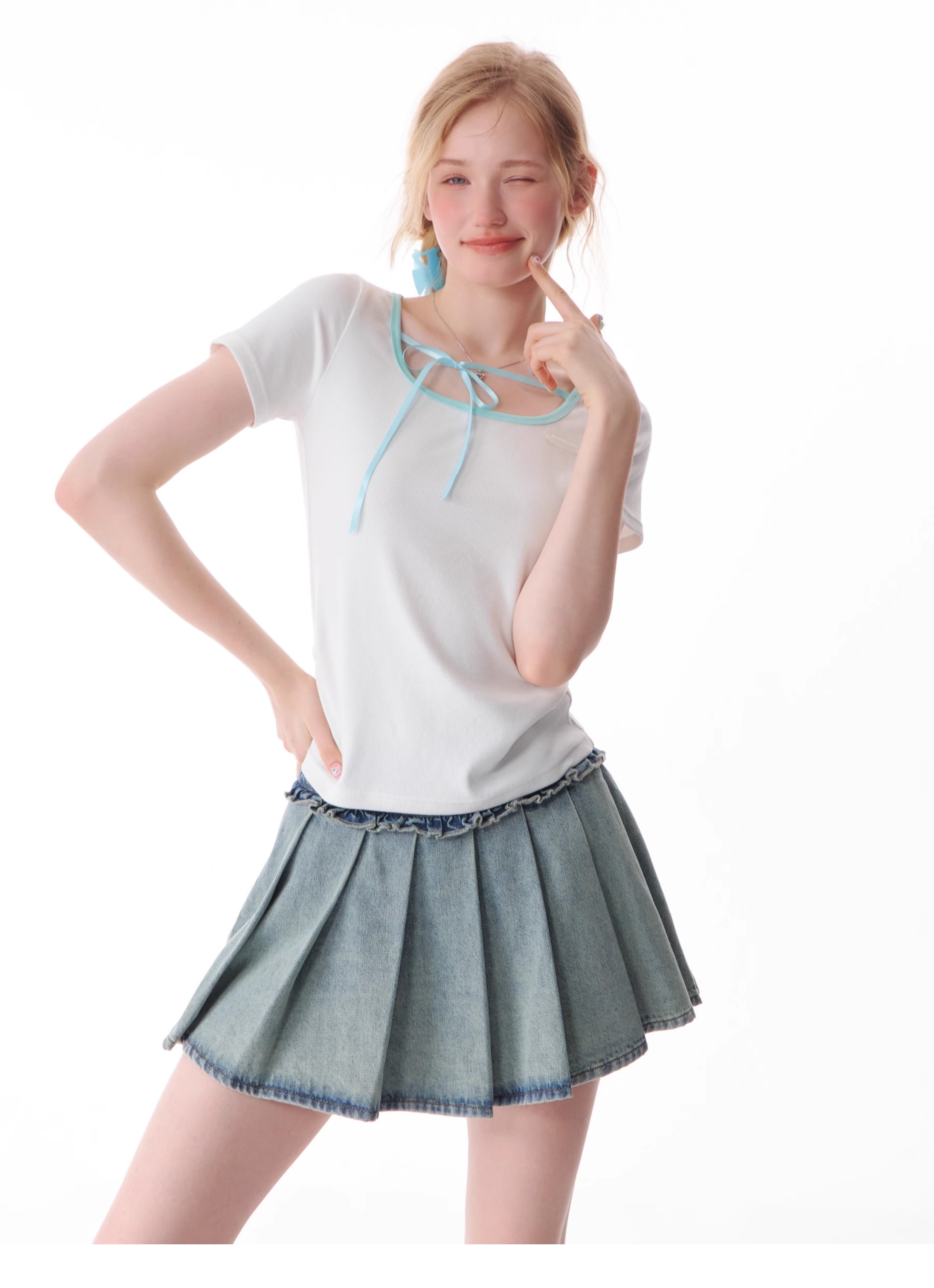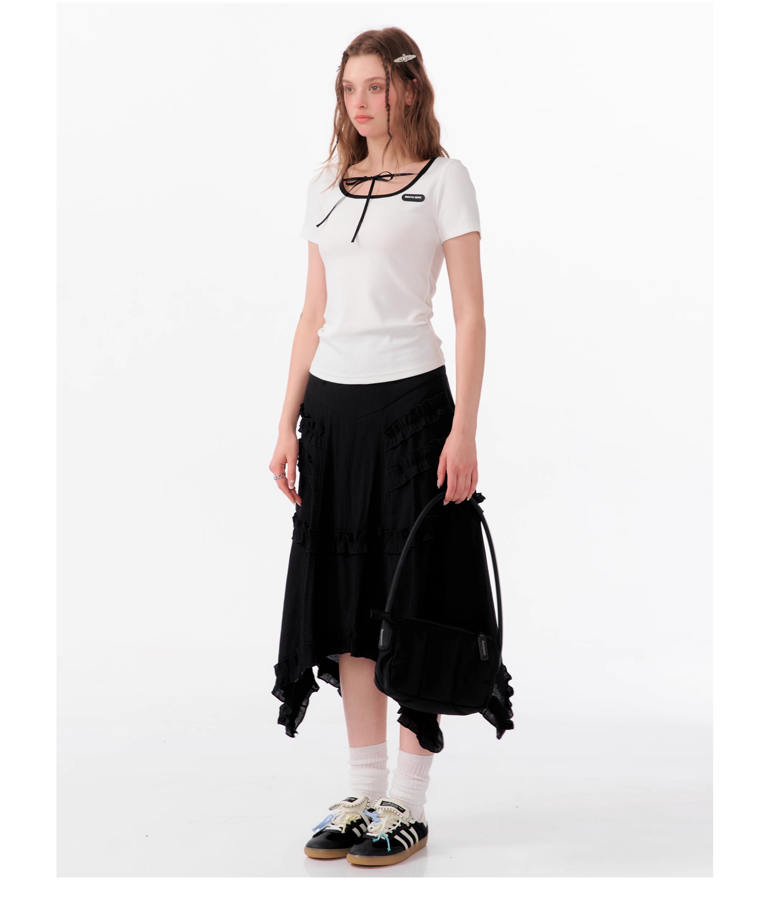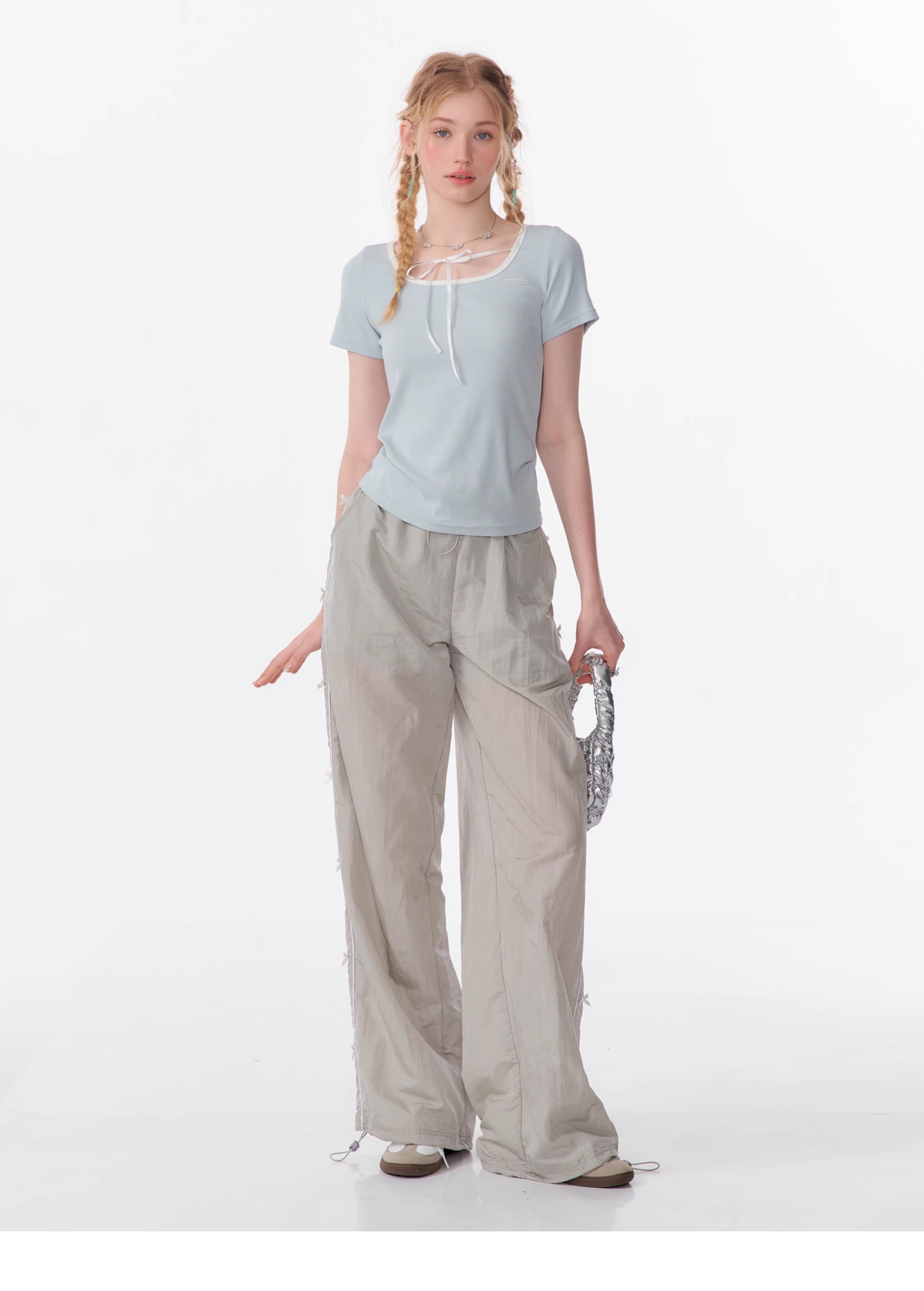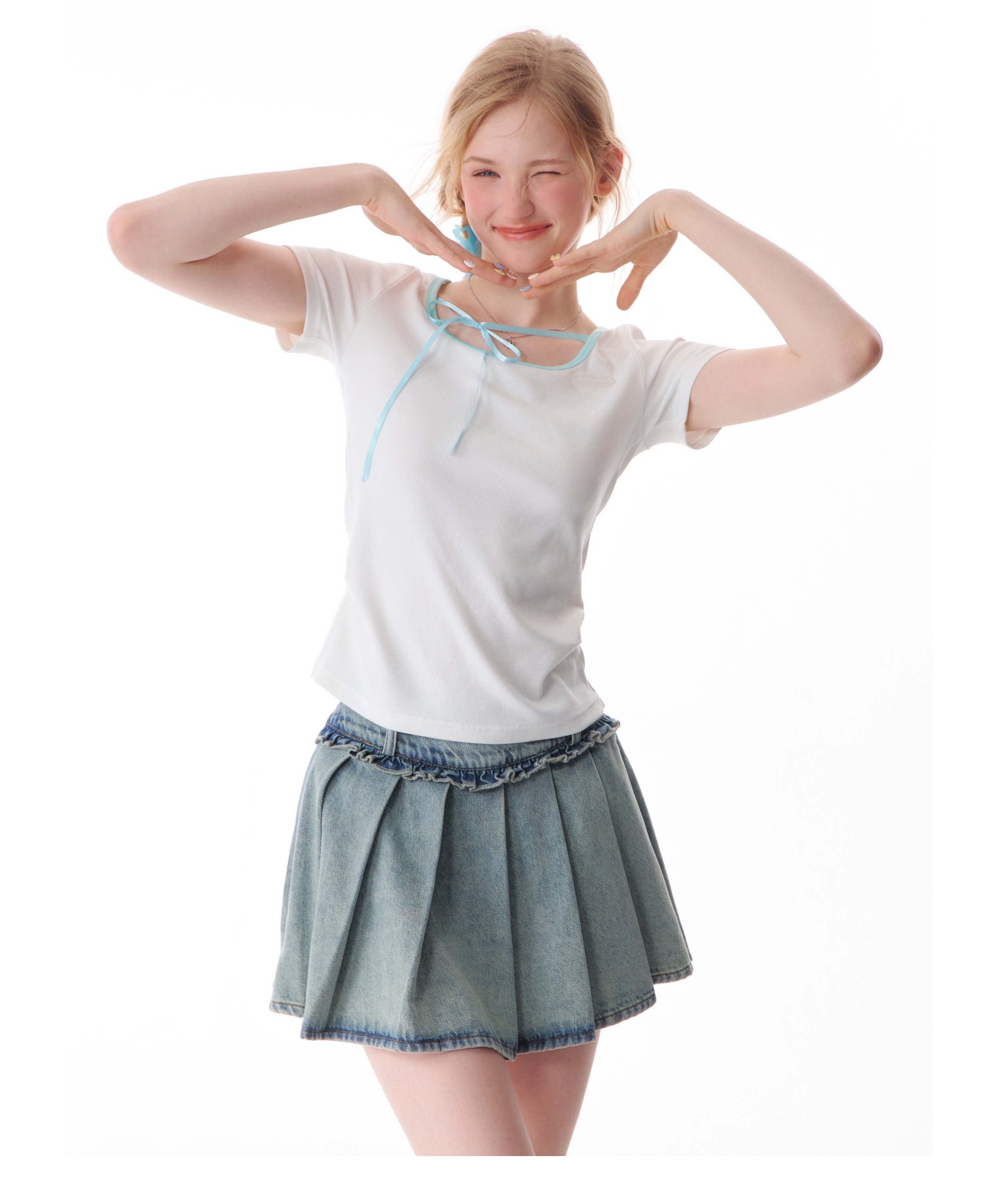 Bow U-neck Slim Fit T-shirt | Contrast Square Neck Design for Summer