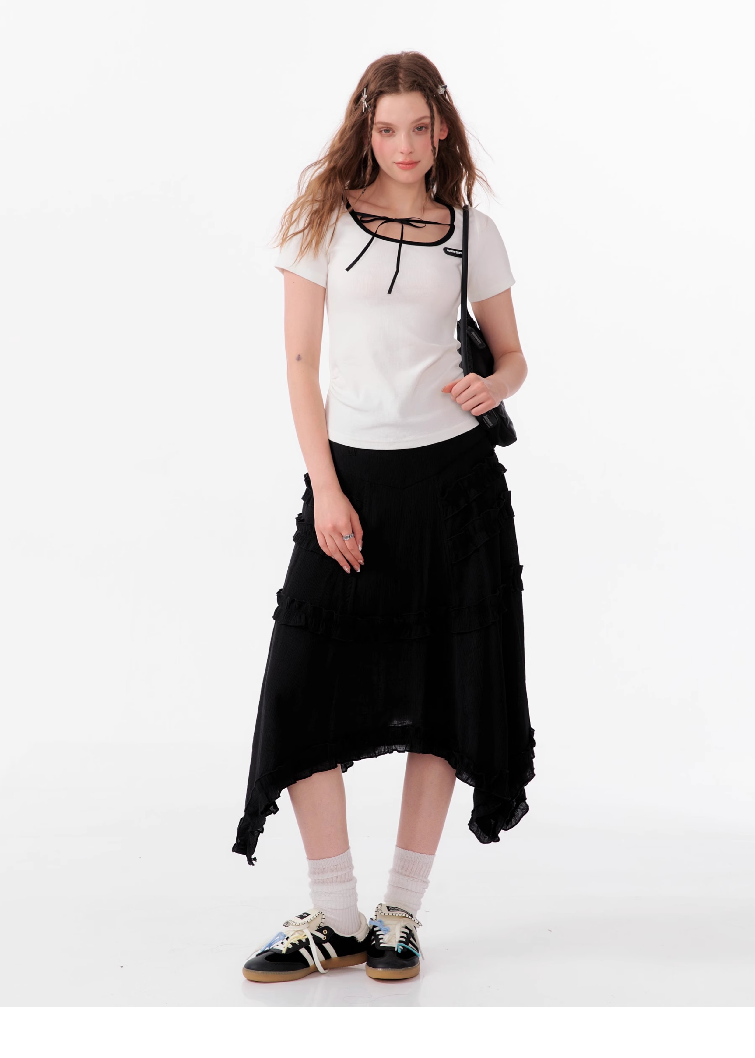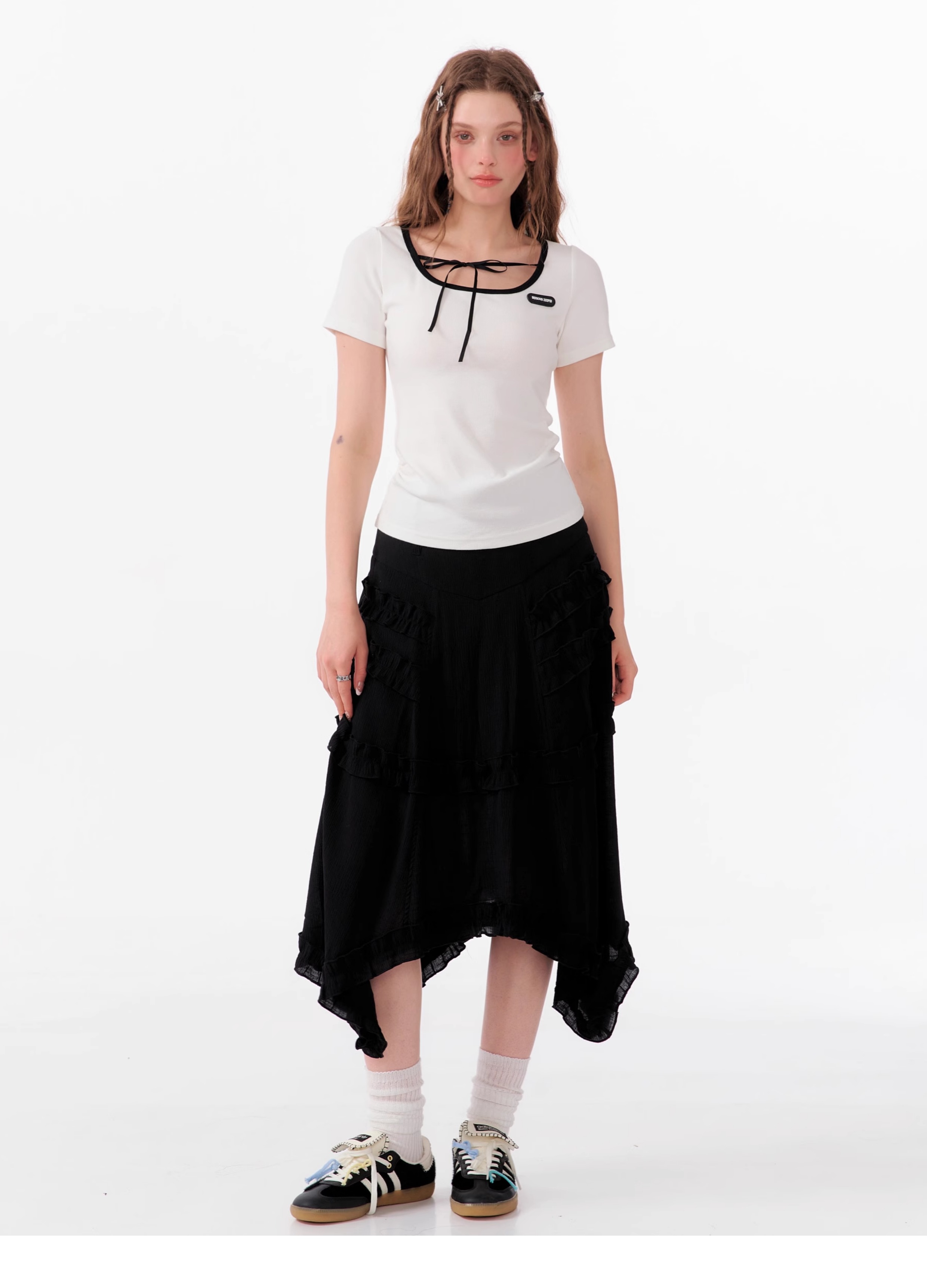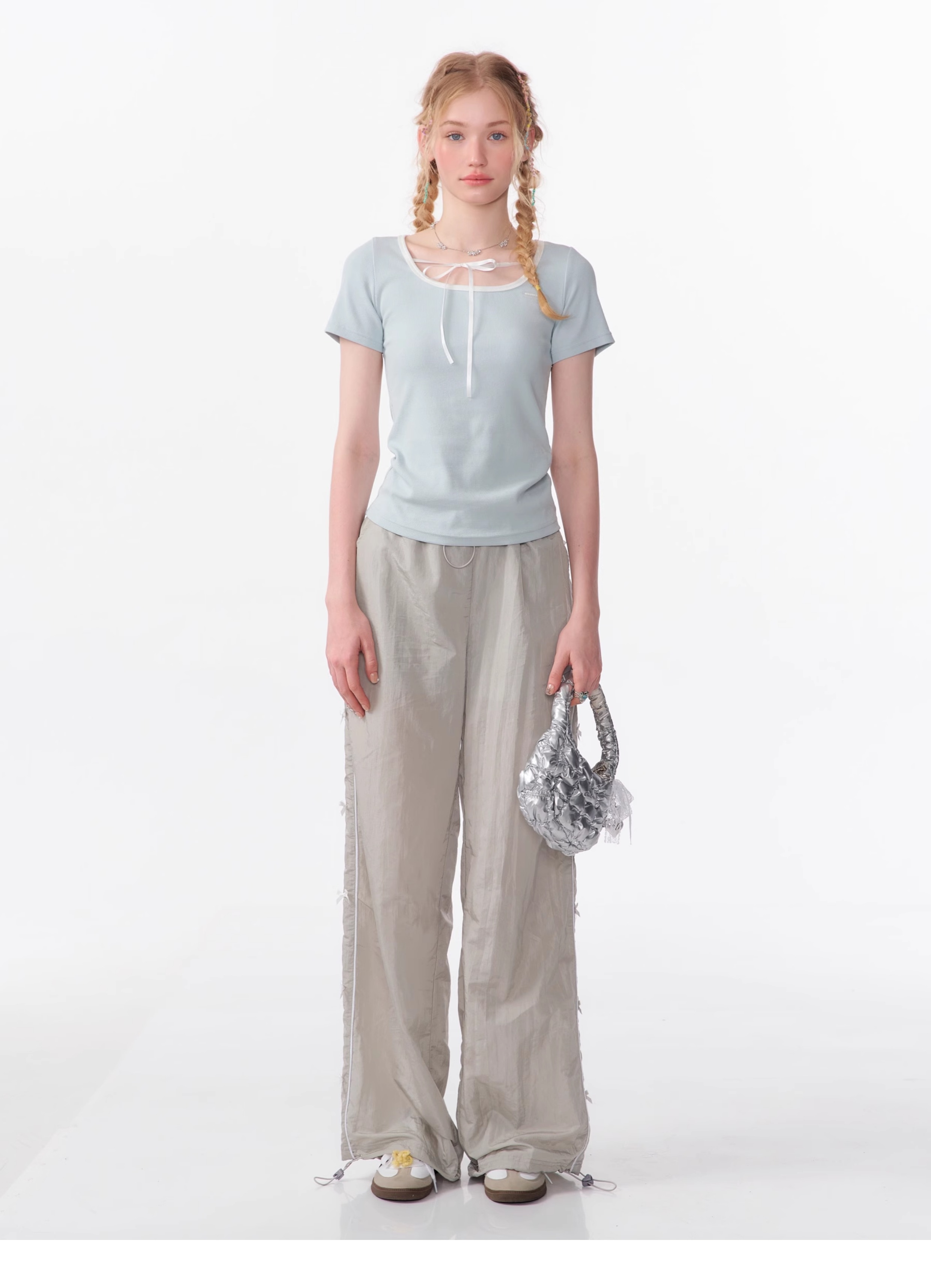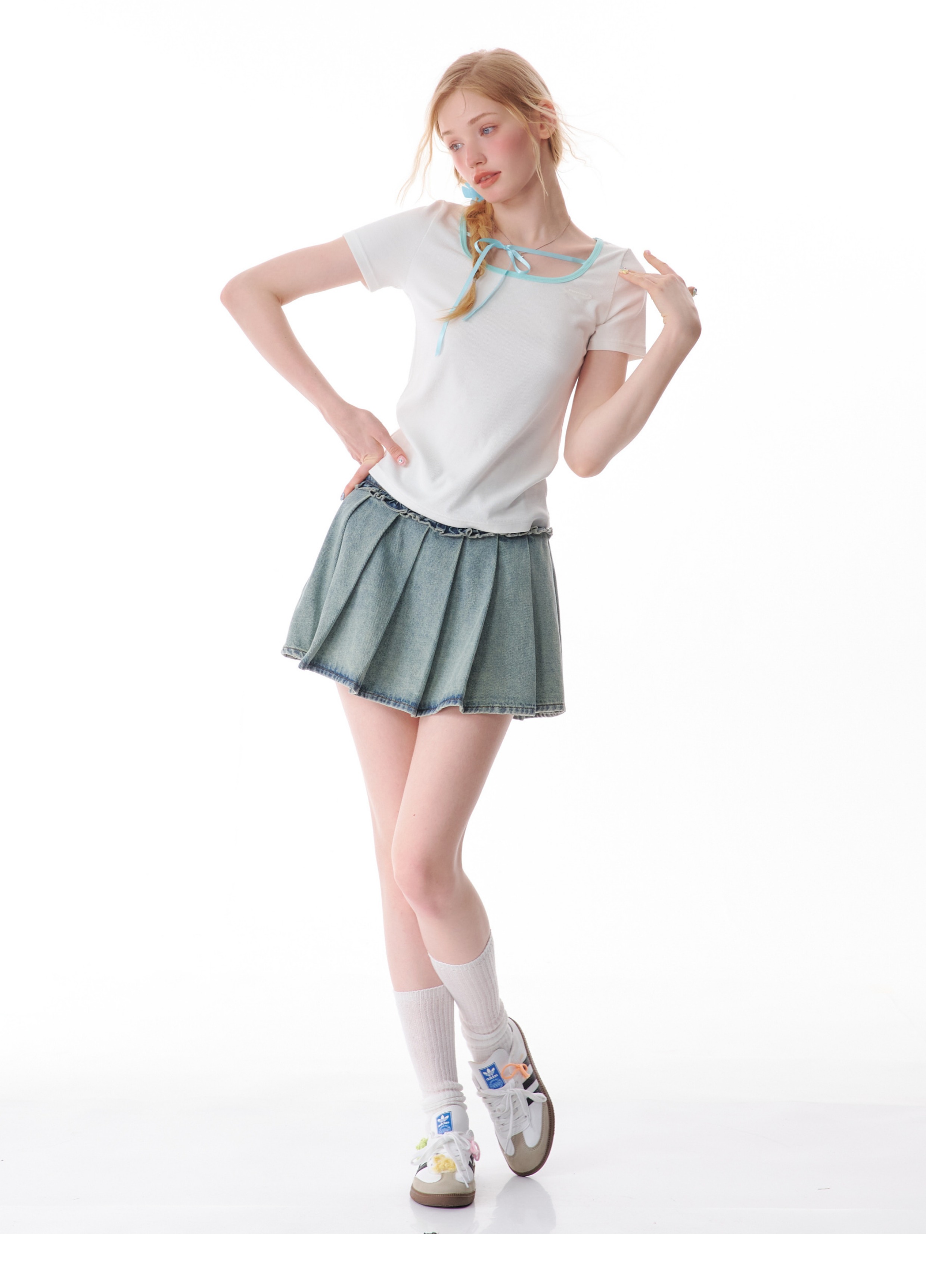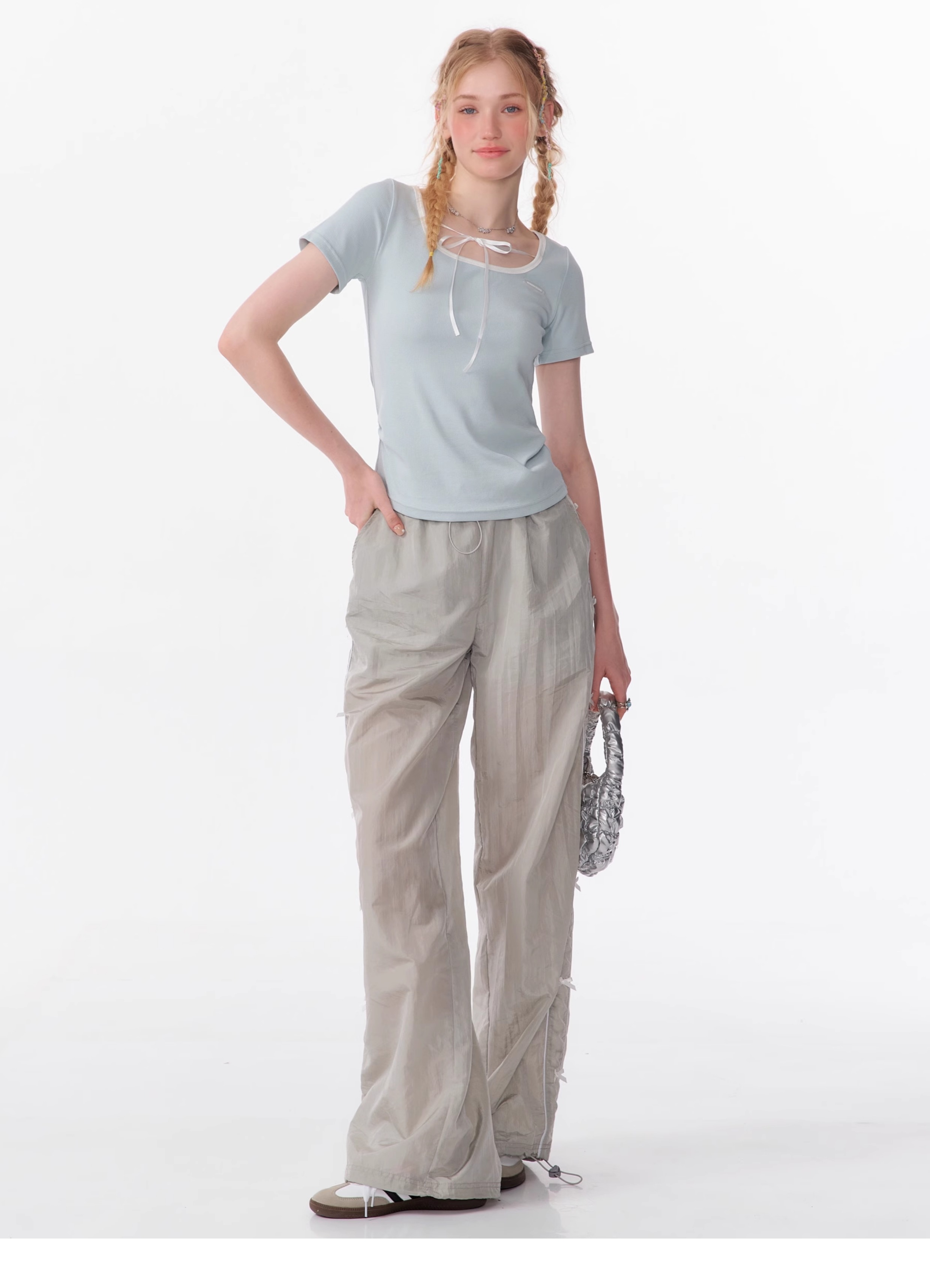 Bow U-neck Slim Fit T-shirt | Contrast Square Neck Design for Summer