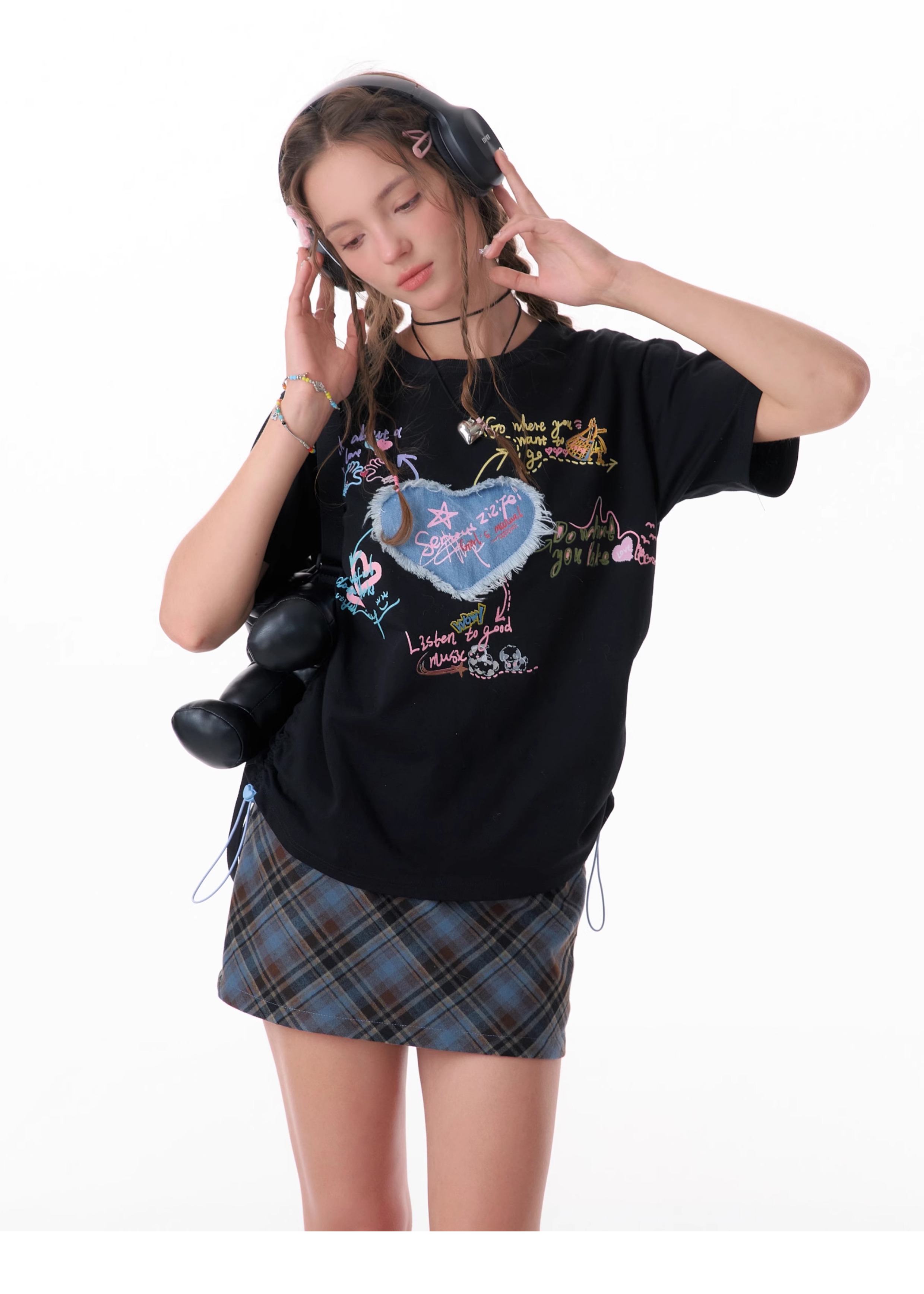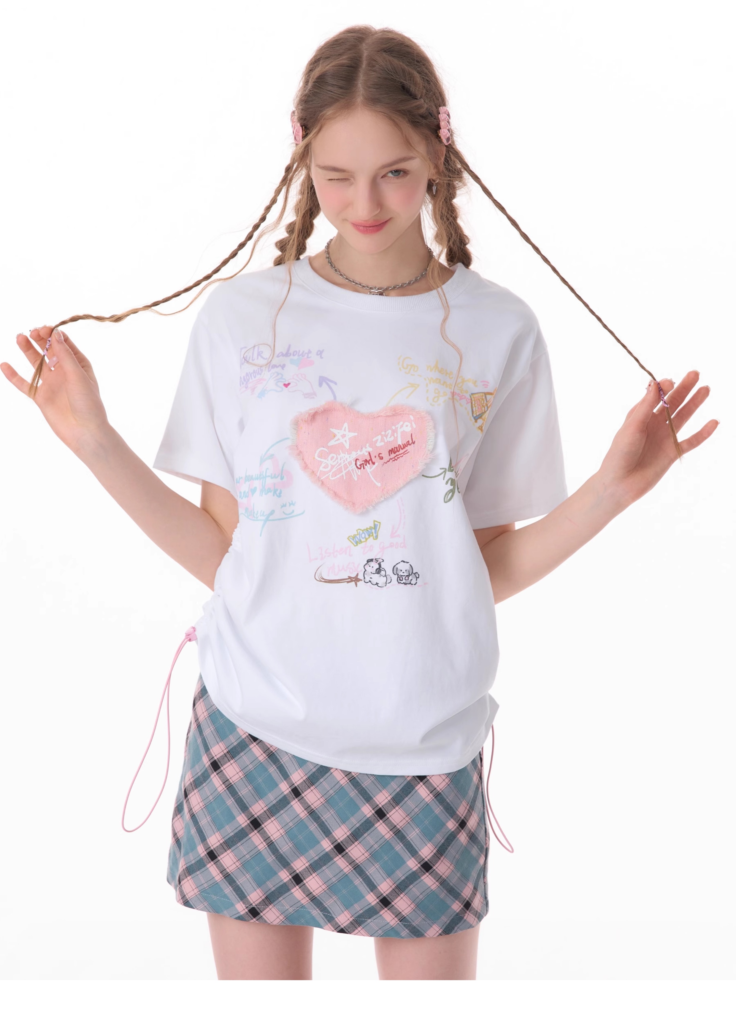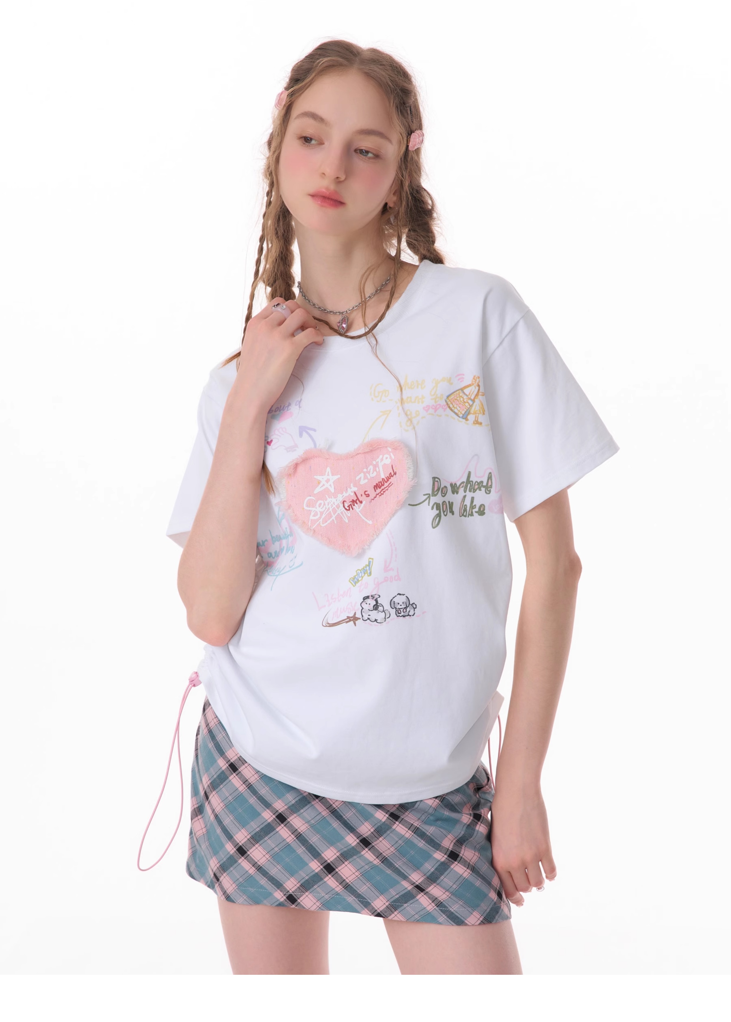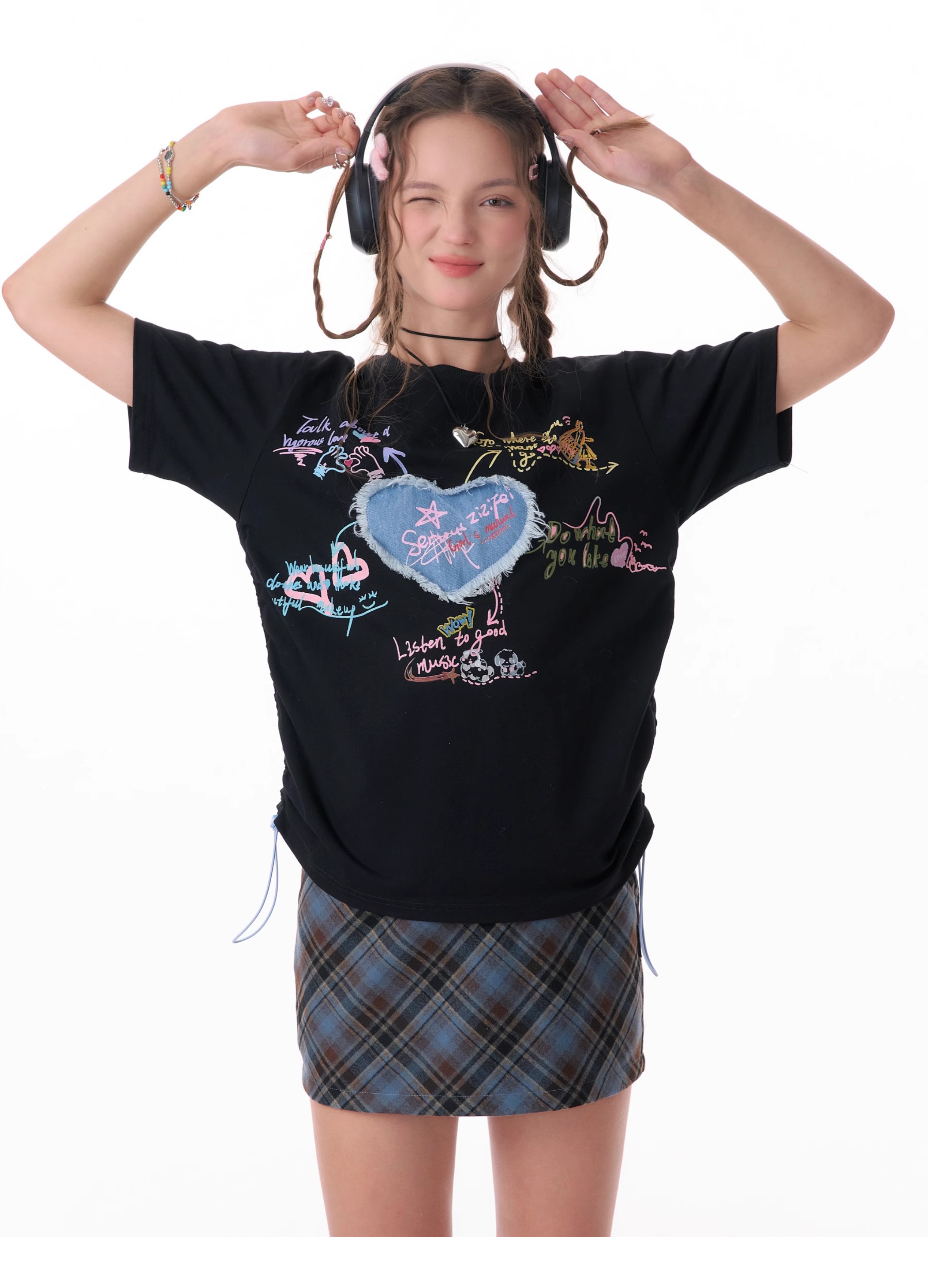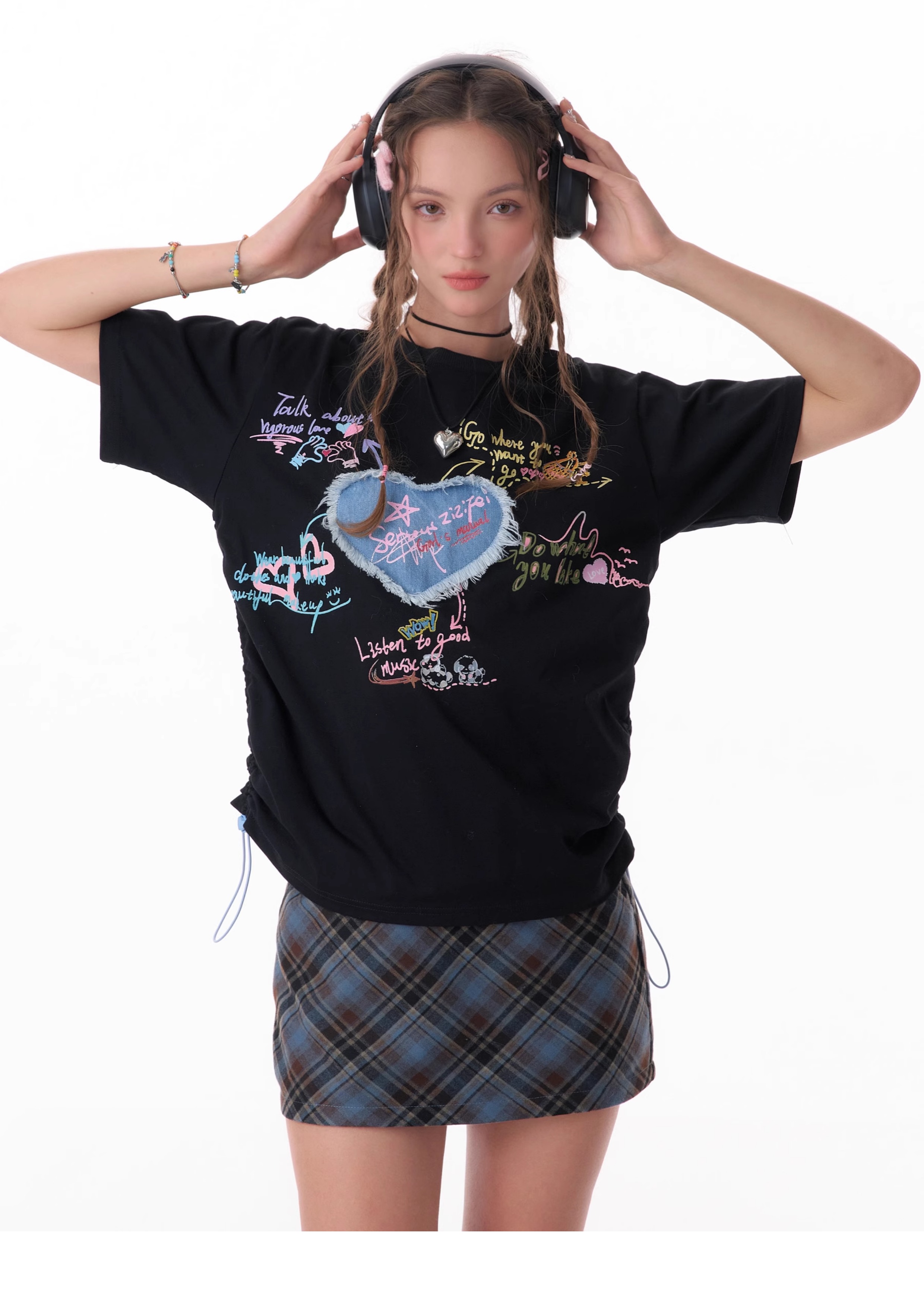Love Patch Printed Drawstring T-shirt | Heavy Industry Round Neck Design for Summer