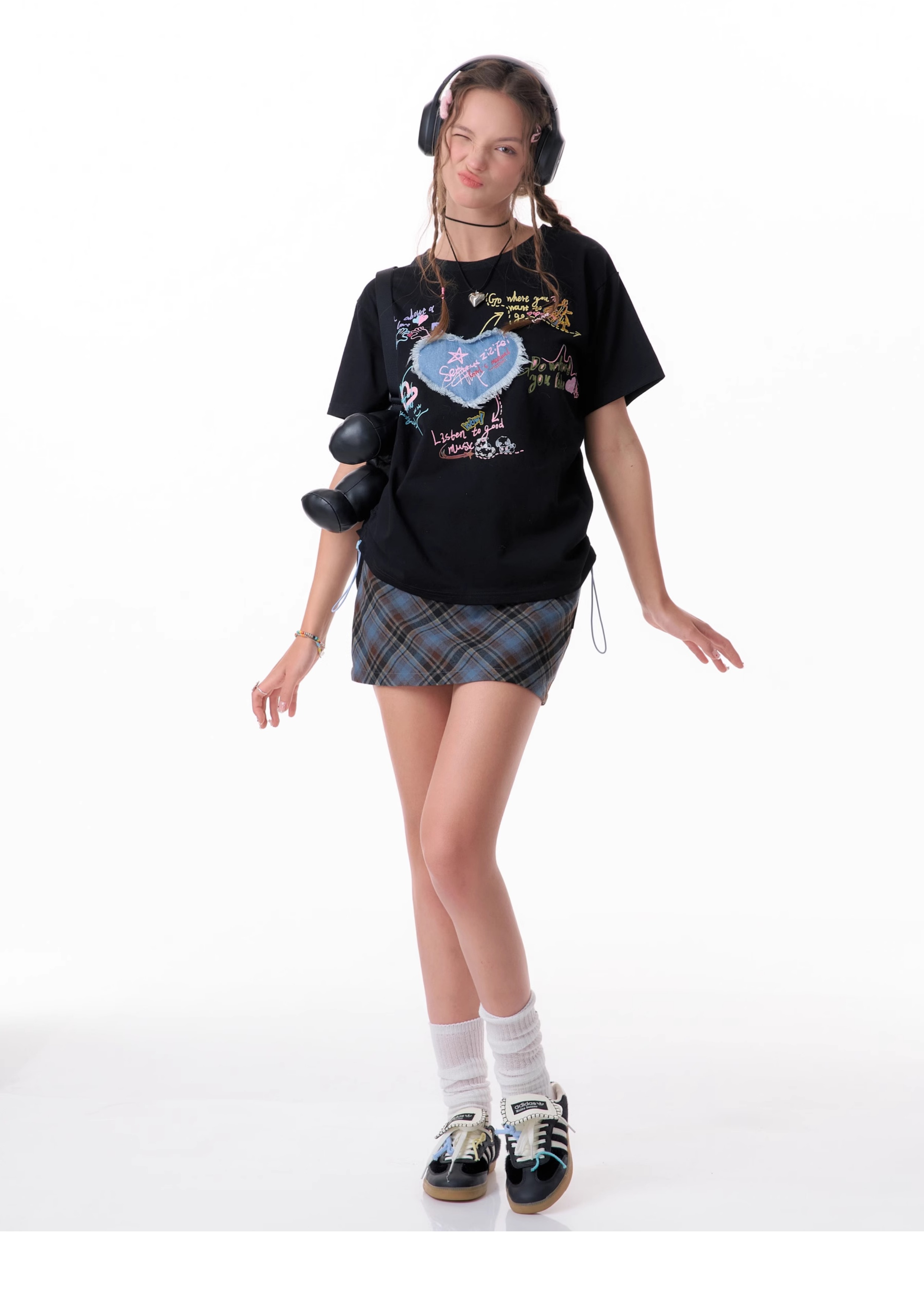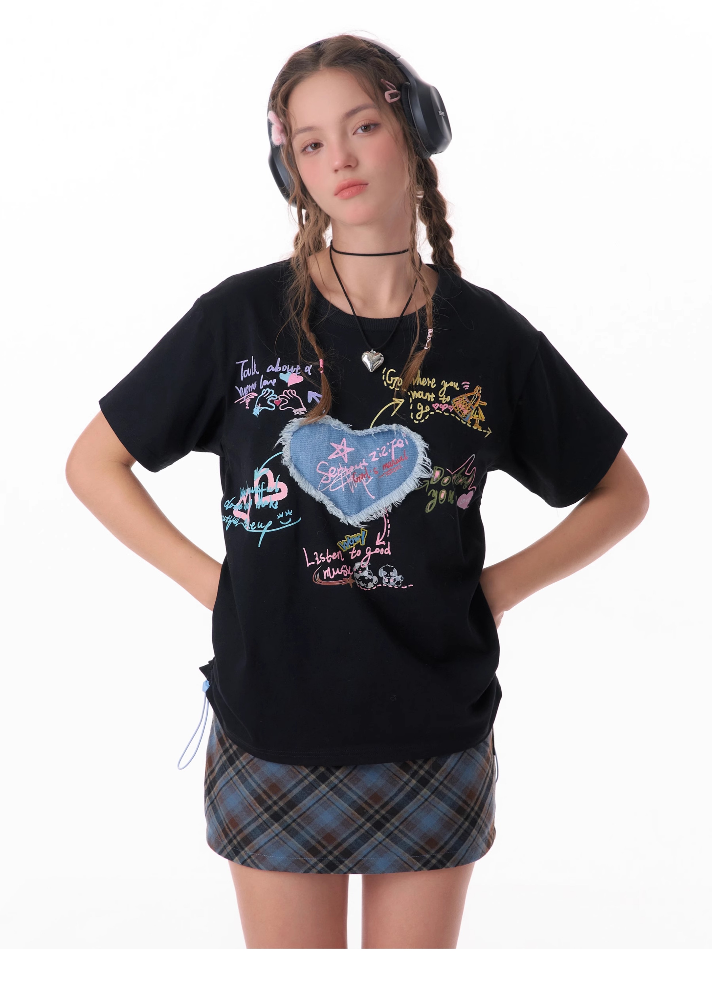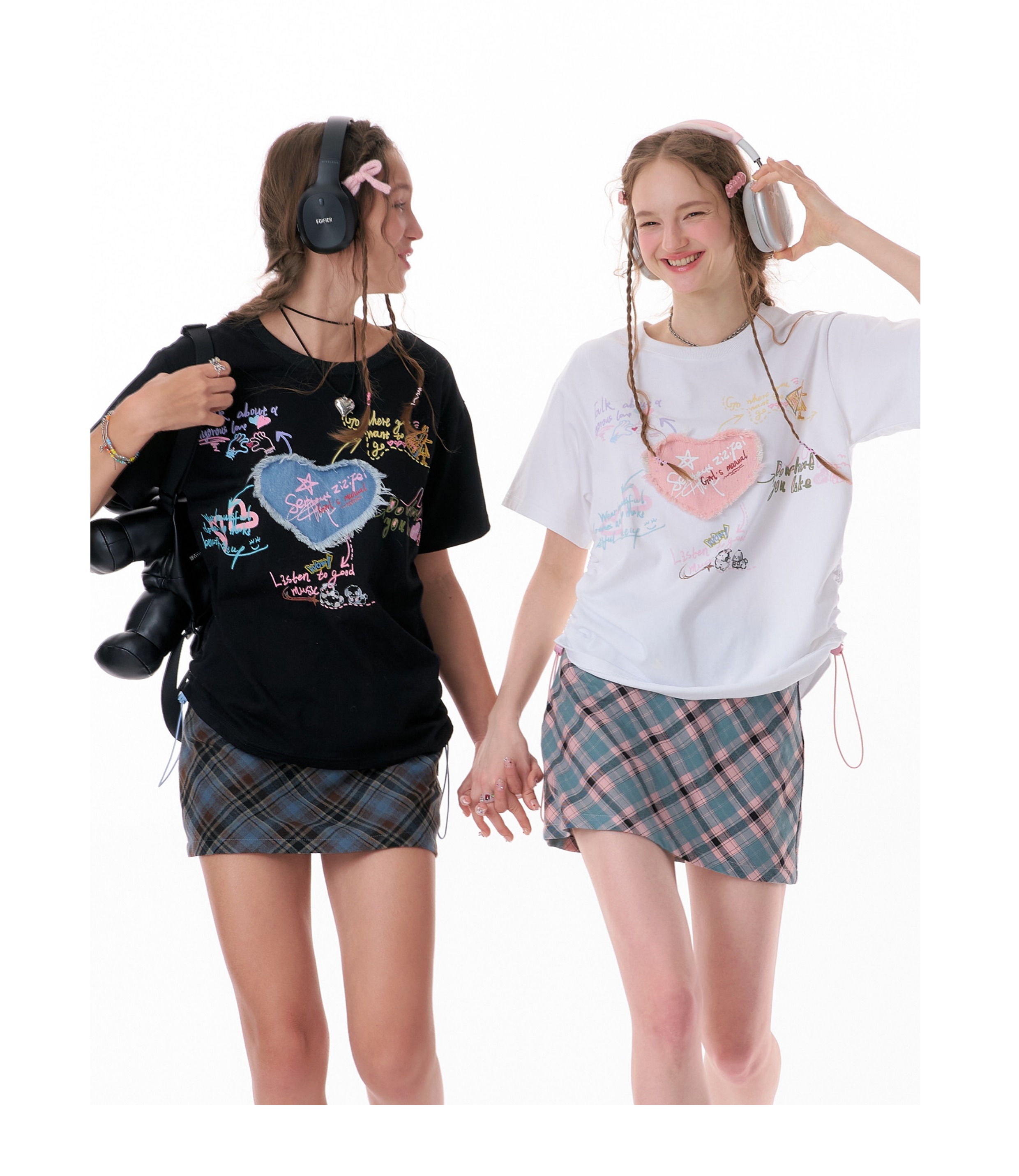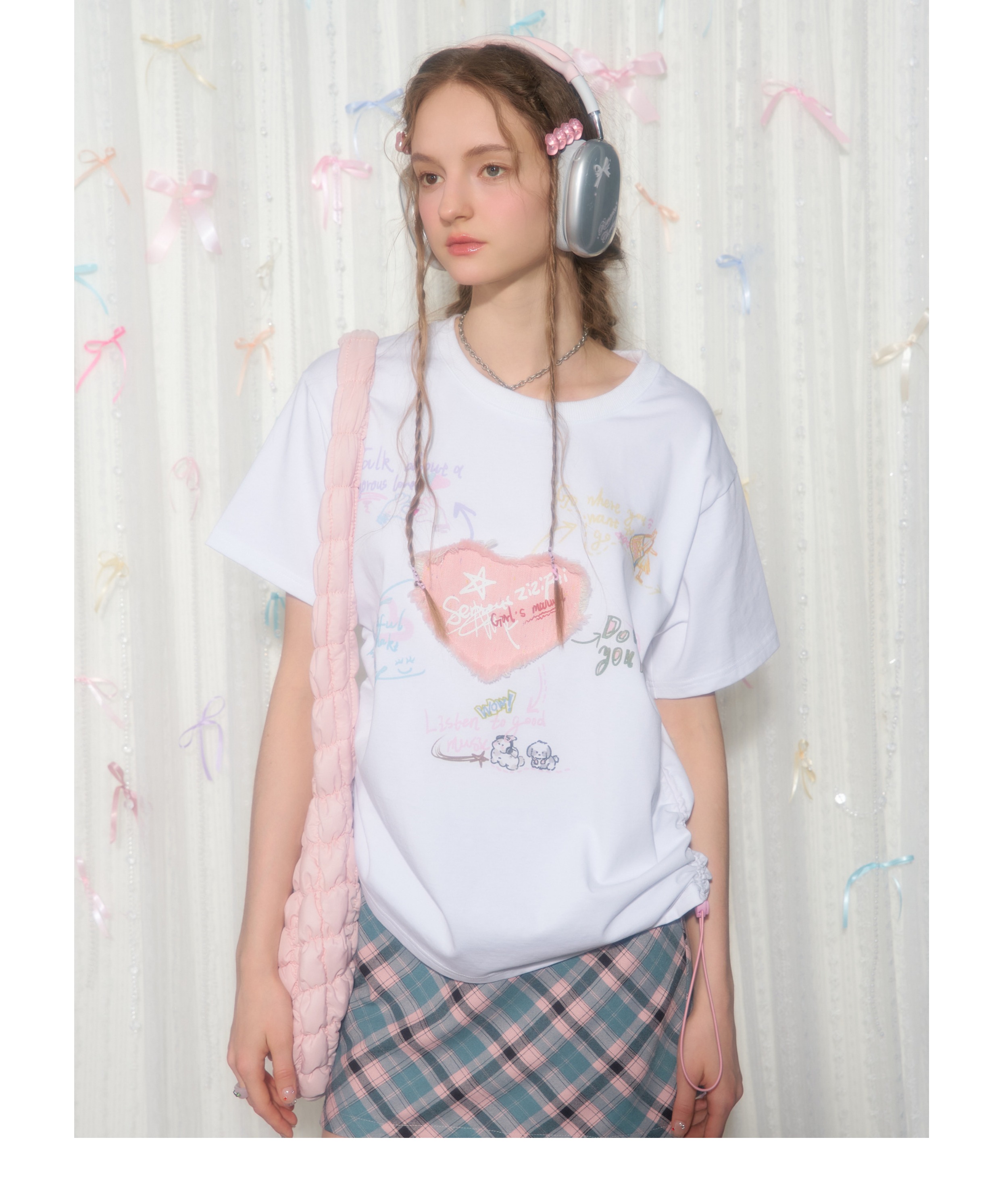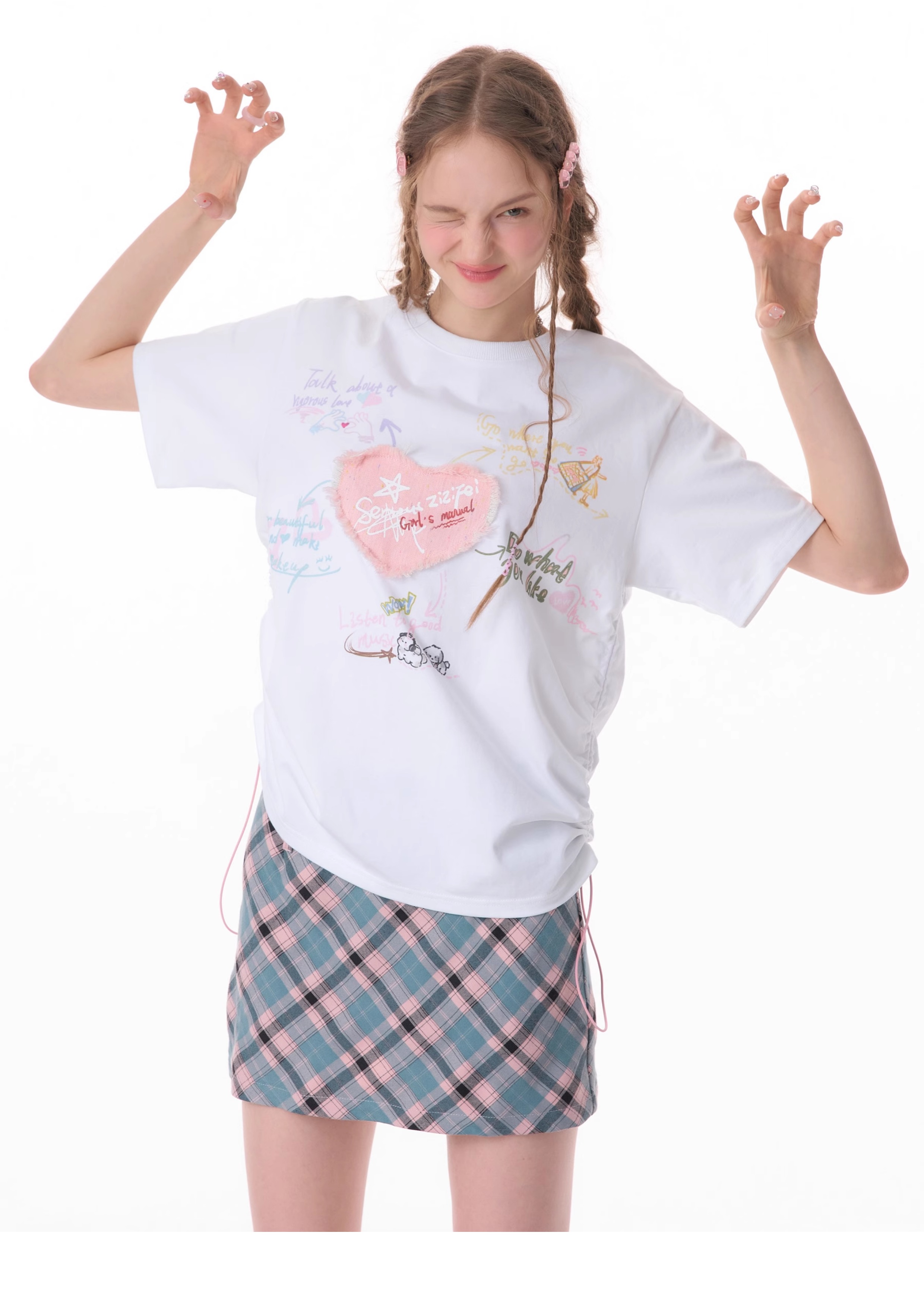 Love Patch Printed Drawstring T-shirt | Heavy Industry Round Neck Design for Summer