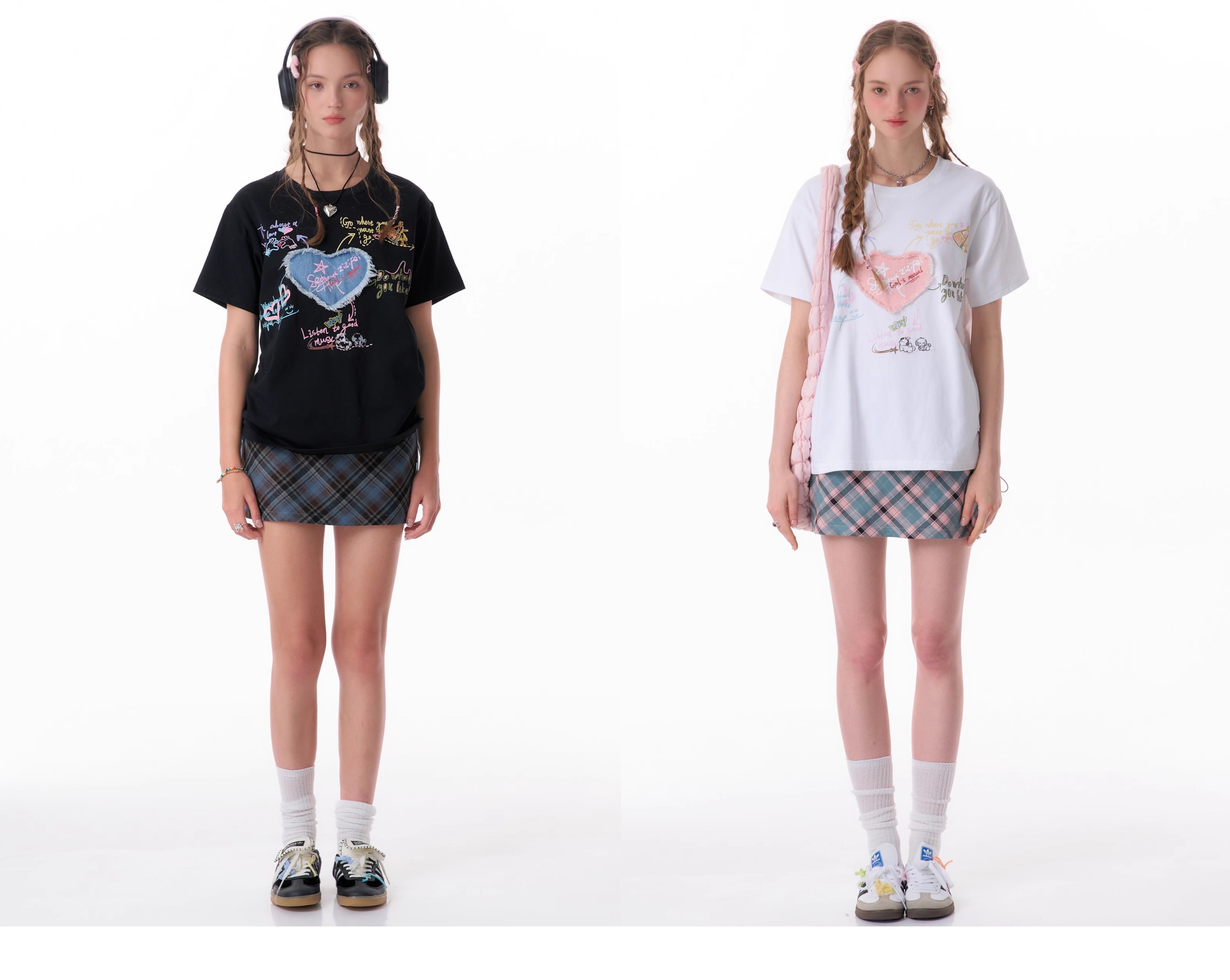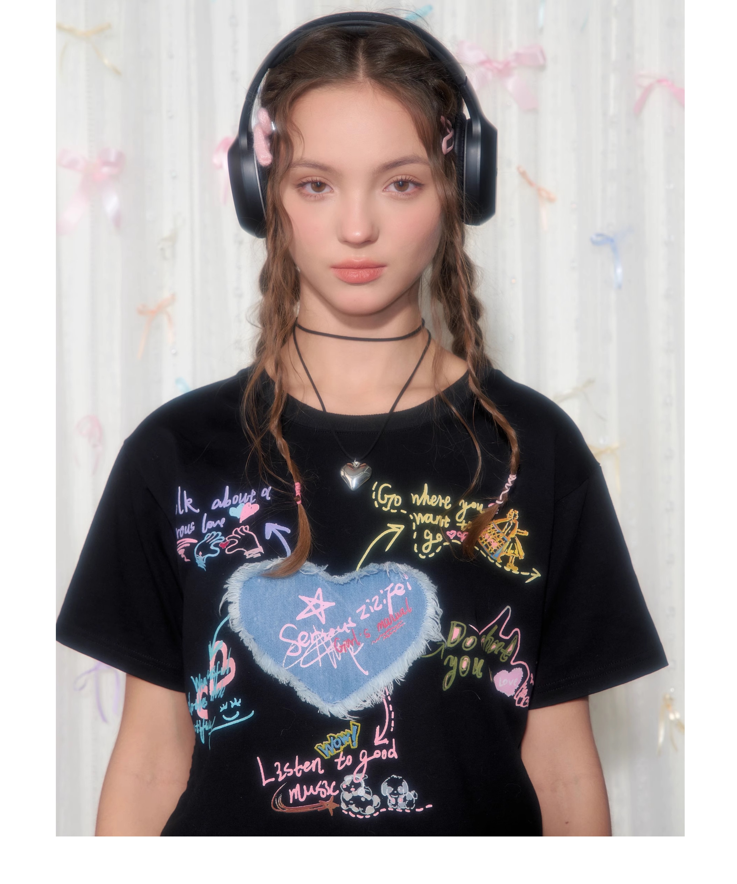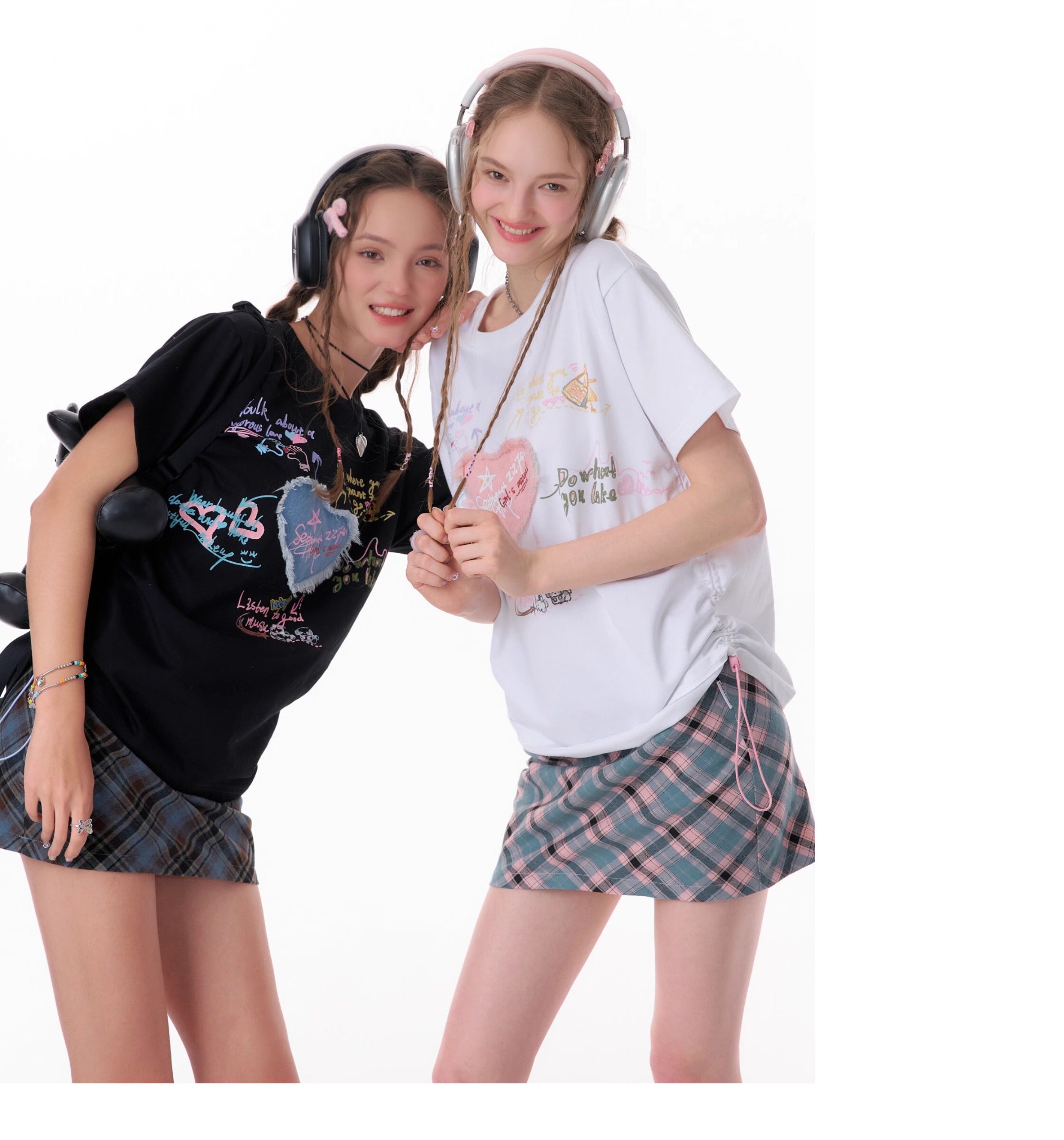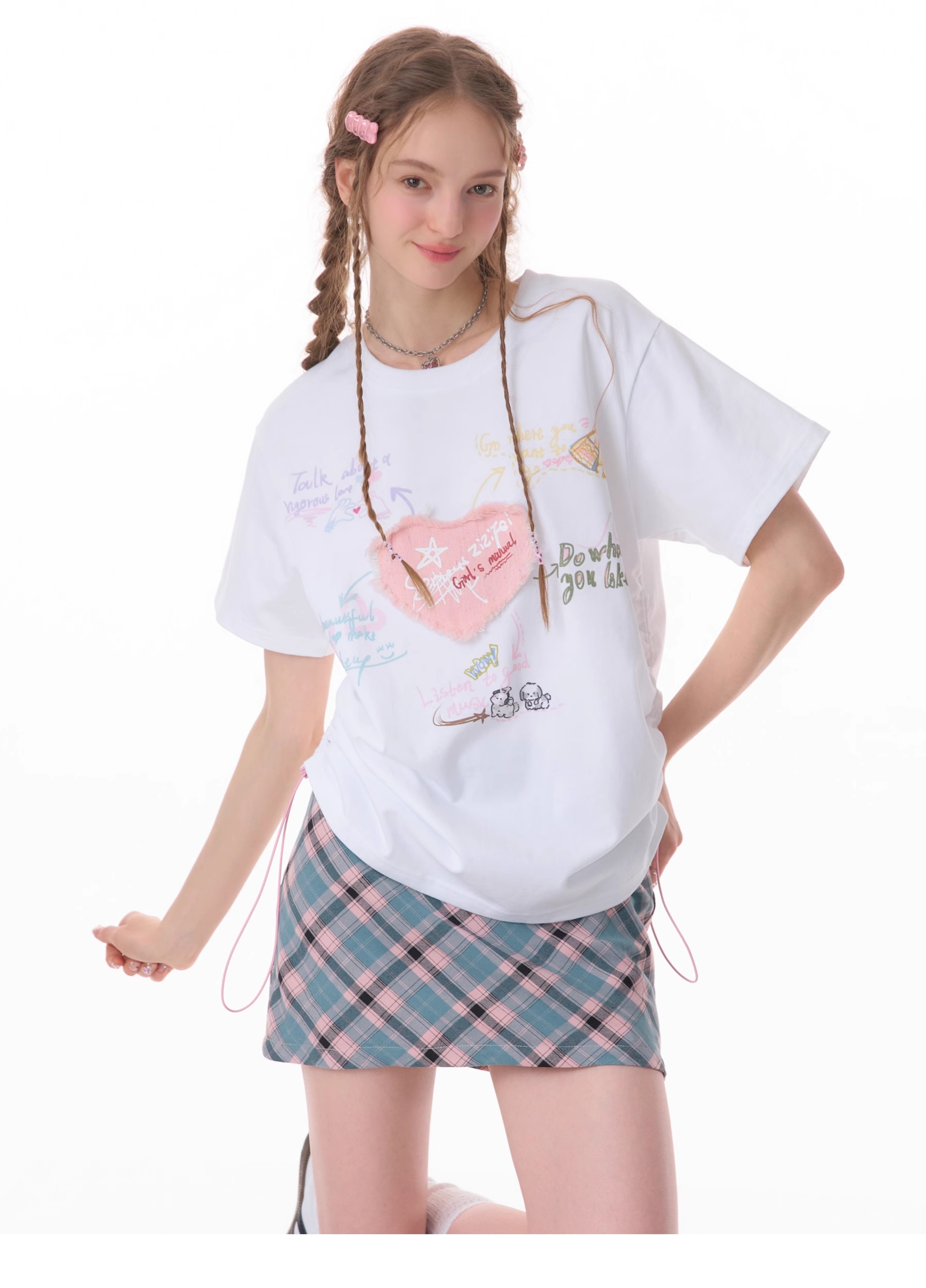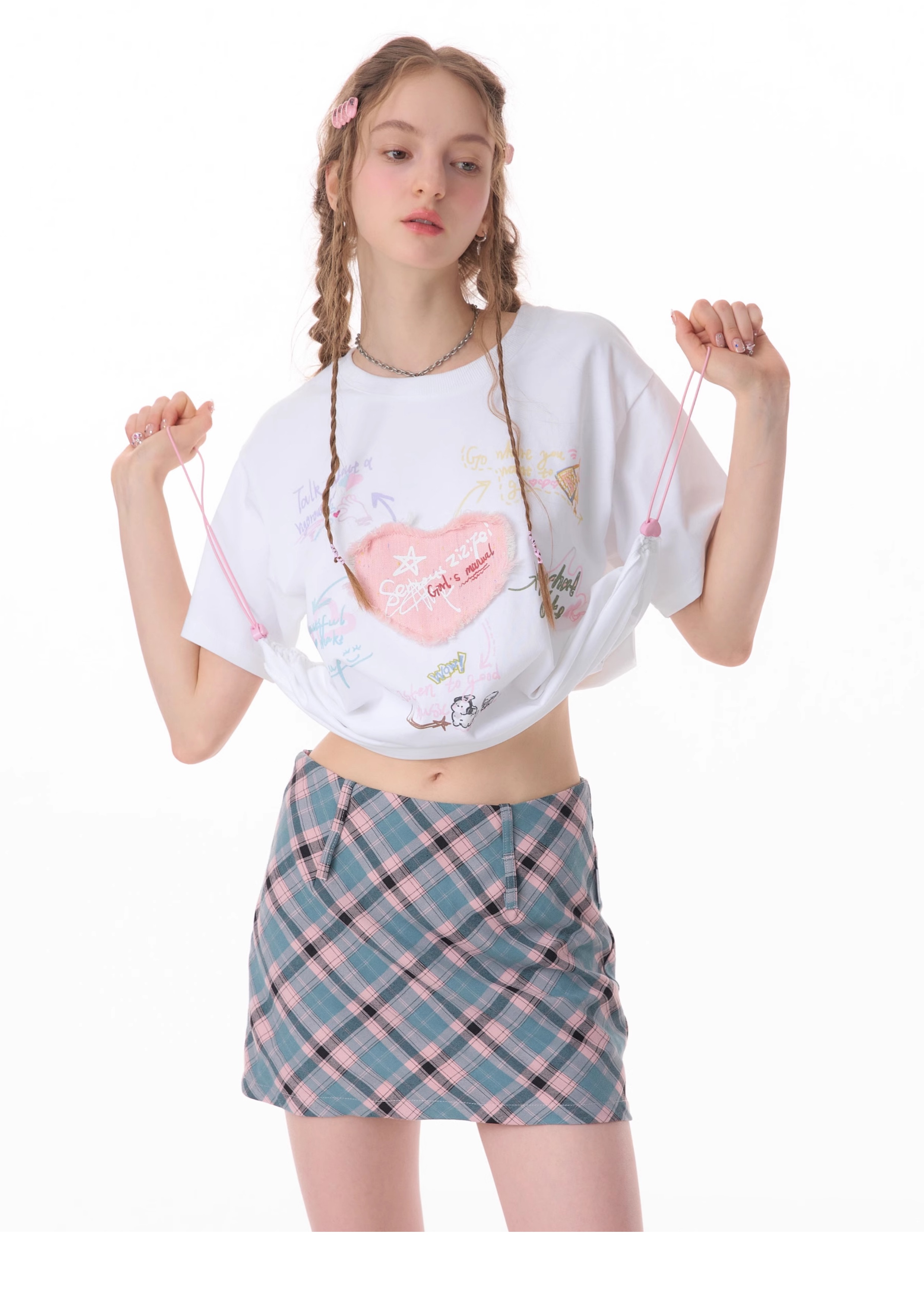 Love Patch Printed Drawstring T-shirt | Heavy Industry Round Neck Design for Summer