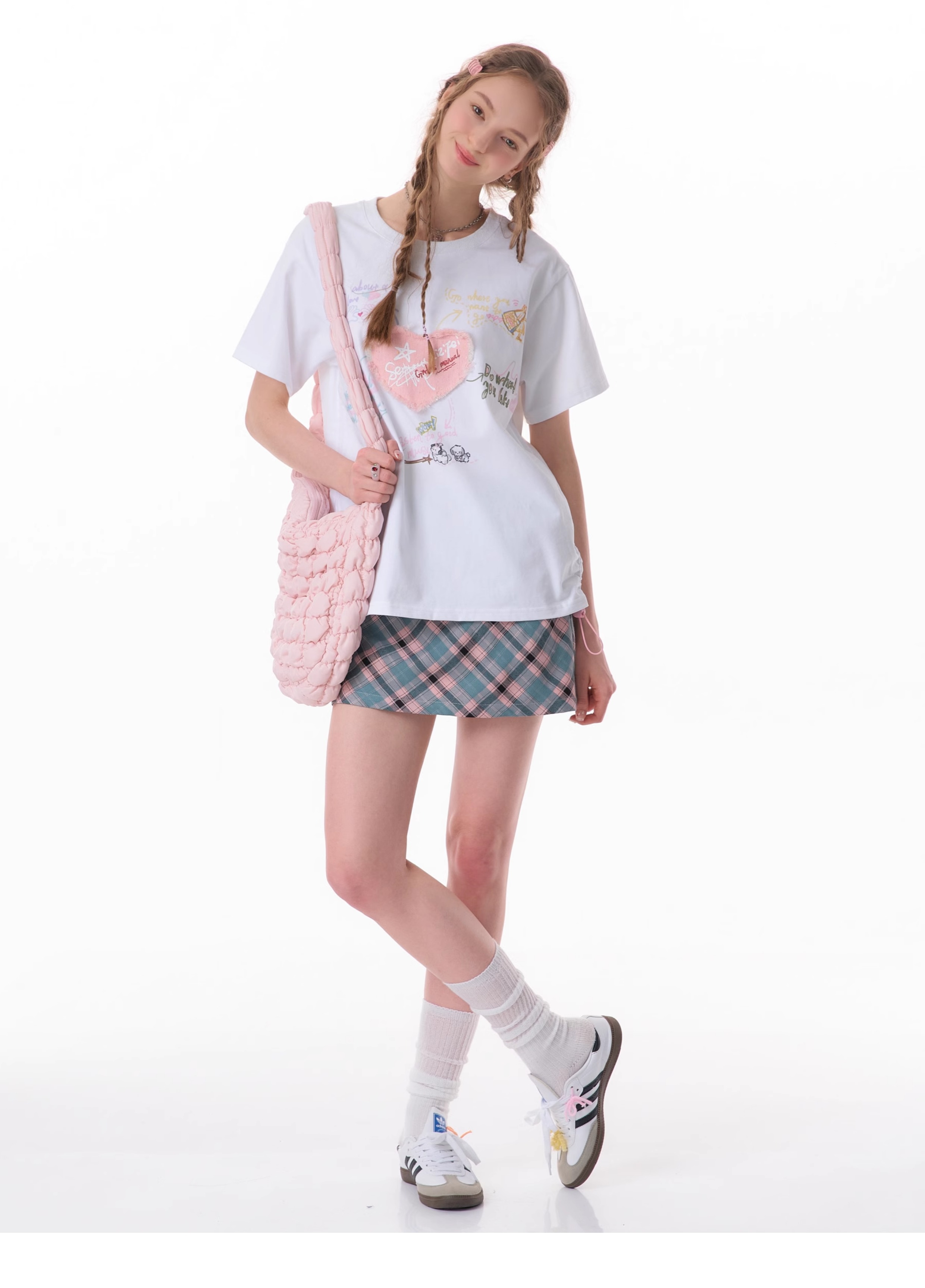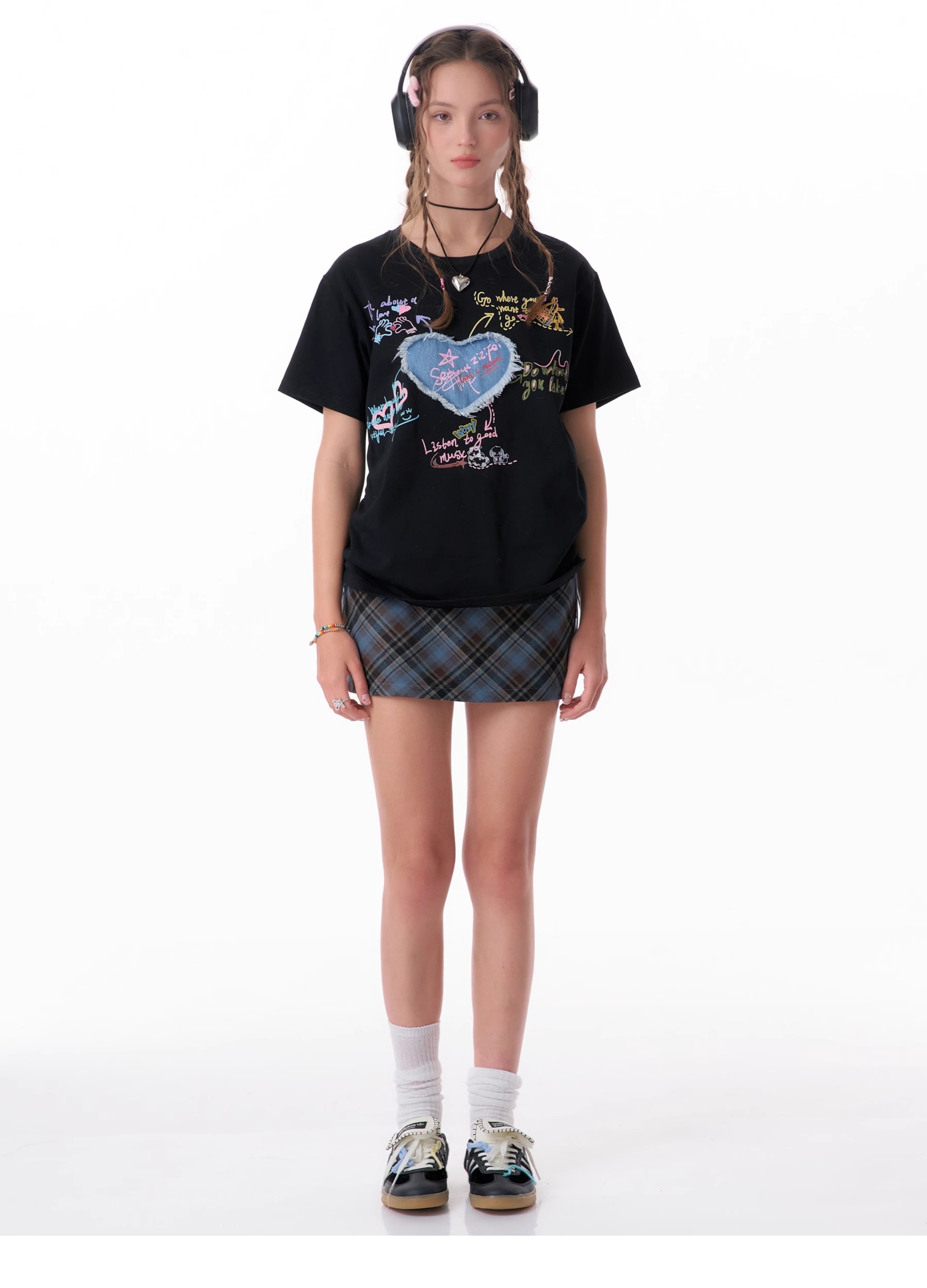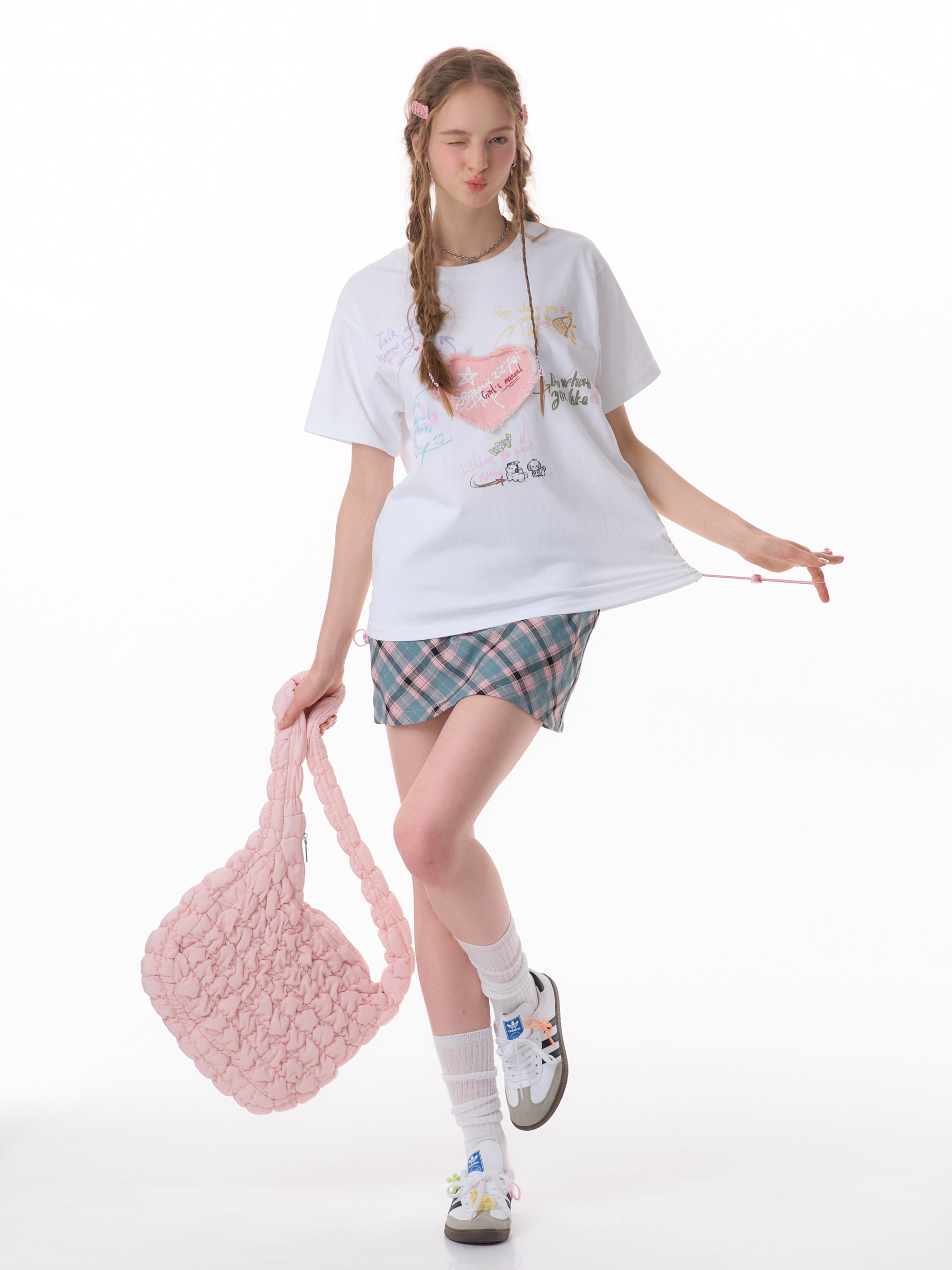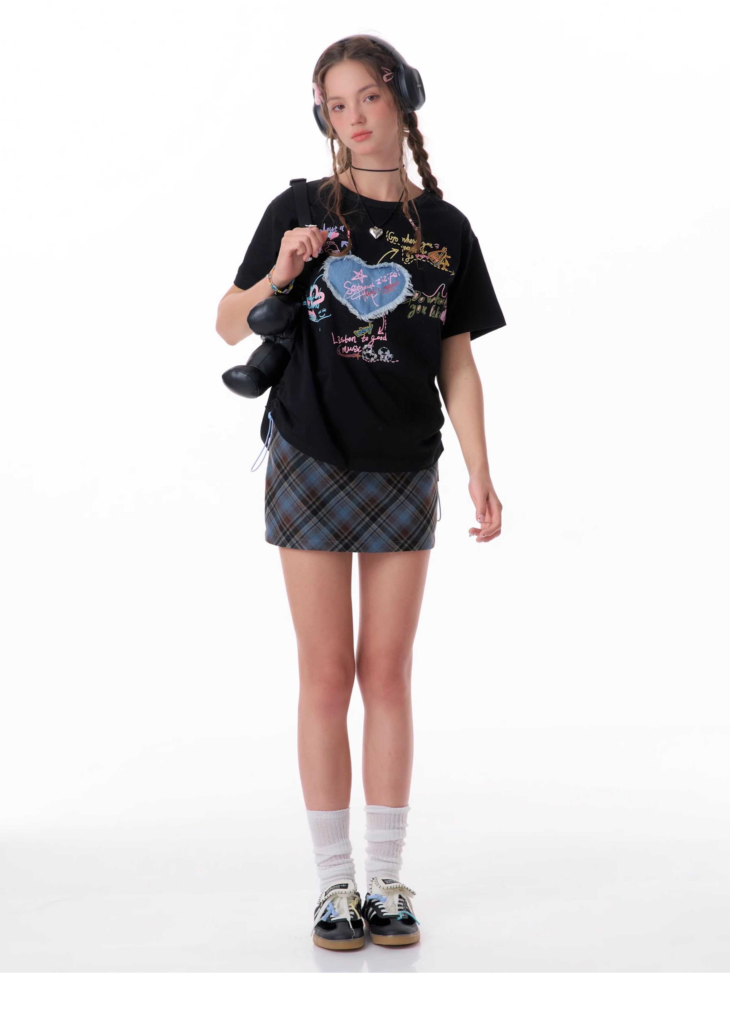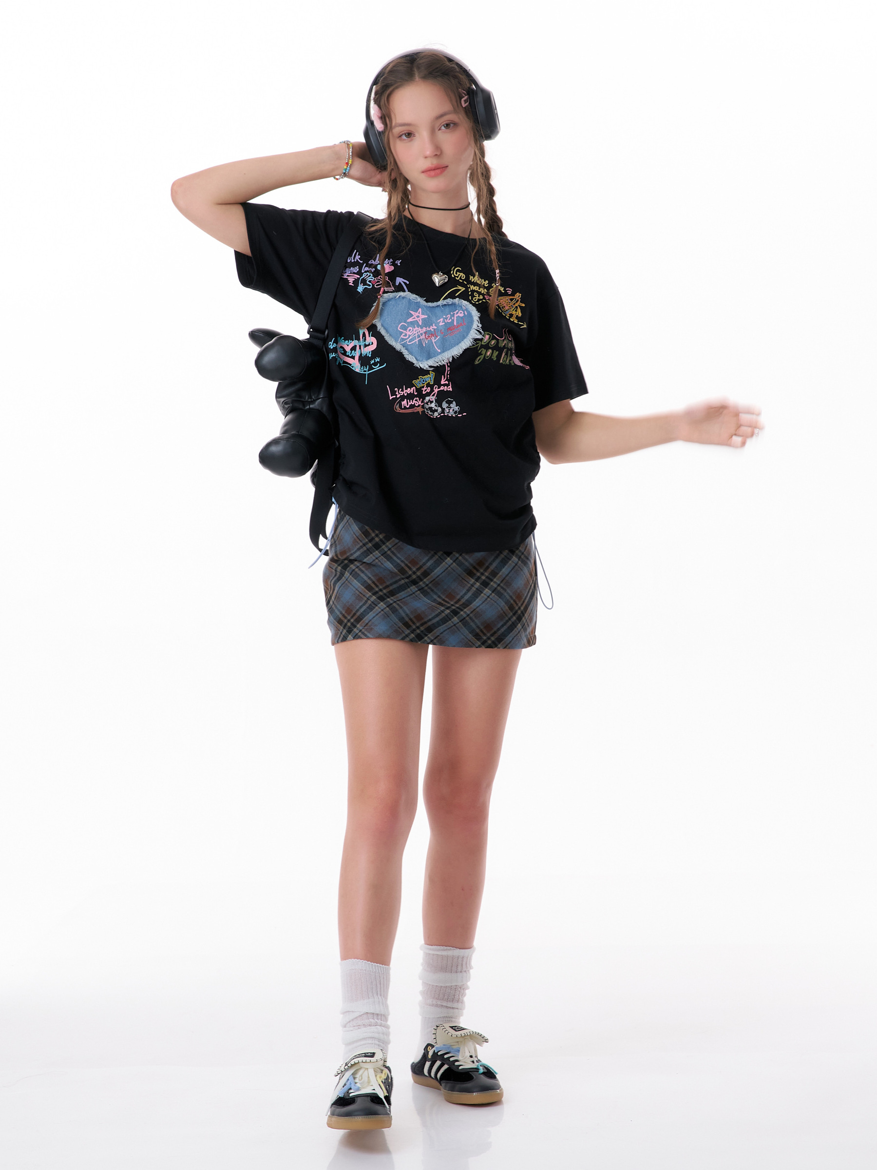 Love Patch Printed Drawstring T-shirt | Heavy Industry Round Neck Design for Summer