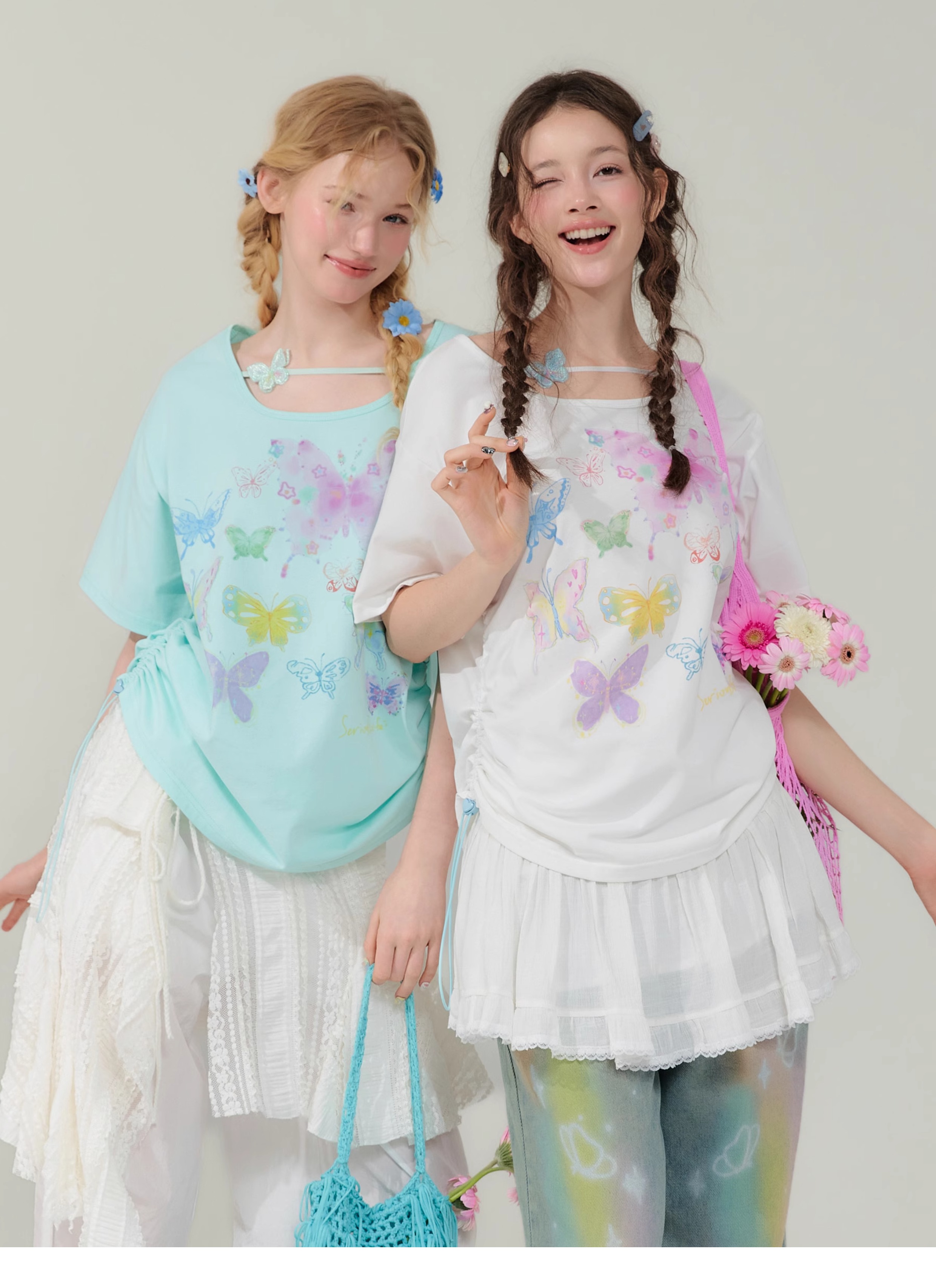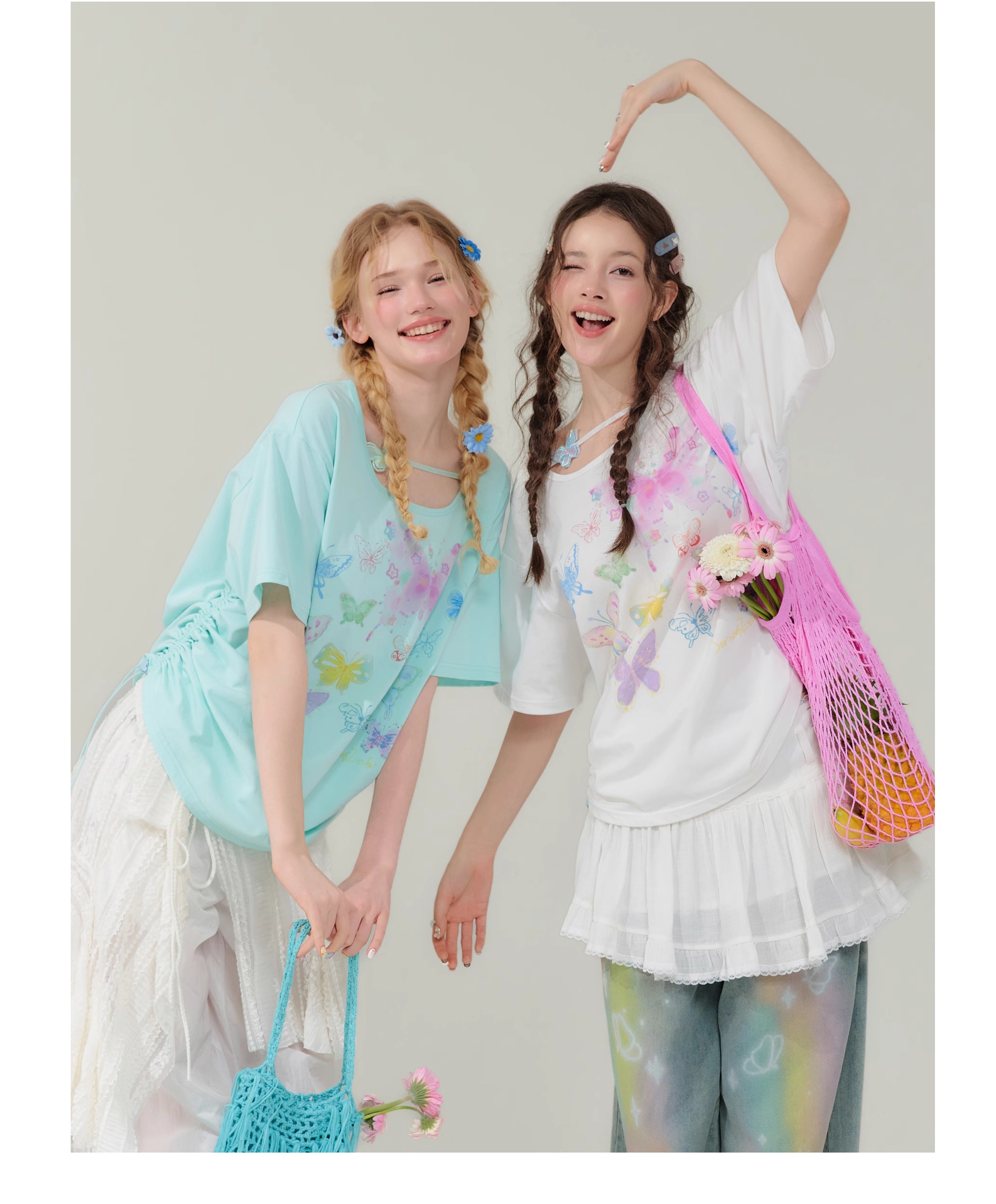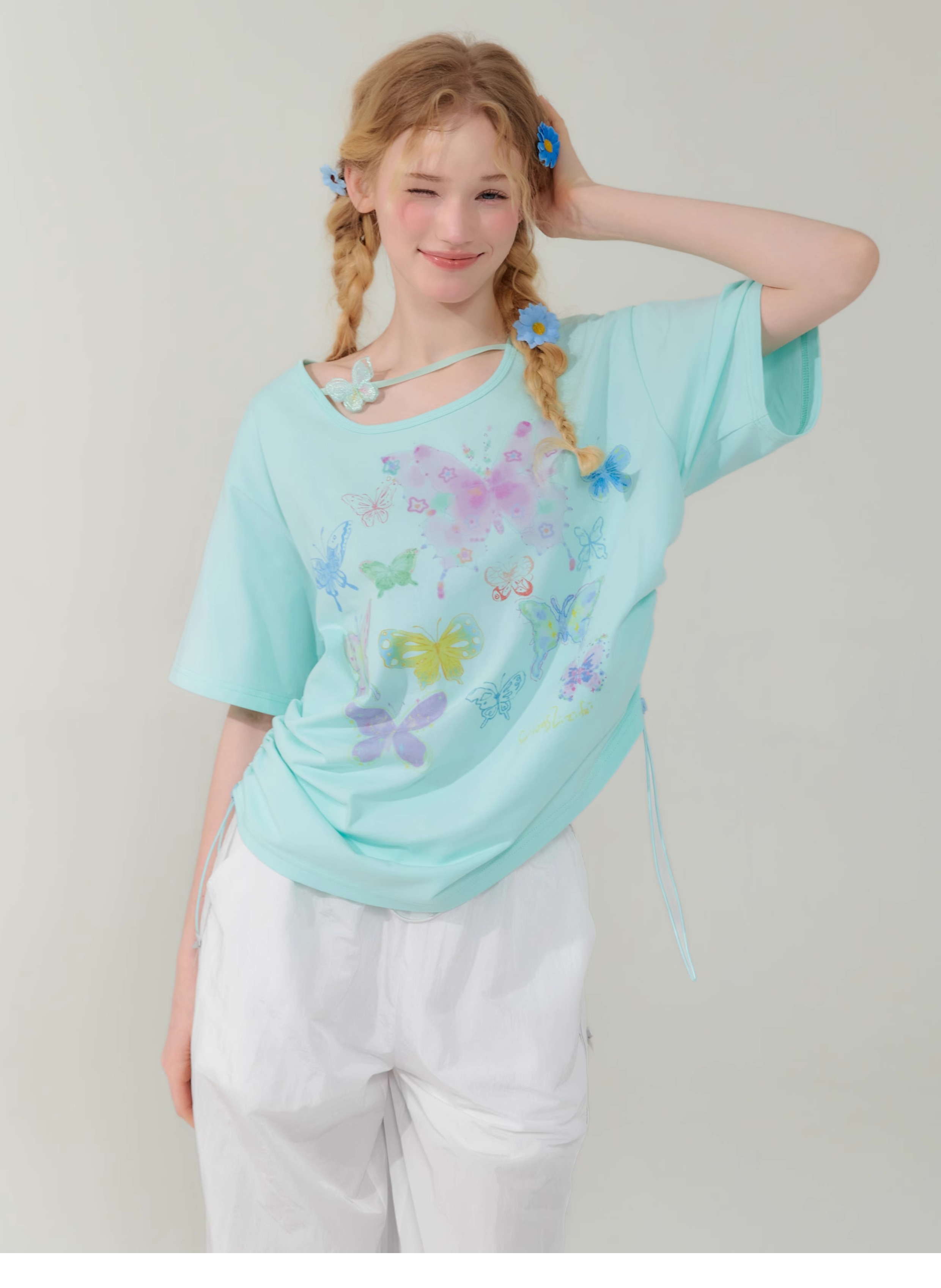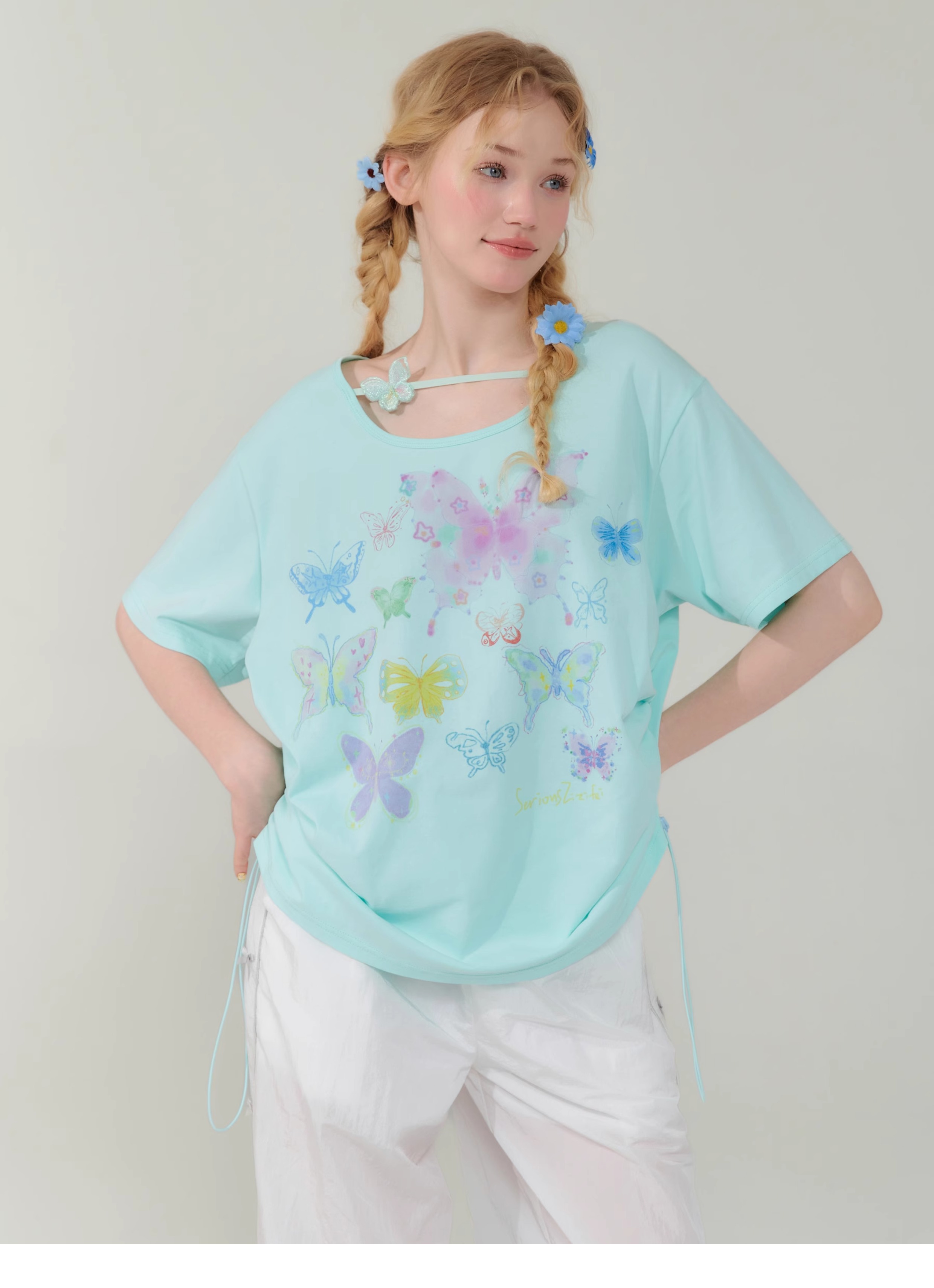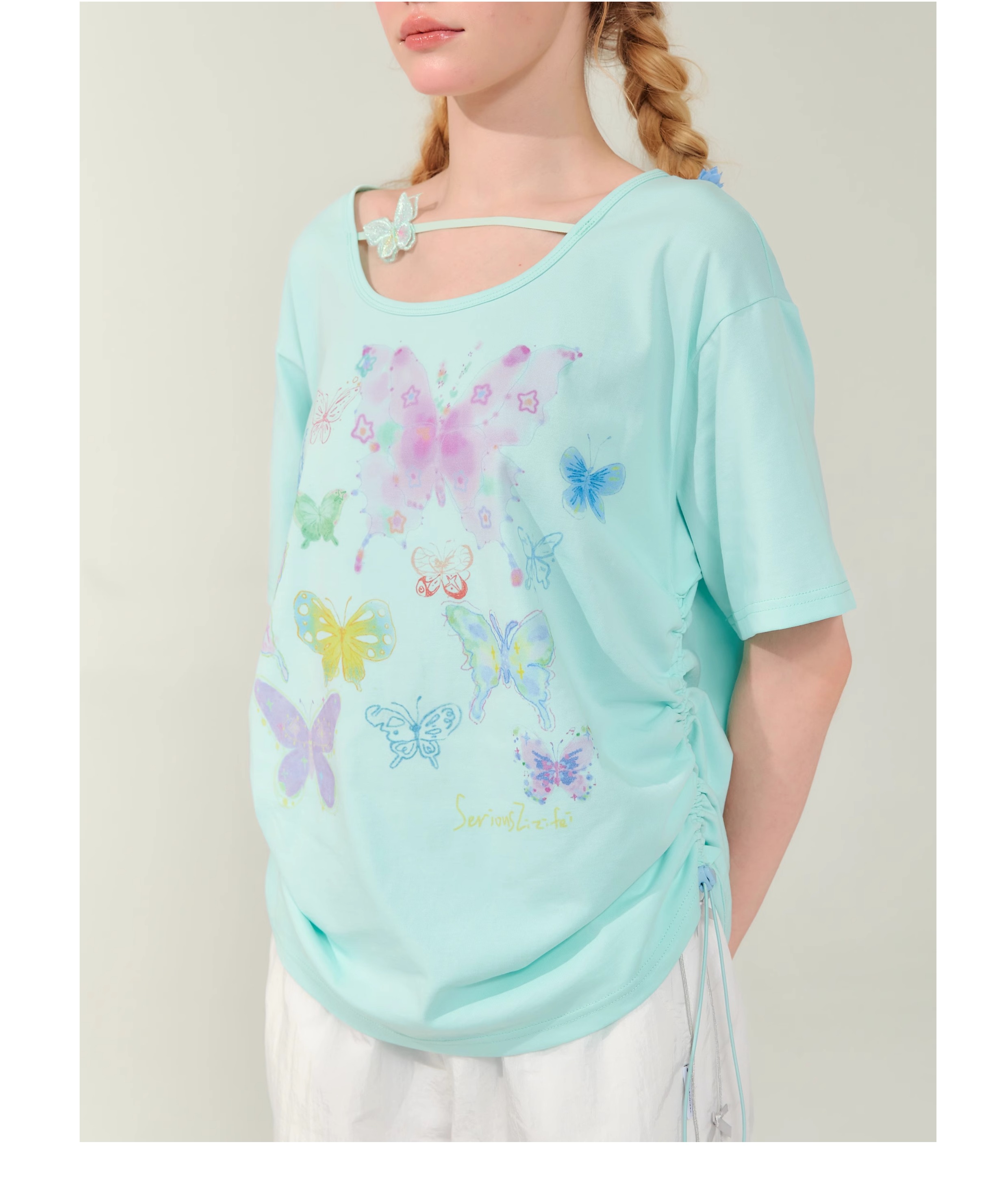 Butterfly Printed Drawstring T-shirt | Loose Fit Retro Short Sleeve for Summer