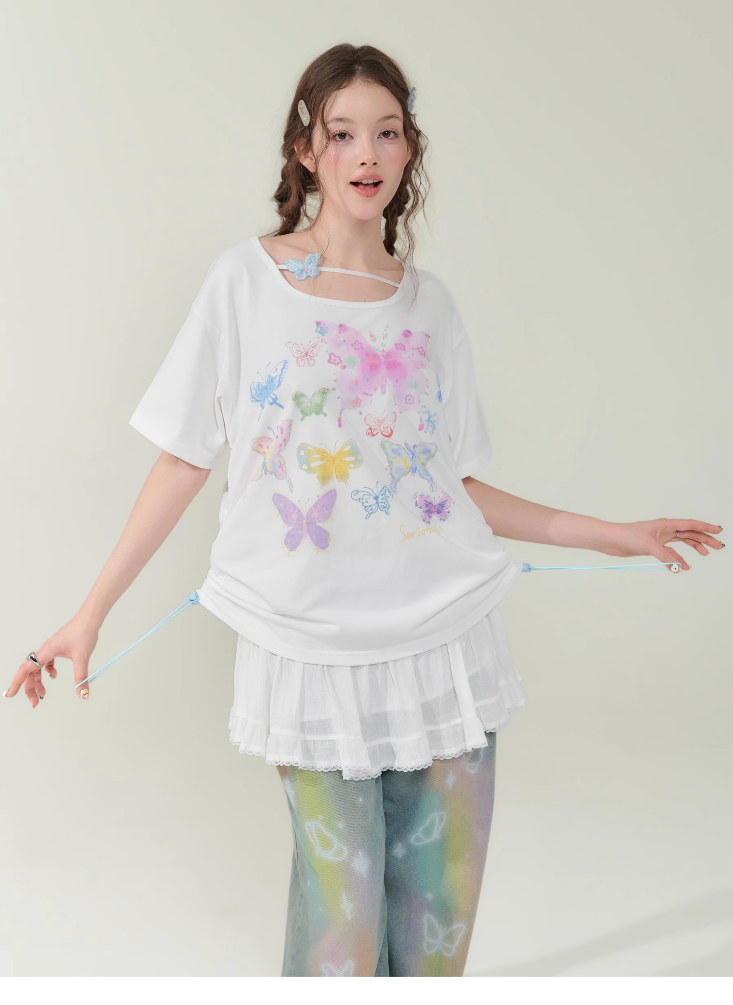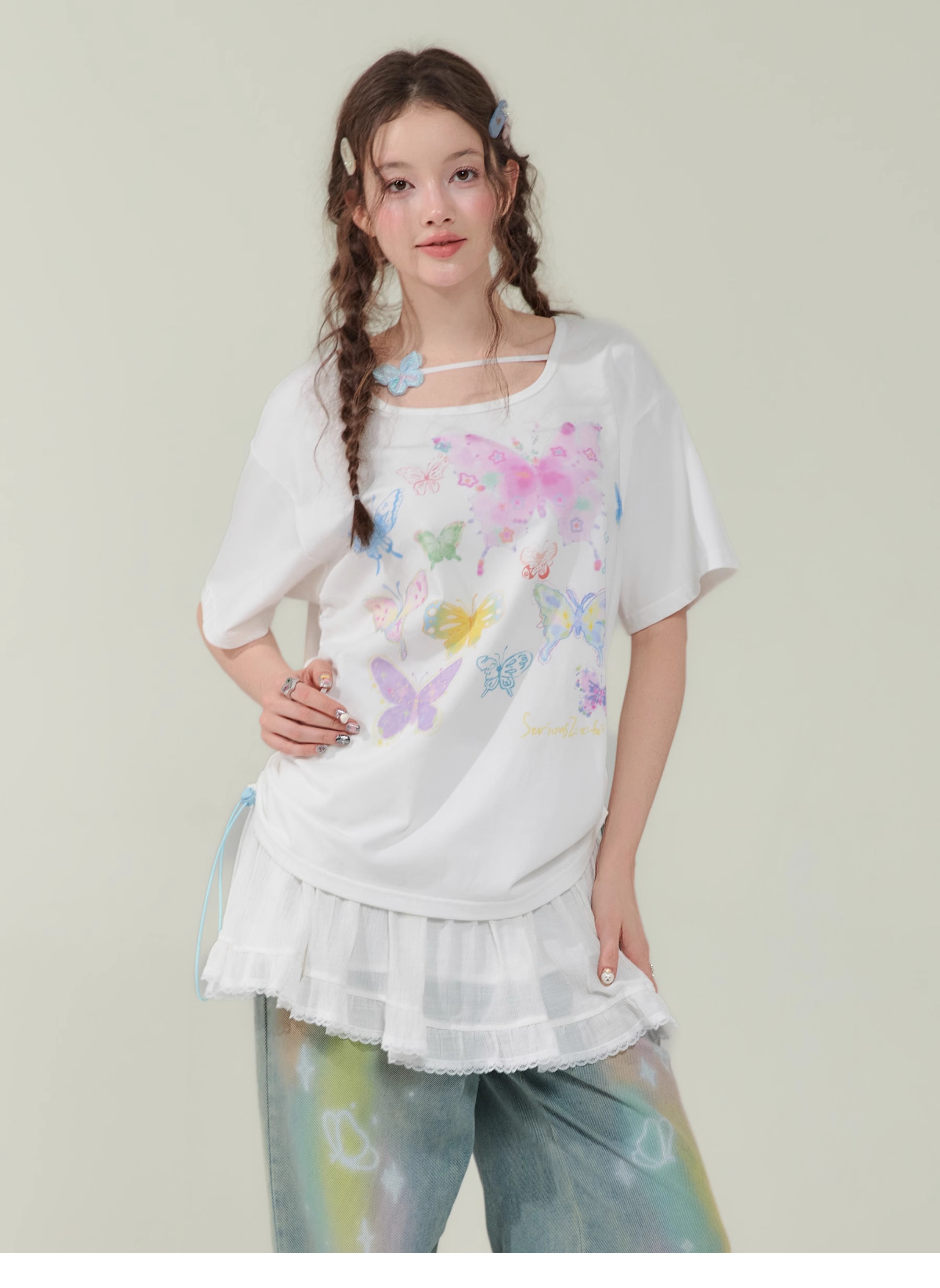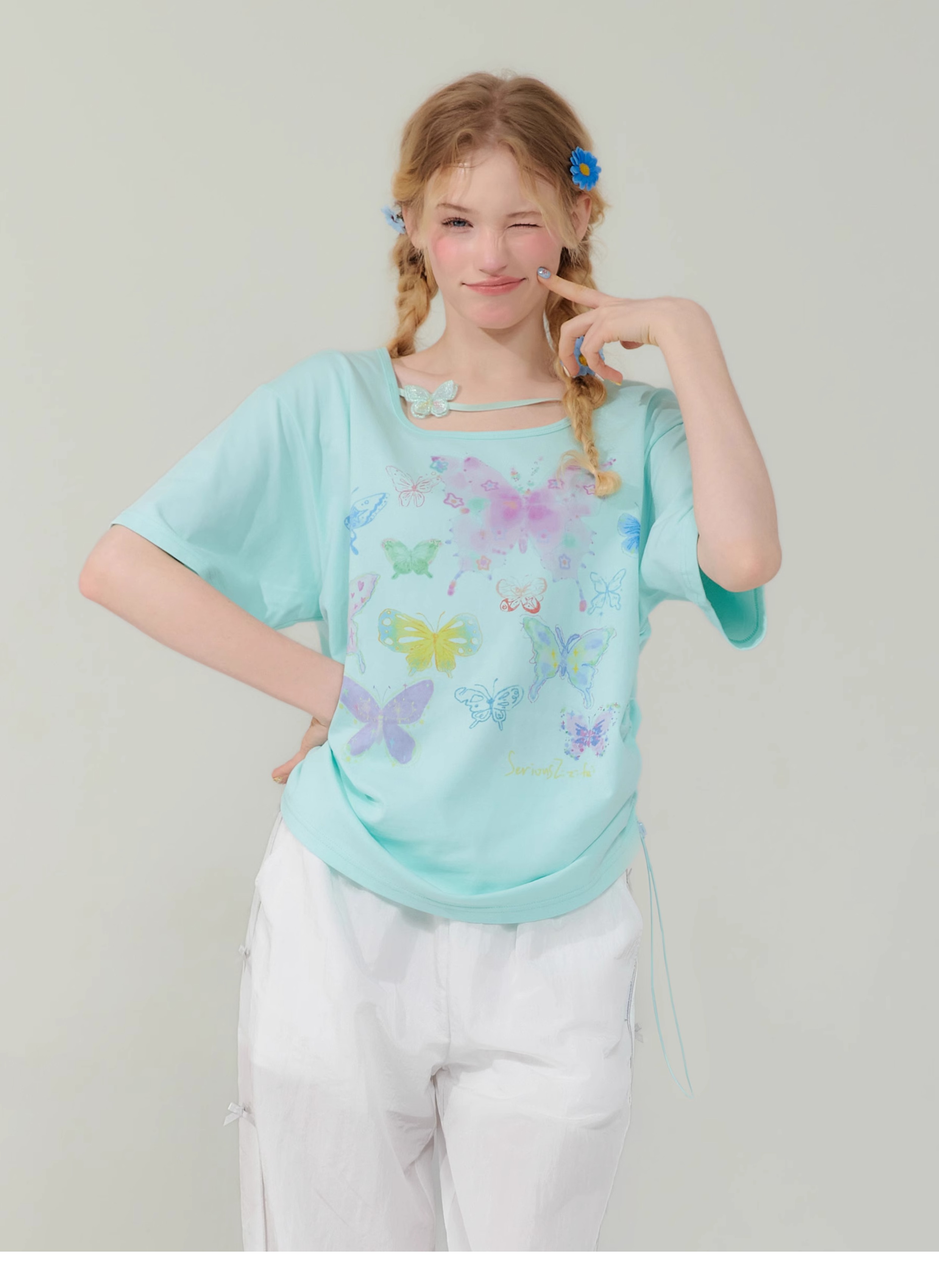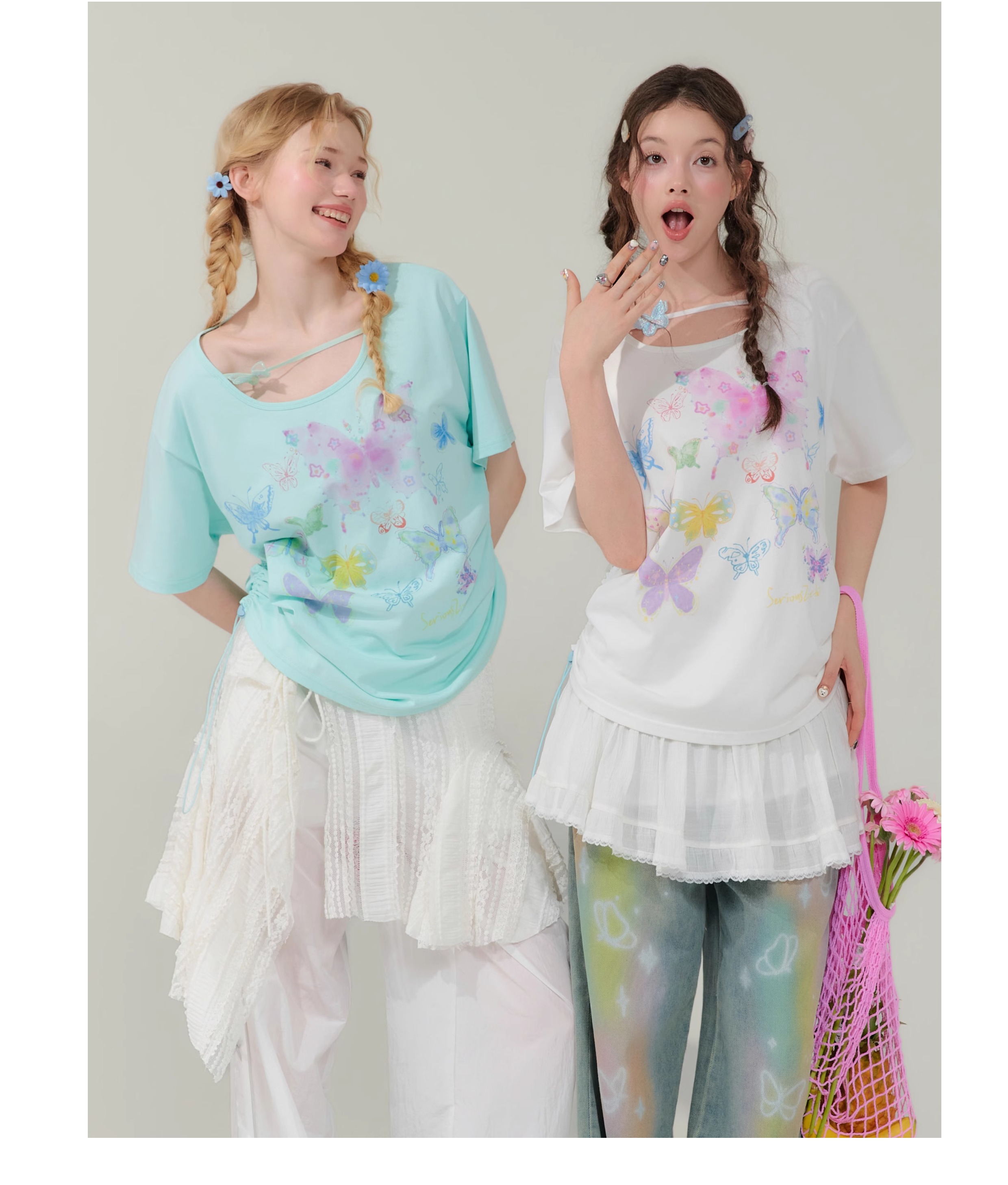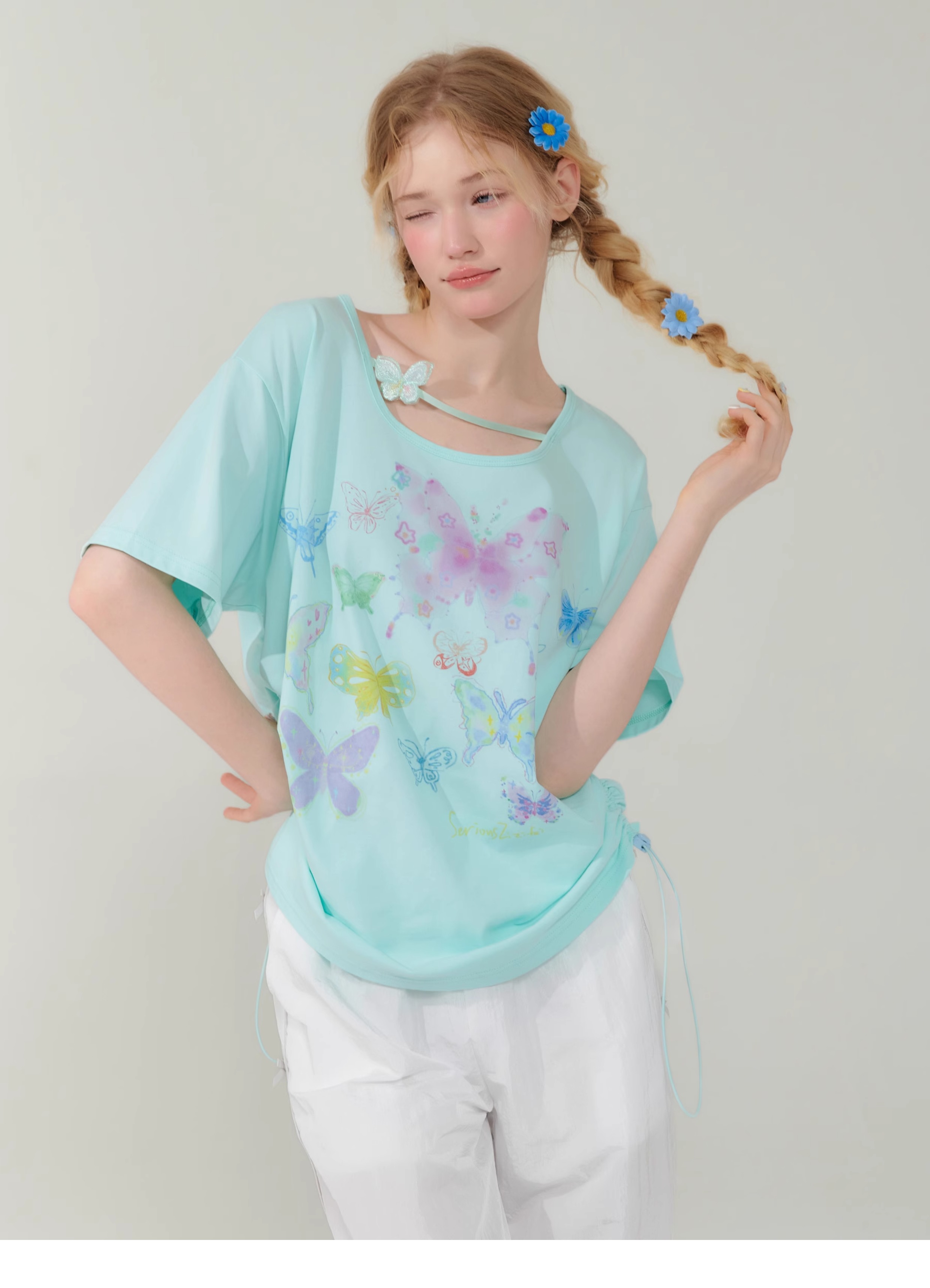 Butterfly Printed Drawstring T-shirt | Loose Fit Retro Short Sleeve for Summer