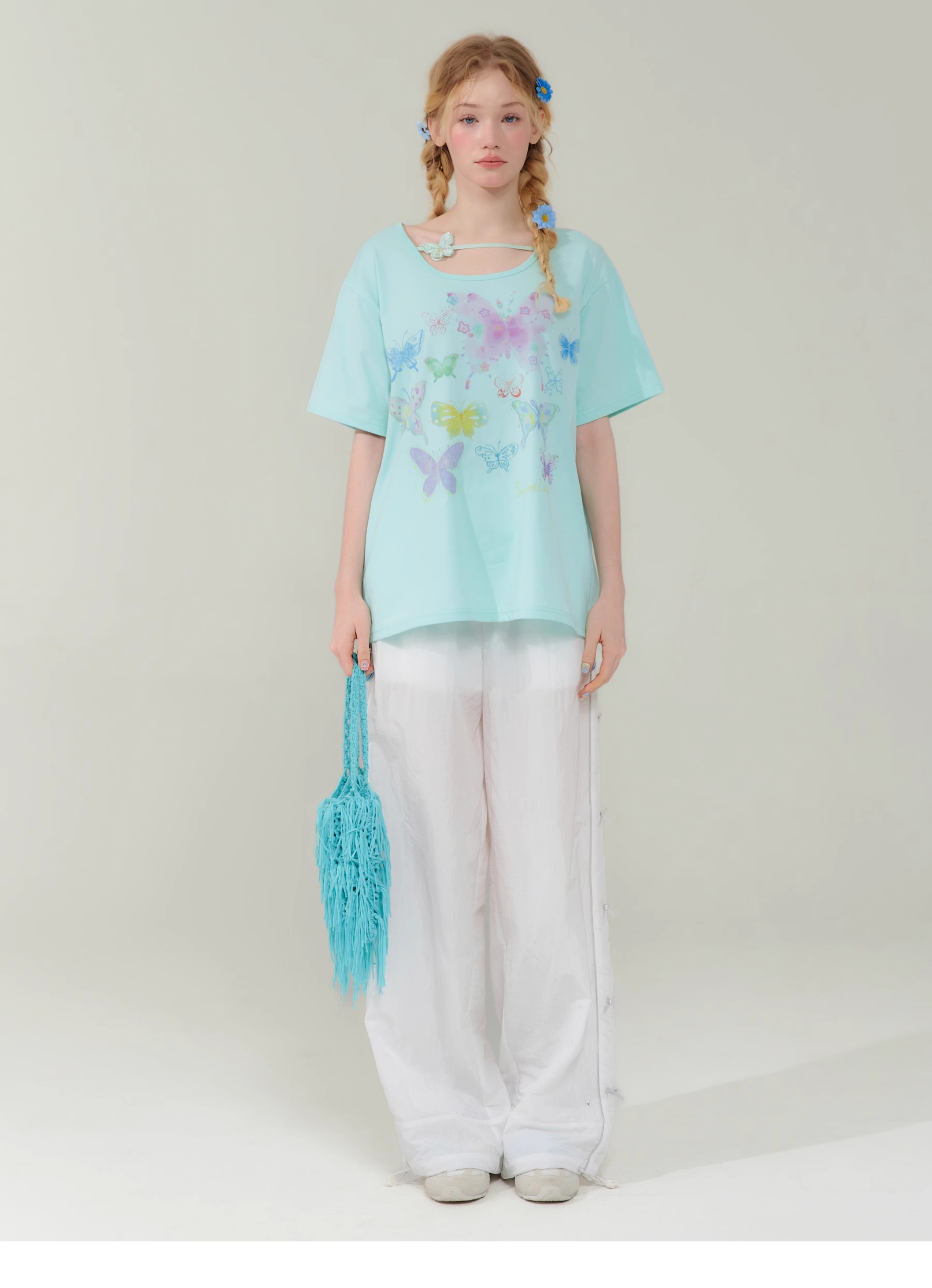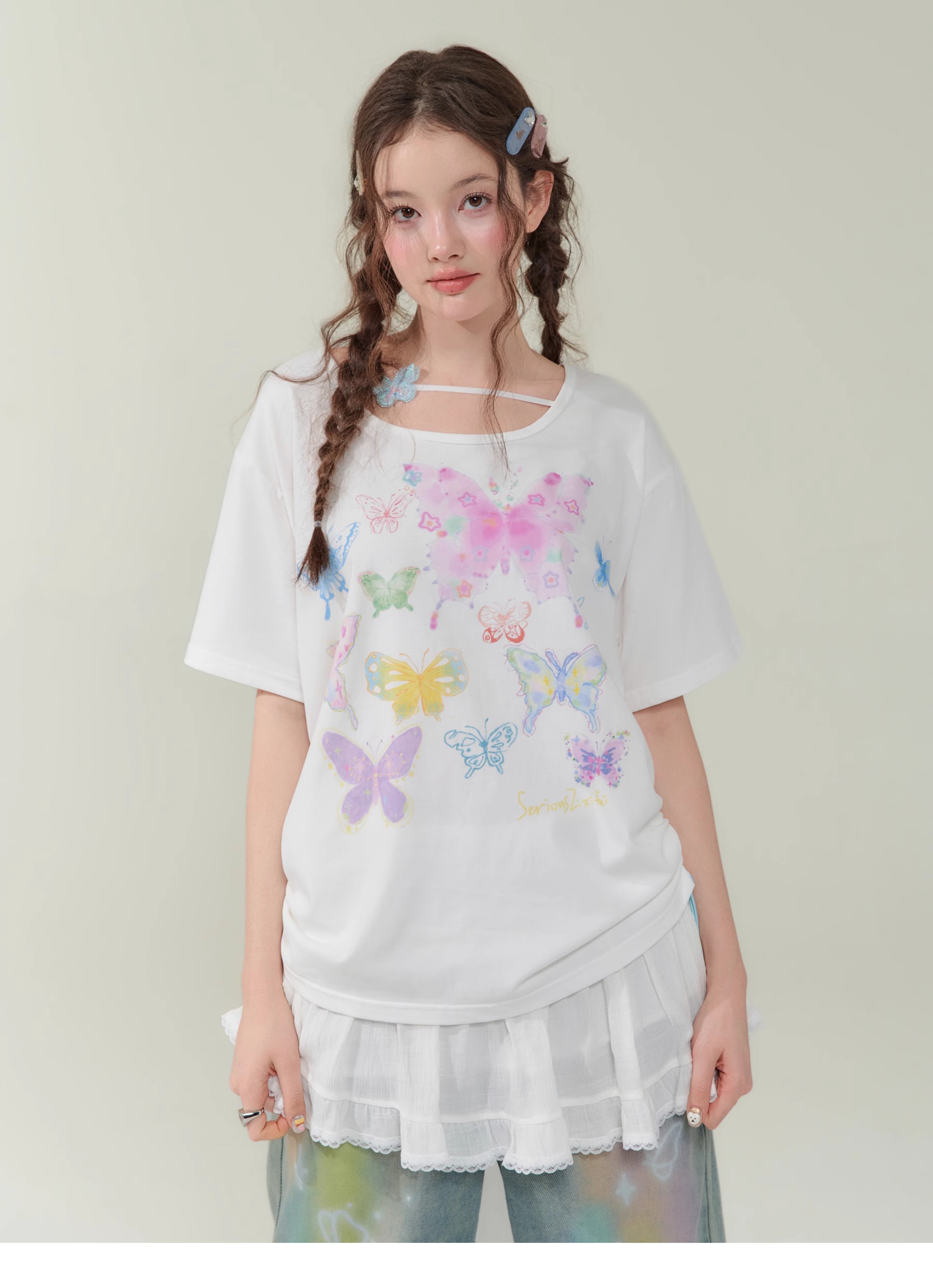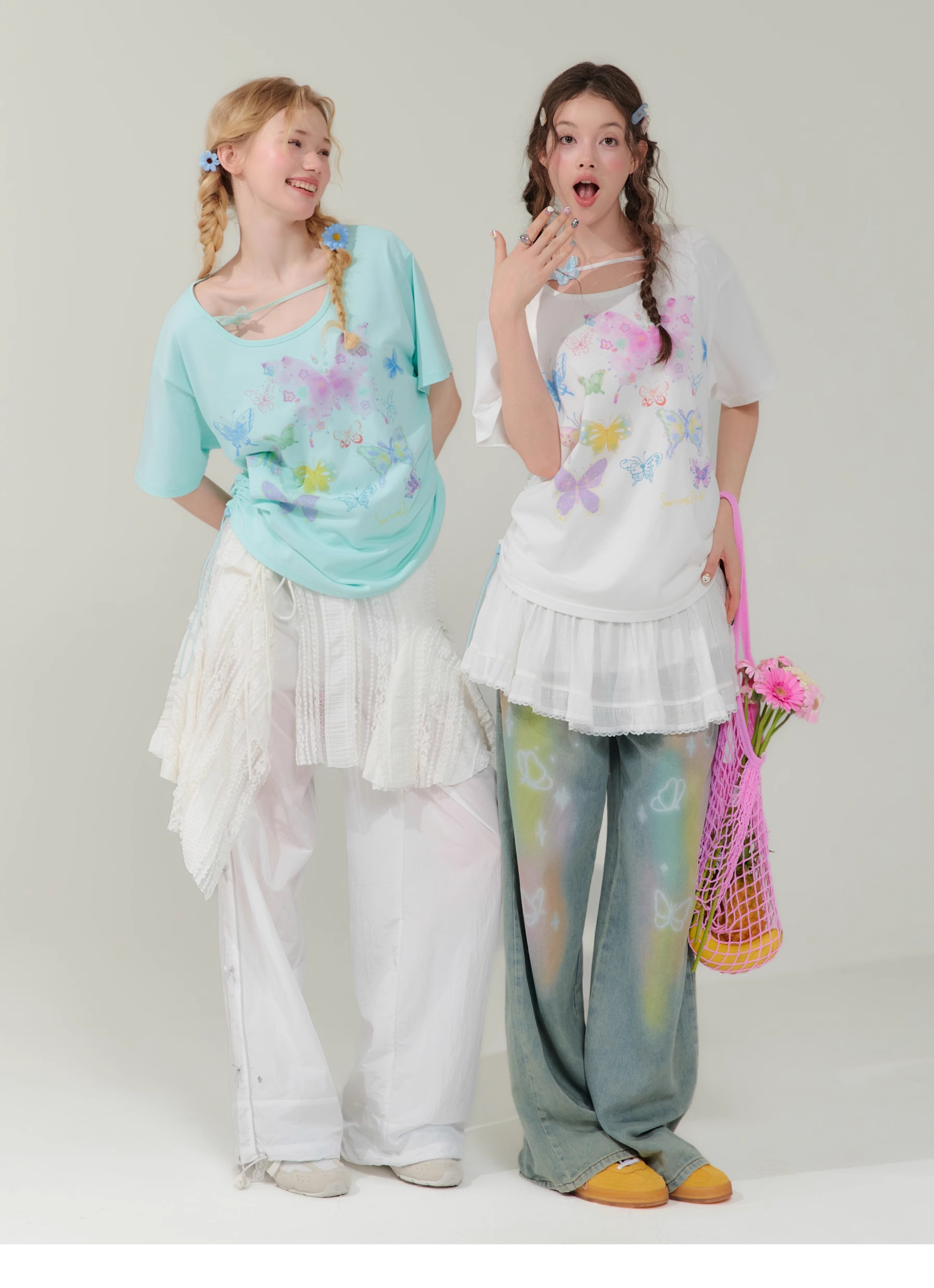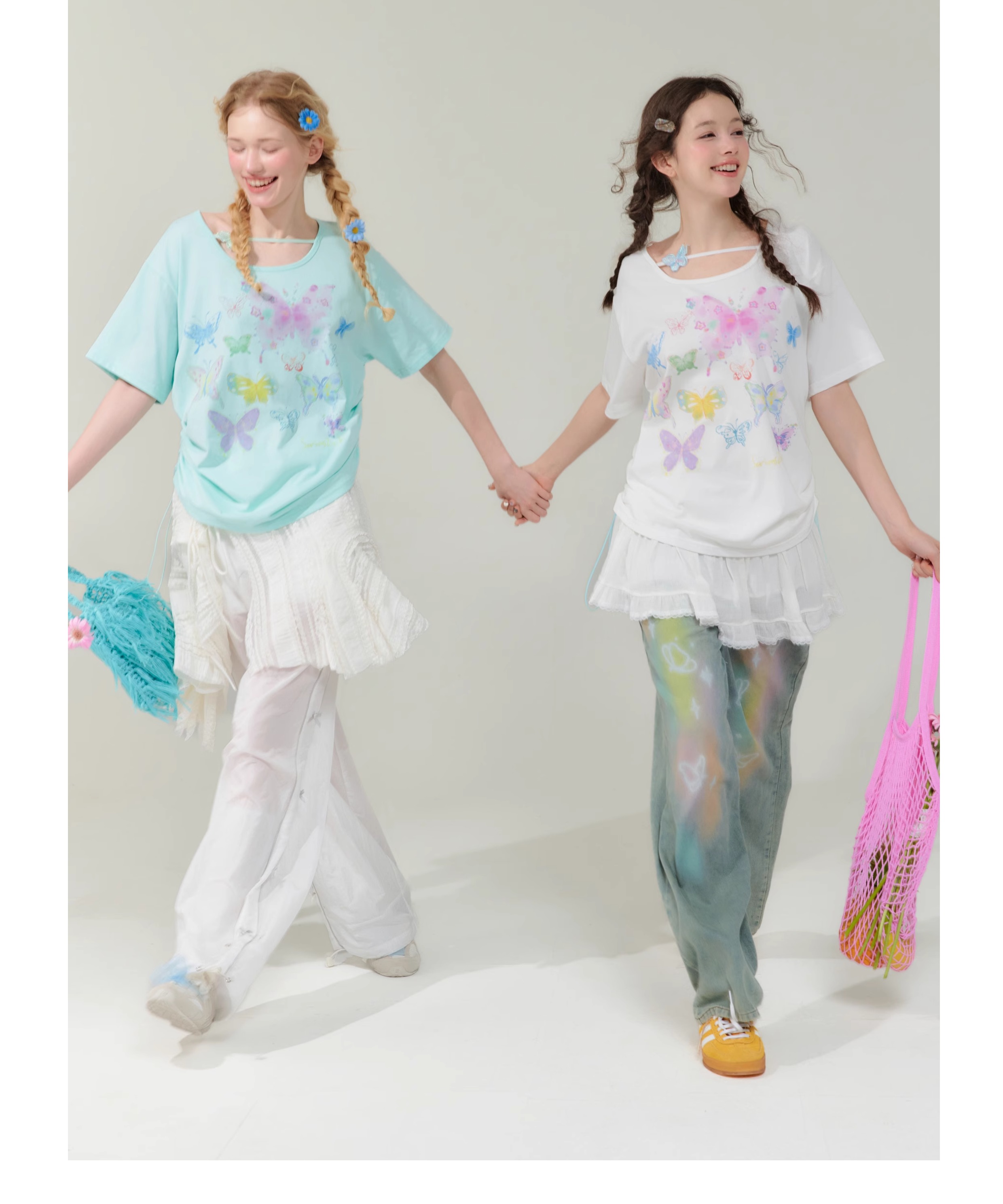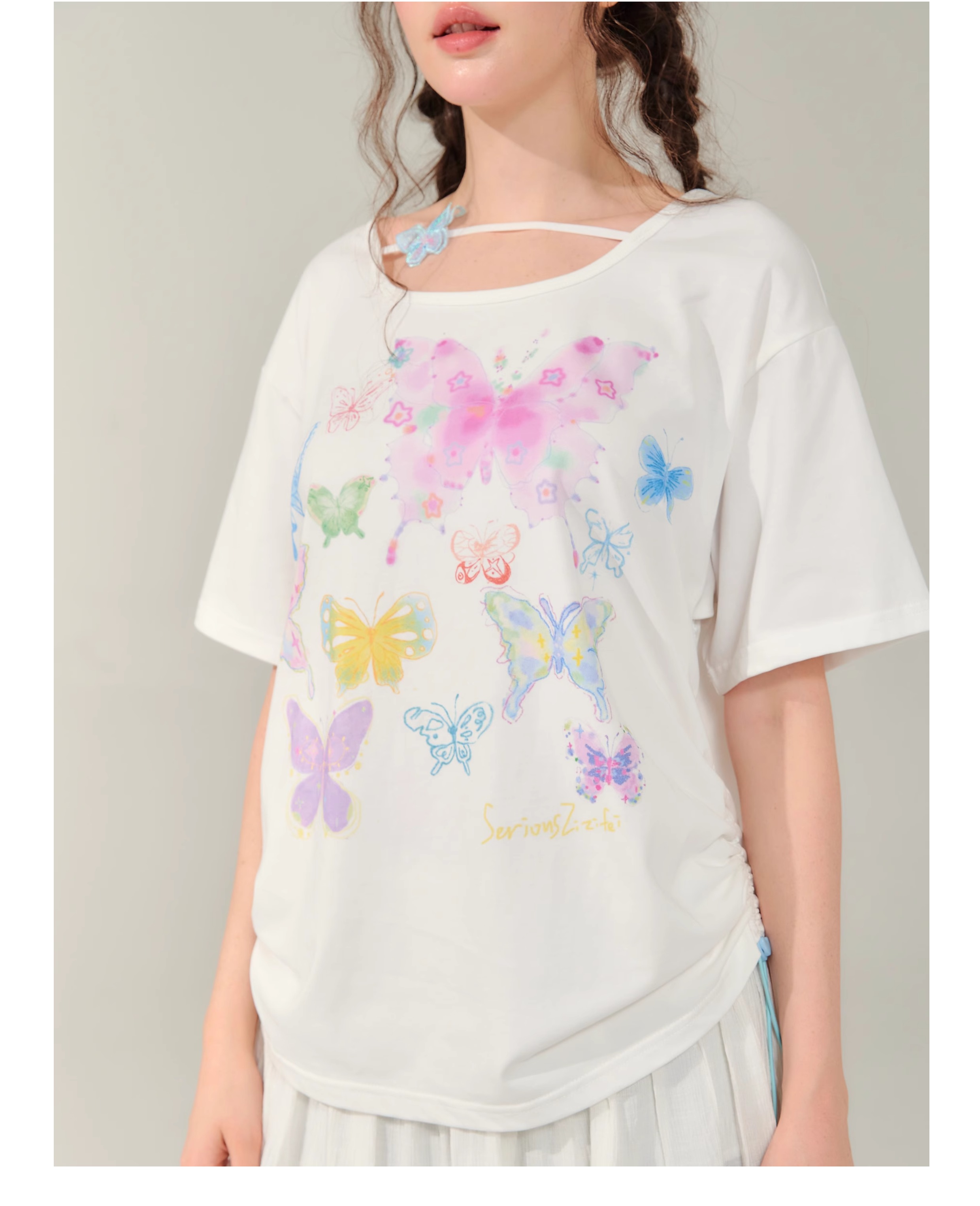 Butterfly Printed Drawstring T-shirt | Loose Fit Retro Short Sleeve for Summer