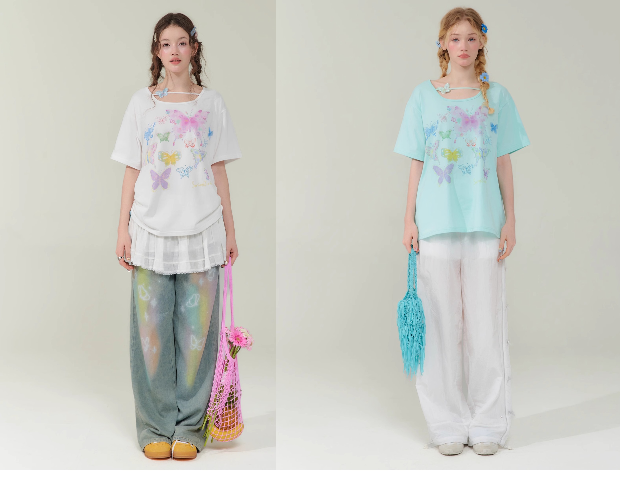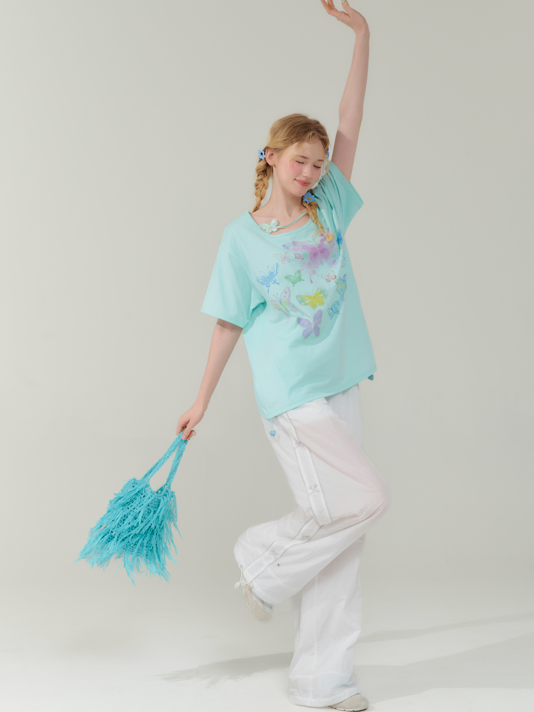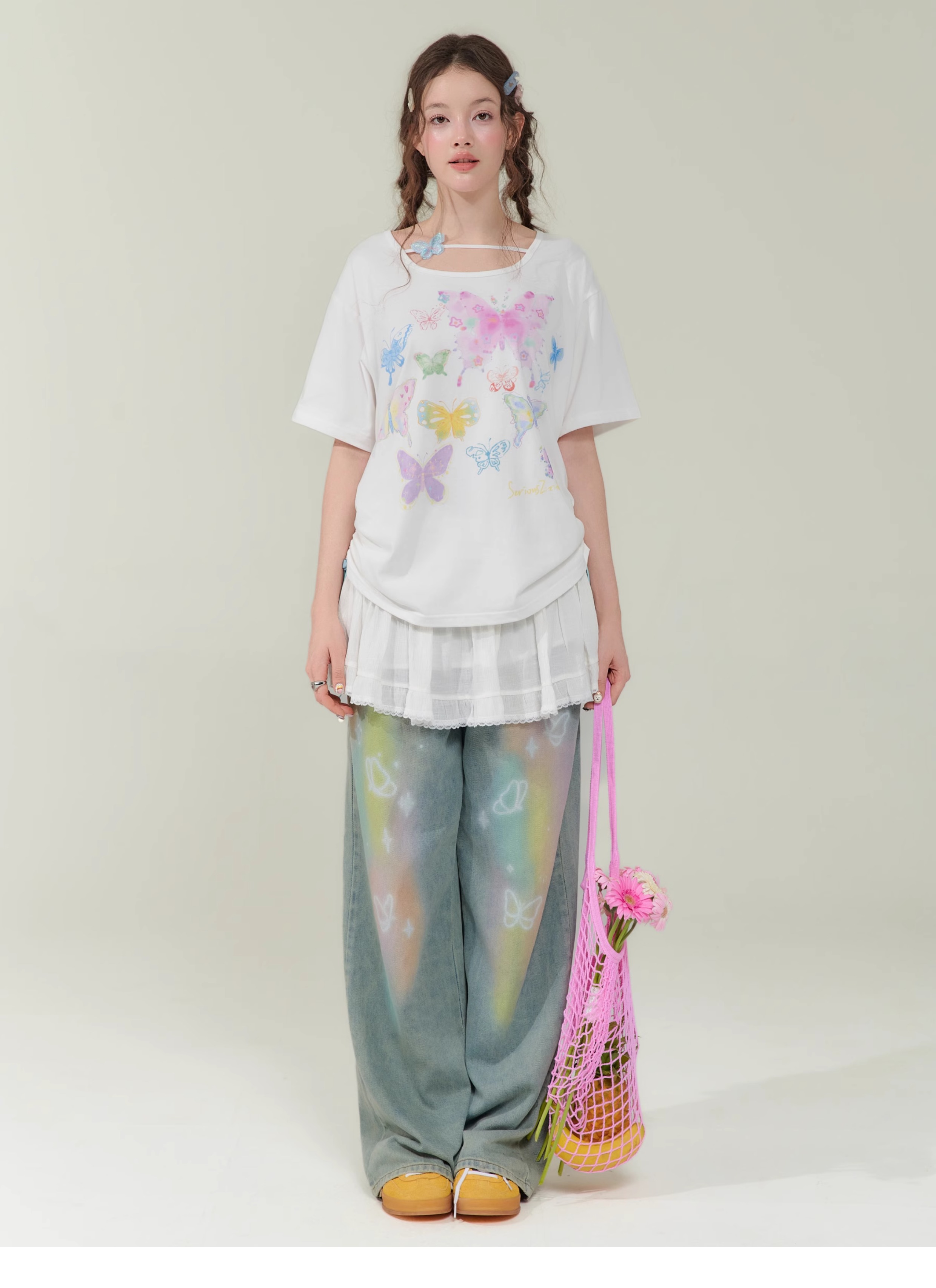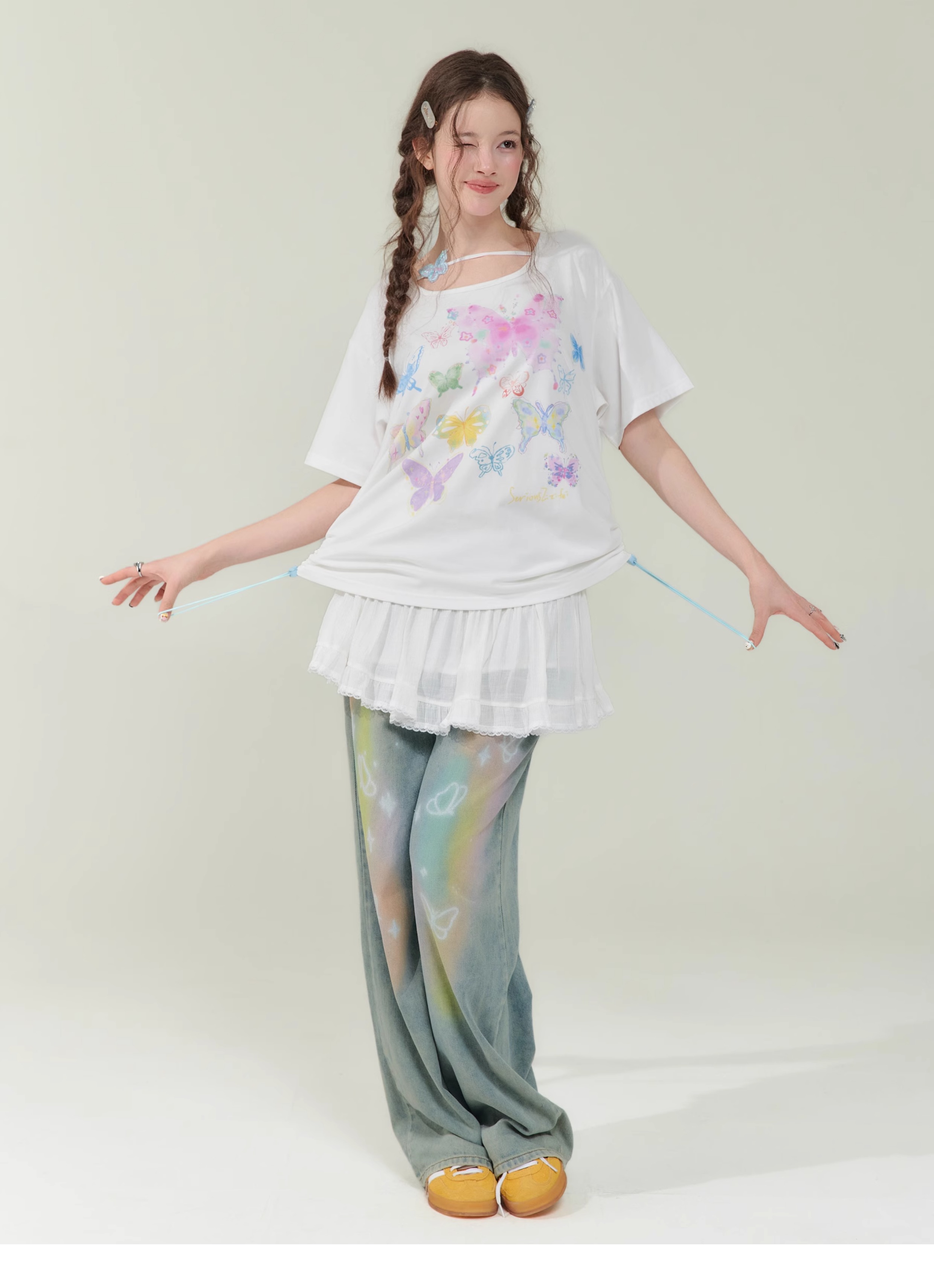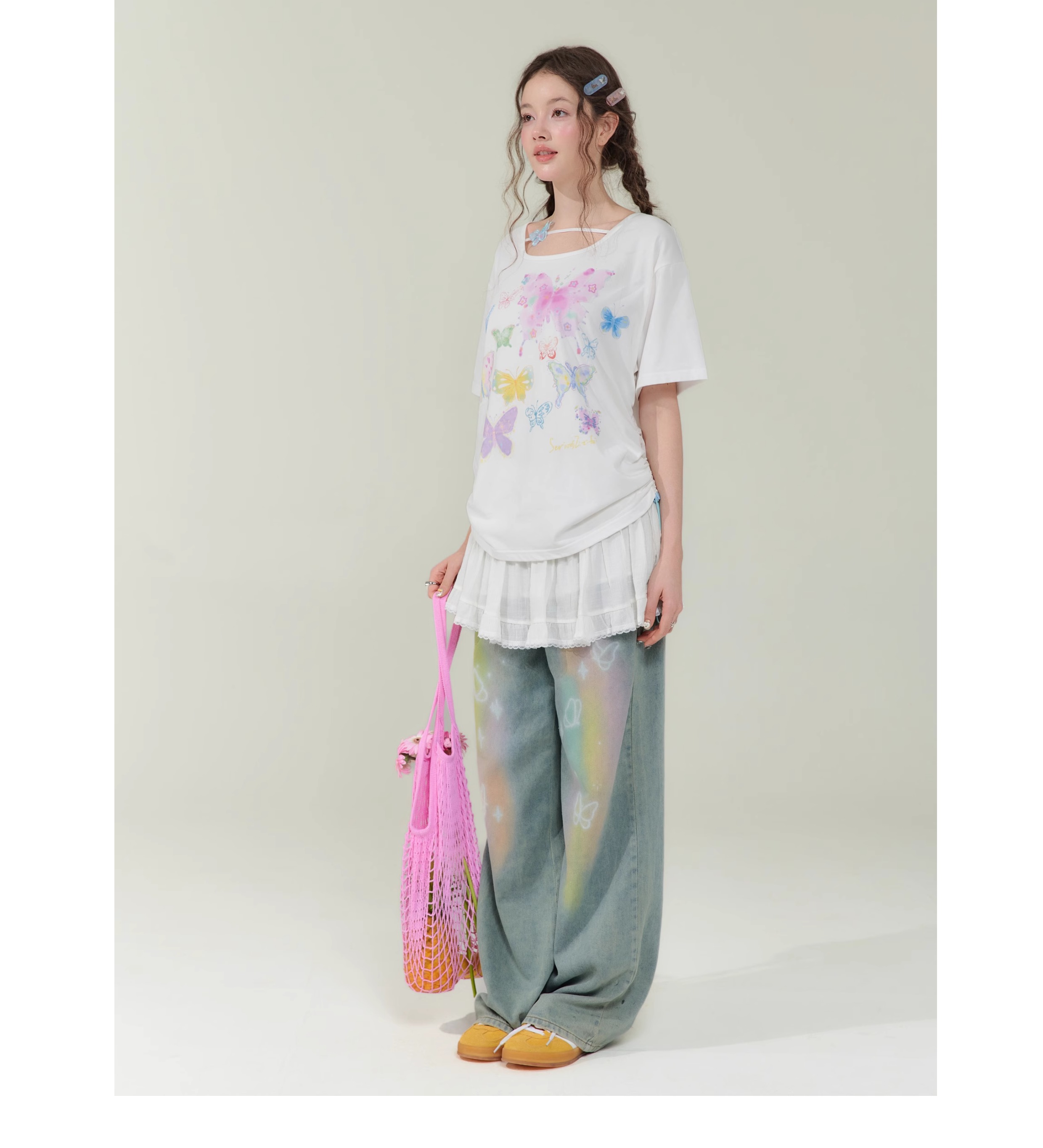 Butterfly Printed Drawstring T-shirt | Loose Fit Retro Short Sleeve for Summer