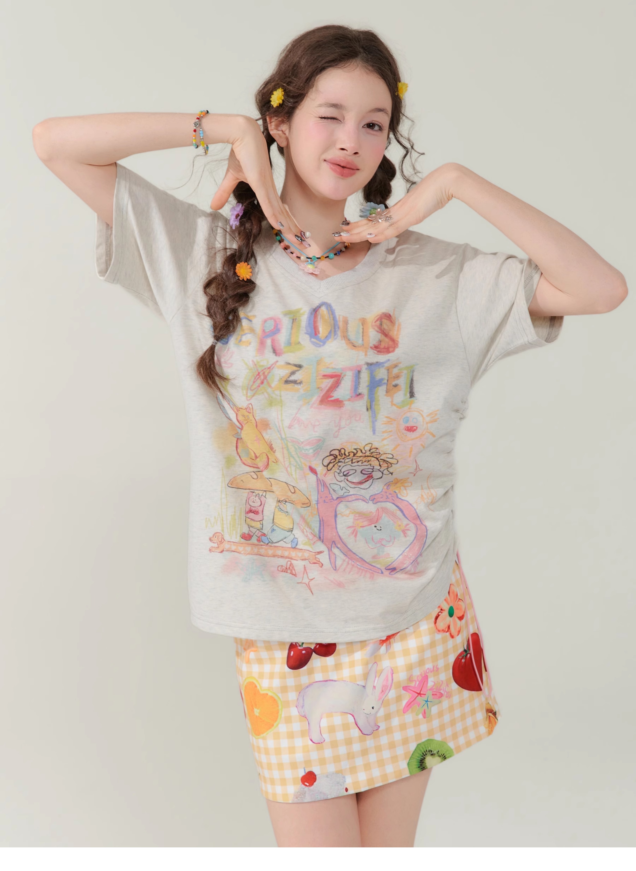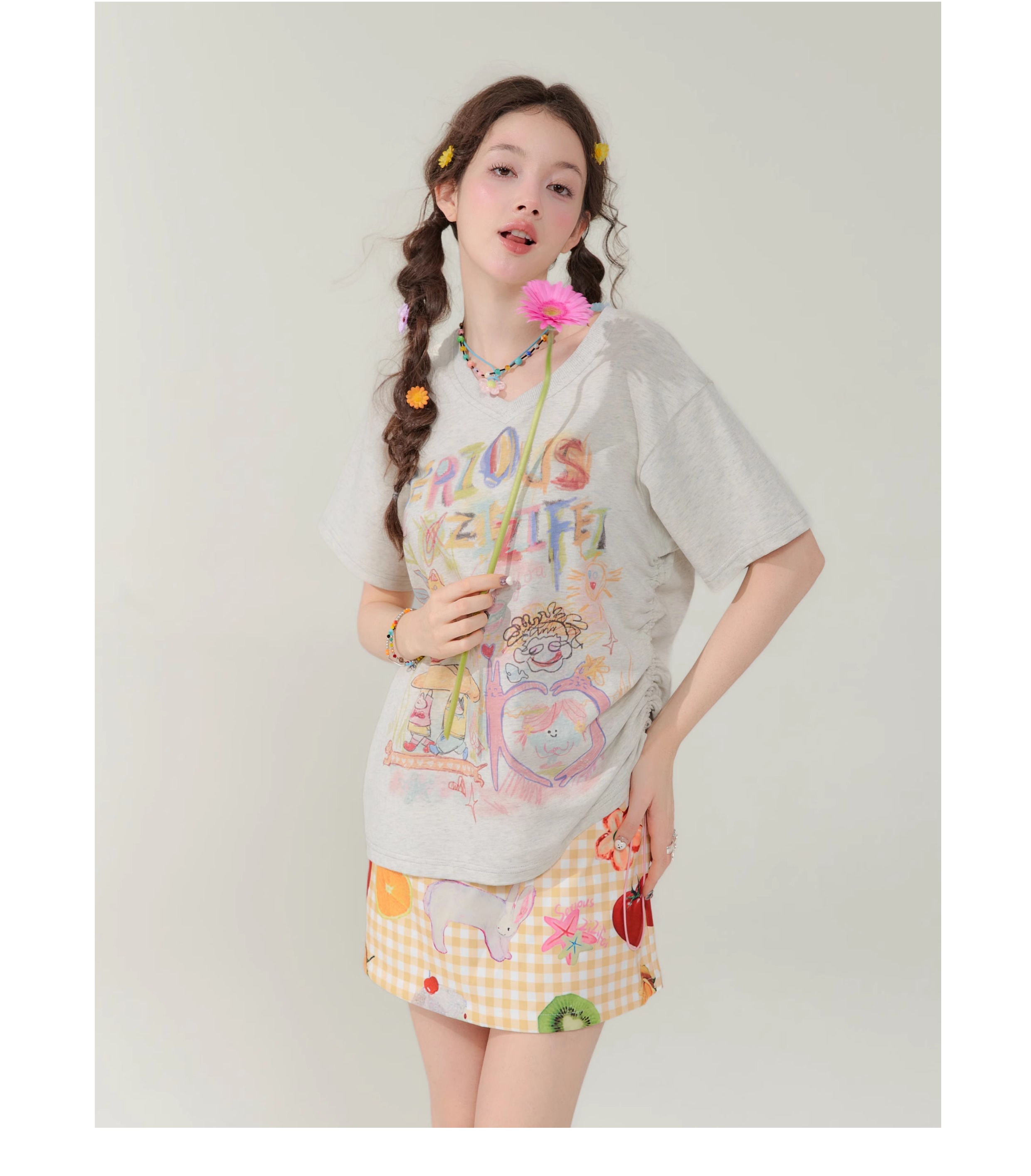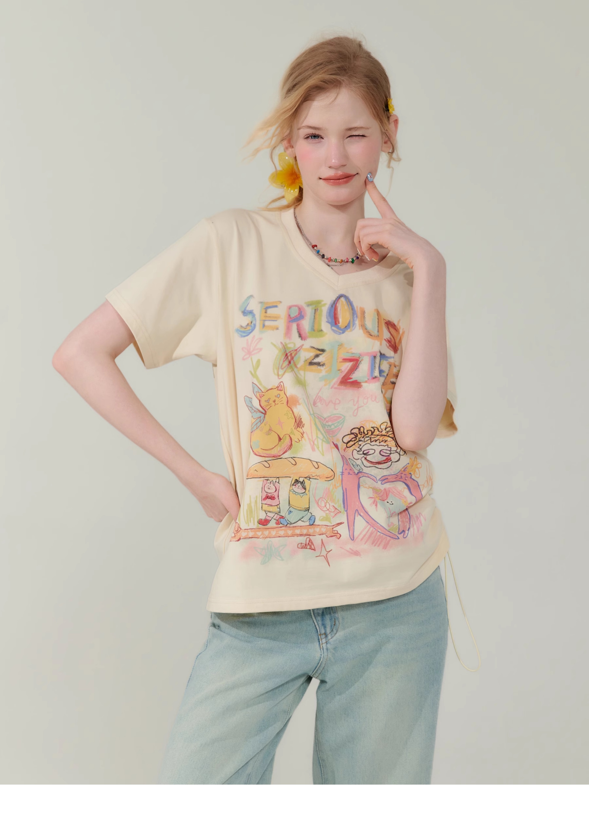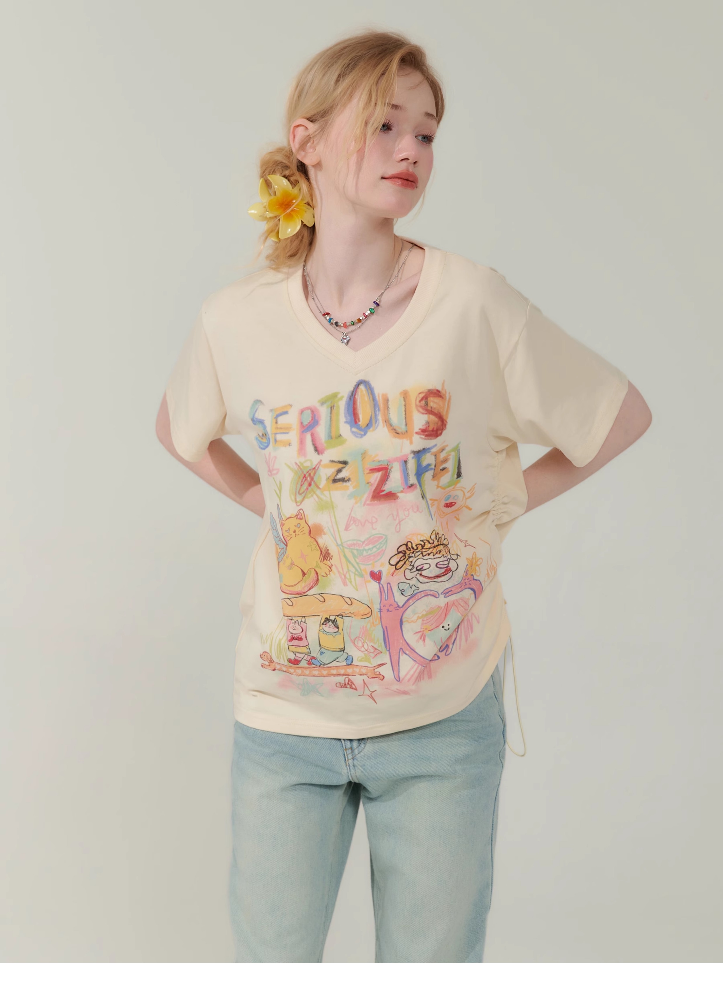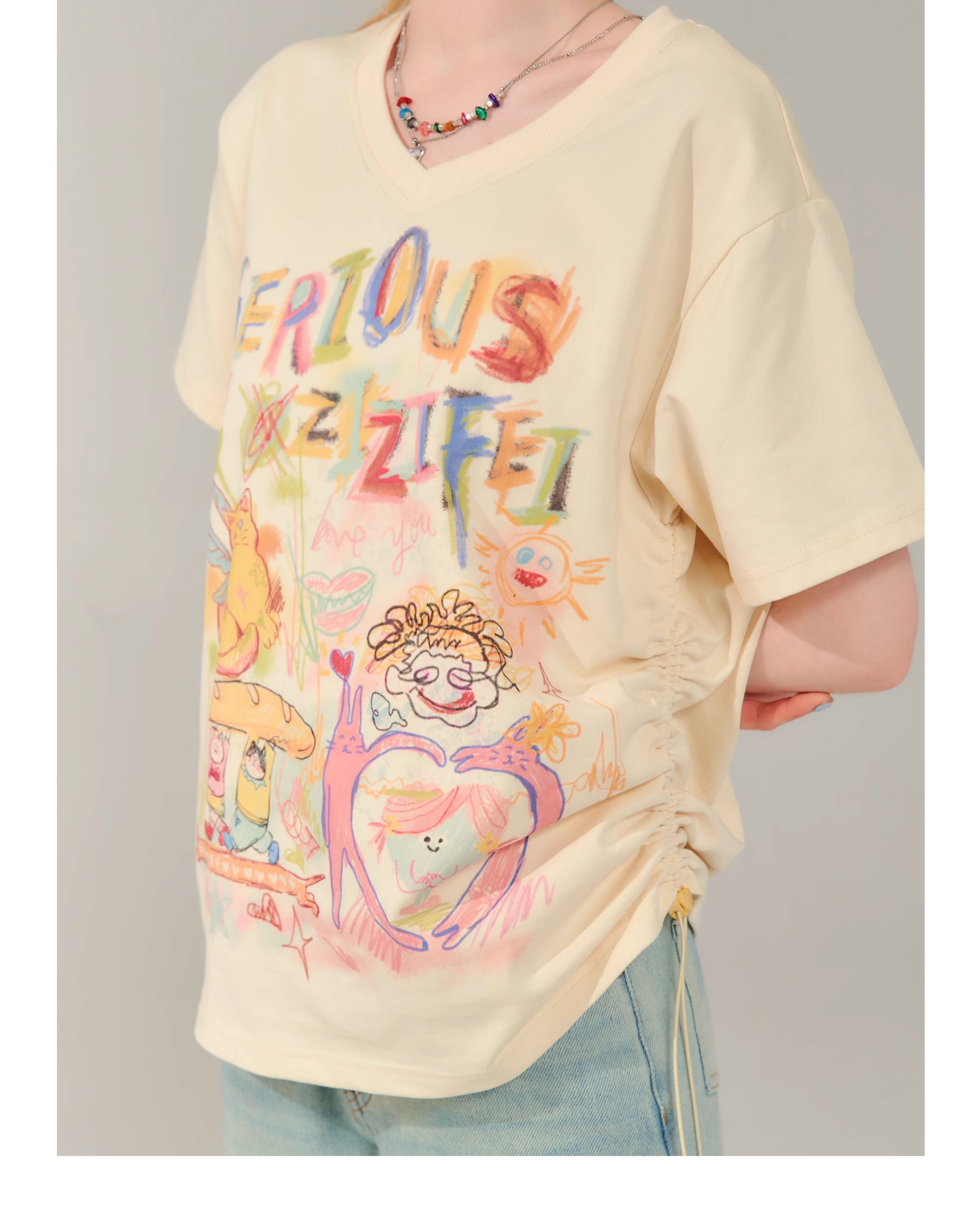 Graffiti Printed Drawstring T-shirt | V-neck Retro Short Sleeve Design for Summer