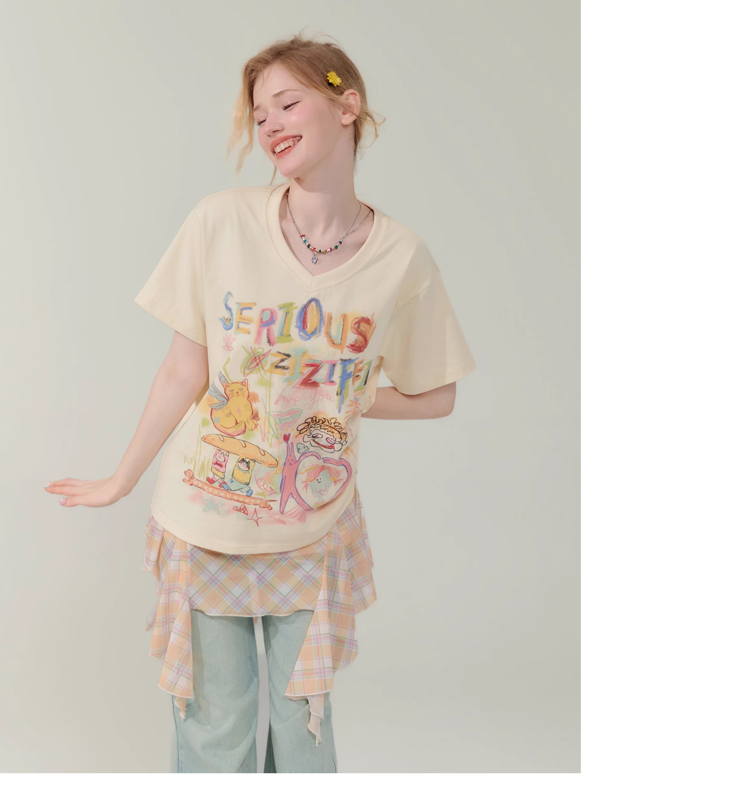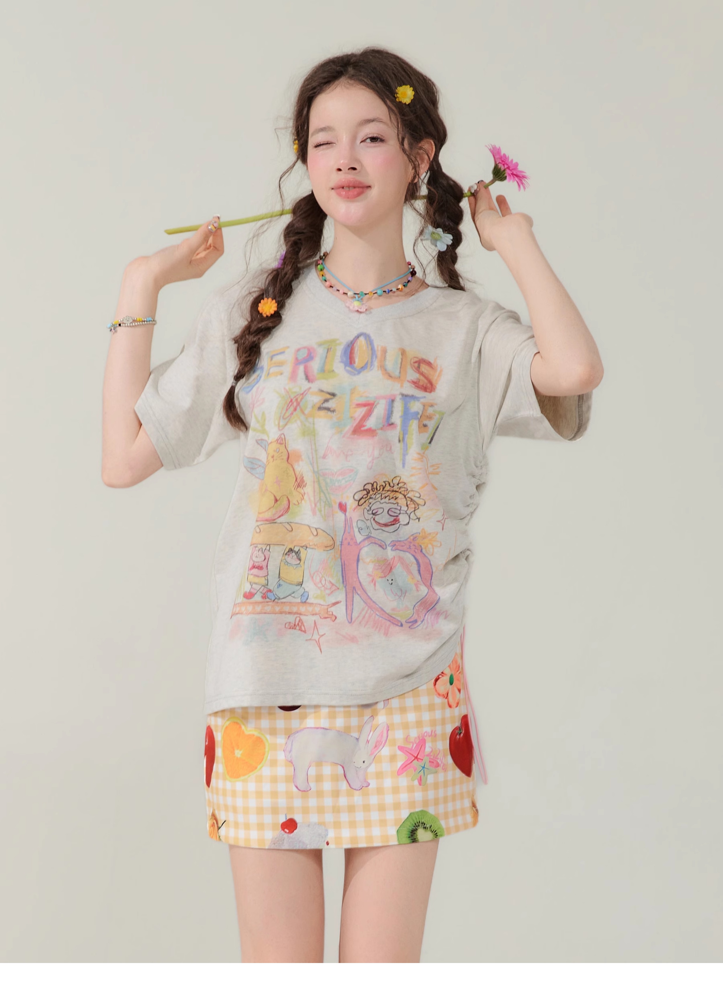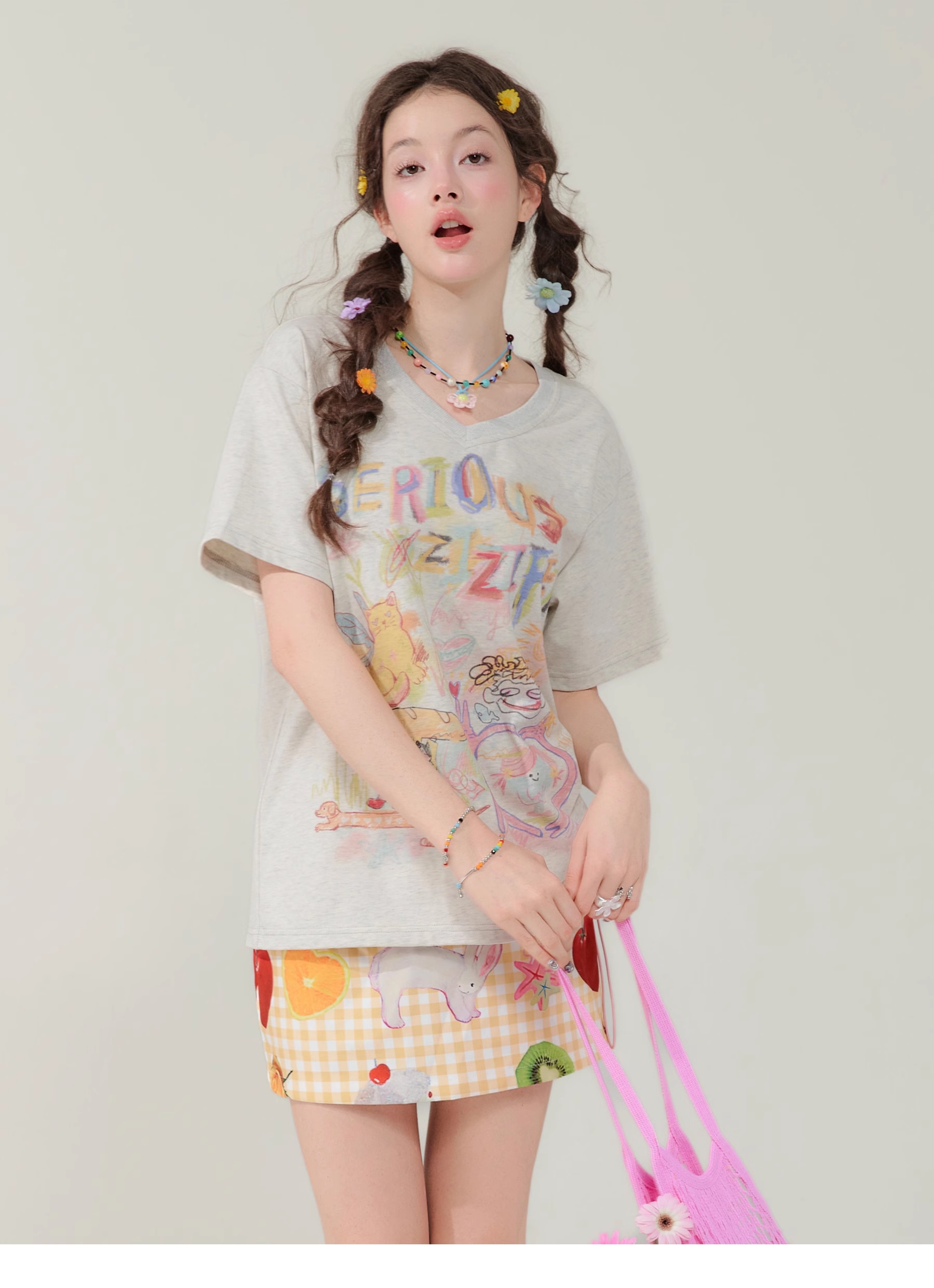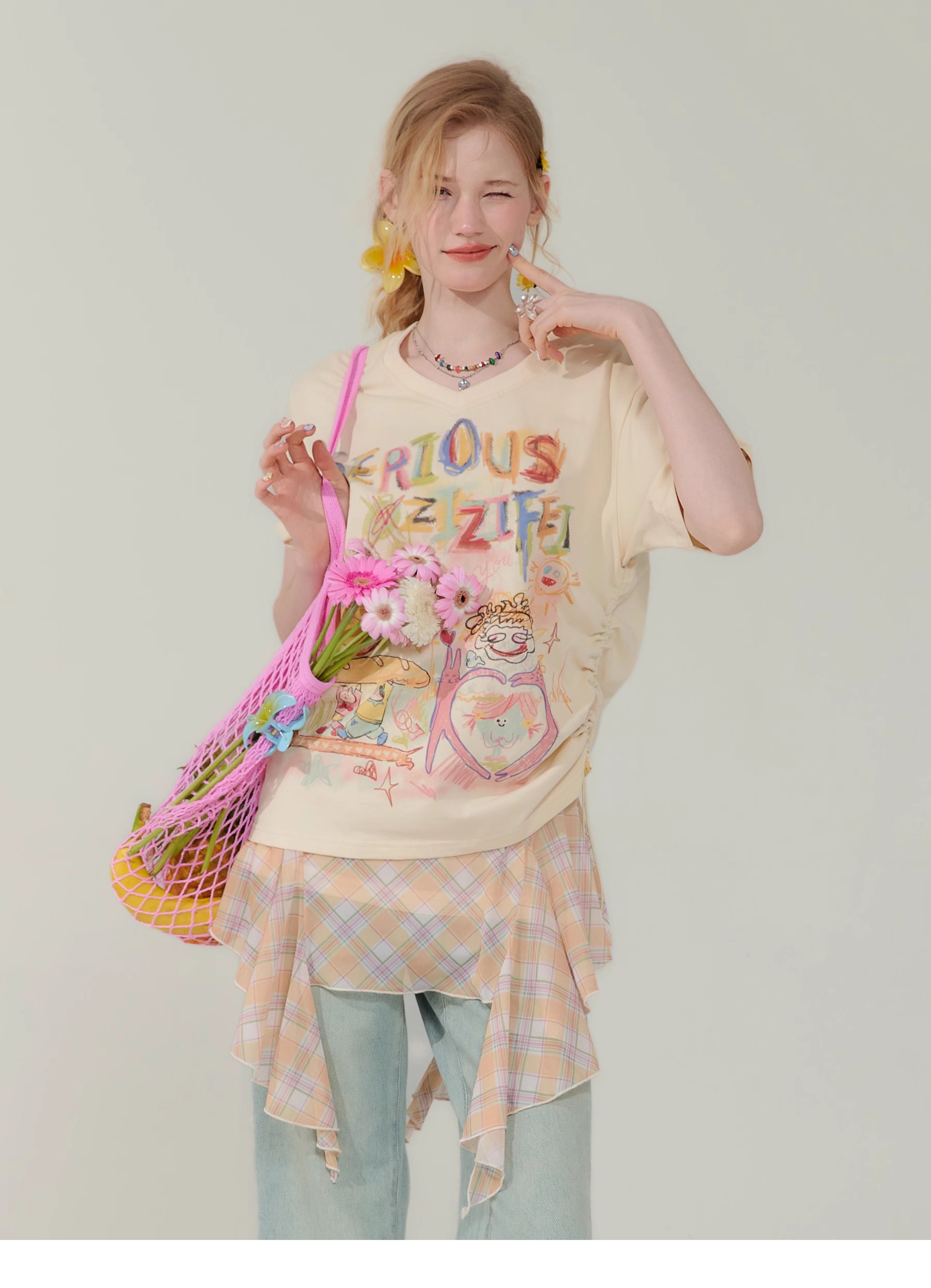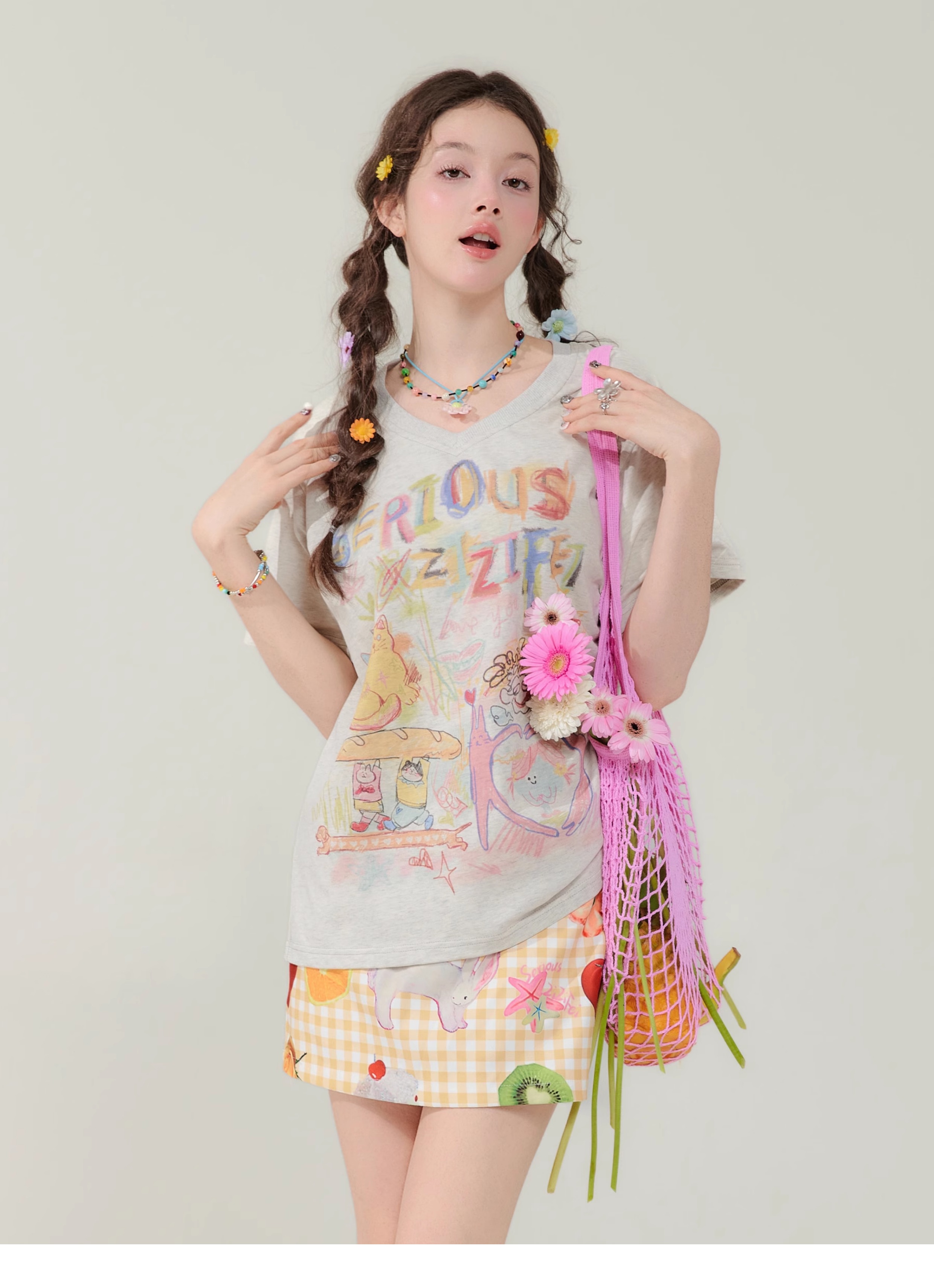 Graffiti Printed Drawstring T-shirt | V-neck Retro Short Sleeve Design for Summer