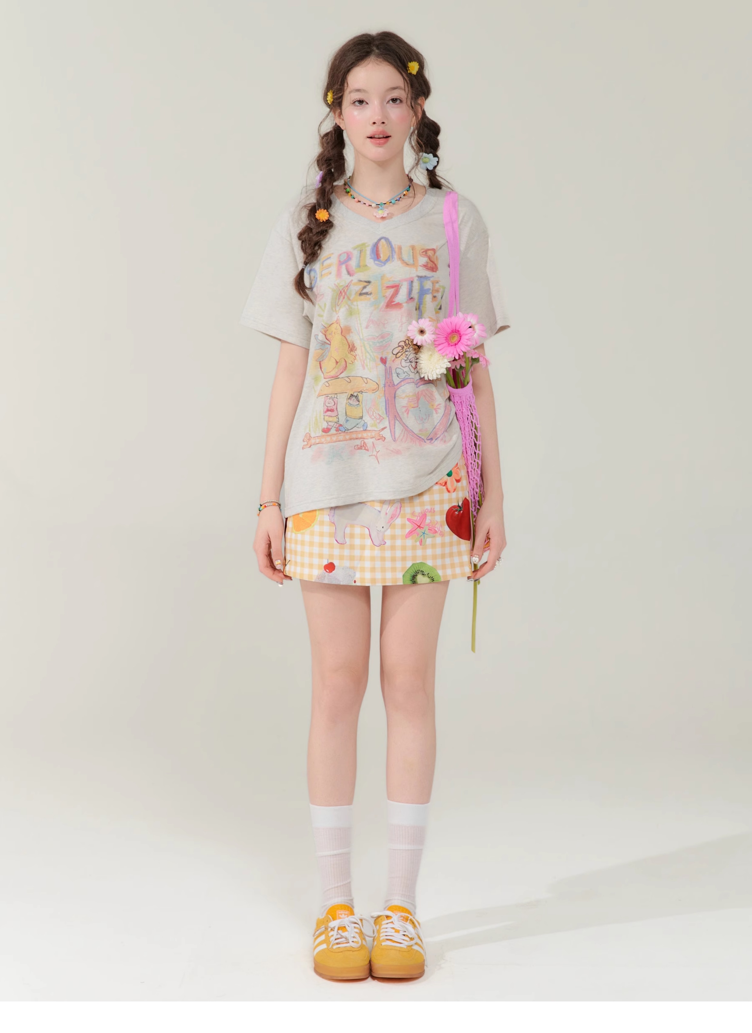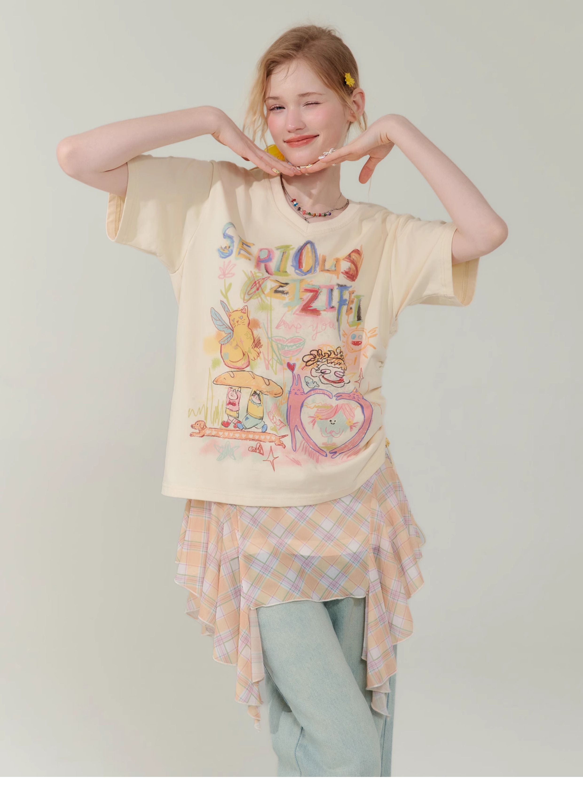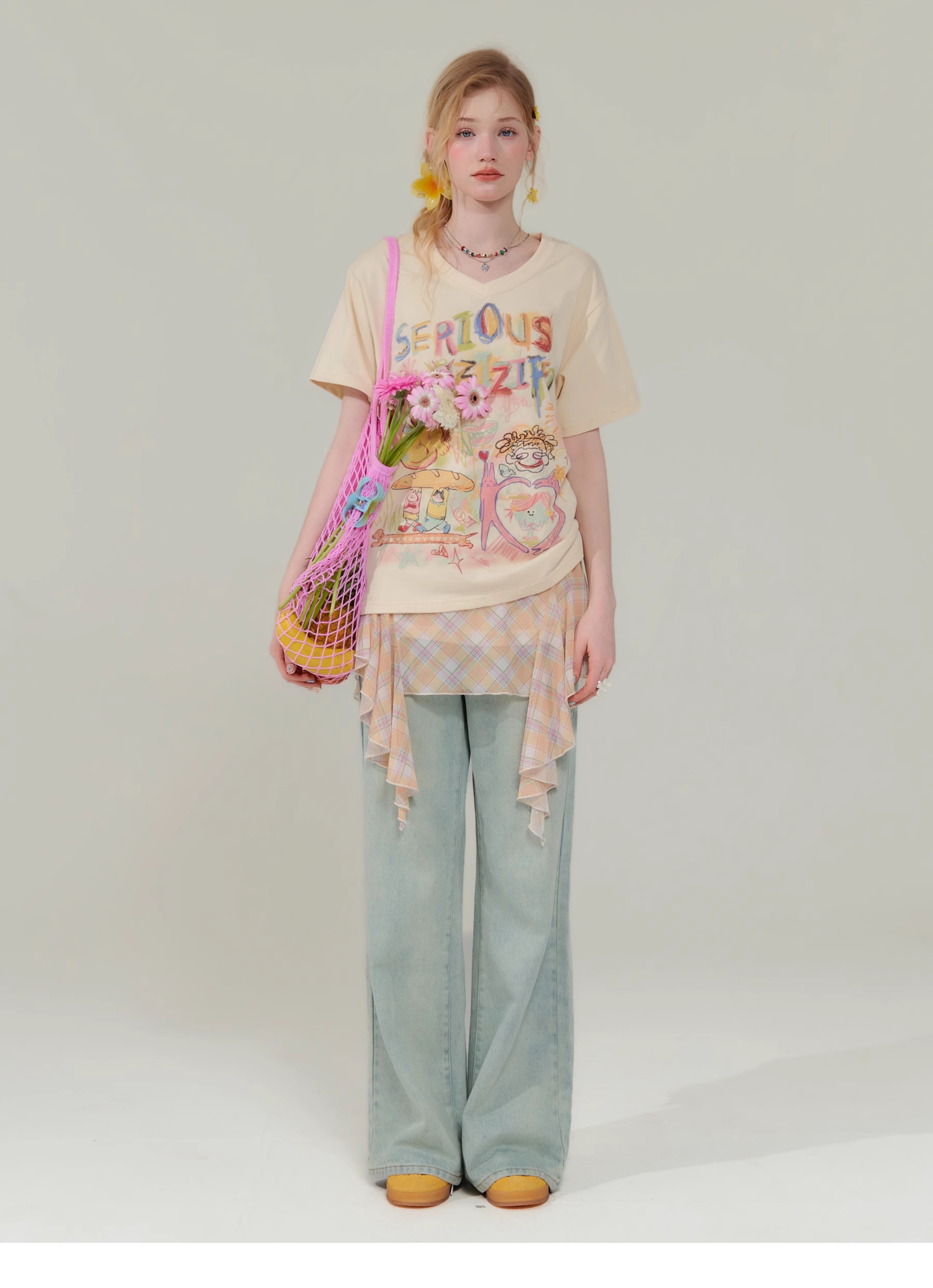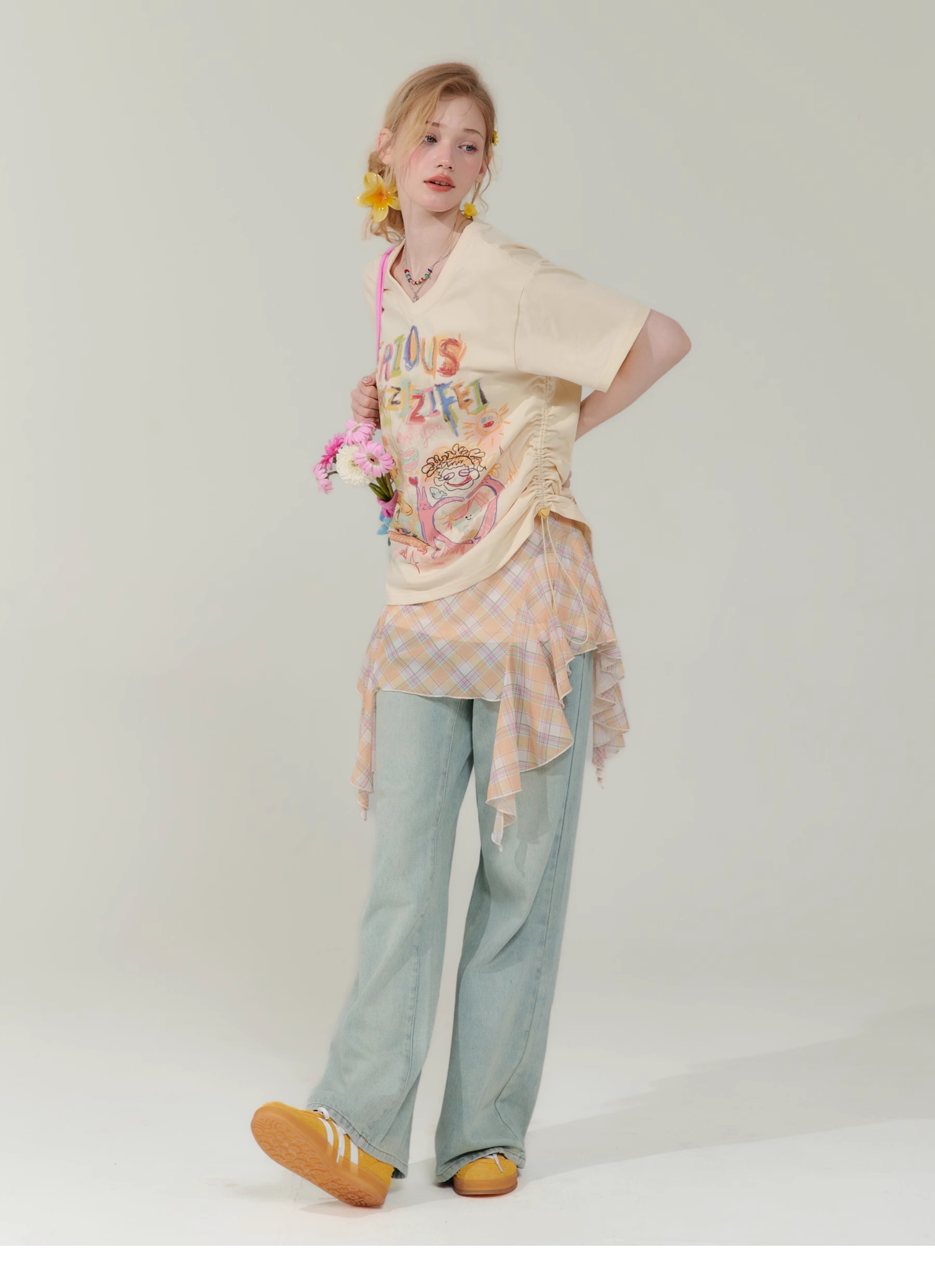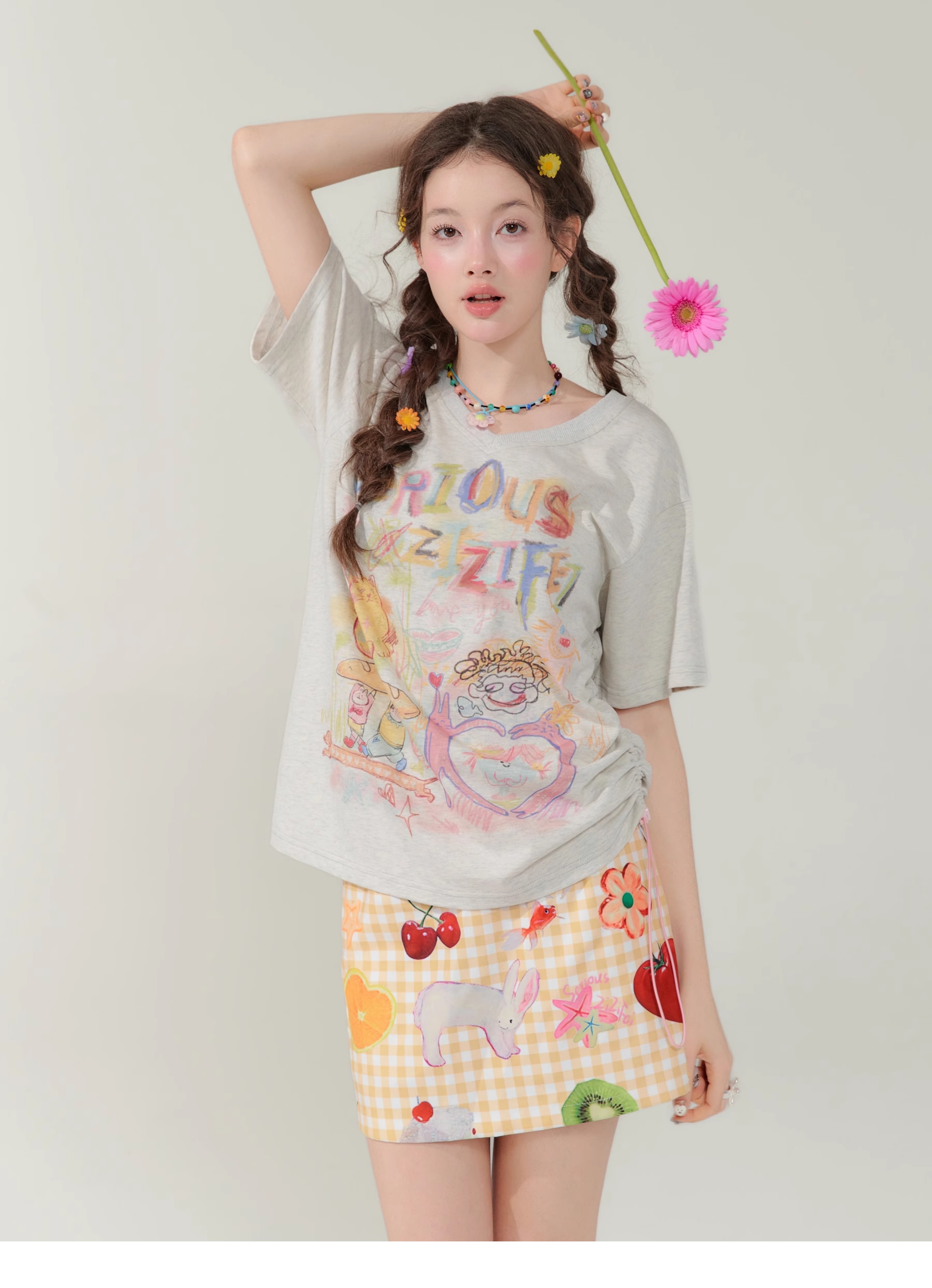 Graffiti Printed Drawstring T-shirt | V-neck Retro Short Sleeve Design for Summer
