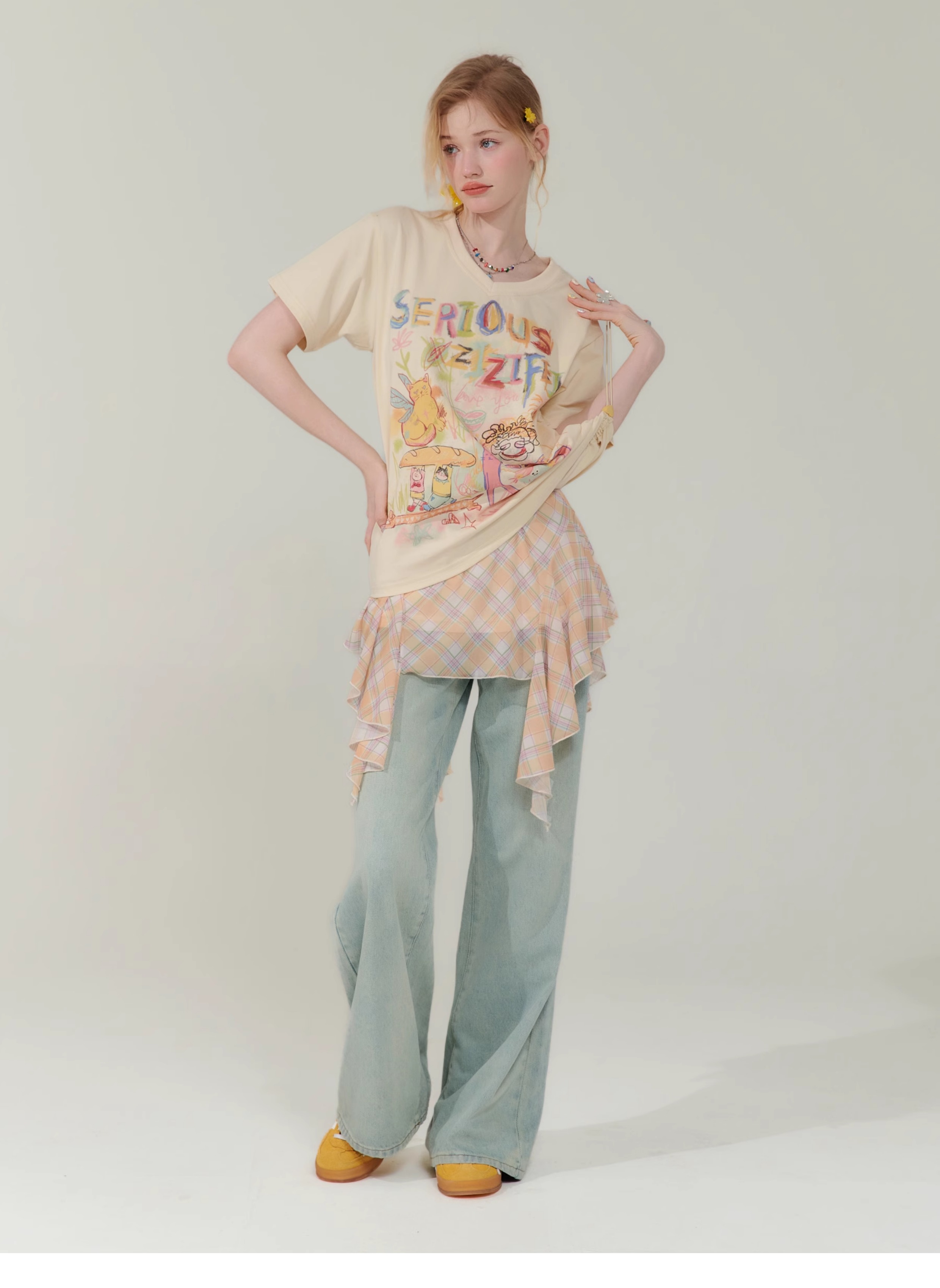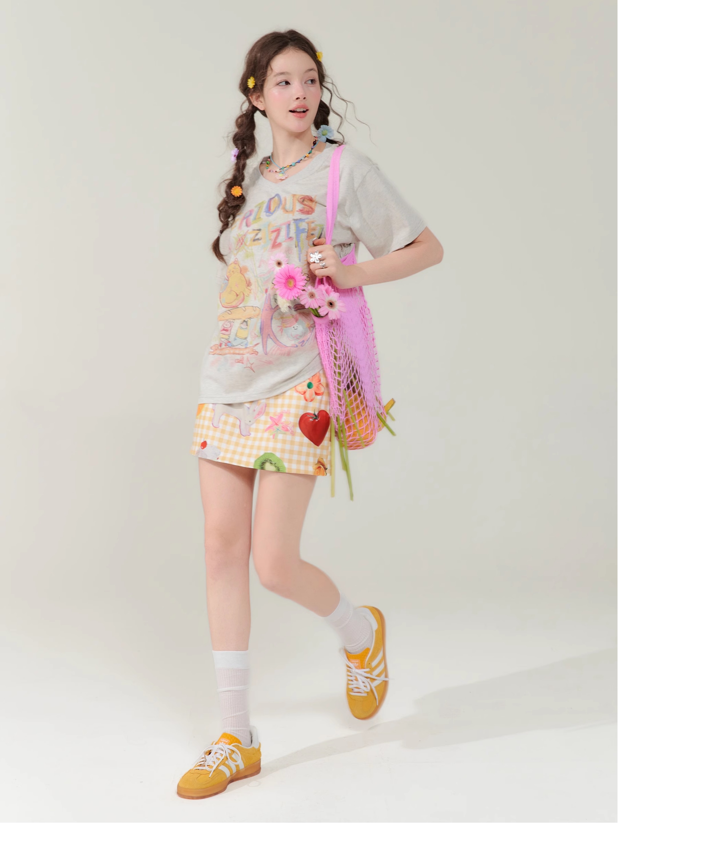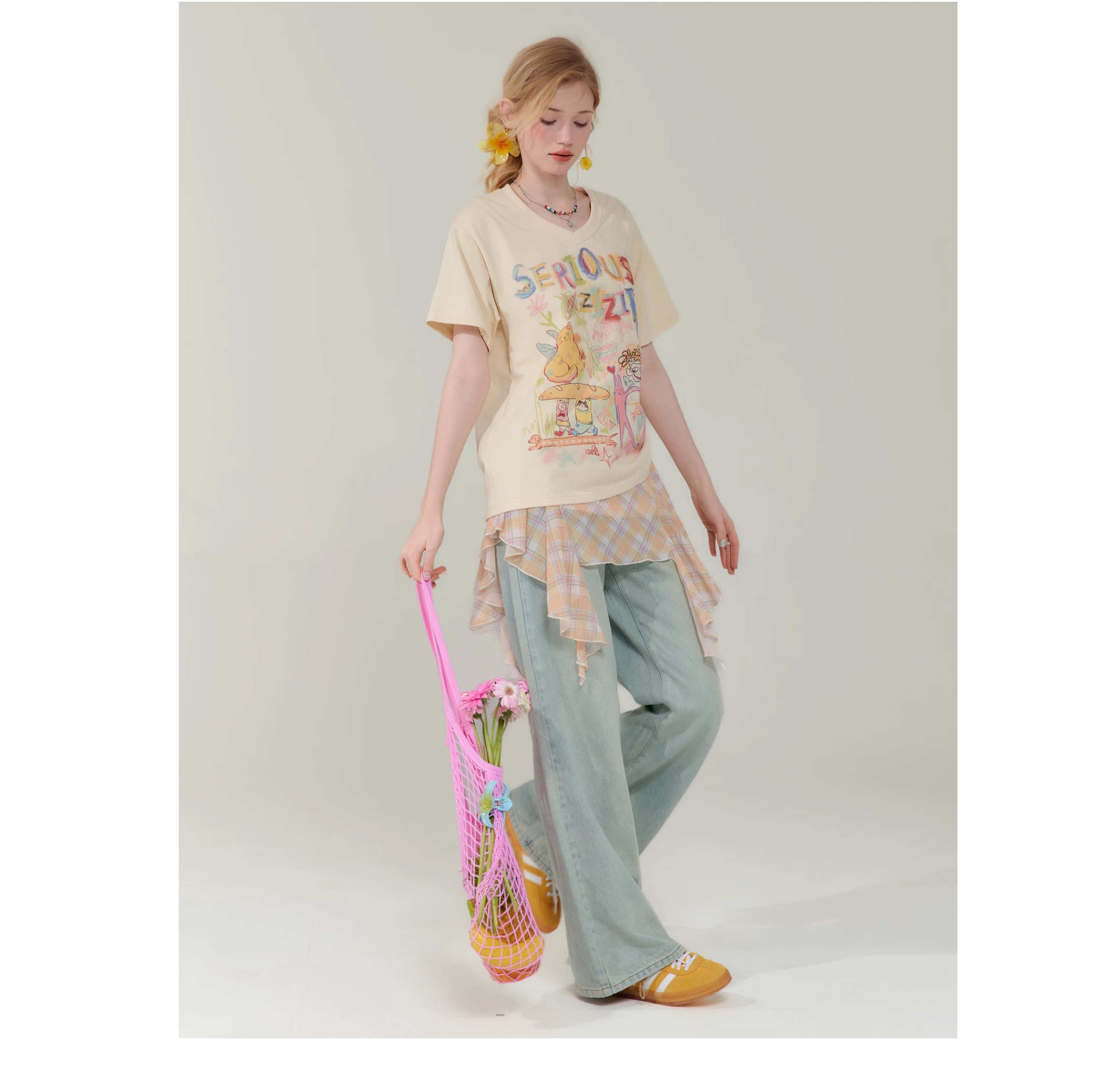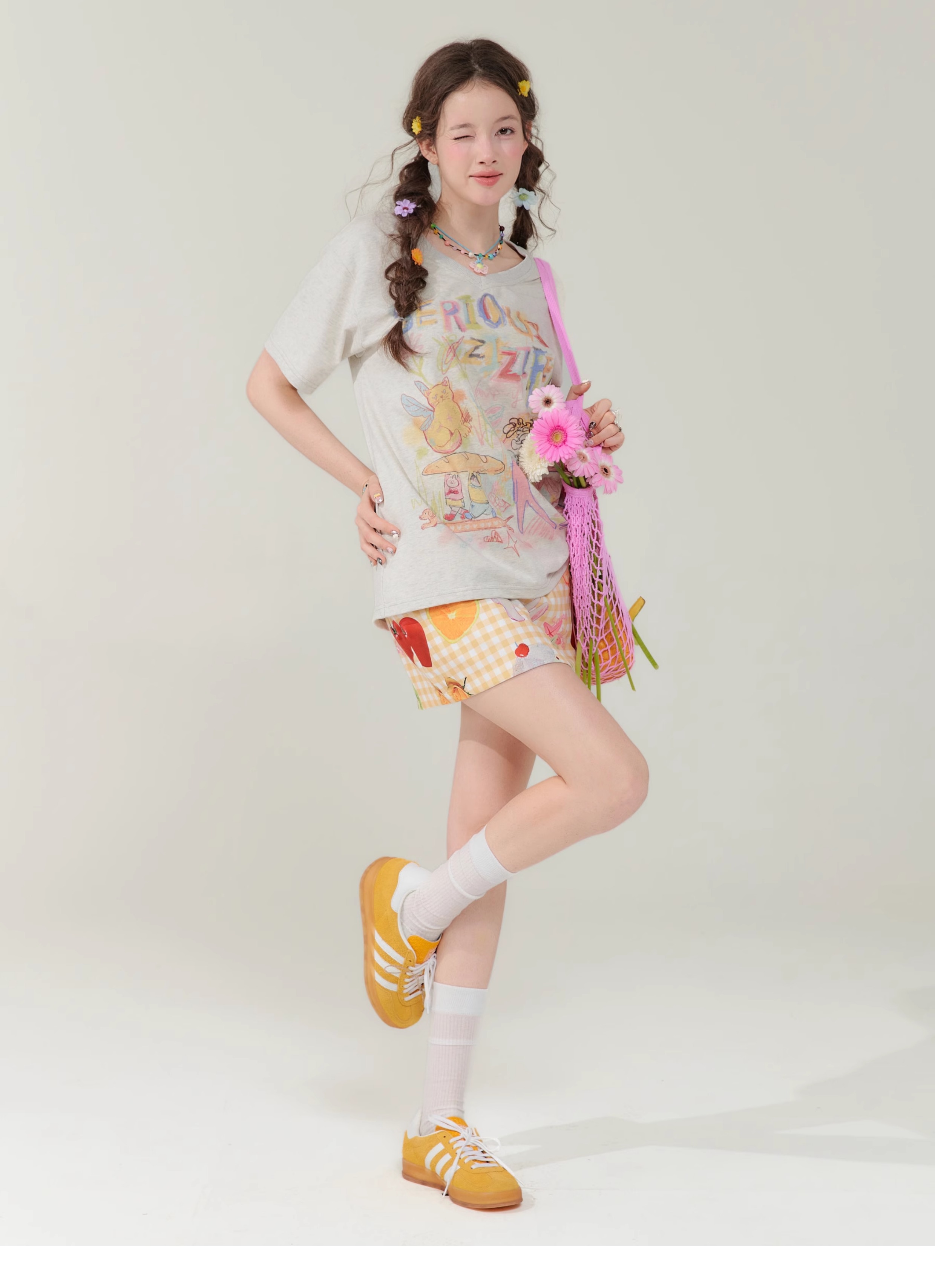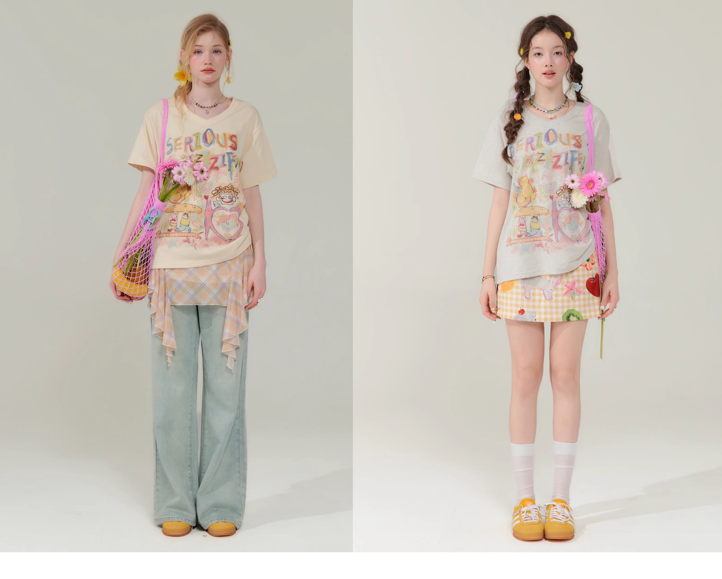 Graffiti Printed Drawstring T-shirt | V-neck Retro Short Sleeve Design for Summer