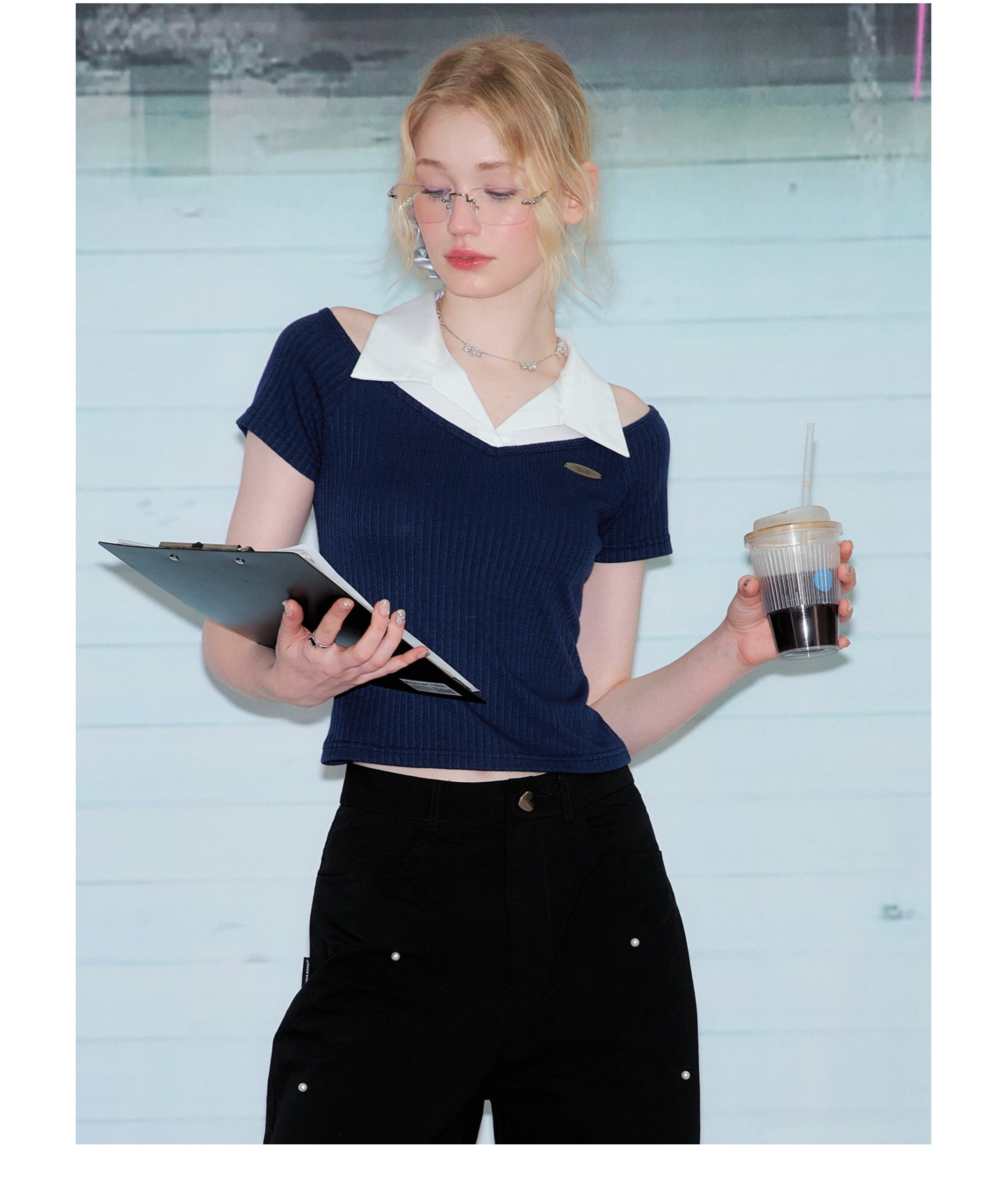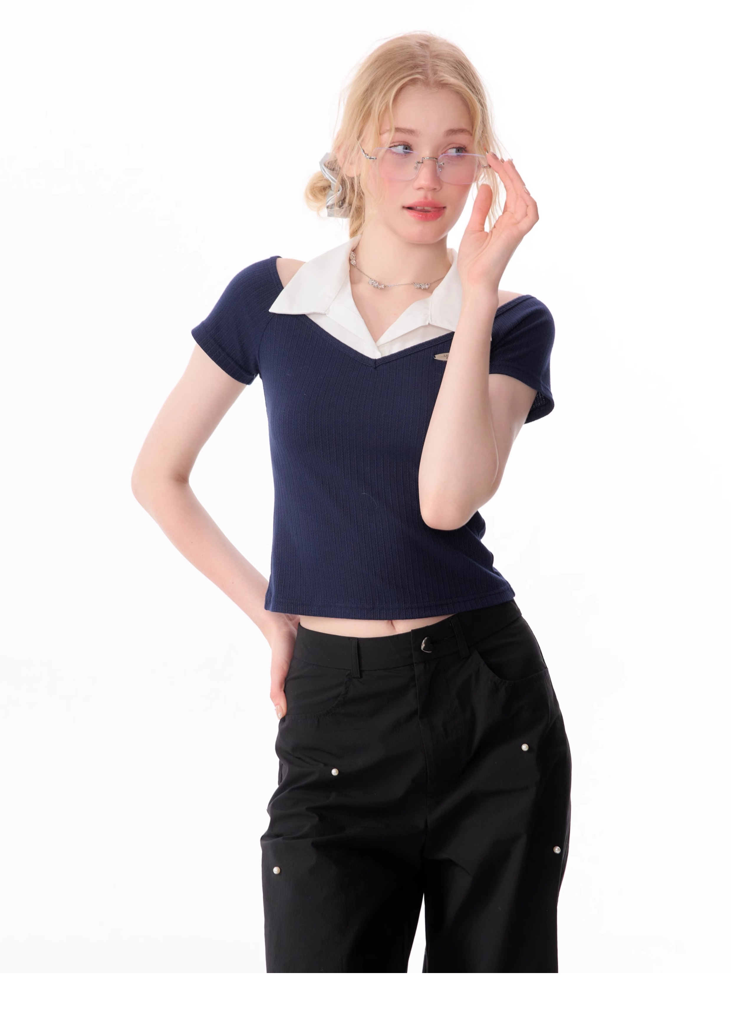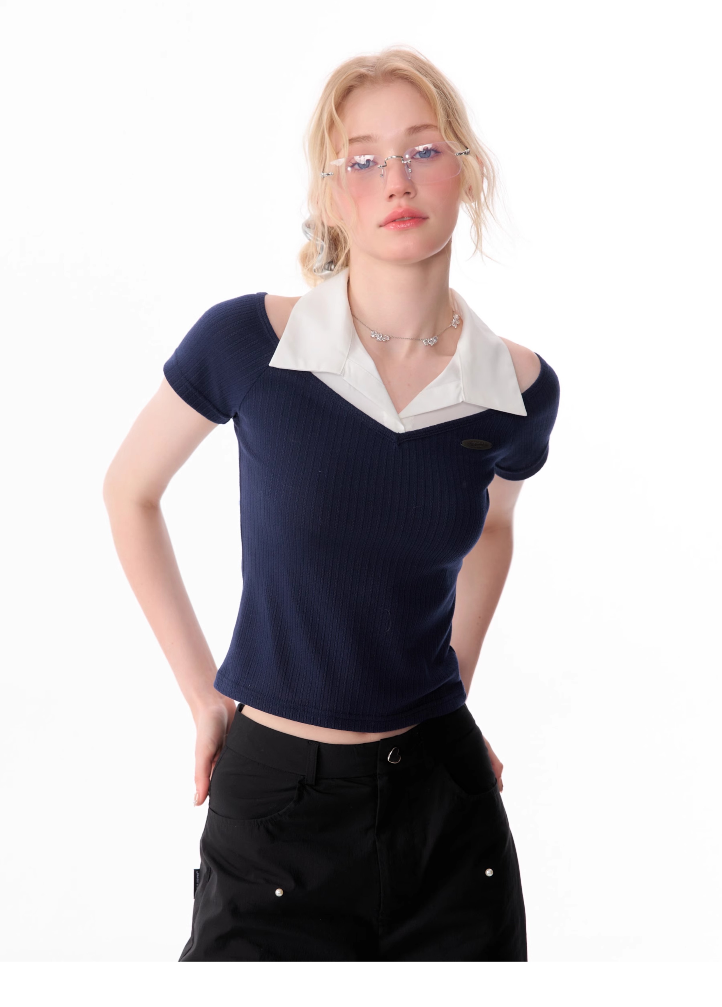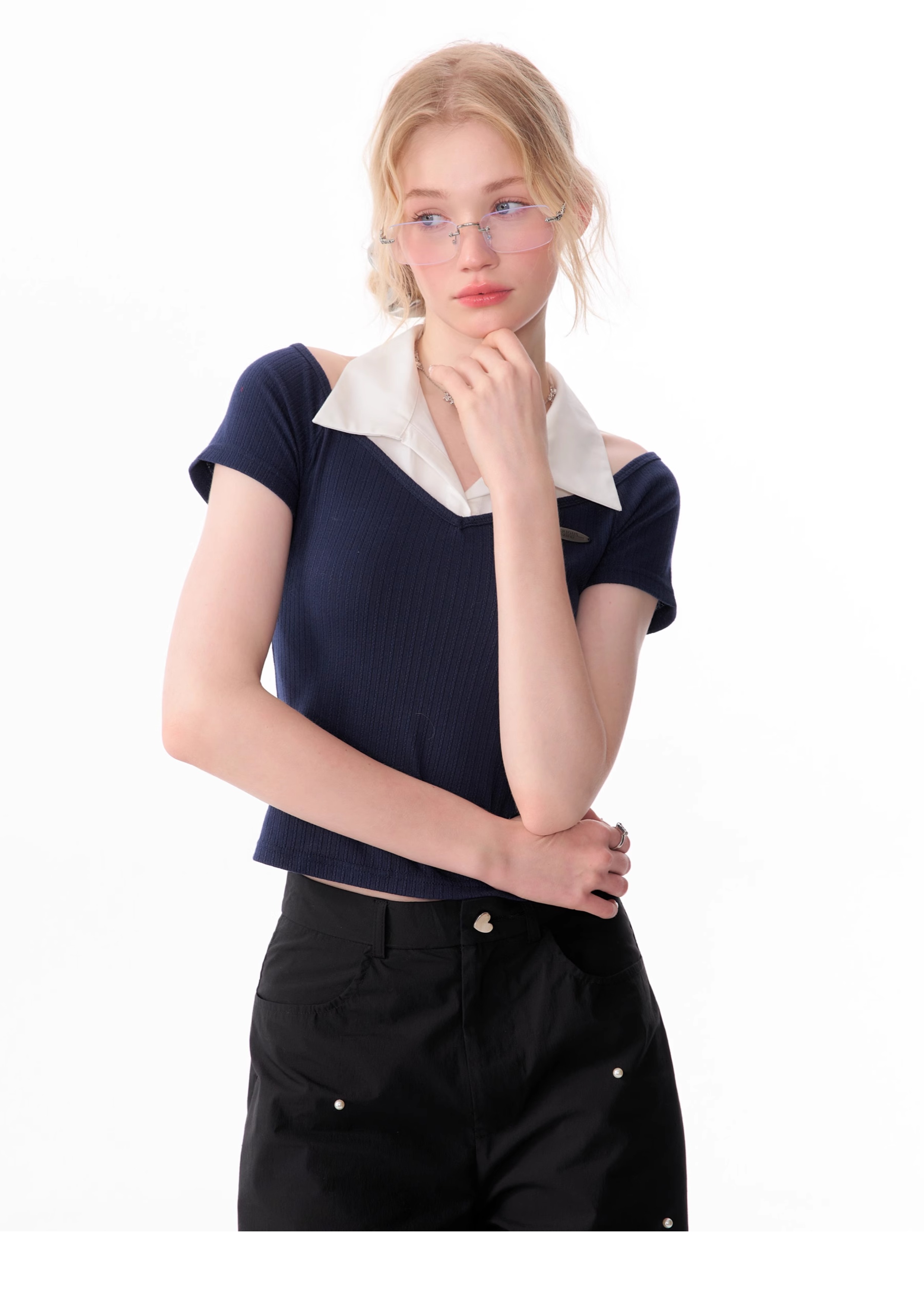 Off-Shoulder Polo Collar Top | Slim Fit Fake Two-Piece Retro Design for Summer