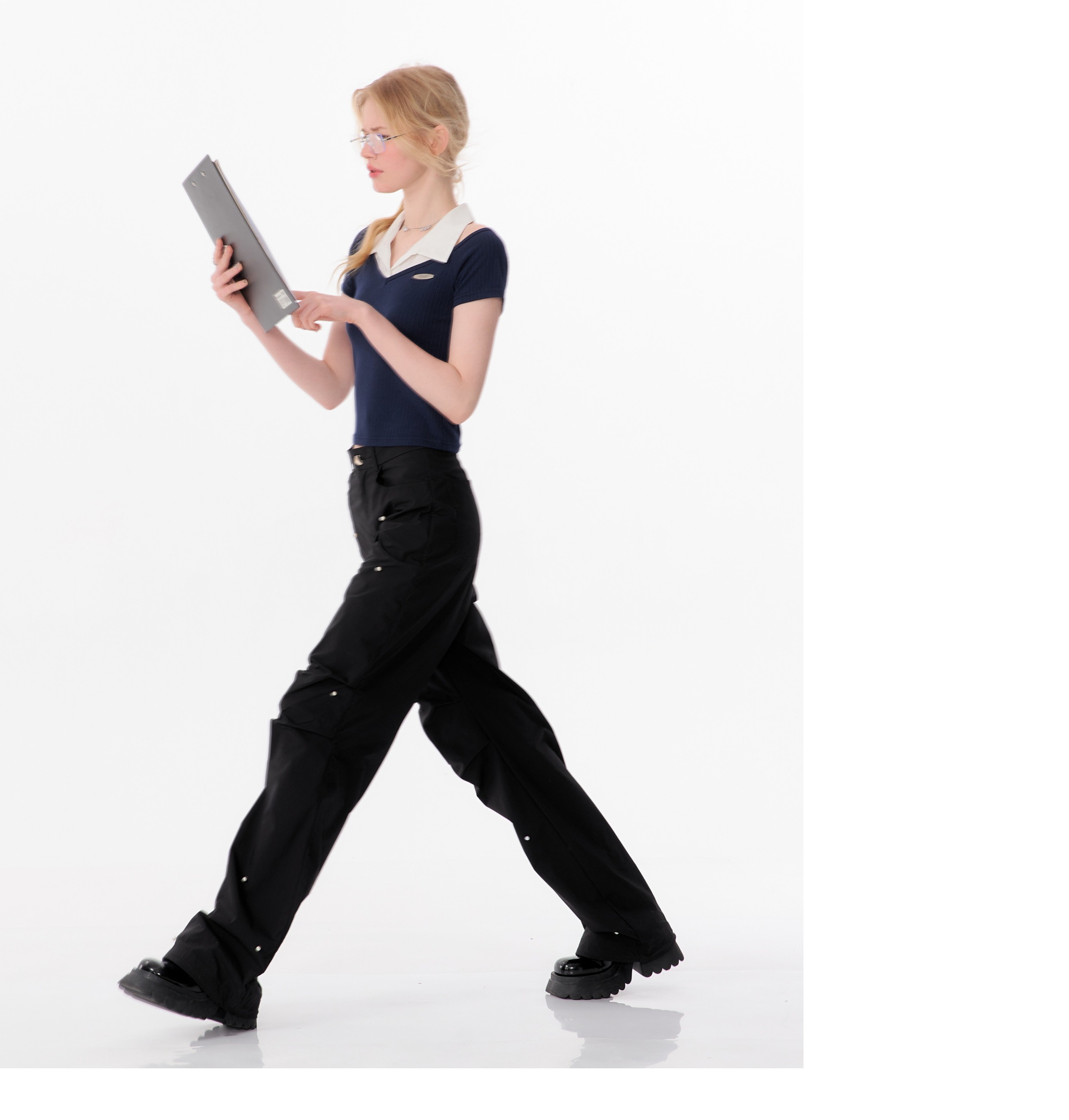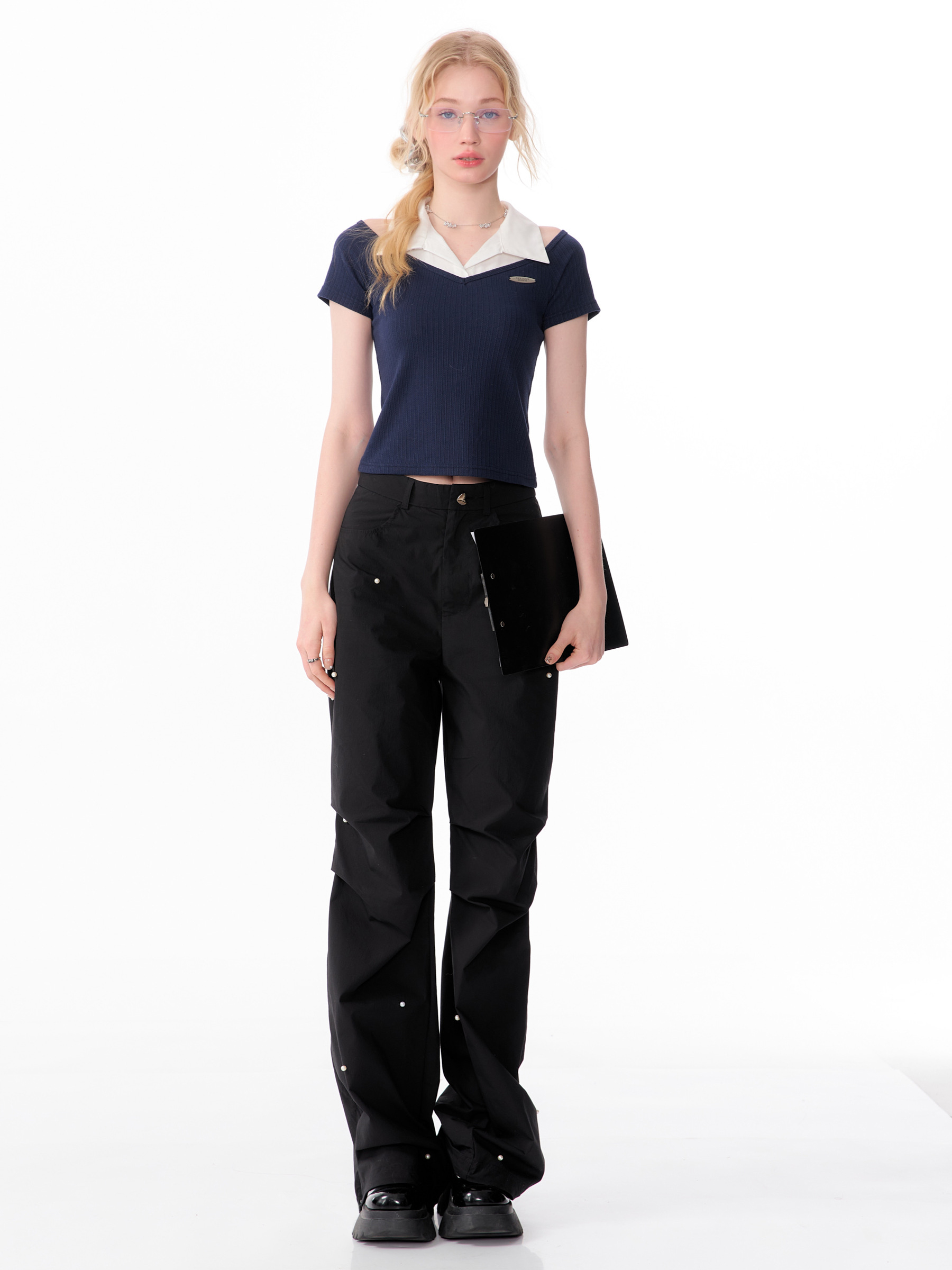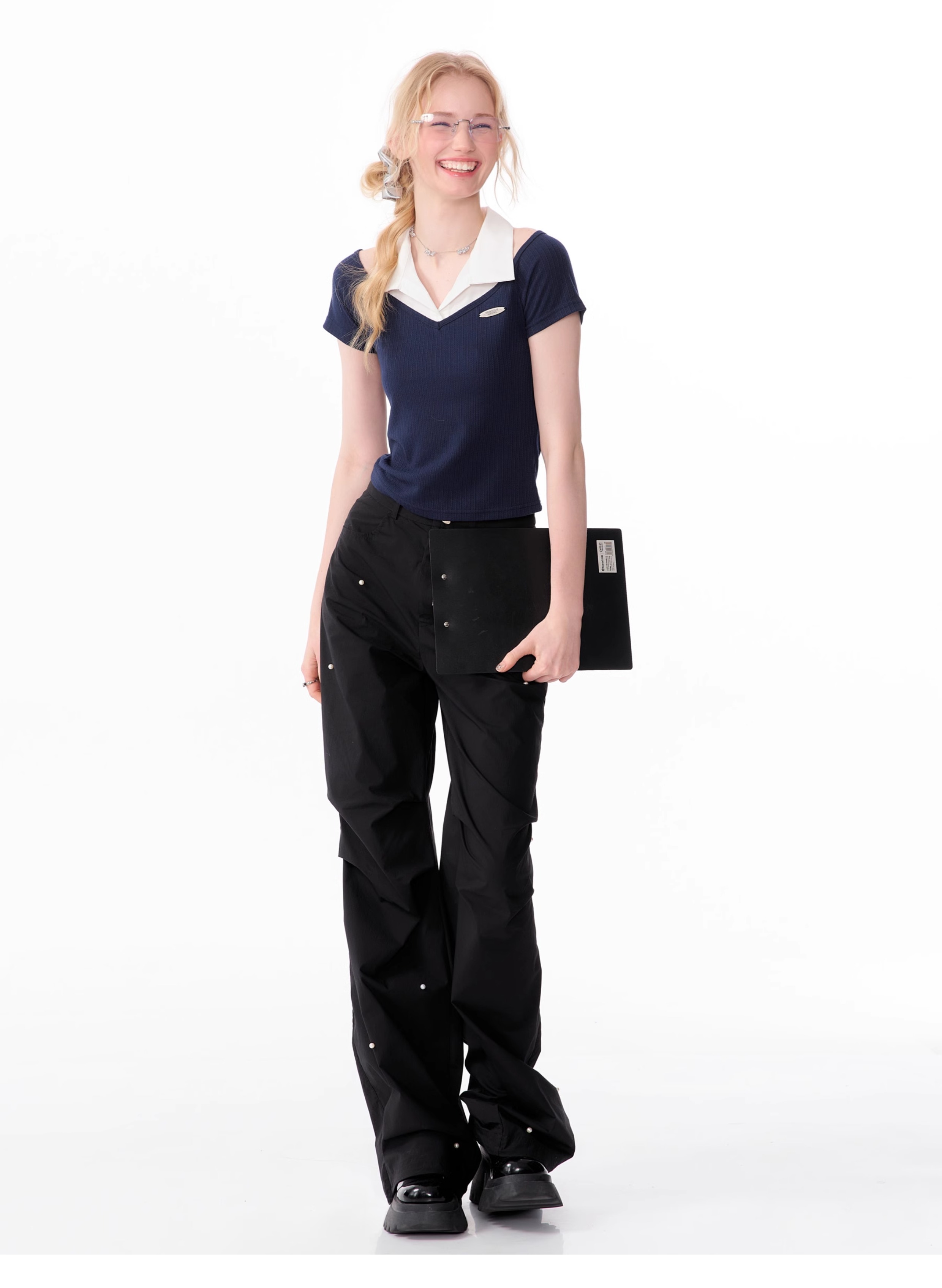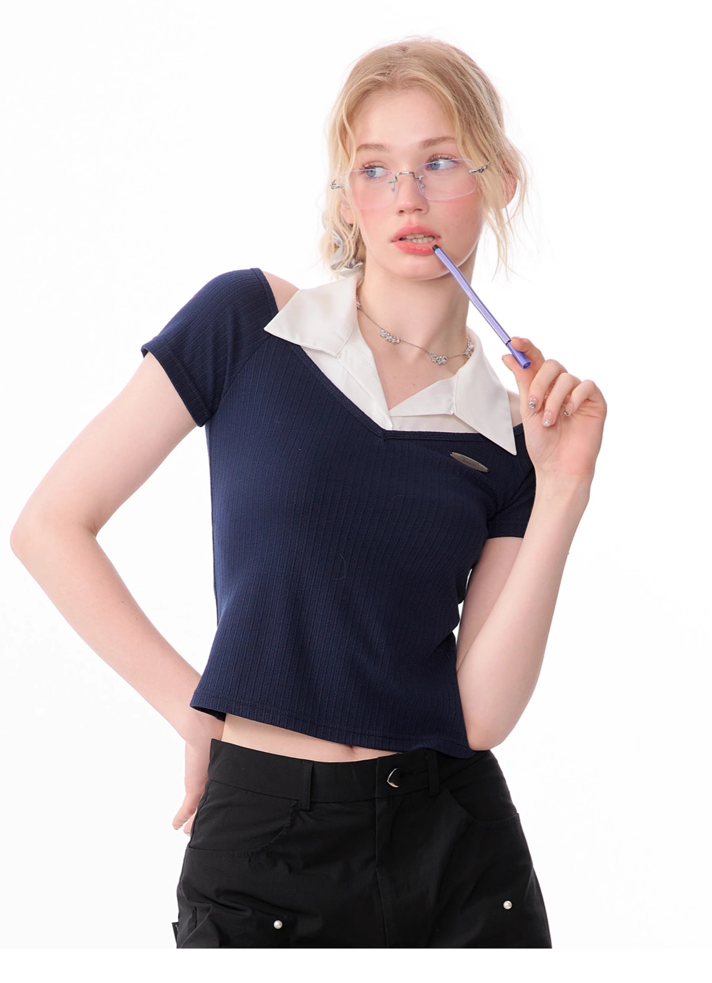 Off-Shoulder Polo Collar Top | Slim Fit Fake Two-Piece Retro Design for Summer