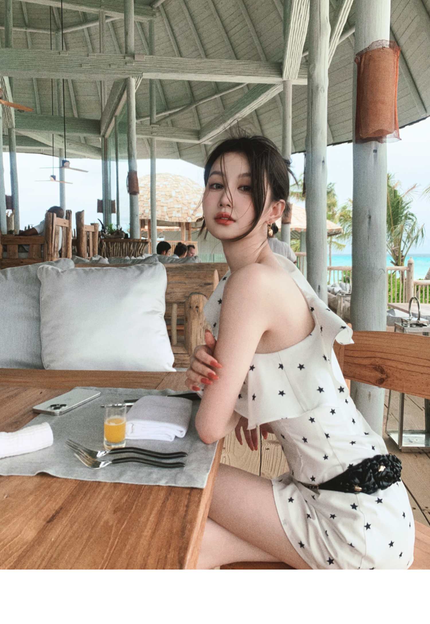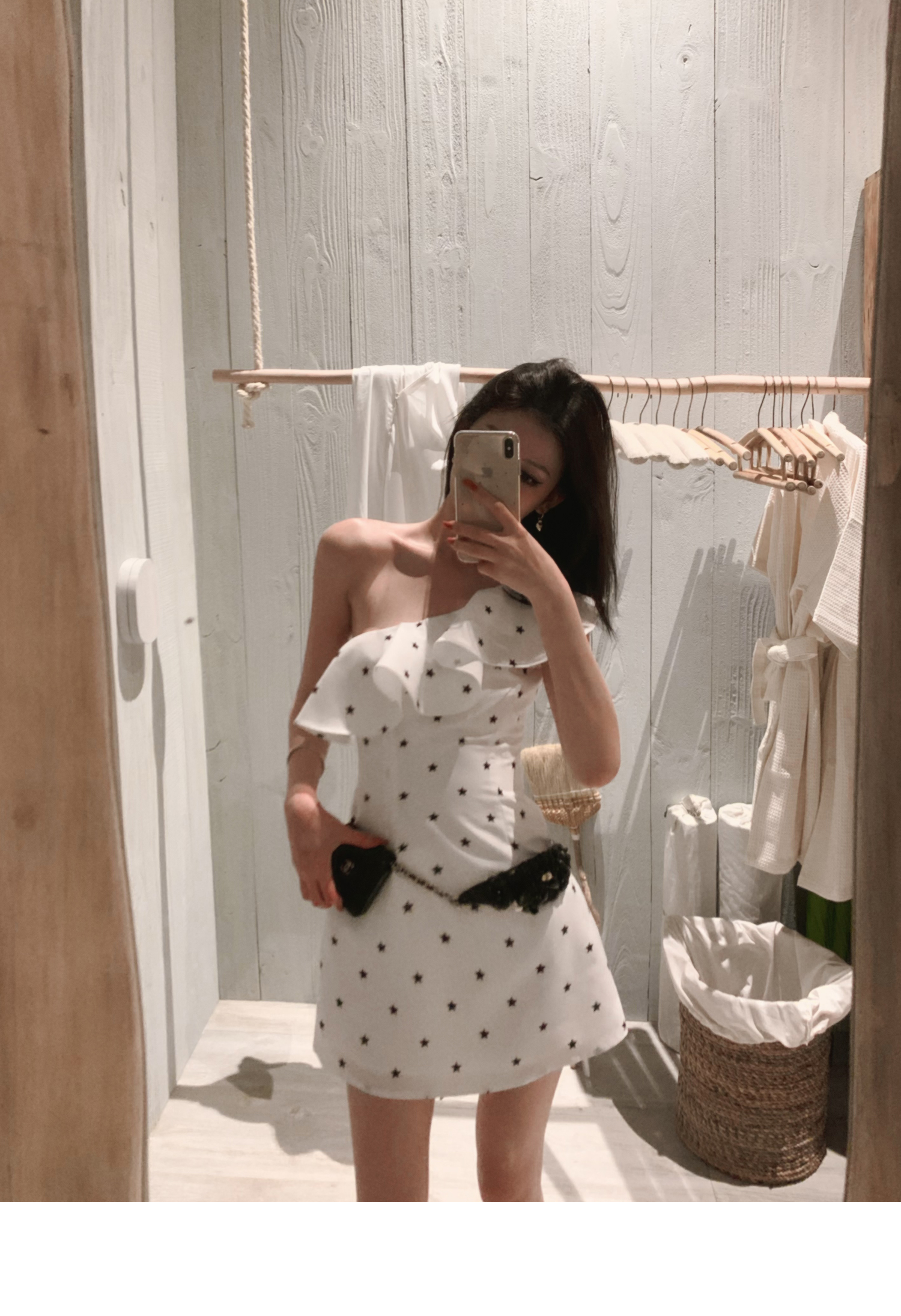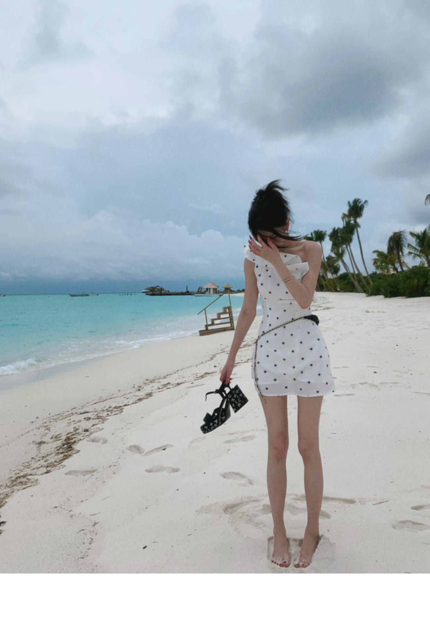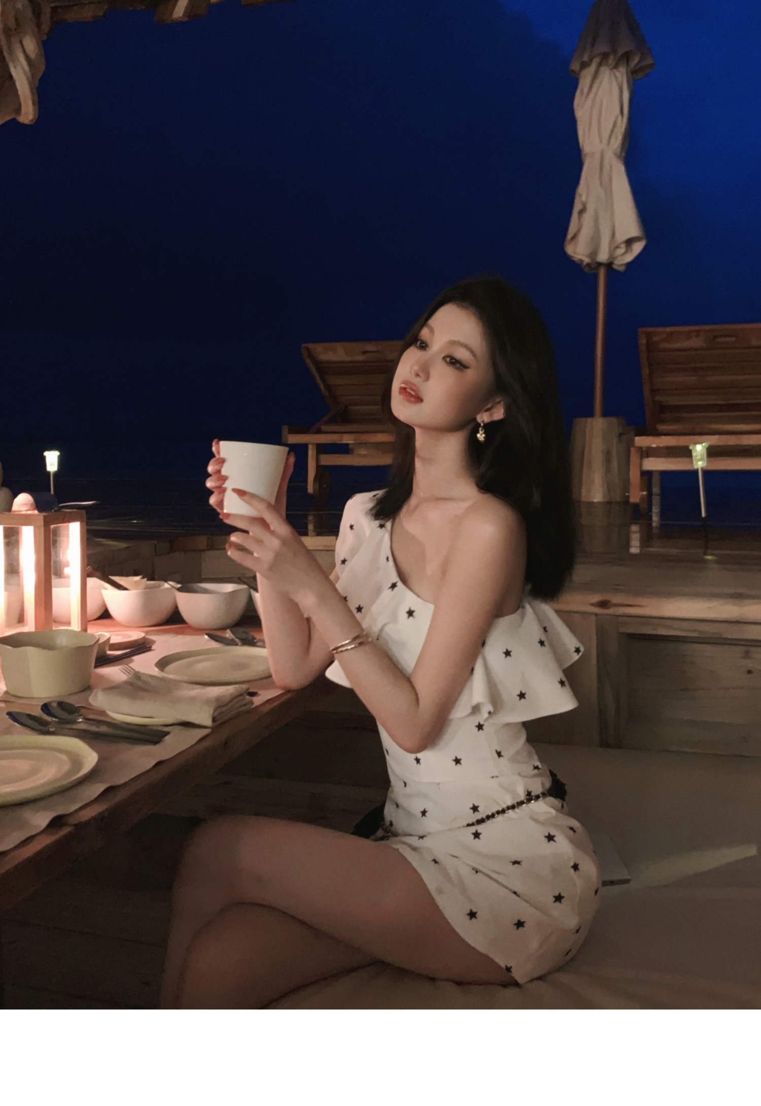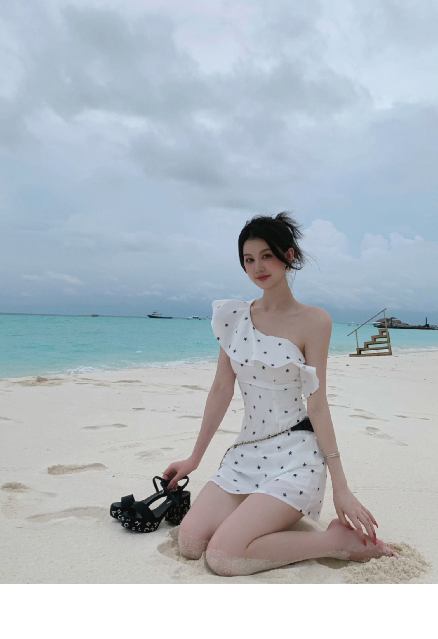 [Tipsy Star Ice Music] White Sloping Shoulder Backless Summer Dress