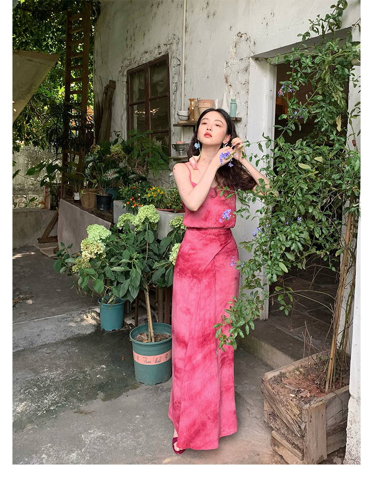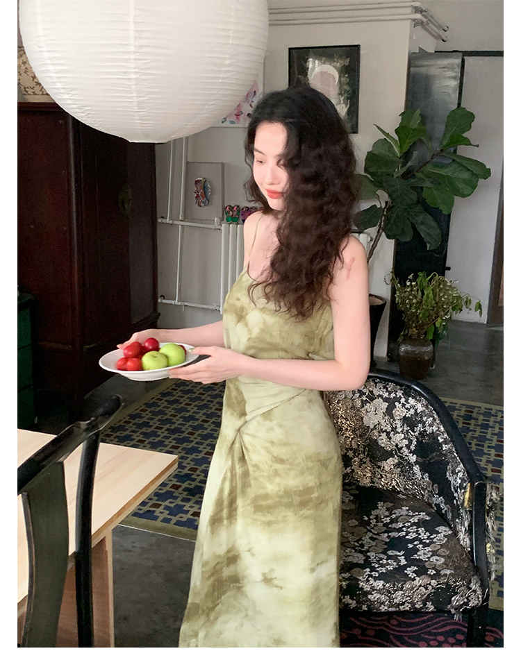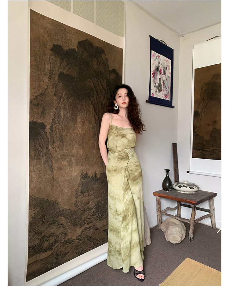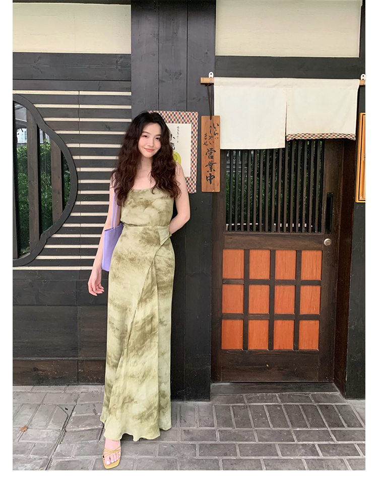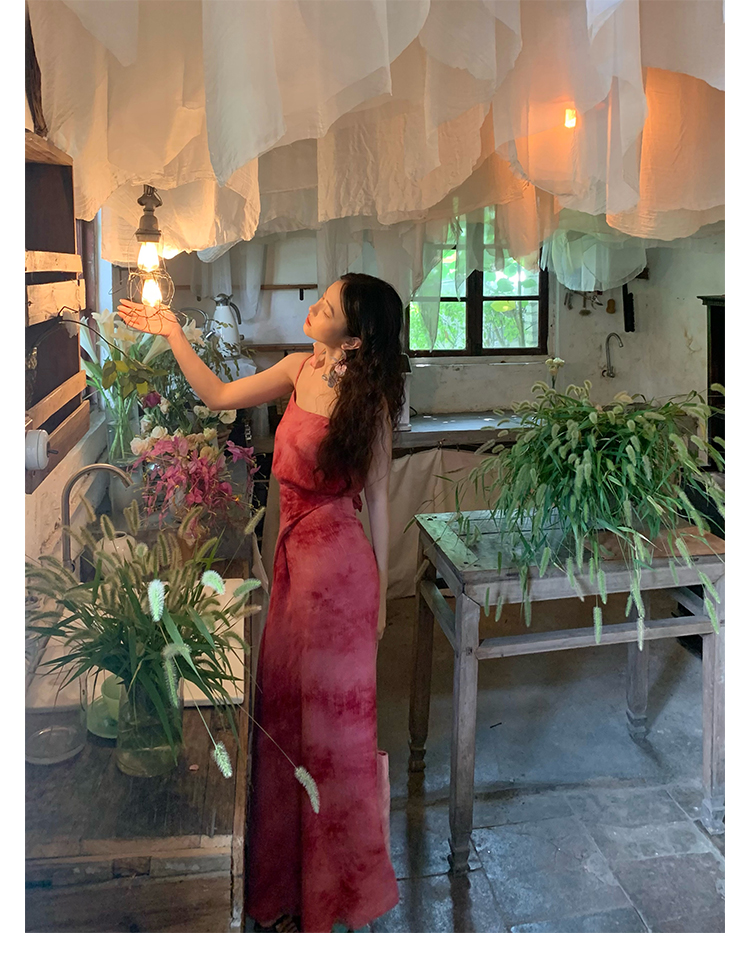 Retro Tie-Dye Waist Tie Long Slip Dress