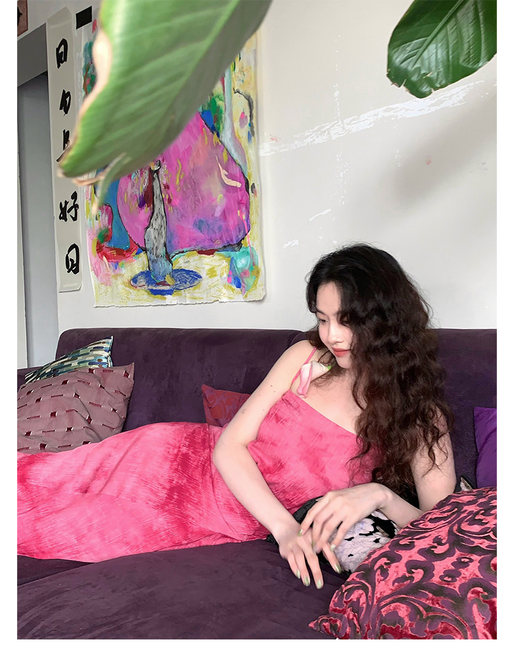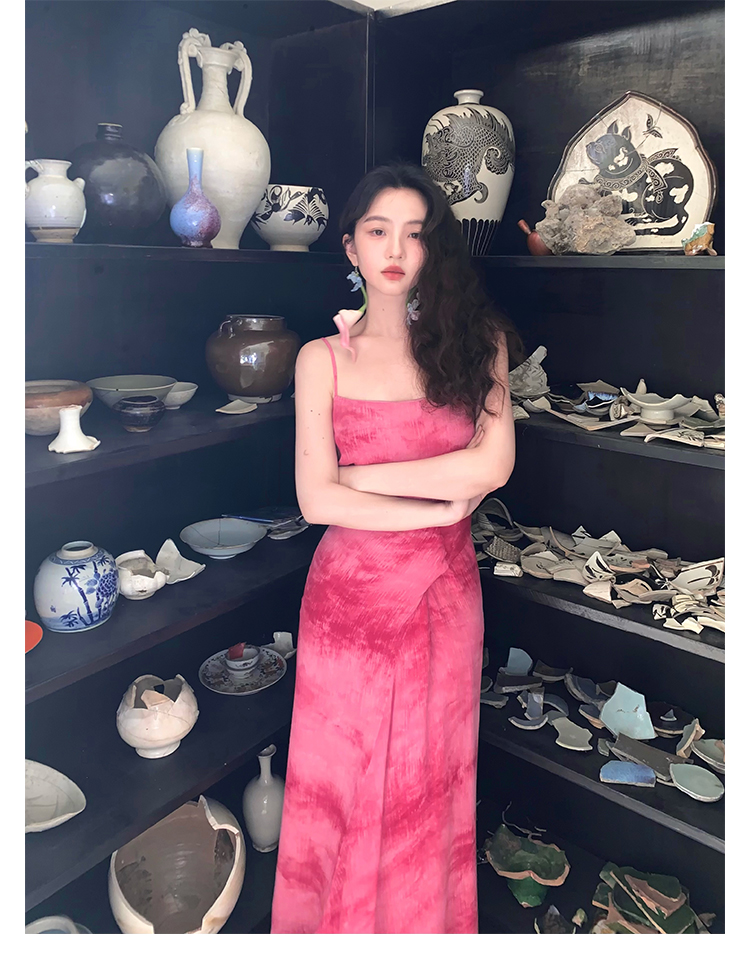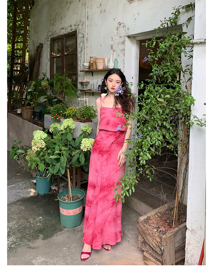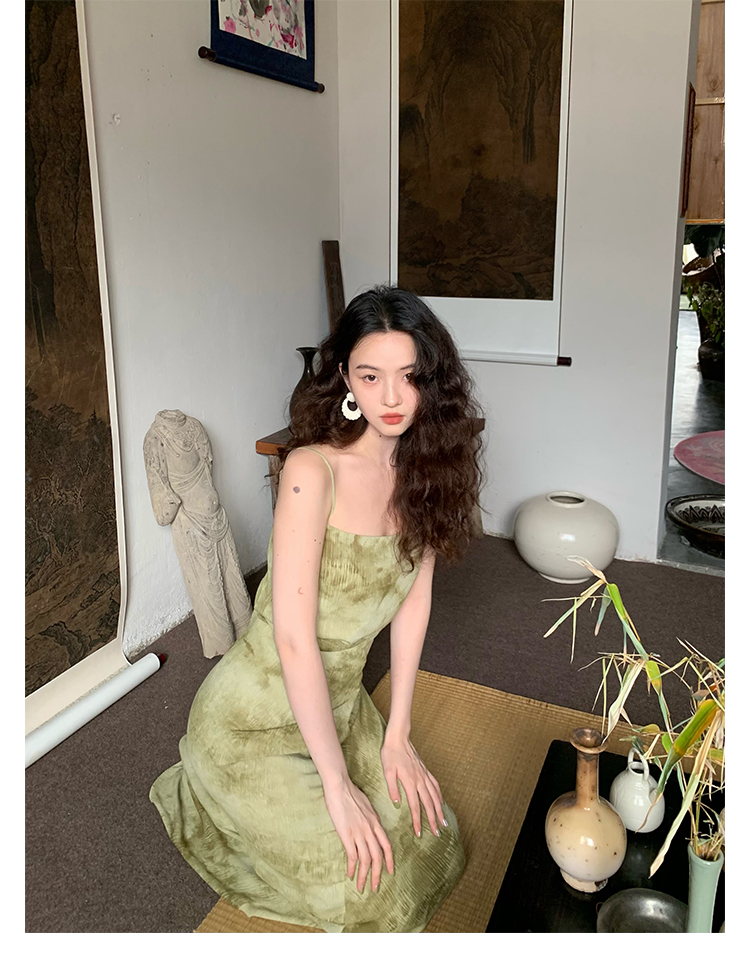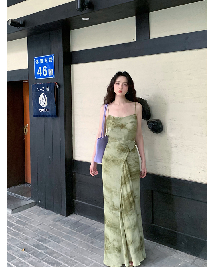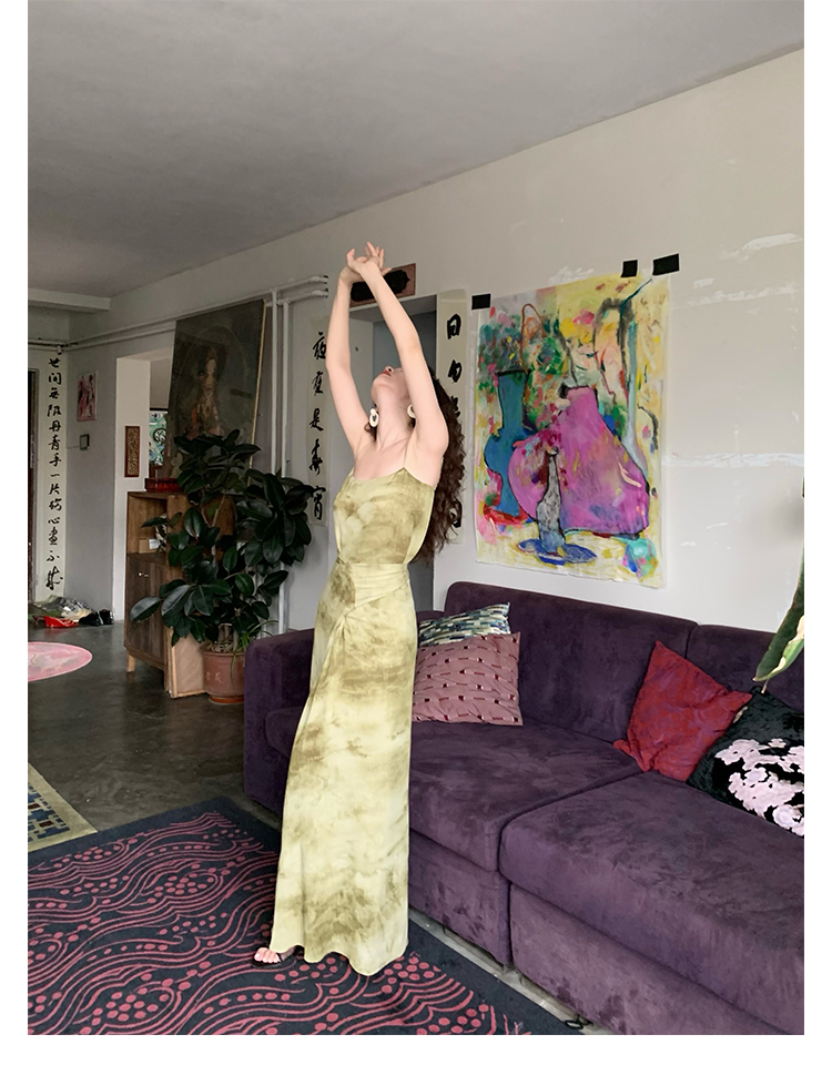 Retro Tie-Dye Waist Tie Long Slip Dress