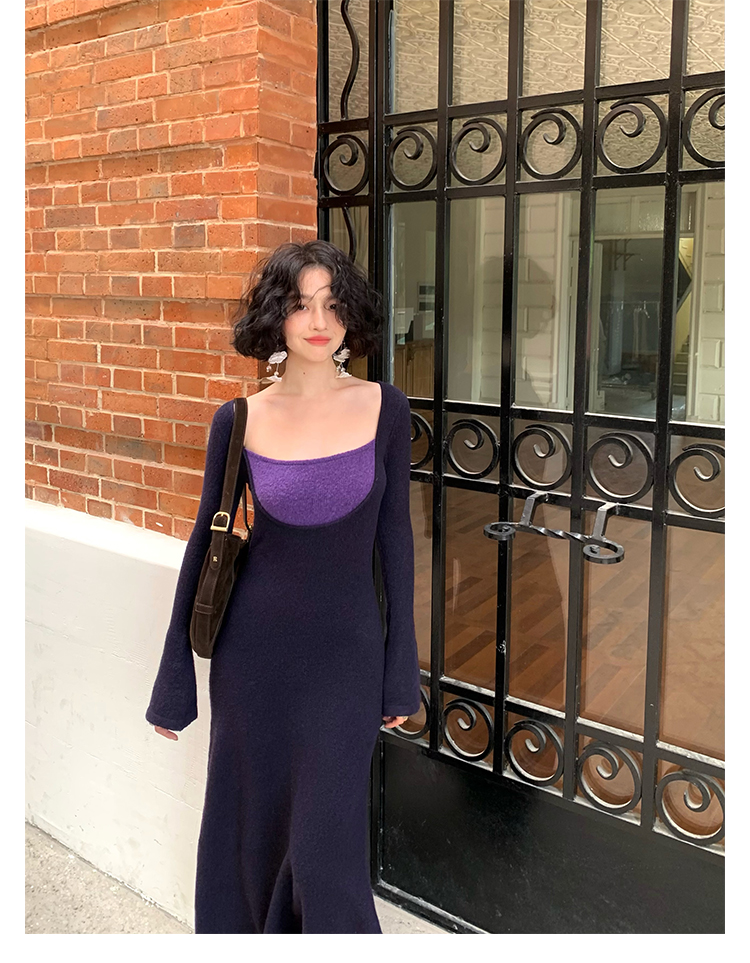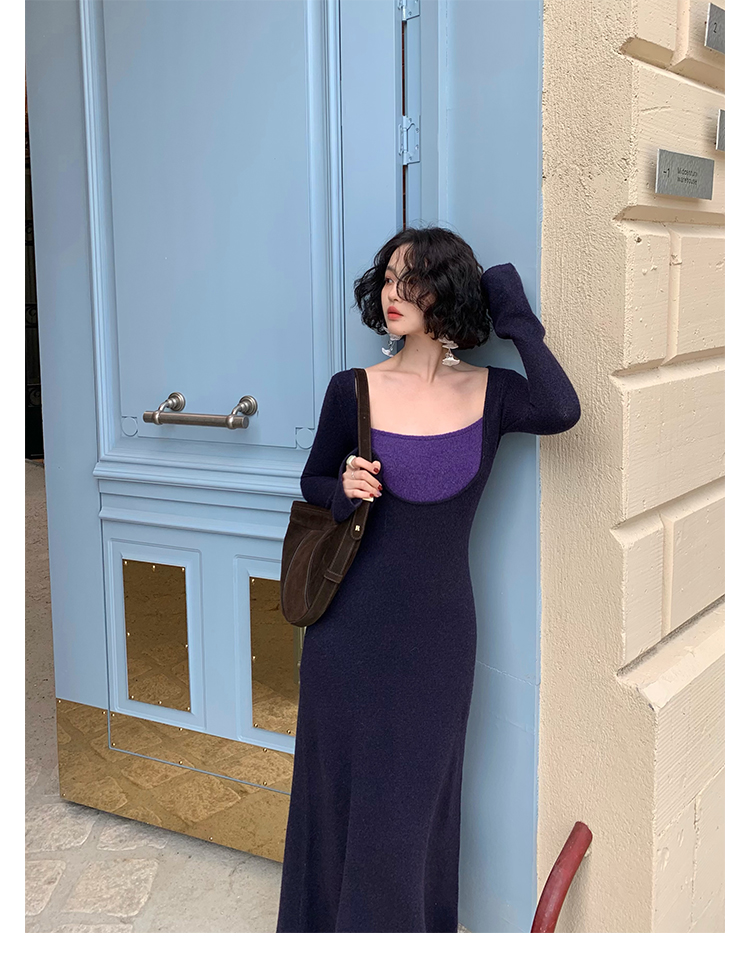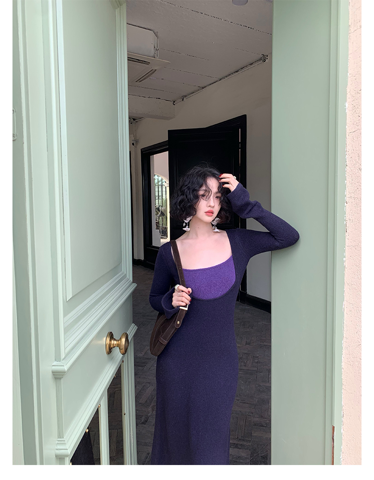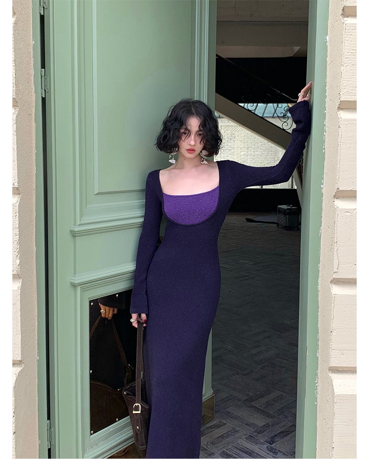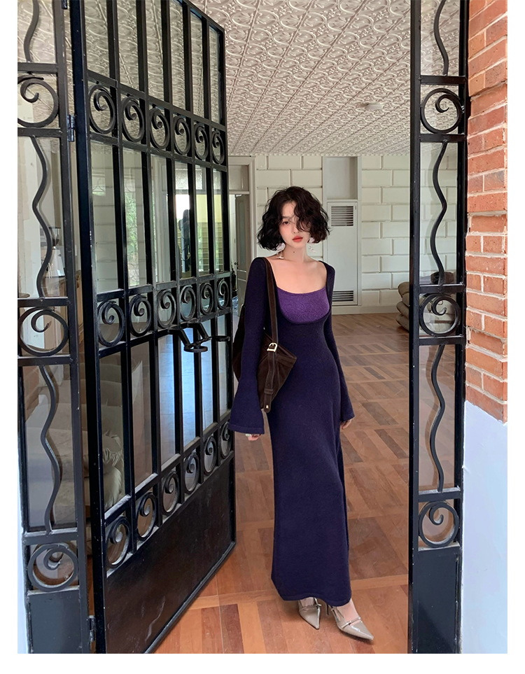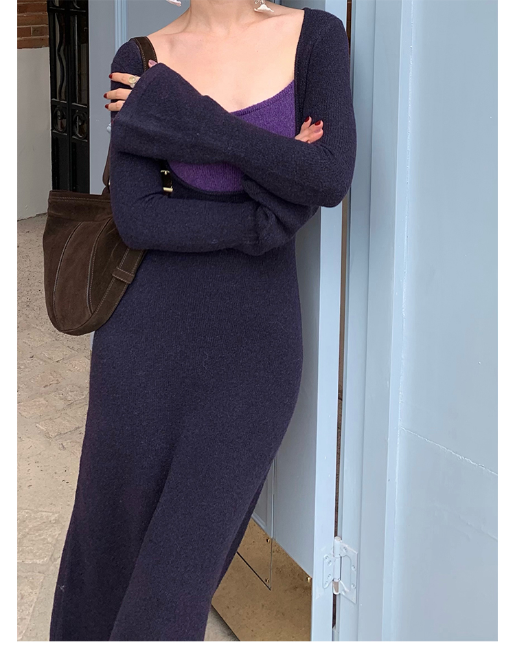 Half-String Poem Purple Slim Wool Long Knitted Dress – Romantic Charm